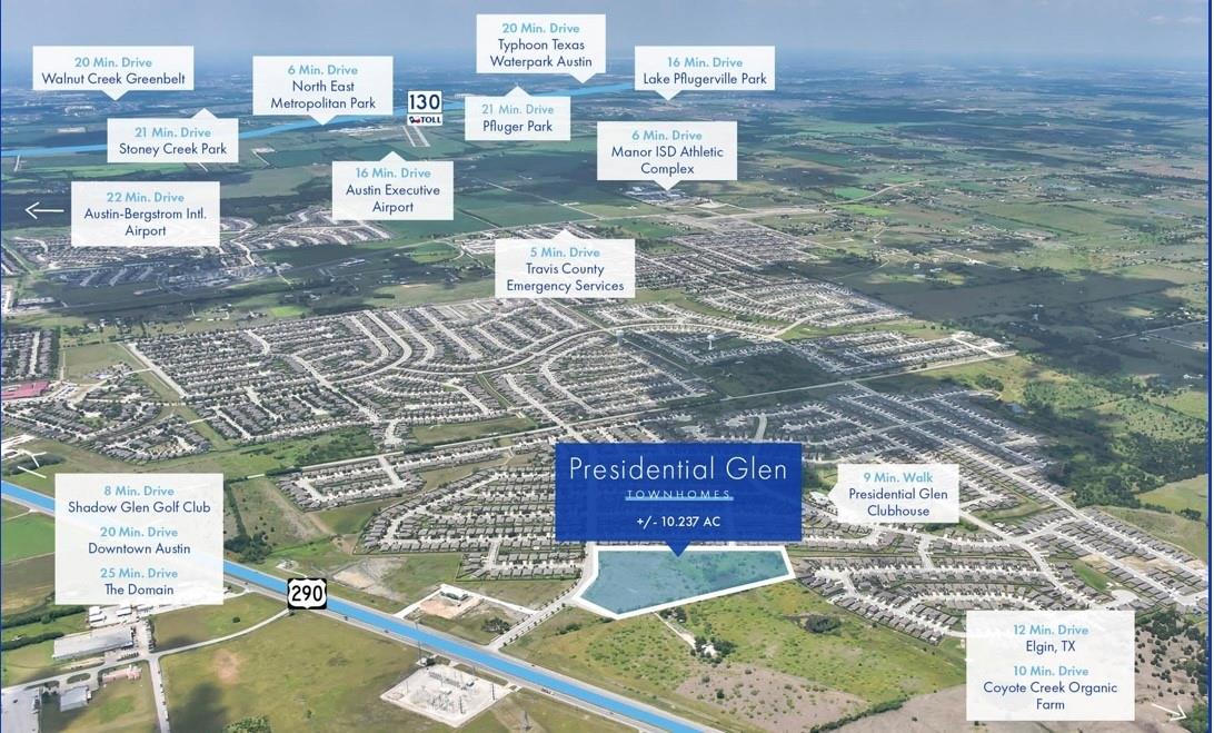 Presidential Glen Townhomes, a +/- 10.237 potential Build-To-Rent or For Sale Townhome Site in Manor, Texas. The Property is located east of Austin, just off Highway 290, which allows a developer flexibility in one of Austin’s most coveted tertiary markets. Presidential Glen Townhomes’ location also provides future residents with a quick commute as well as connectivity to the Austin MSA. Manor’s population has increased by 71.4% since 2020, making it one of Austin’s fastest growing suburbs. The town also has experienced recent positive job growth and is known for their exceptional school system which serves more than 7000 students. Presidential Glen Townhomes provides a developer scale and flexibility in one of Austin’s most up and coming tertiary markets.