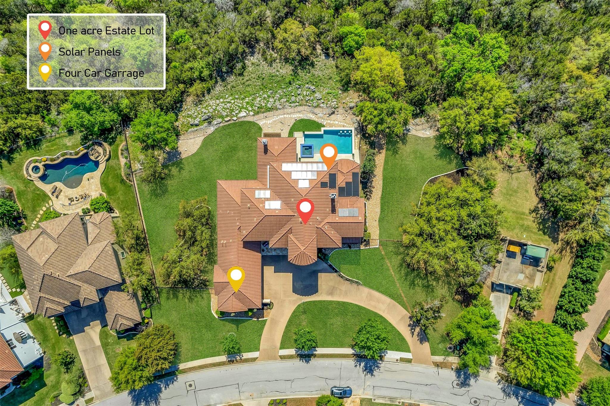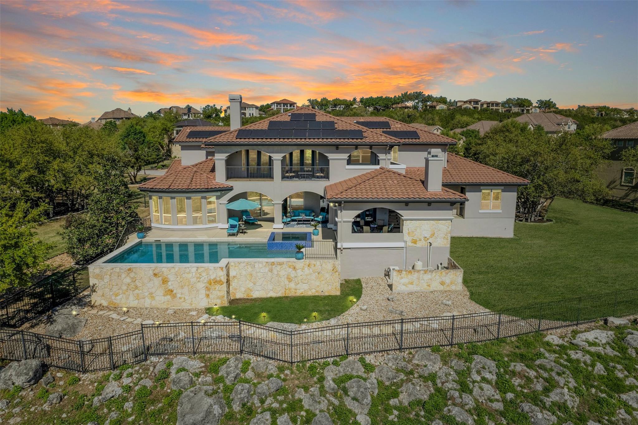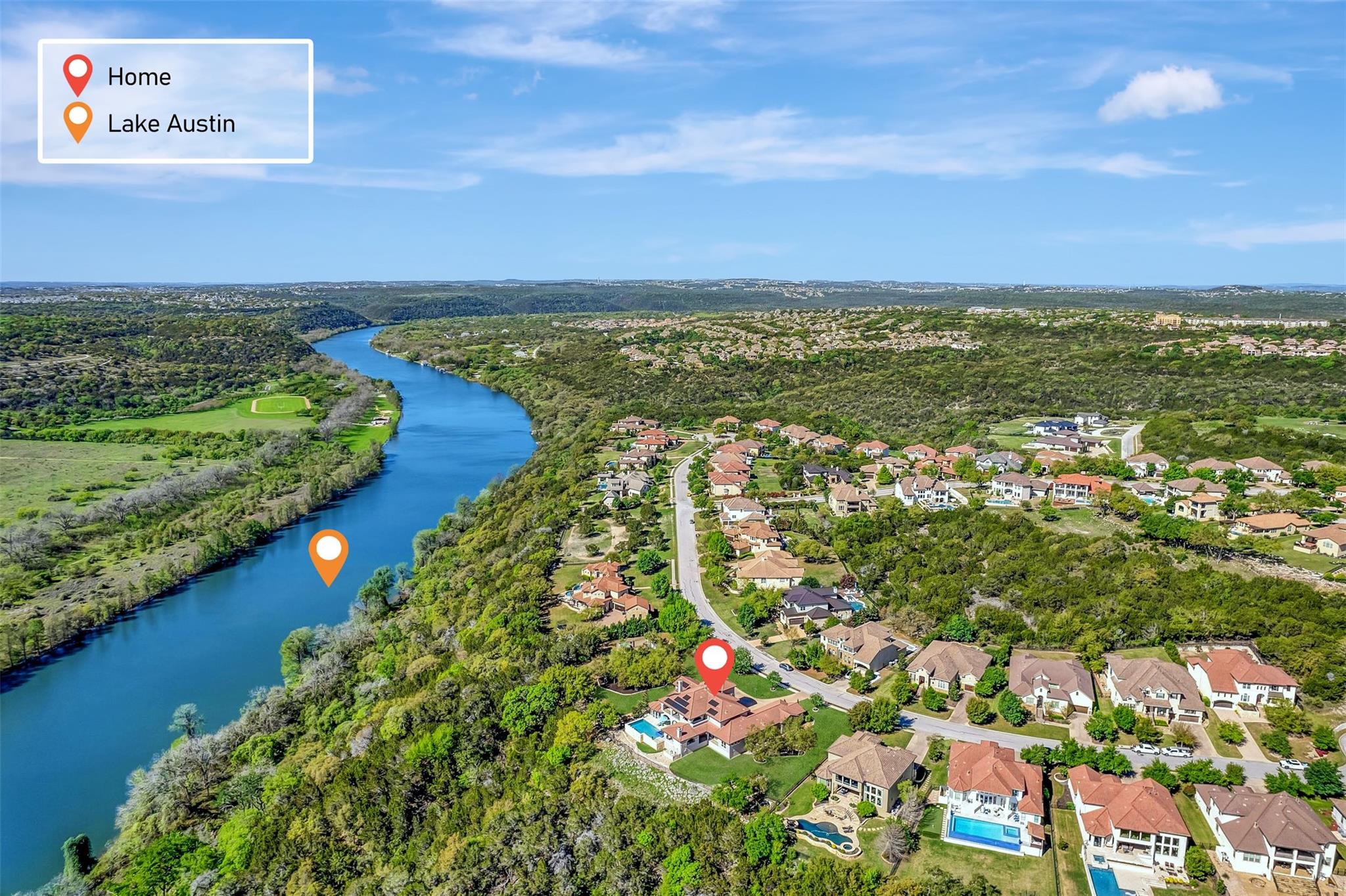 Welcome to the pinnacle of luxury living within the prestigious gated UT Golf Club community near highly rated Steiner Ranch schools. Presenting for the first time on the market, an exquisite private 1-acre estate with unparalleled views of Lake Austin. This recently updated home combines luxury with eco-friendly features, including 40 solar panels, a certified 5-Star energy rating, and an electric car charger. The home centers around an elegant outdoor living oasis, boasting a quick heating, remote controlled lap pool, an outdoor kitchen with state-of-the-art appliances, and a raised negative edge hot tub, all amidst custom landscaping lighting that illuminates the meticulously designed exterior. Enjoy the warmth of one of the three fireplaces in cool months, or enjoy the best view possible of 4th of July fireworks shows over Lake Austin from your own backyard. Inside, the home is an example of luxury and technology, featuring a state-of-the-art home theater with 4K projection and top grain leather seating, complemented by Control4 home automation for seamless living. The recently remodeled gourmet kitchen, with new Calacatta Quartz countertops and GE Monogram appliances, opens to breathtaking lake views. Offering privacy and comfort, the primary suite and guest accommodations feature direct pool access, and expansive views. Additional amenities include a fully equipped exercise room with sauna, a dedicated office with custom built-ins, a 2nd primary bedroom on the 2nd level, and a spacious 4 car garage with additional storage solutions. This home offers a true Austin luxury lifestyle, with plans available for further customization through a guest casita and expanded outdoor kitchen/living areas. Embrace a lifestyle of luxury, privacy, and environmental friendliness in this unparalleled Austin estate. Information on membership at the private UT Golf club is also available upon request.