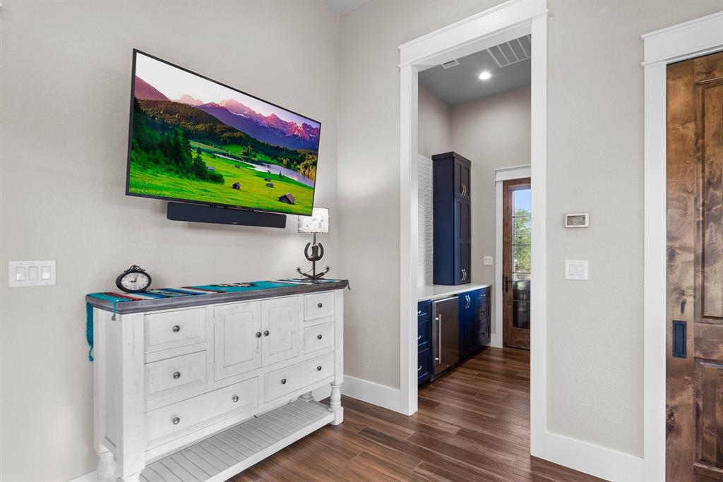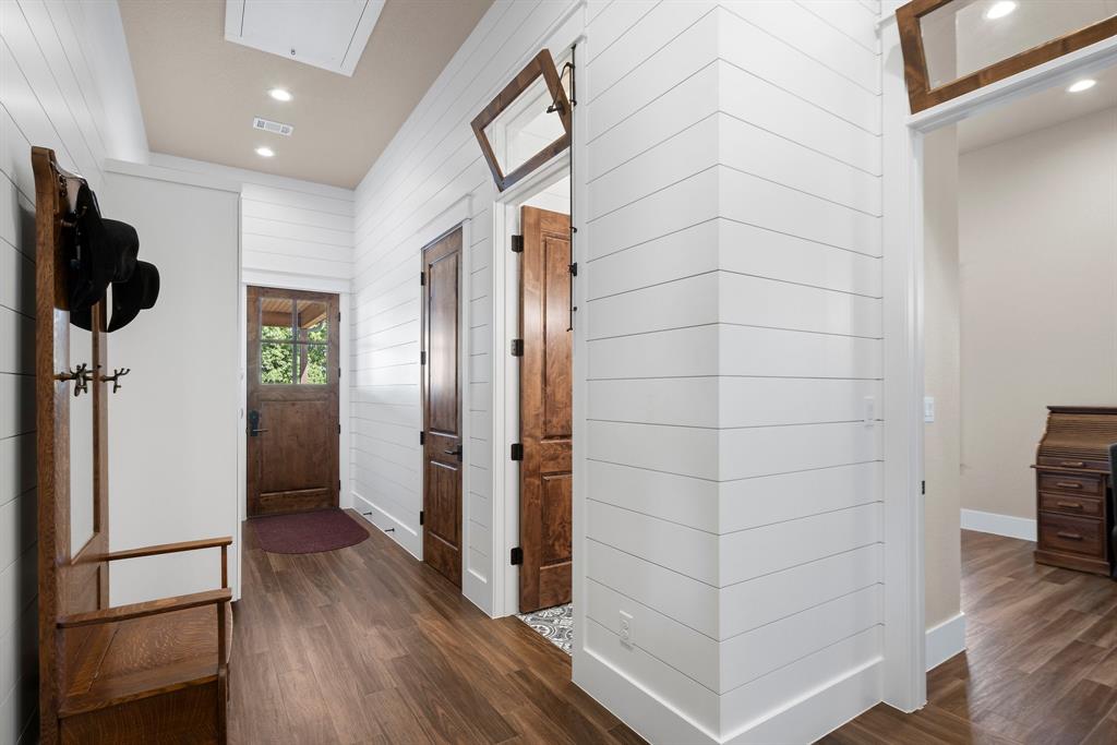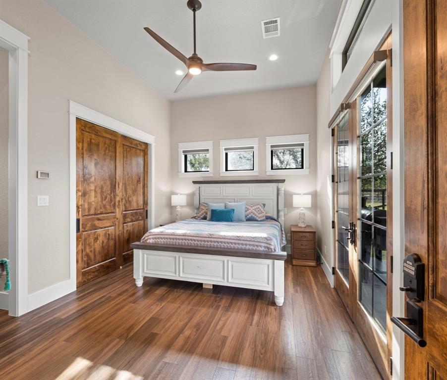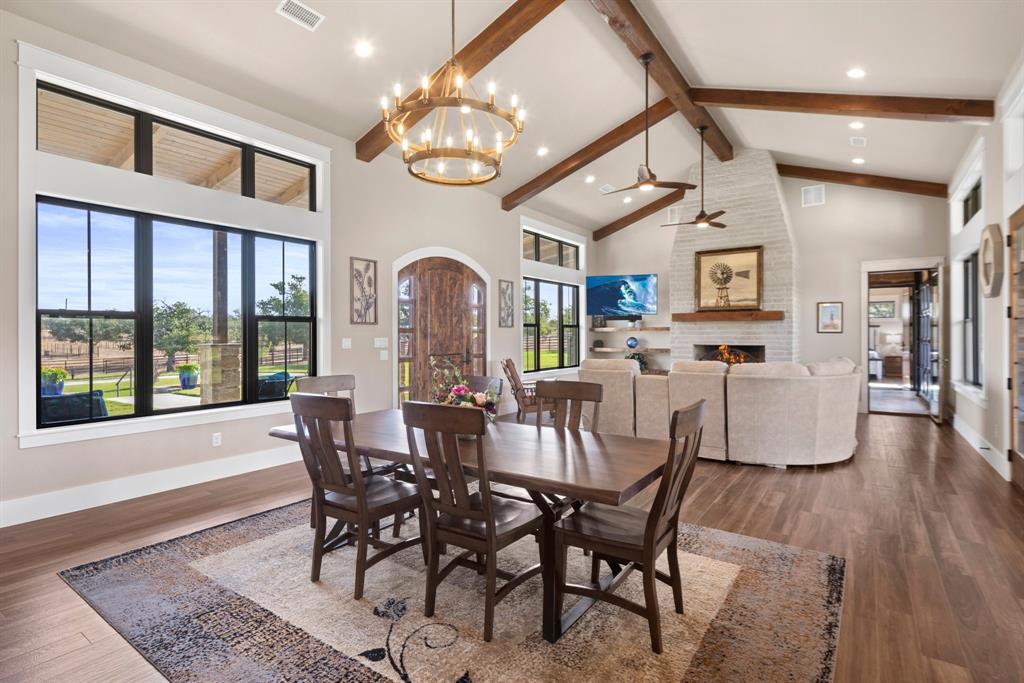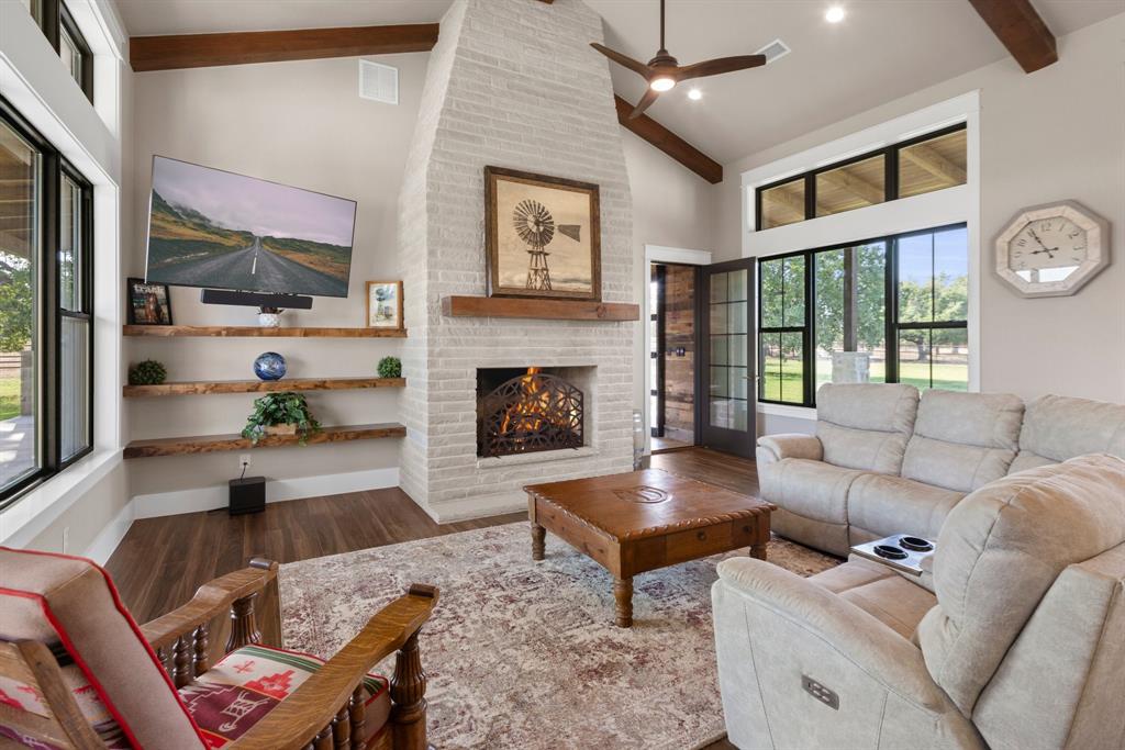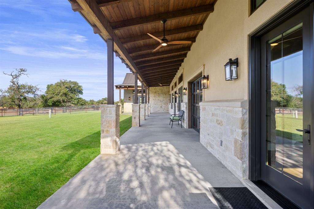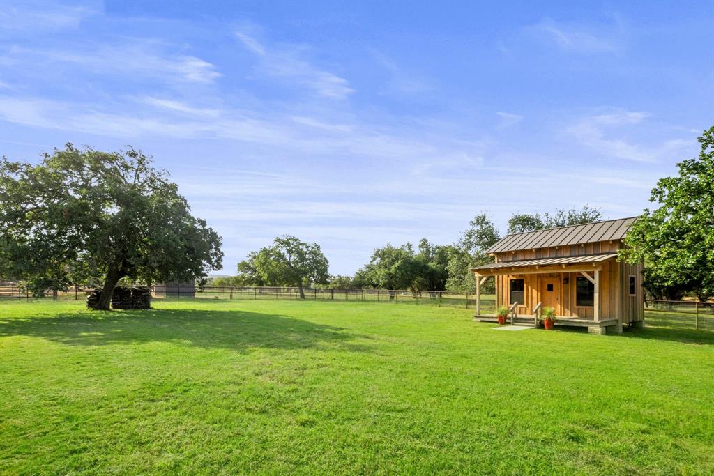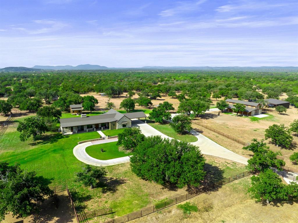This 31+/- acre property sits on 2 of only 16 tracts in this exclusive gated community. Upon entering a private gated entrance, you will immediately notice the custom details throughout the property. The inviting home features tall ceilings, transom windows, and an abundance of natural light. The kitchen is any chef's dream with a large quartz island, custom cabinetry and top of the line appliances. The primary bedroom boasts an accent wall and french doors with custom electric blinds. Inside the primary bathroom, you will find a large walk in shower, soaking tub, heated floors, and walk in closet with a built in safe. There is a second primary suite off of a flex space with glass overhead doors allowing views from both the front and back of the home. Enjoy the sunset in front of the fireplace in either the flex space or large living area. The home has many energy efficient features such as a multi zoned HVAC system and spray foam insulation to help with heating and cooling costs. There is a newly constructed cabin with heating and air conditioning, that is also plumbed for water behind the home made of cypress and white oak. This space is perfect for an additional bedroom, office, or craft room. Take a stroll to the barn where modern luxury meets functionality. The custom white oak barn was designed and constructed by Timberlyne and features three large stalls, a wash rack with hot water, overhead storage, RV hookup, as well as private guest quarters featuring a kitchen, bathroom, and covered porch. When you enter the barn, look up and notice the transom windows for air flow, custom cat walk for operating windows, as well as an antique pulley for lowering the ladder that leads to the loft. The property is perimeter fenced as well as cross fenced and includes two water wells. Additional improvements include but are not limited to *50' X 75' storage barn*6 metal loafing sheds*2 portable shipping containers - 1 with electricity*