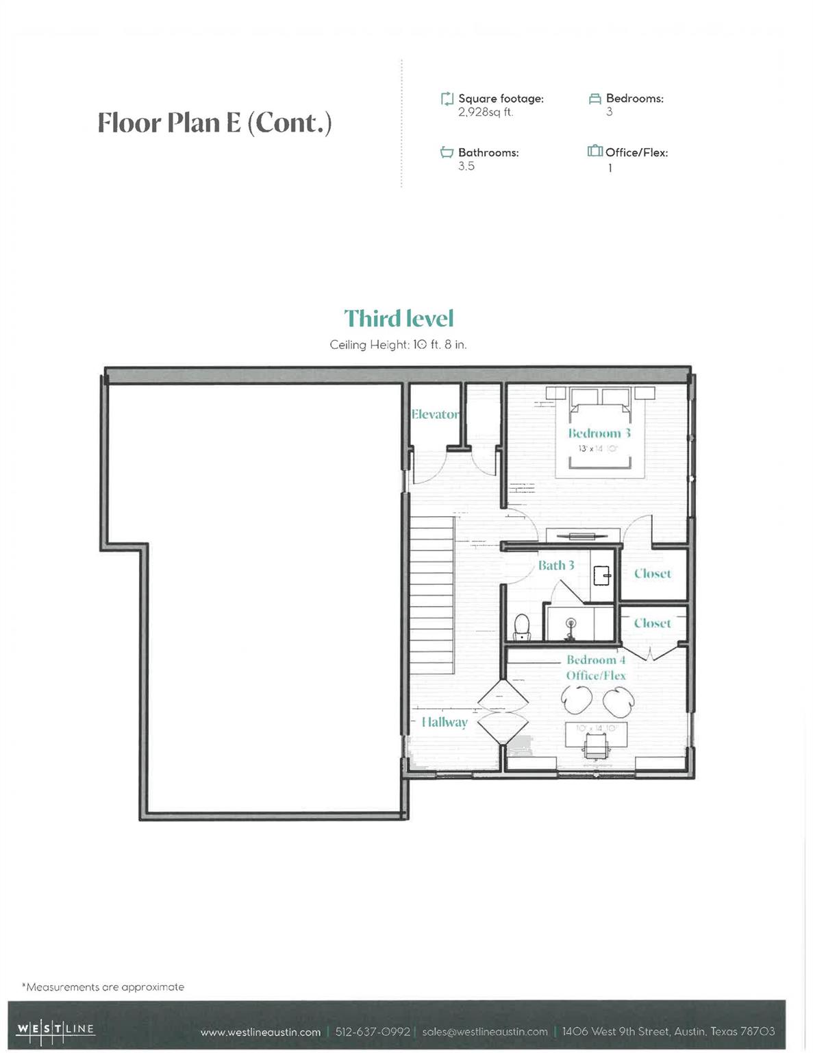 Westline is a collection of 16 modern and historic residences in the heart of Clarksville with only 7 residences remaining. Westline boasts classic peaked rooflines adorned with chimney frames, modern windows and doors, and rich exterior stone features on the lower levels. Westline is conveniently connected to Downtown Austin while honoring the historic suburban roots of the Clarksville area. Residence 602 features three stories, an installed elevator, and private two car garage. The main level offers one en suite guest bedroom and spacious laundry room. The open floorplan on the second level is equipped with a gourmet kitchen that is anchored by a center island with a breakfast bar and stainless steel and brushed bronze appliances by GE. Enjoy light and bright interior selections including White Patina European Oak hardwood floors, Calacutta gold marble countertops, and white Herringbone backsplash. Just off the living area is the primary suite that is outfitted with an expansive walk-in closet and dual vanity. Two additional bedrooms, or one bedroom plus an office/flex space, complete the third level. Clarksville is a pedestrian friendly district known for its historic bungalows, public parks and popular cafes and shops. Located a mile from downtown Austin and surrounded by a variety of restaurants, the Westline community offers an accessible lifestyle to West Austin Neighborhood Park, the Hike & Bike Trail, Lady Bird Lake, Whole Foods, Trader Joe’s and convenient highway access. Tax and assessed values are estimates for illustration purposes only. All figures should be independently verified. Project is currently under construction.