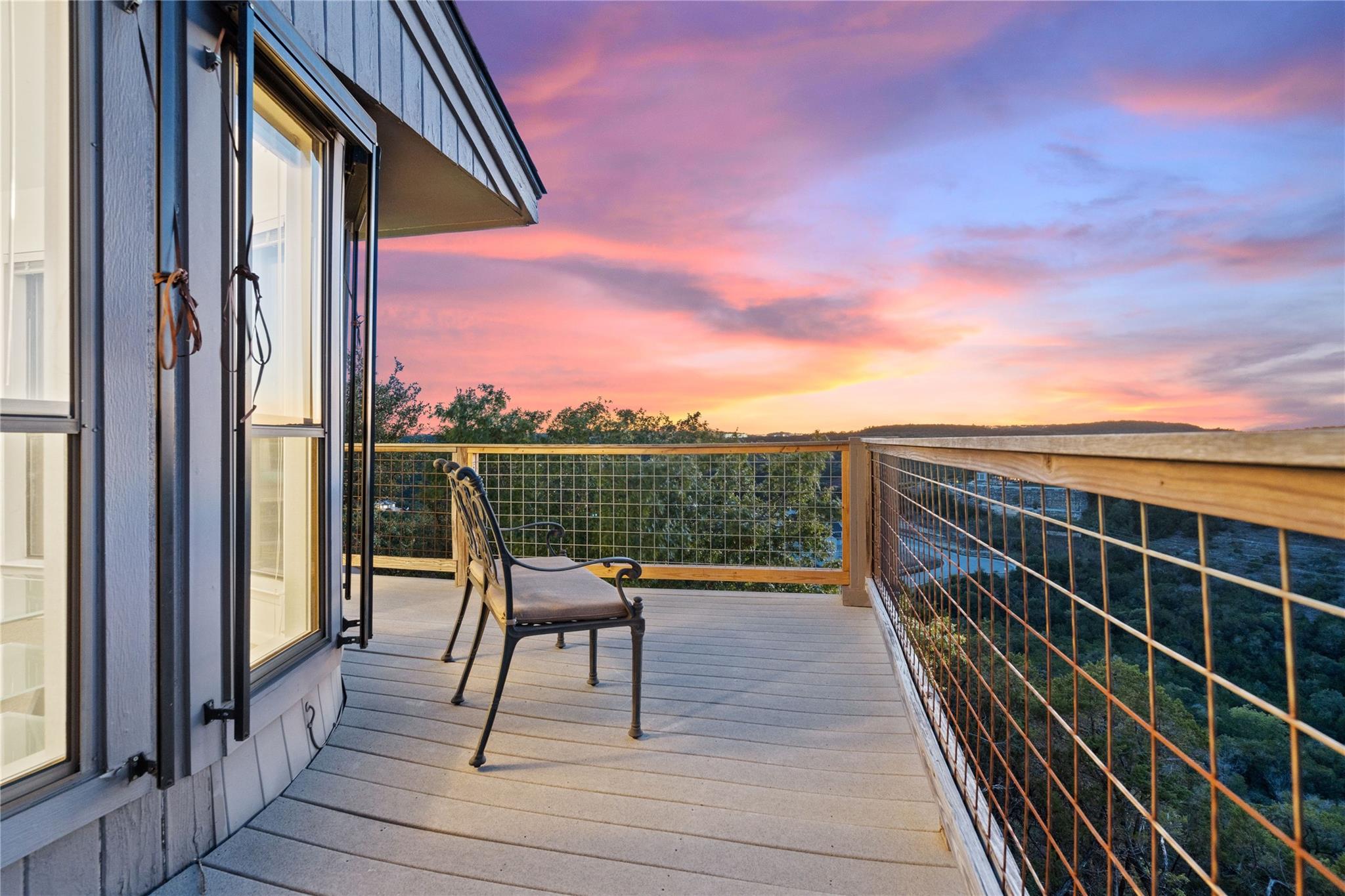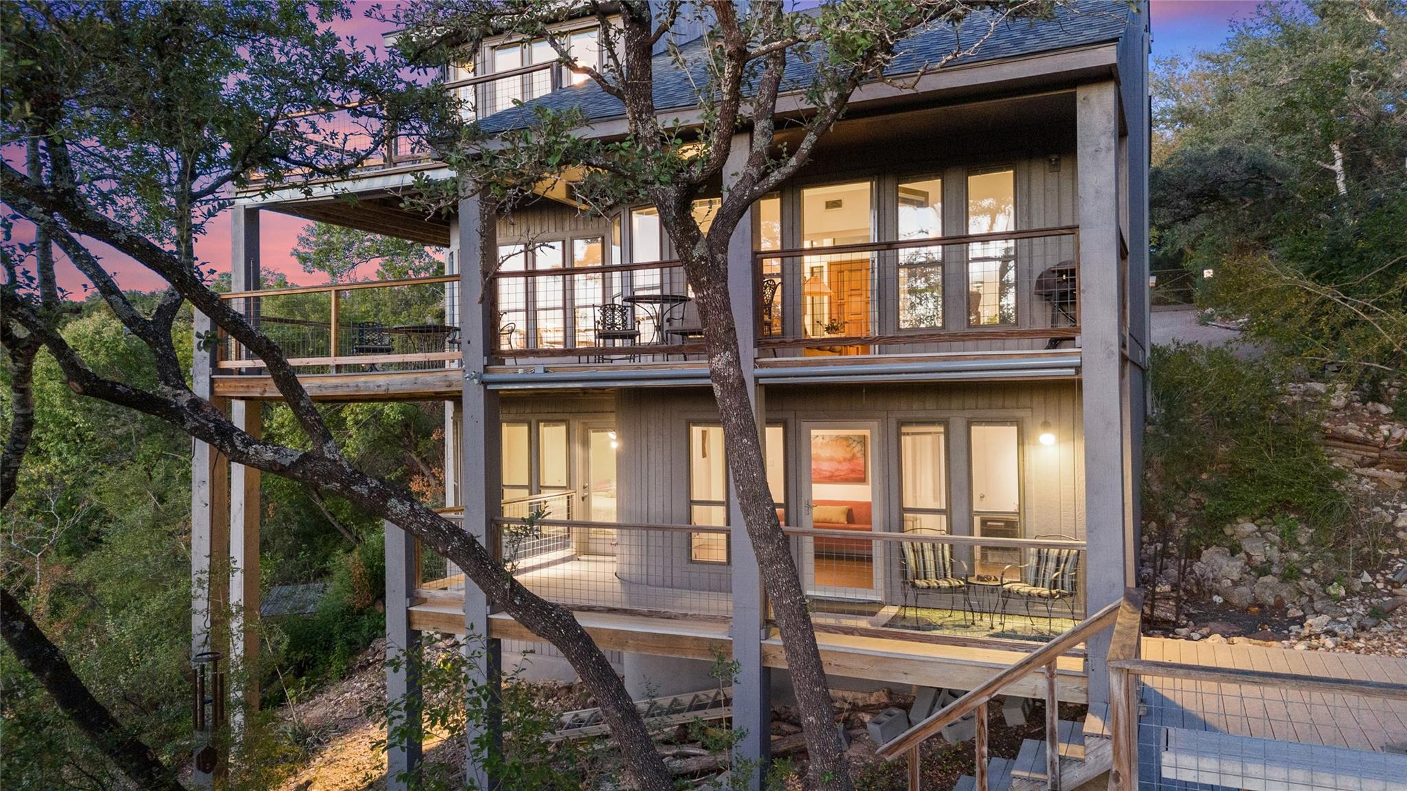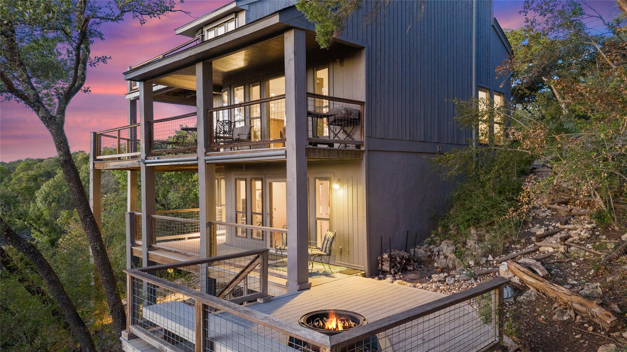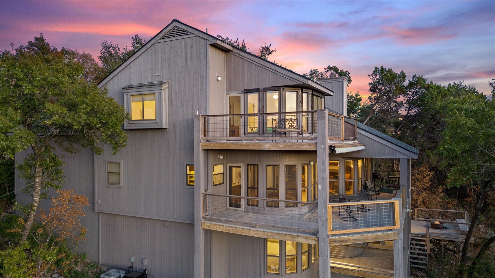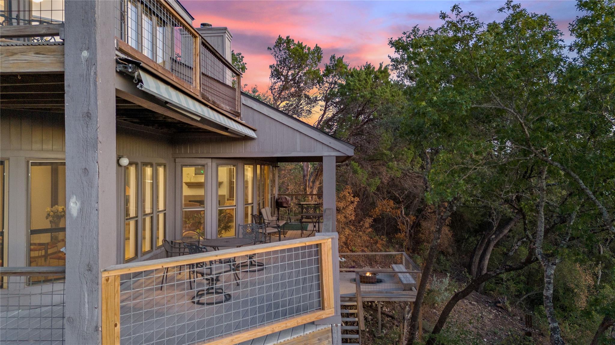 Near the city centers of Westlake and Austin, 1605 The High Road sits in an unincorporated area of Travis County, yet is only 7 miles from the Texas State Capitol and Austin’s entertainment district. It is a unique piece of Central Texas land that is backed by a preserved area, with a view of a canyon supporting a variety of native plants and wildlife. 1605 The High Road is a treehouse. Walk into the middle level, look into the canopy of the trees. Go up to the top deck to see the open sky. Walk down into the lower level and sit in the forest. Watch the weather patterns change, the rain moving across the canyon and the weather fronts moving from southwest to northeast. Inside the house, there are multiple views also. In winter, build a fire and admire the lines, angles and circles intersecting each other. Pause at the upstairs landing and look into the living area to admire the design and structure. Sit at the kitchen counter and look into the rounded window wall into the oaks or at dusk, gaze upon the sunset. Which deck to choose today for coffee or cocktail? Do I want the sunset from the top, middle or the bottom deck? Each deck provides a different view: a forest view, an open view, a canyon view and the view to the stars and sky. The three decks attached to the house were in the original design. The owners added the ‘forest’ deck to hide the septic caps. Then they built the ‘fire’ deck when the outside firepit was added. And finally, a small ‘observation’ deck was built in the front near the rounded-office area to watch the wildlife and welcome company to the property.