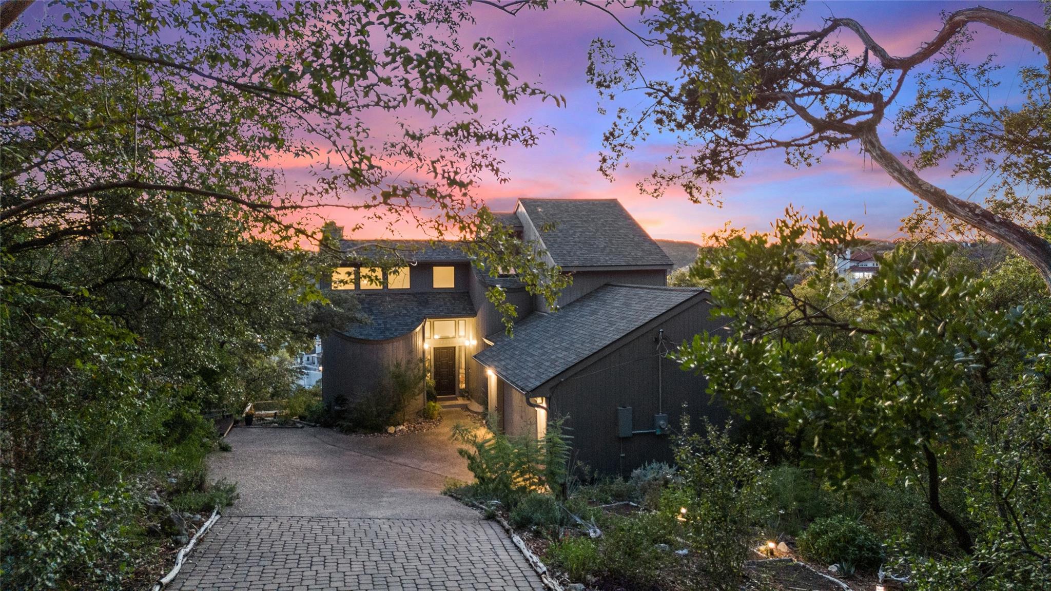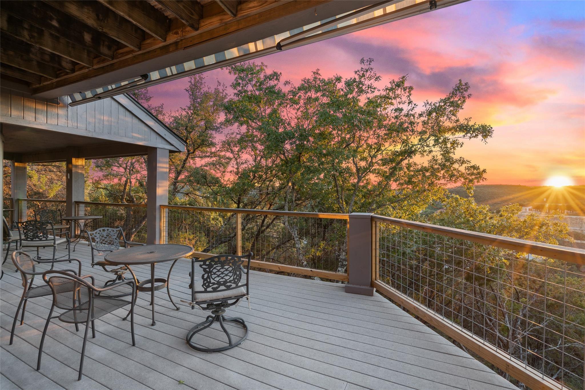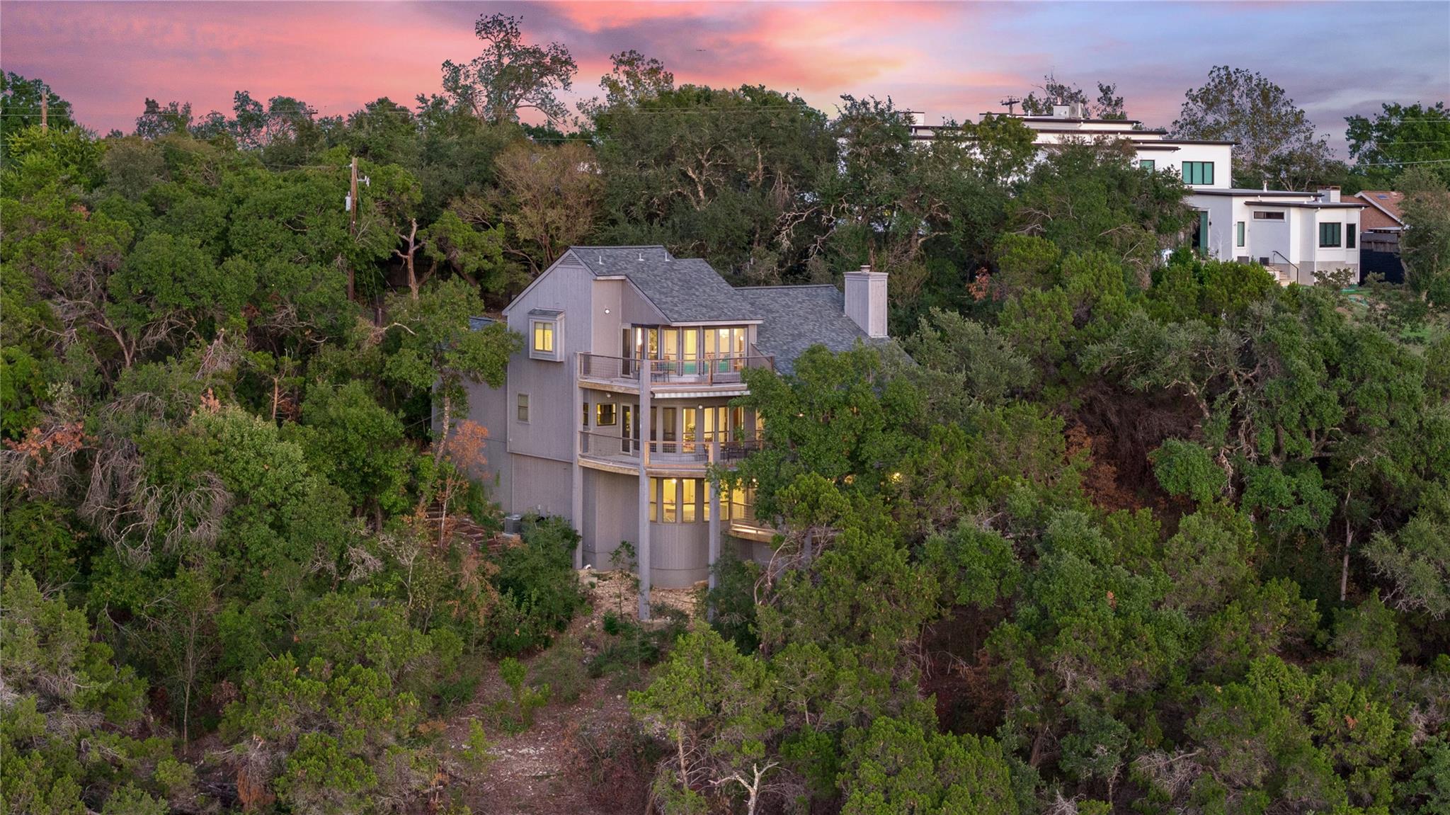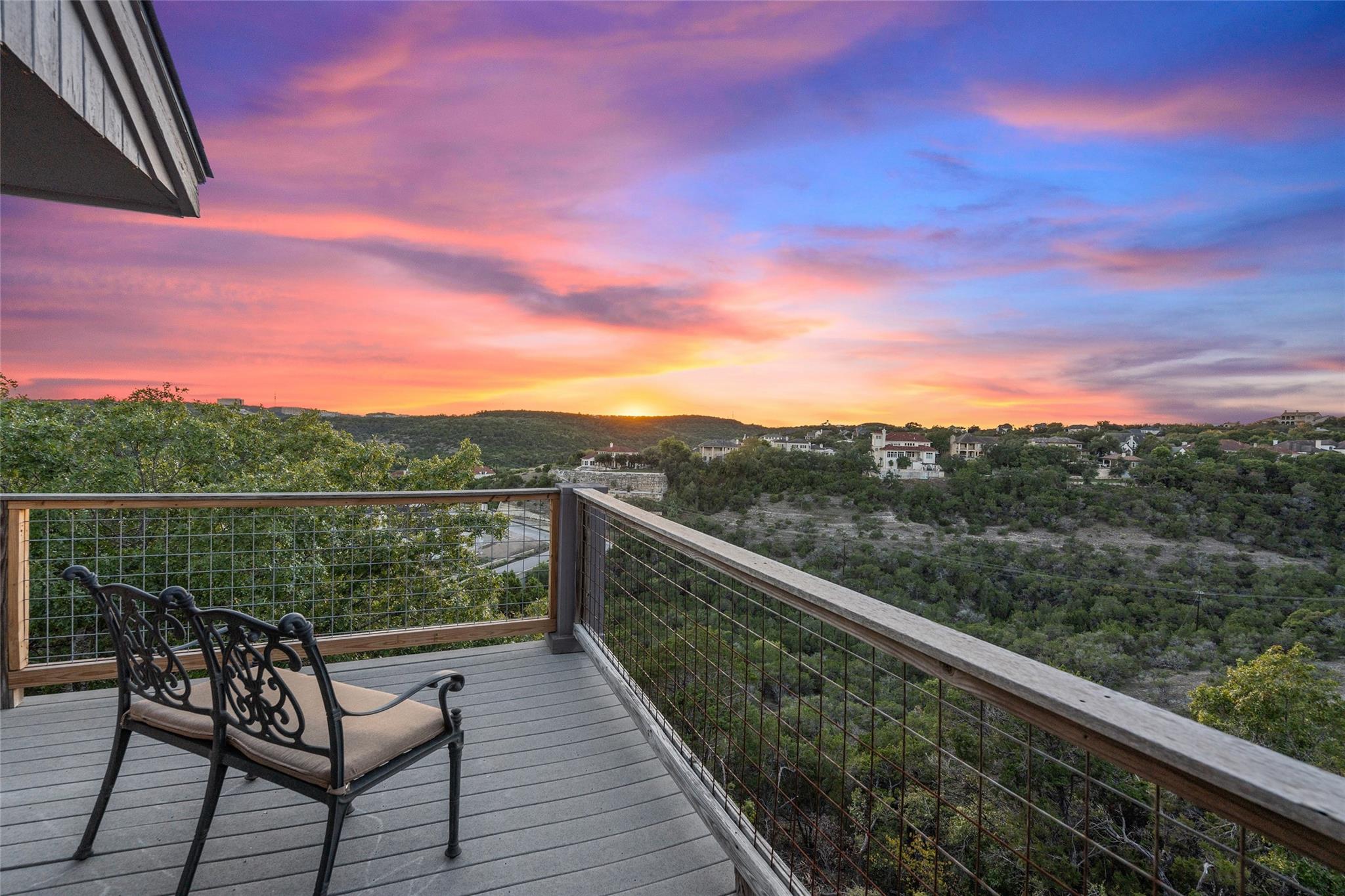 Near the city centers of Westlake and Austin, 1605 The High Road sits in an unincorporated area of Travis County, yet is only 7 miles from the Texas State Capitol and Austin’s entertainment district. It is a unique piece of Central Texas land that is backed by a preserved area, with a view of a canyon supporting a variety of native plants and wildlife. 1605 The High Road is a treehouse. Walk into the middle level, look into the canopy of the trees. Go up to the top deck to see the open sky. Walk down into the lower level and sit in the forest. Watch the weather patterns change, the rain moving across the canyon and the weather fronts moving from southwest to northeast. Inside the house, there are multiple views also. In winter, build a fire and admire the lines, angles and circles intersecting each other. Pause at the upstairs landing and look into the living area to admire the design and structure. Sit at the kitchen counter and look into the rounded window wall into the oaks or at dusk, gaze upon the sunset. Which deck to choose today for coffee or cocktail? Do I want the sunset from the top, middle or the bottom deck? Each deck provides a different view: a forest view, an open view, a canyon view and the view to the stars and sky. The three decks attached to the house were in the original design. The owners added the ‘forest’ deck to hide the septic caps. Then they built the ‘fire’ deck when the outside firepit was added. And finally, a small ‘observation’ deck was built in the front near the rounded-office area to watch the wildlife and welcome company to the property.
