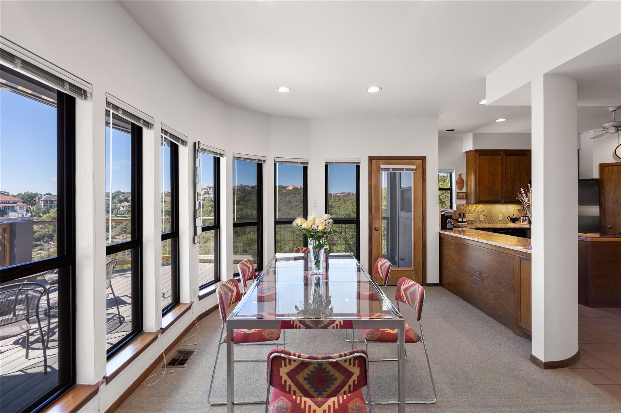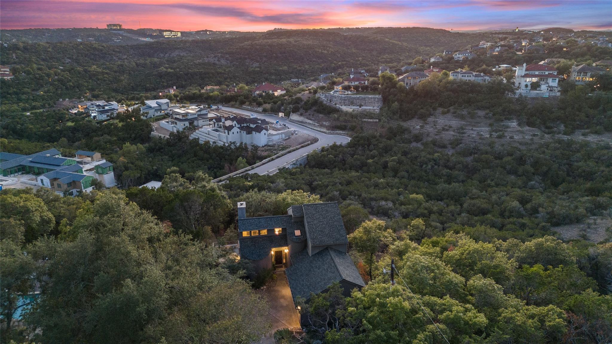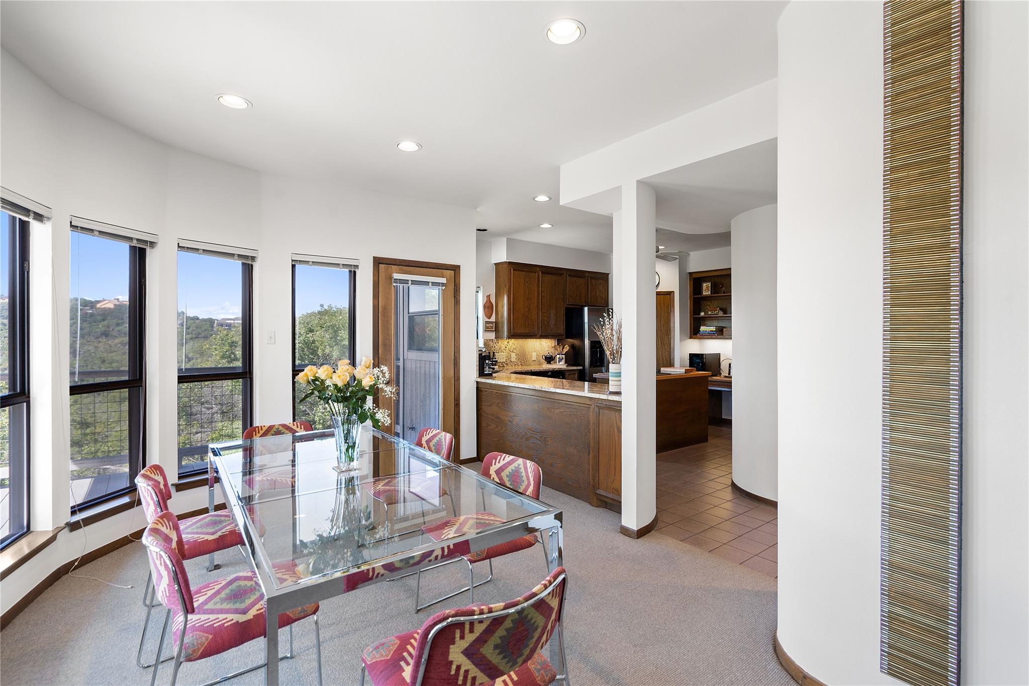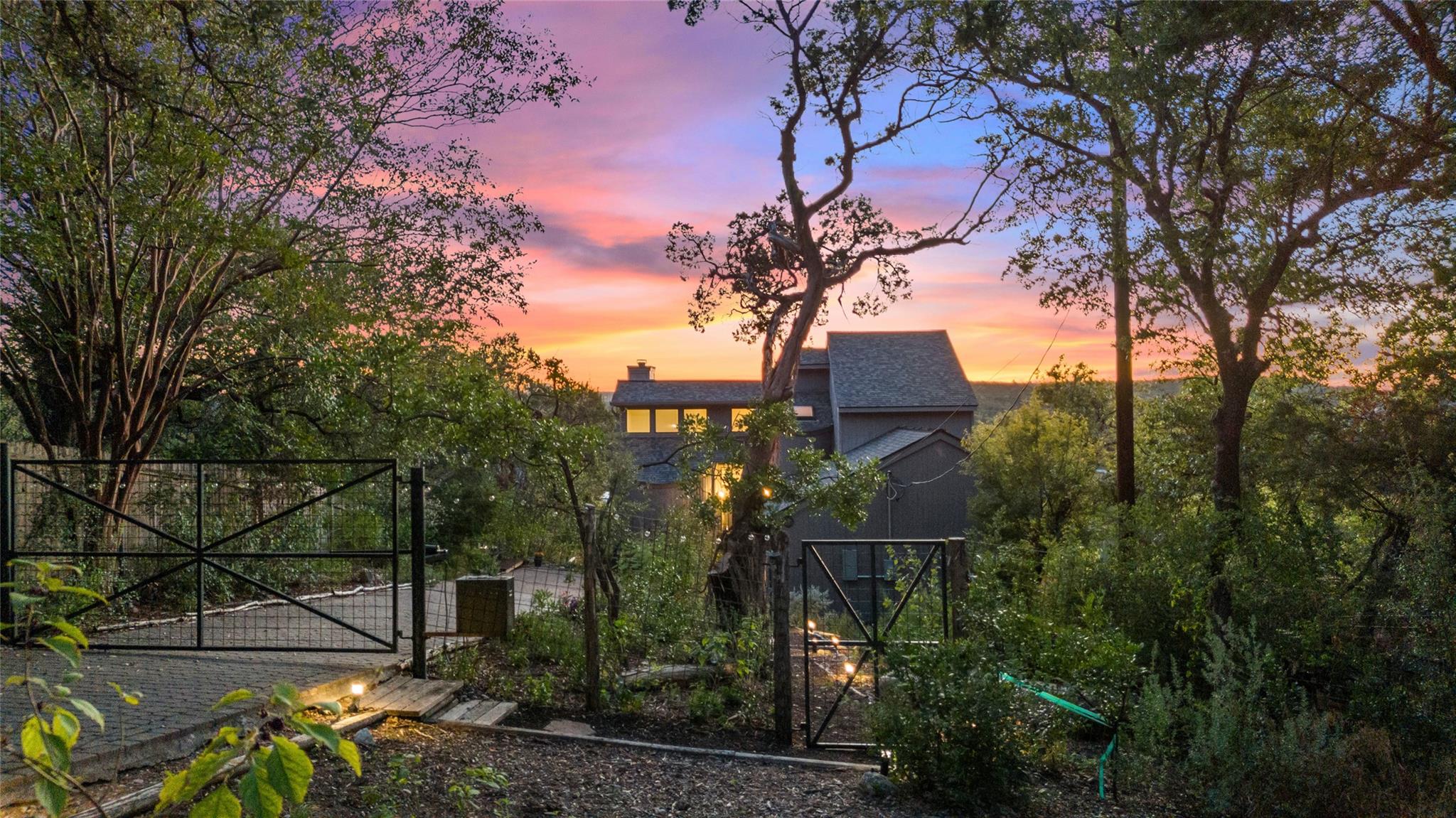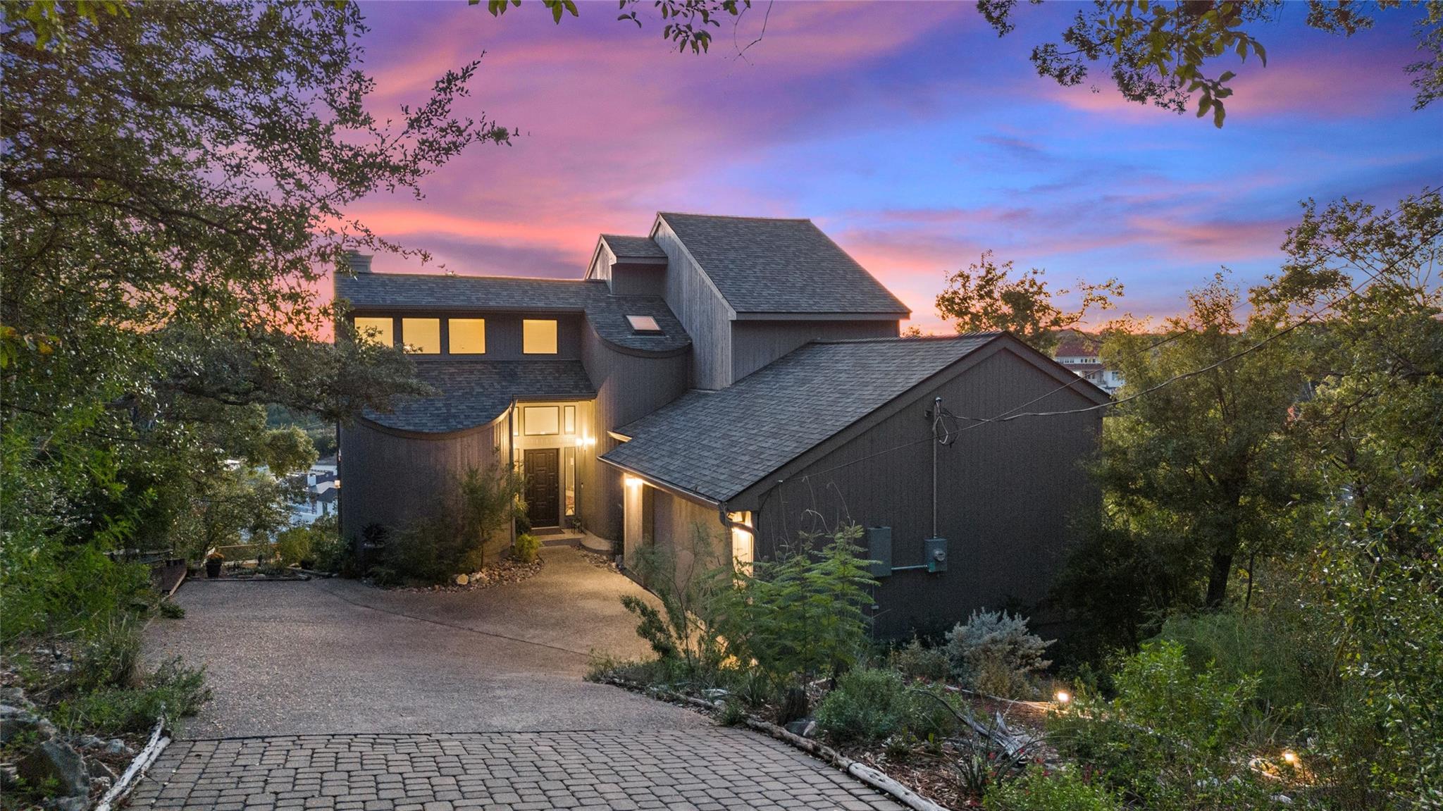 Near the city centers of Westlake and Austin, 1605 The High Road sits in an unincorporated area of Travis County, yet is only 7 miles from the Texas State Capitol and Austin’s entertainment district. It is a unique piece of Central Texas land that is backed by a preserved area, with a view of a canyon supporting a variety of native plants and wildlife. 1605 The High Road is a treehouse. Walk into the middle level, look into the canopy of the trees. Go up to the top deck to see the open sky. Walk down into the lower level and sit in the forest. Watch the weather patterns change, the rain moving across the canyon and the weather fronts moving from southwest to northeast. Inside the house, there are multiple views also. In winter, build a fire and admire the lines, angles and circles intersecting each other. Pause at the upstairs landing and look into the living area to admire the design and structure. Sit at the kitchen counter and look into the rounded window wall into the oaks or at dusk, gaze upon the sunset. Which deck to choose today for coffee or cocktail? Do I want the sunset from the top, middle or the bottom deck? Each deck provides a different view: a forest view, an open view, a canyon view and the view to the stars and sky. The three decks attached to the house were in the original design. The owners added the ‘forest’ deck to hide the septic caps. Then they built the ‘fire’ deck when the outside firepit was added. And finally, a small ‘observation’ deck was built in the front near the rounded-office area to watch the wildlife and welcome company to the property.