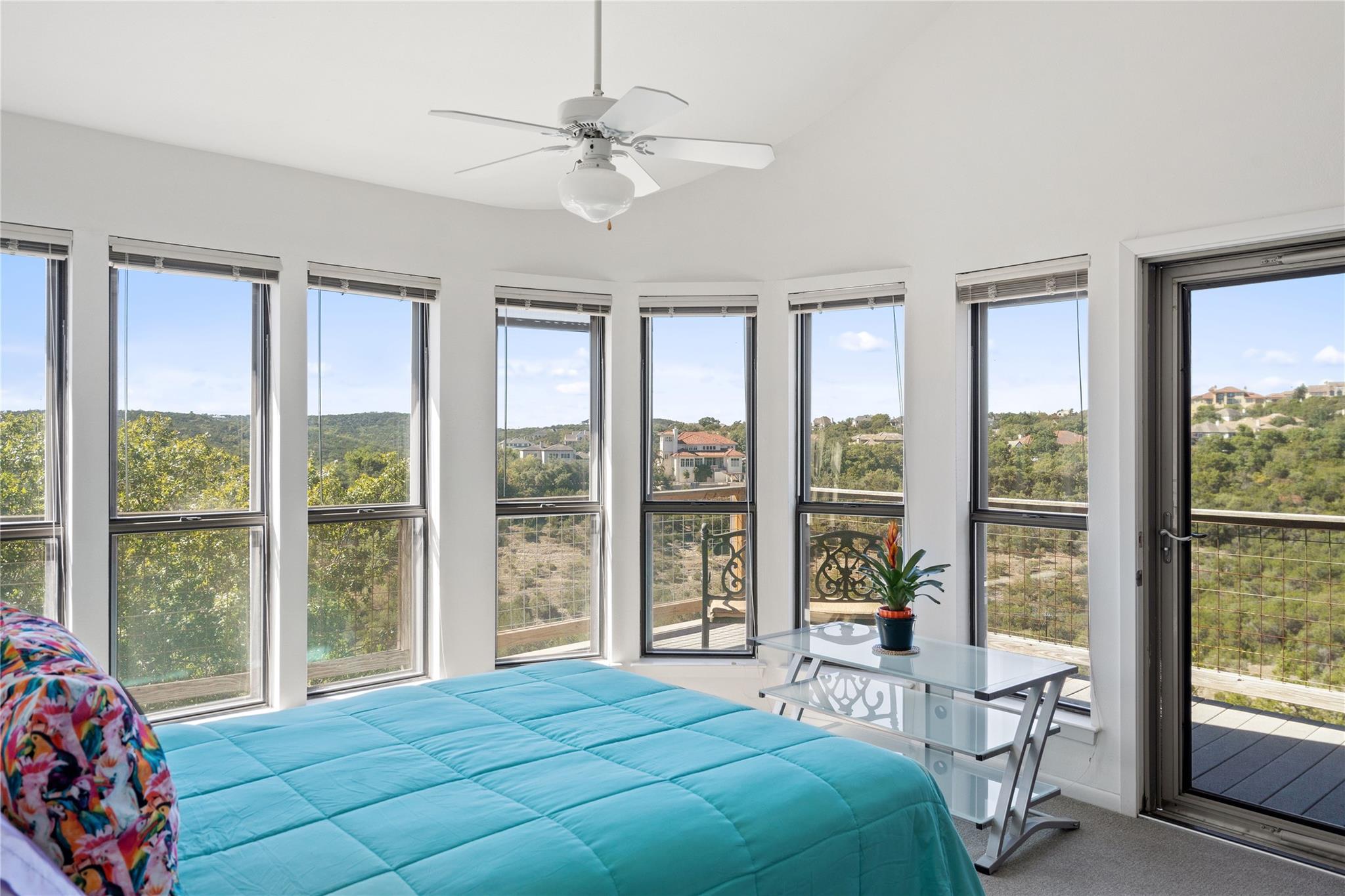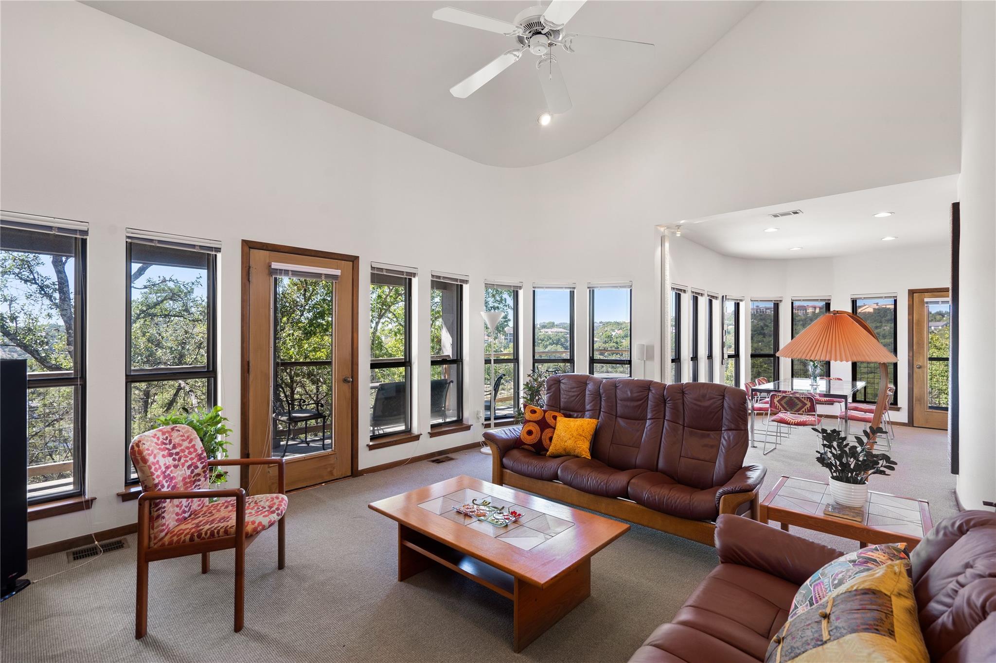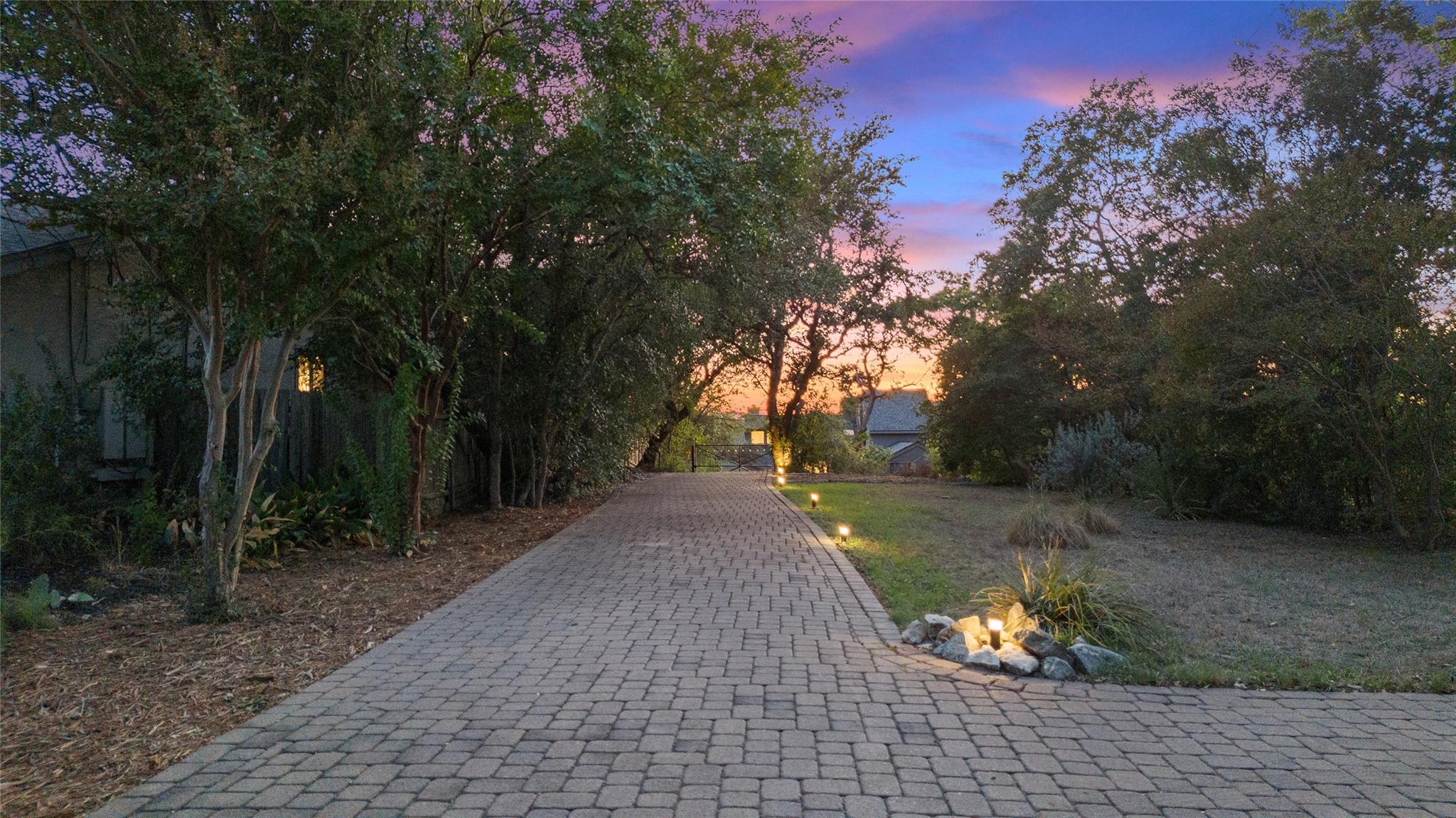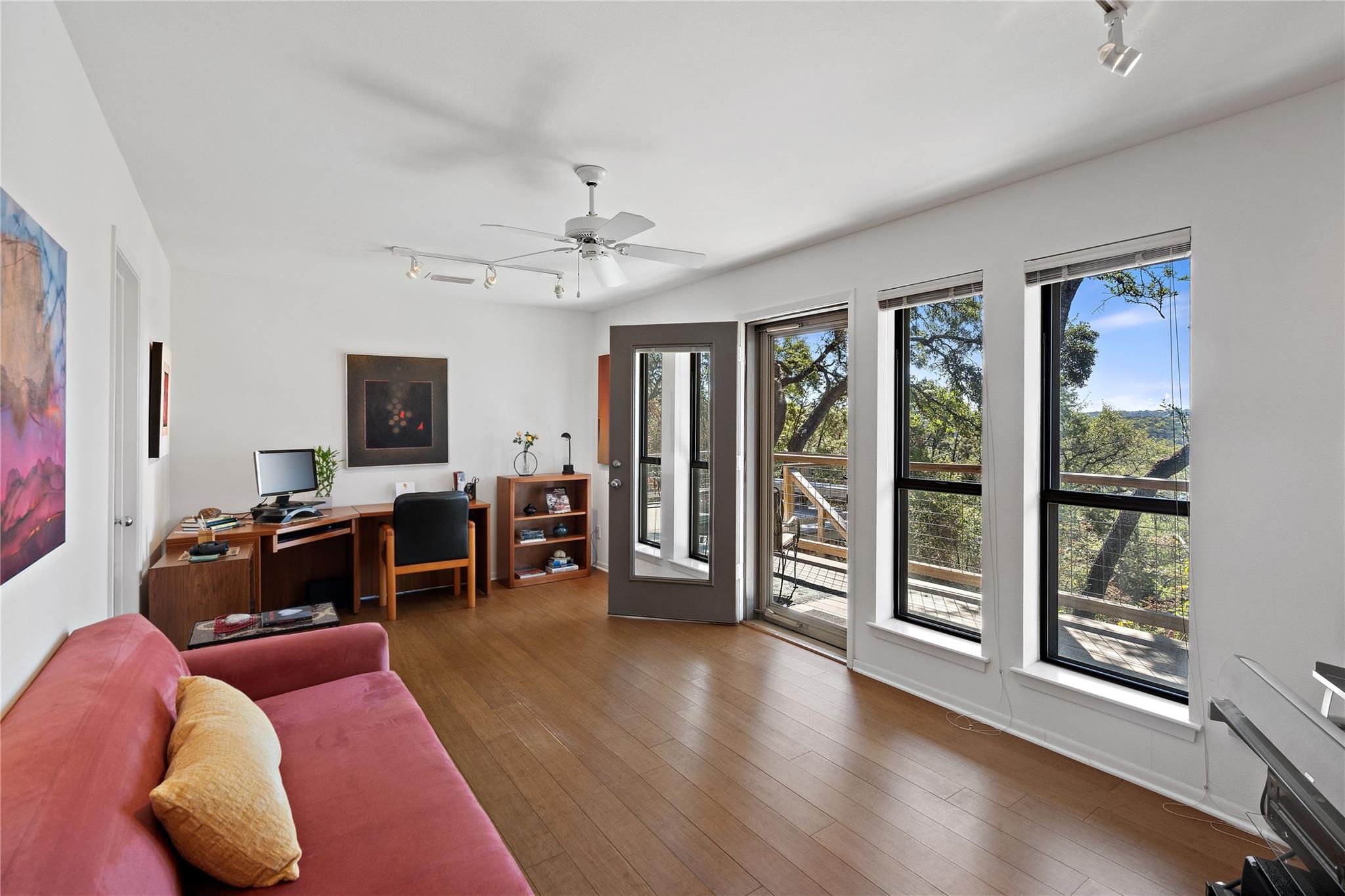 Near the city centers of Westlake and Austin, 1605 The High Road sits in an unincorporated area of Travis County, yet is only 7 miles from the Texas State Capitol and Austin’s entertainment district. It is a unique piece of Central Texas land that is backed by a preserved area, with a view of a canyon supporting a variety of native plants and wildlife. 1605 The High Road is a treehouse. Walk into the middle level, look into the canopy of the trees. Go up to the top deck to see the open sky. Walk down into the lower level and sit in the forest. Watch the weather patterns change, the rain moving across the canyon and the weather fronts moving from southwest to northeast. Inside the house, there are multiple views also. In winter, build a fire and admire the lines, angles and circles intersecting each other. Pause at the upstairs landing and look into the living area to admire the design and structure. Sit at the kitchen counter and look into the rounded window wall into the oaks or at dusk, gaze upon the sunset. Which deck to choose today for coffee or cocktail? Do I want the sunset from the top, middle or the bottom deck? Each deck provides a different view: a forest view, an open view, a canyon view and the view to the stars and sky. The three decks attached to the house were in the original design. The owners added the ‘forest’ deck to hide the septic caps. Then they built the ‘fire’ deck when the outside firepit was added. And finally, a small ‘observation’ deck was built in the front near the rounded-office area to watch the wildlife and welcome company to the property.