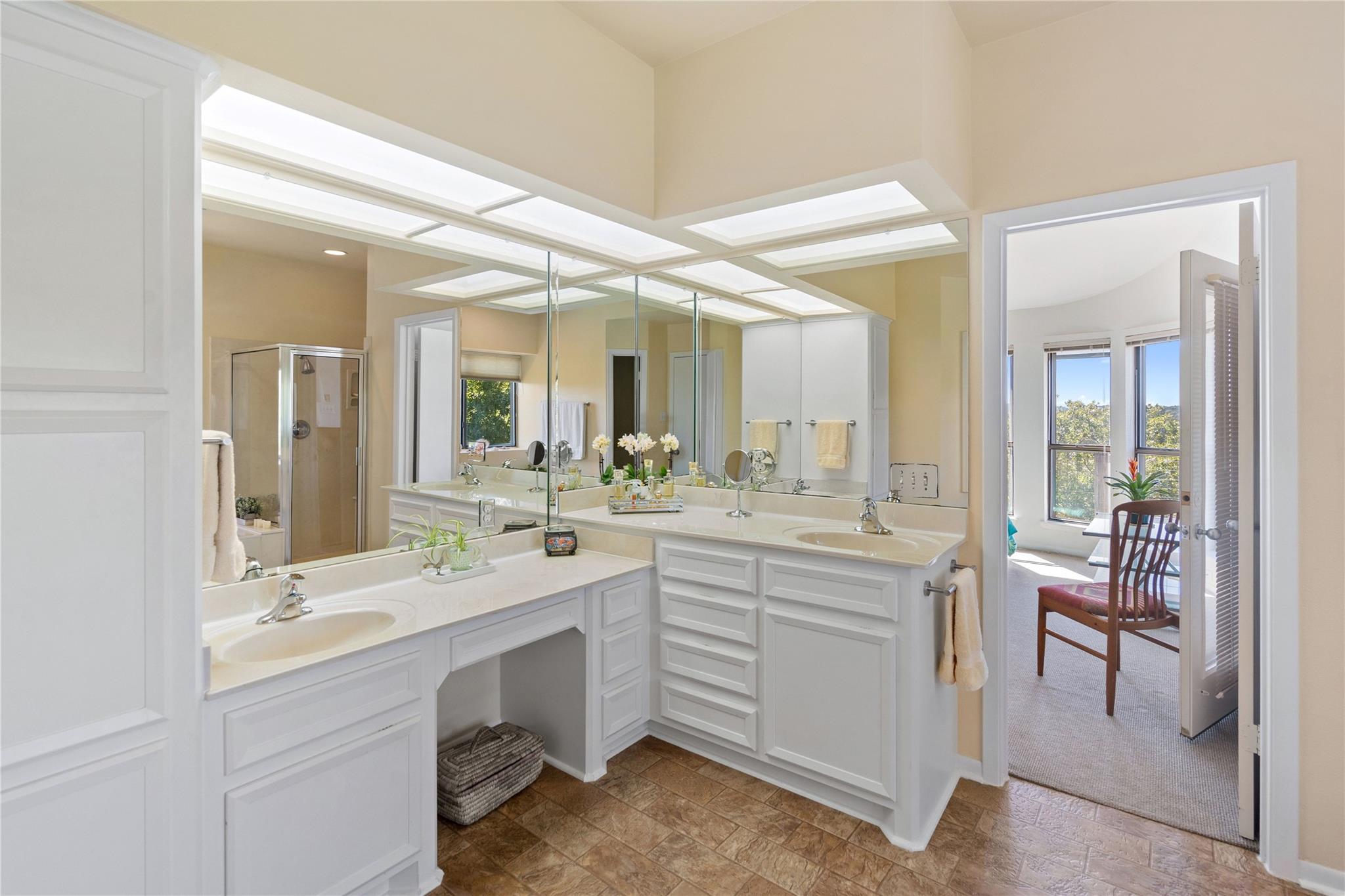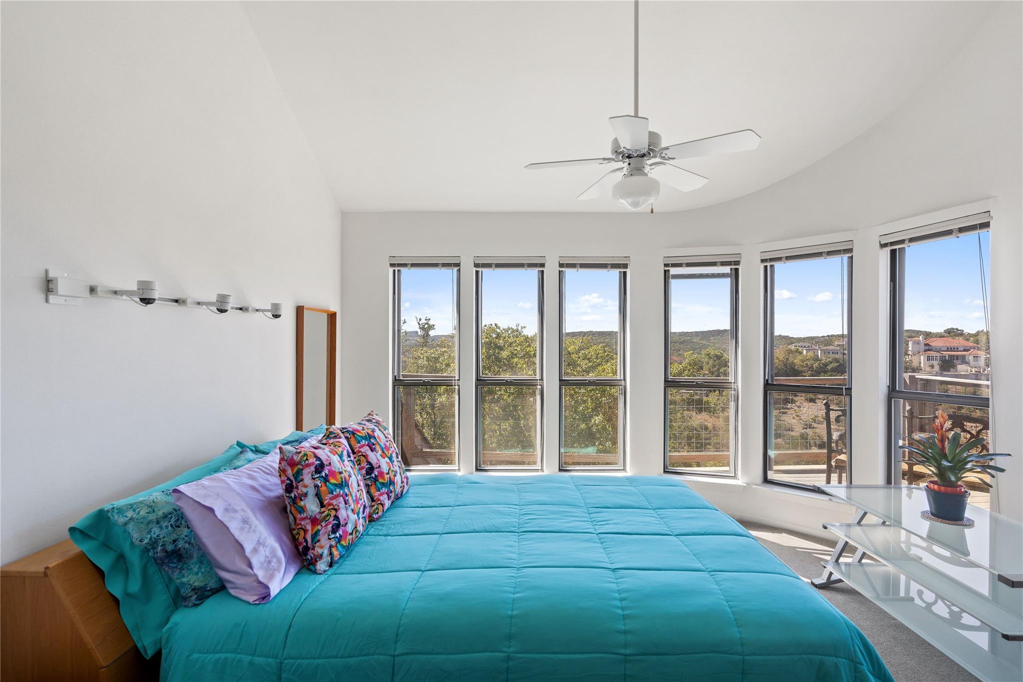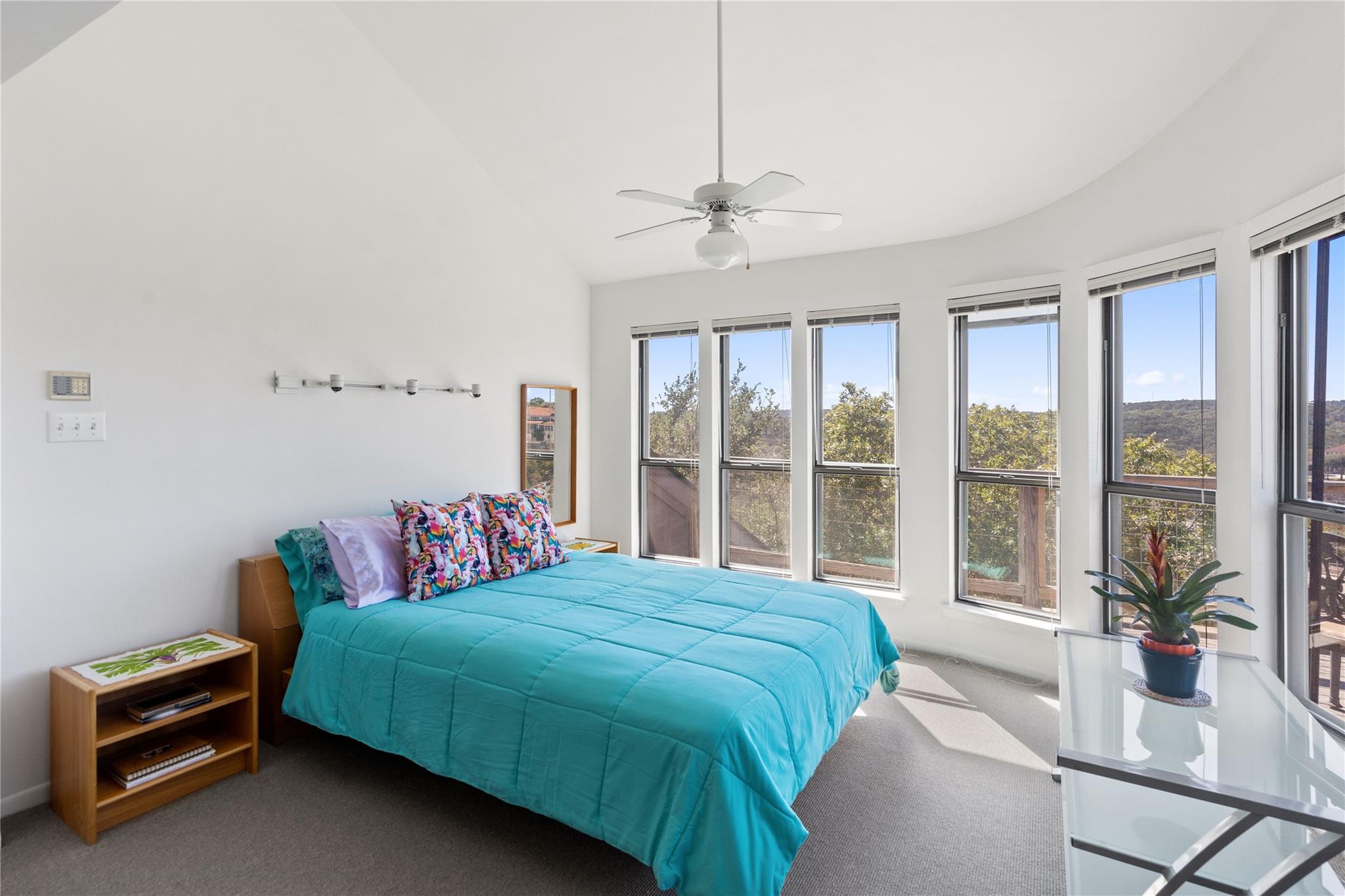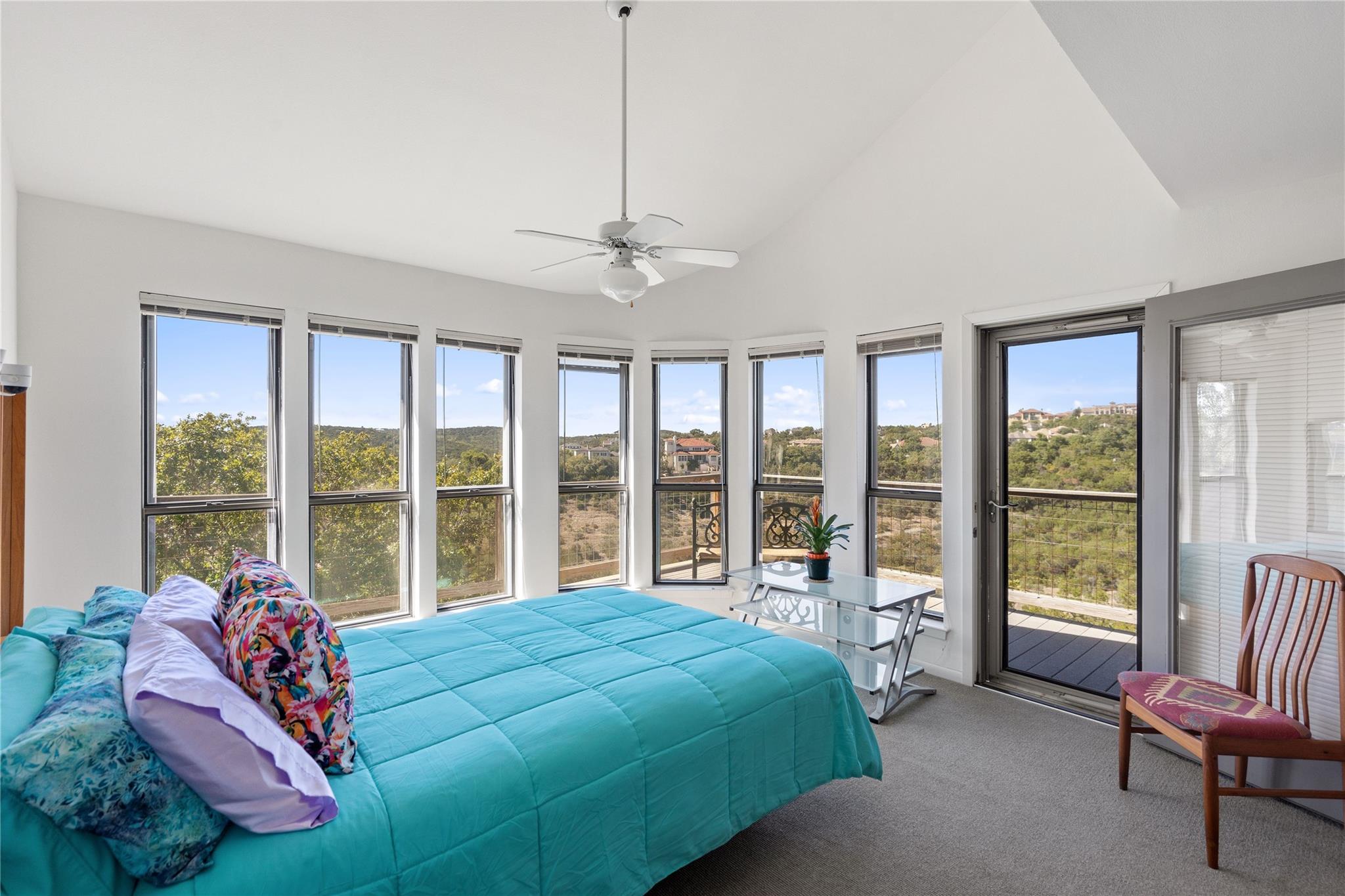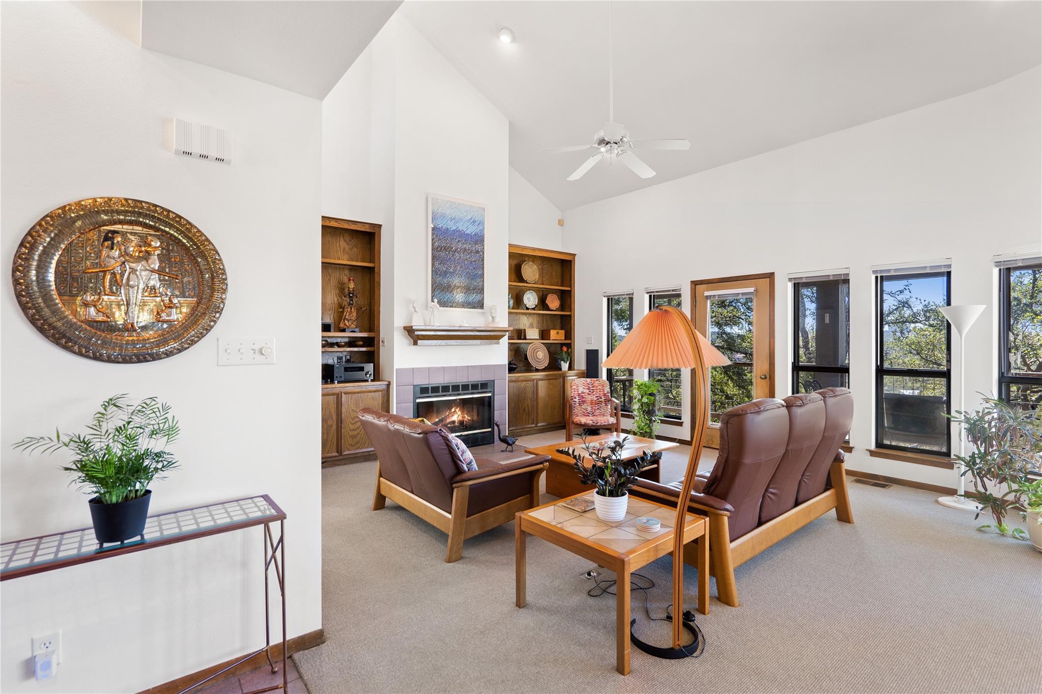 Near the city centers of Westlake and Austin, 1605 The High Road sits in an unincorporated area of Travis County, yet is only 7 miles from the Texas State Capitol and Austin’s entertainment district. It is a unique piece of Central Texas land that is backed by a preserved area, with a view of a canyon supporting a variety of native plants and wildlife. 1605 The High Road is a treehouse. Walk into the middle level, look into the canopy of the trees. Go up to the top deck to see the open sky. Walk down into the lower level and sit in the forest. Watch the weather patterns change, the rain moving across the canyon and the weather fronts moving from southwest to northeast. Inside the house, there are multiple views also. In winter, build a fire and admire the lines, angles and circles intersecting each other. Pause at the upstairs landing and look into the living area to admire the design and structure. Sit at the kitchen counter and look into the rounded window wall into the oaks or at dusk, gaze upon the sunset. Which deck to choose today for coffee or cocktail? Do I want the sunset from the top, middle or the bottom deck? Each deck provides a different view: a forest view, an open view, a canyon view and the view to the stars and sky. The three decks attached to the house were in the original design. The owners added the ‘forest’ deck to hide the septic caps. Then they built the ‘fire’ deck when the outside firepit was added. And finally, a small ‘observation’ deck was built in the front near the rounded-office area to watch the wildlife and welcome company to the property.