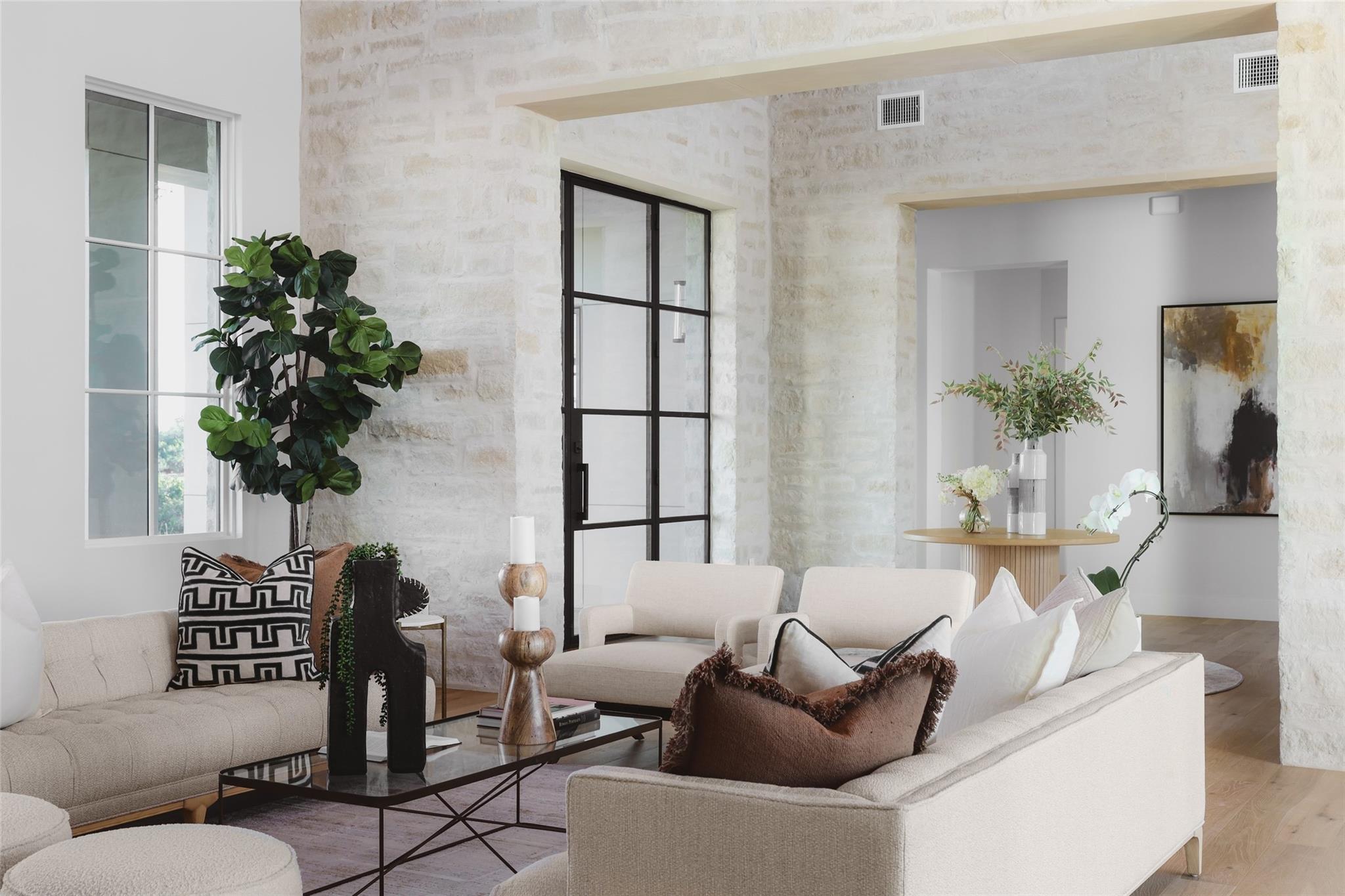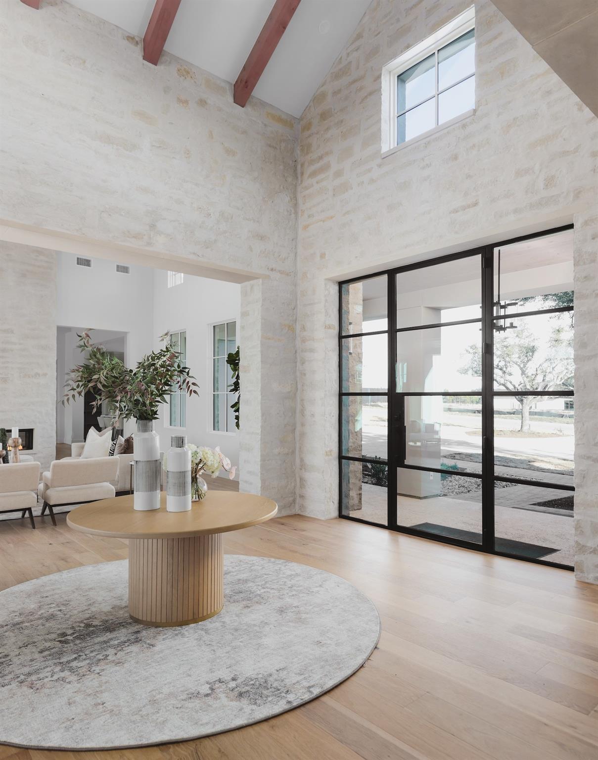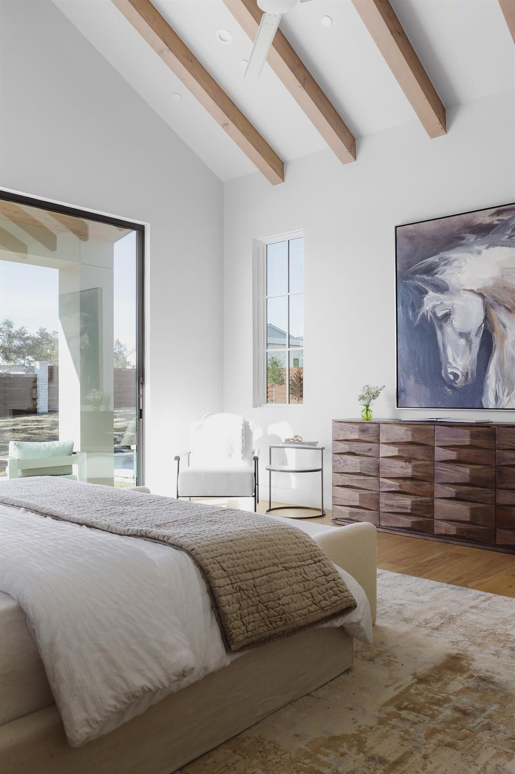 Indulge in the epitome of European country side living within the exclusive gates of Madrone Canyon at Chateau Madrone. This exquisite SINGLE STORY home, crafted by the esteemed Ames Design Build, is a masterpiece of open design, meticulous construction, and contemporary elegance. Upon entering, a grand 2-story entry welcomes you with 18' cathedral beamed ceilings, setting the tone for the luxurious interiors. The 6 bed, 6.5 bath interior is thoughtfully designed with finishes such as white oak wood floors, wood beams throughout, and buff lueder stone with an intricate over-grout finish. The formal living room features a 2-story natural stone double fireplace that seamlessly connects to the dining room. 10’ Western slider doors line the living spaces creating a seamless indoor/outdoor living experience. The kitchen is a culinary haven with Wolf & Sub-Zero appliances, an oversized island, double ovens, and double dishwashers and opens to the dining and secondary living space, creating a effortless flow. Further, the home enjoys a large utility room with plumbing for a fridge and ample storage. Attached to the utility room is an Amazon package drop area, ensuring peace of mind from inclement weather. All the secondary bedrooms enjoy en-suite bathrooms, and their own unique and luxurious features. The primary suite is incredibly spacious, and enjoys elevated features like beamed cathedral ceilings, large windows looking out to the pool, a private patio, and a large primary bath. The primary bath was exquisitely designed, with a separate vanity, soaking tub, gold accents, and a walk-in closet. Enjoy outdoor living with ample entertainment space adorned by mature oak trees, a beautiful pool & spa combination. The 3-car garage with electrical for a charging station and plumbing closet for a home water filtration system. This home is a perfect blend of luxurious living, natural features and functional design.