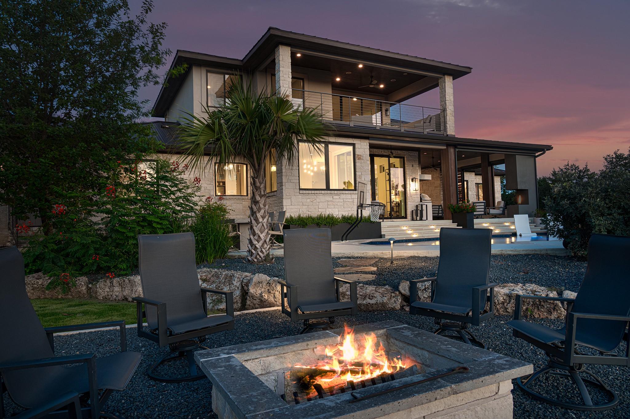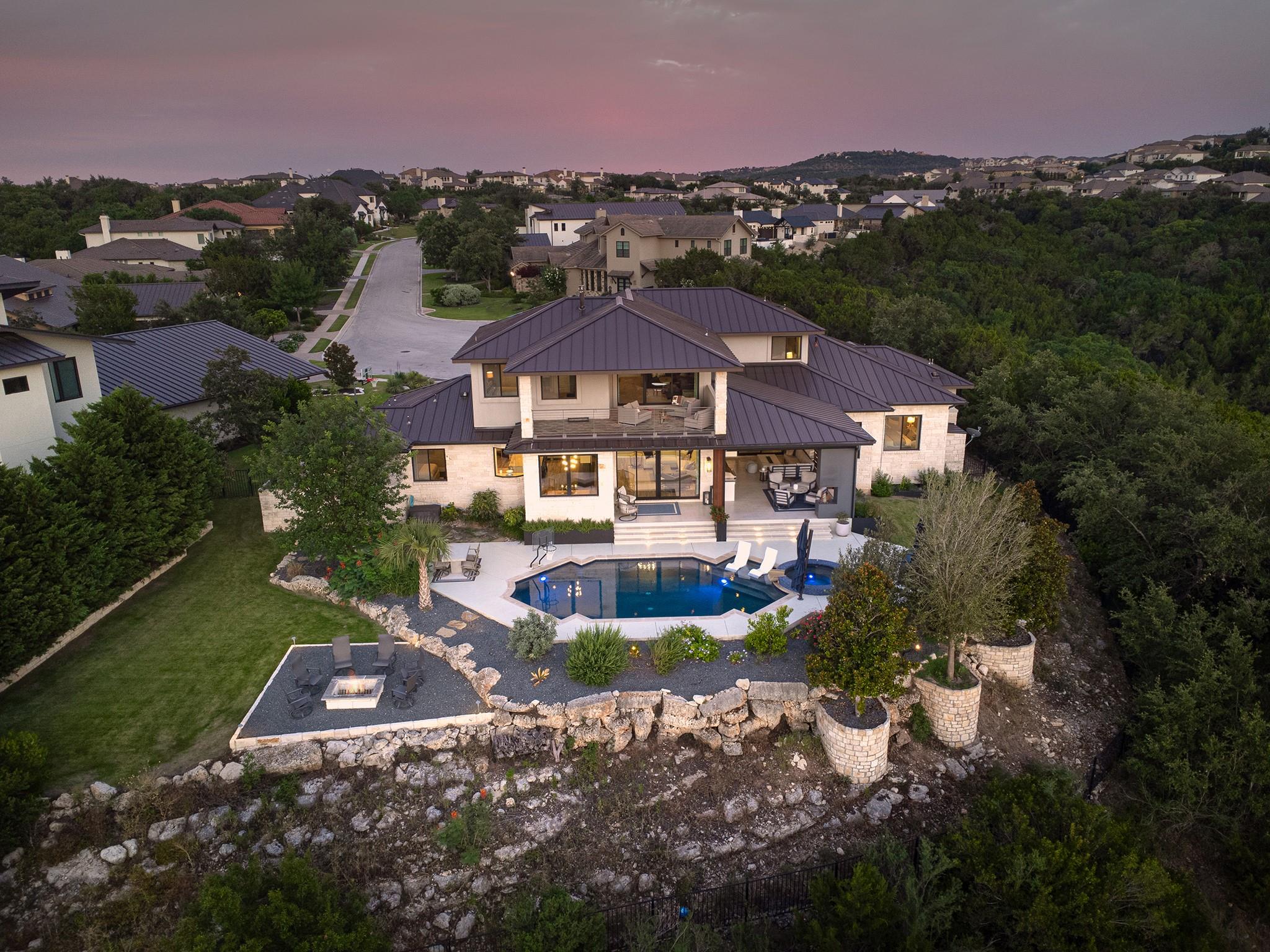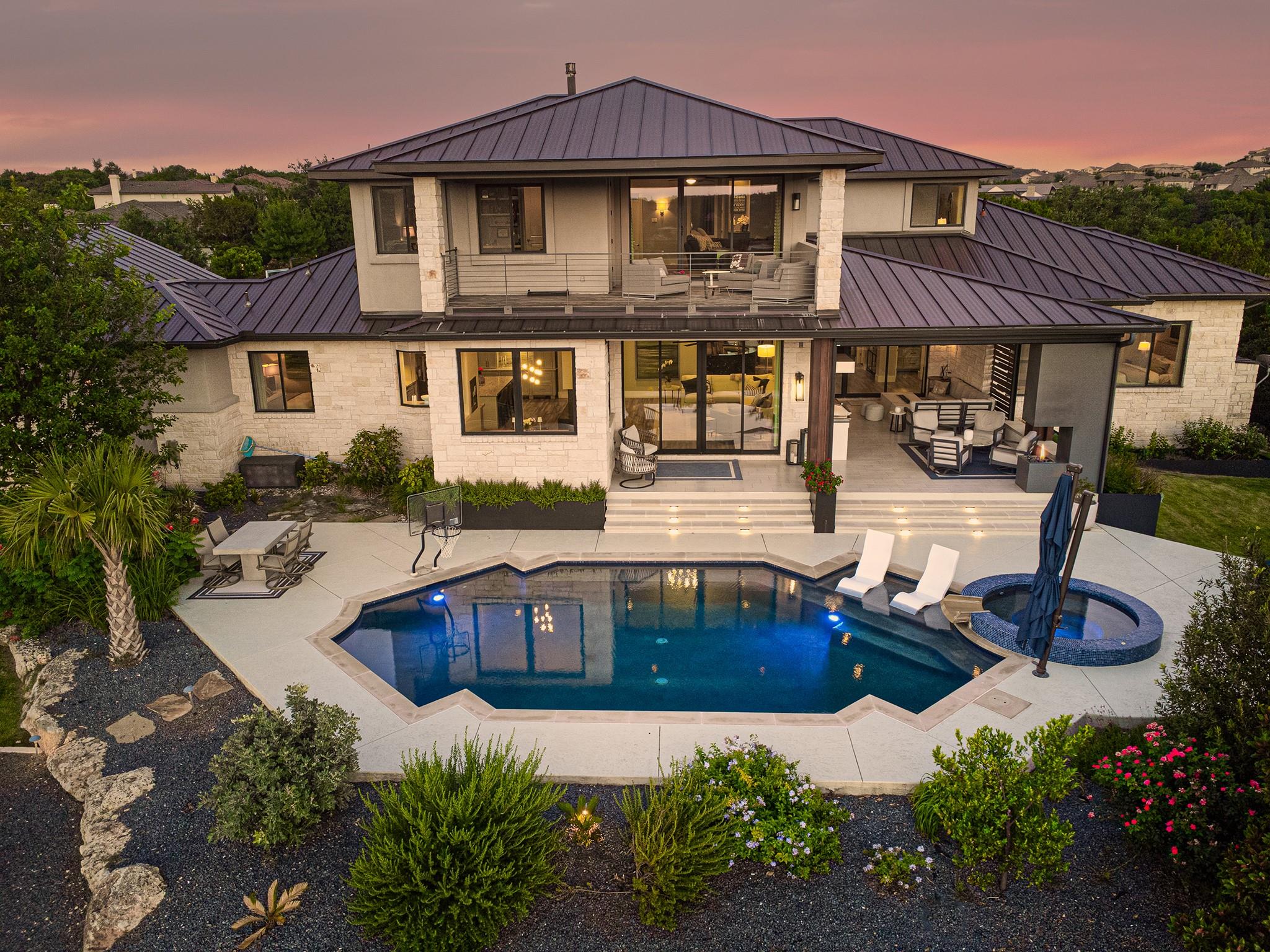 **Recently added $50K project retaining wall with mature plants to provide additional privacy from Las Brisas Estates across the greenbelt** Welcome to this custom built home that was made for entertaining and enjoying! Nestled in the highly sought after Canyonside section of Rough Hollow, this 1/2 acre lot is located at the back of a cul-de-sac. Enjoy stunning 180 degree hill country views from your private pool, hot tub and outdoor living space complete with full outdoor kitchen, multiple seating areas with fireplaces and automatic screens. And don't forget about sitting around the fire pit – perfect for watching unforgettable sunsets! Inside you'll find over 5,000 square feet of luxurious living space featuring 5 bedrooms and 4.5 bathrooms. The Chefs gourmet kitchen is sure to please any cook with top of the line appliances while the wet bar adjacent to the dining room and living room will make hosting guests a breeze. The primary bedroom comes complete with spa like bathroom that includes dual vanities, huge walk in shower, huge walk in closet AND a separate gym! Plus there's an additional guest room with ensuite bathroom on the main level conveniently located near the pool area for extra privacy when needed. Upstairs features game room that opens to a balcony offering breathtaking views as far as they eye can see! 1 bedroom with a private bathroom and 2 bedrooms that share a Jack and Jill bathroom with private vanities, and an organized storage room complete the upstairs space. With designer finishes throughout the home, you are sure to fall in love. This beautiful home has everything you need to enjoy life every day - don't miss out on making it yours today!