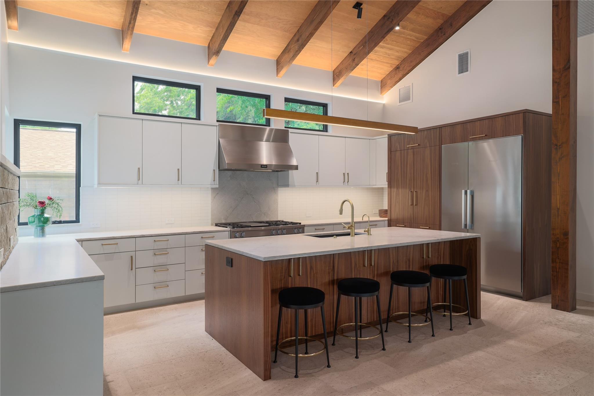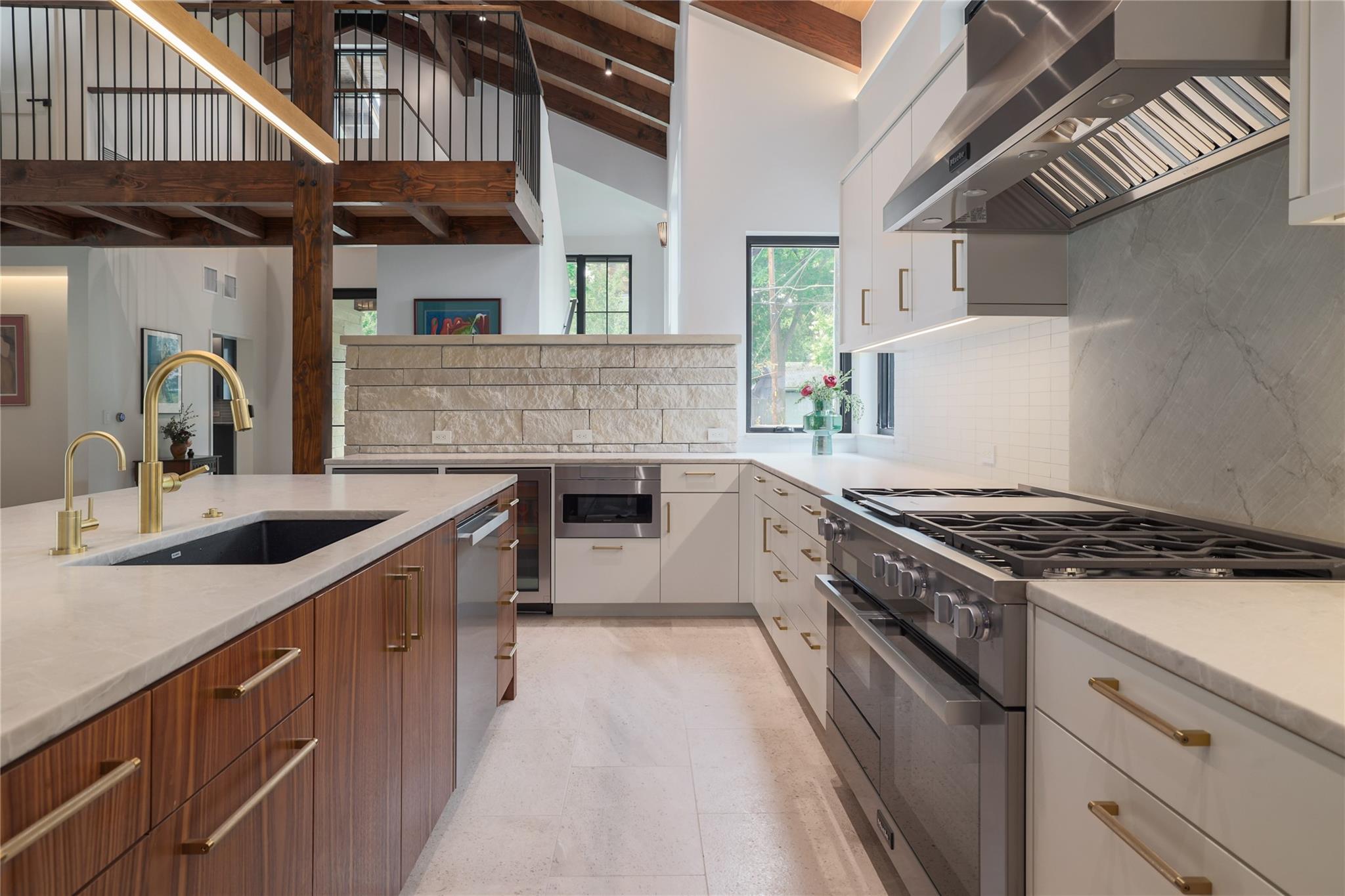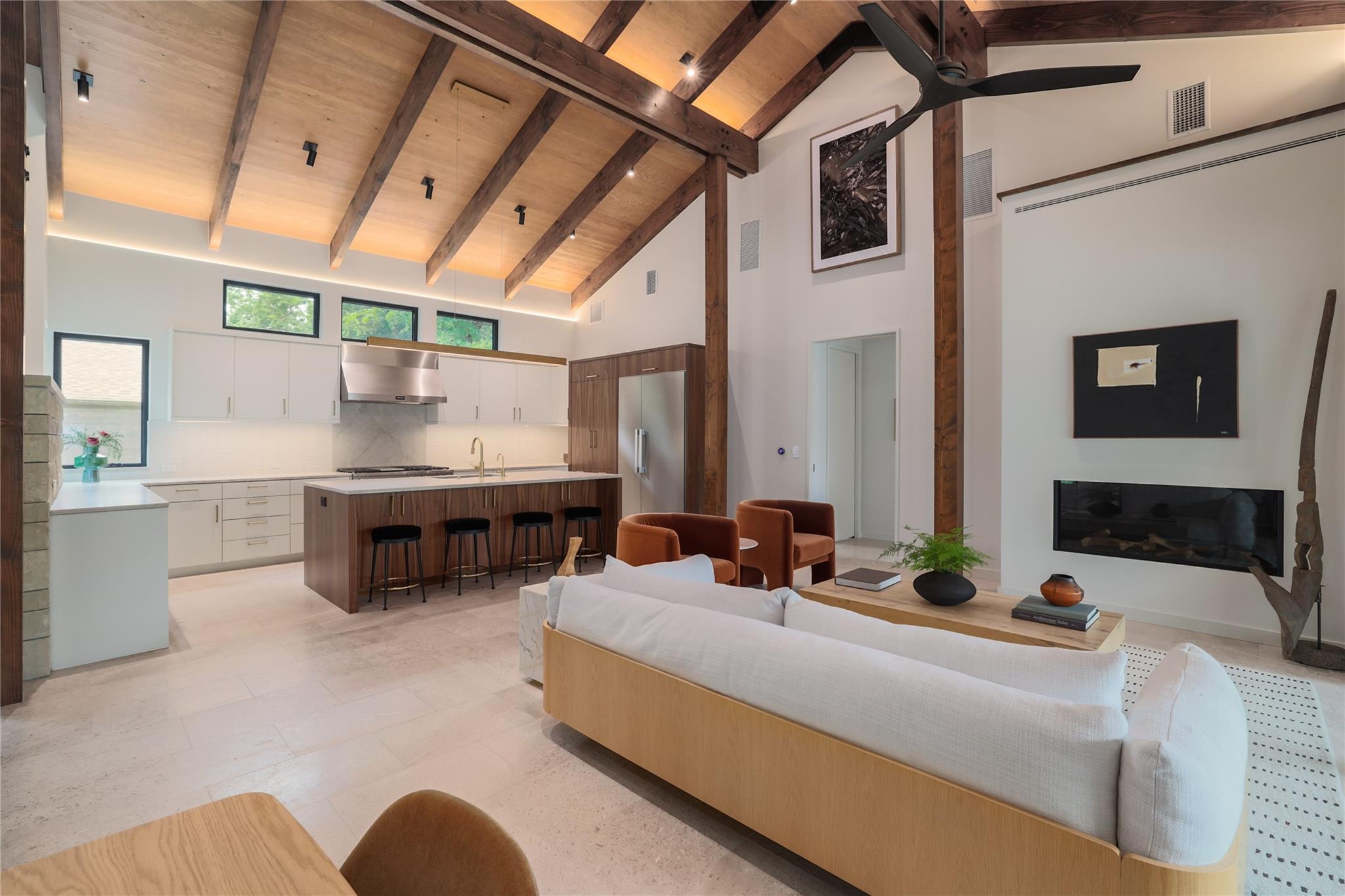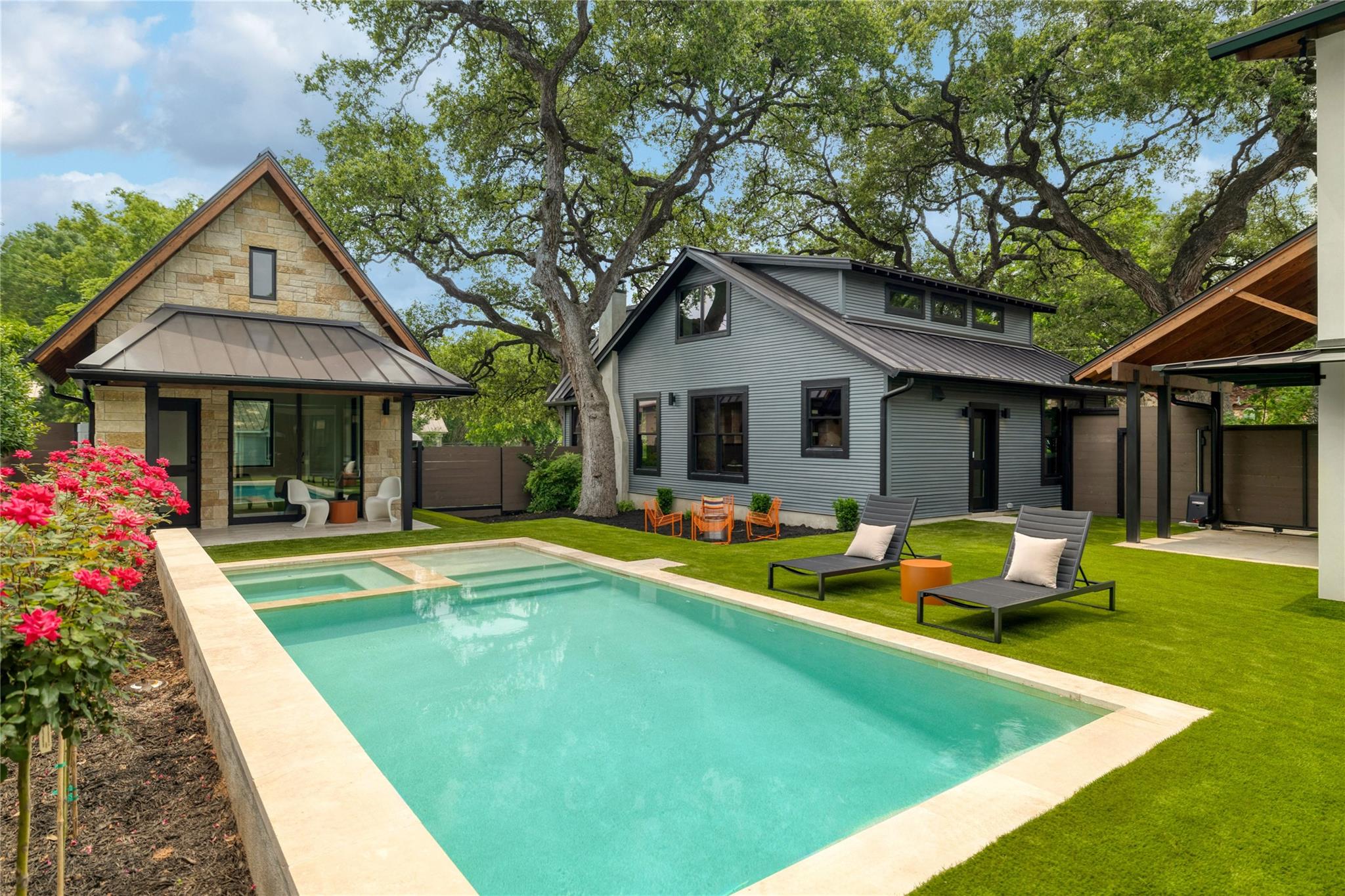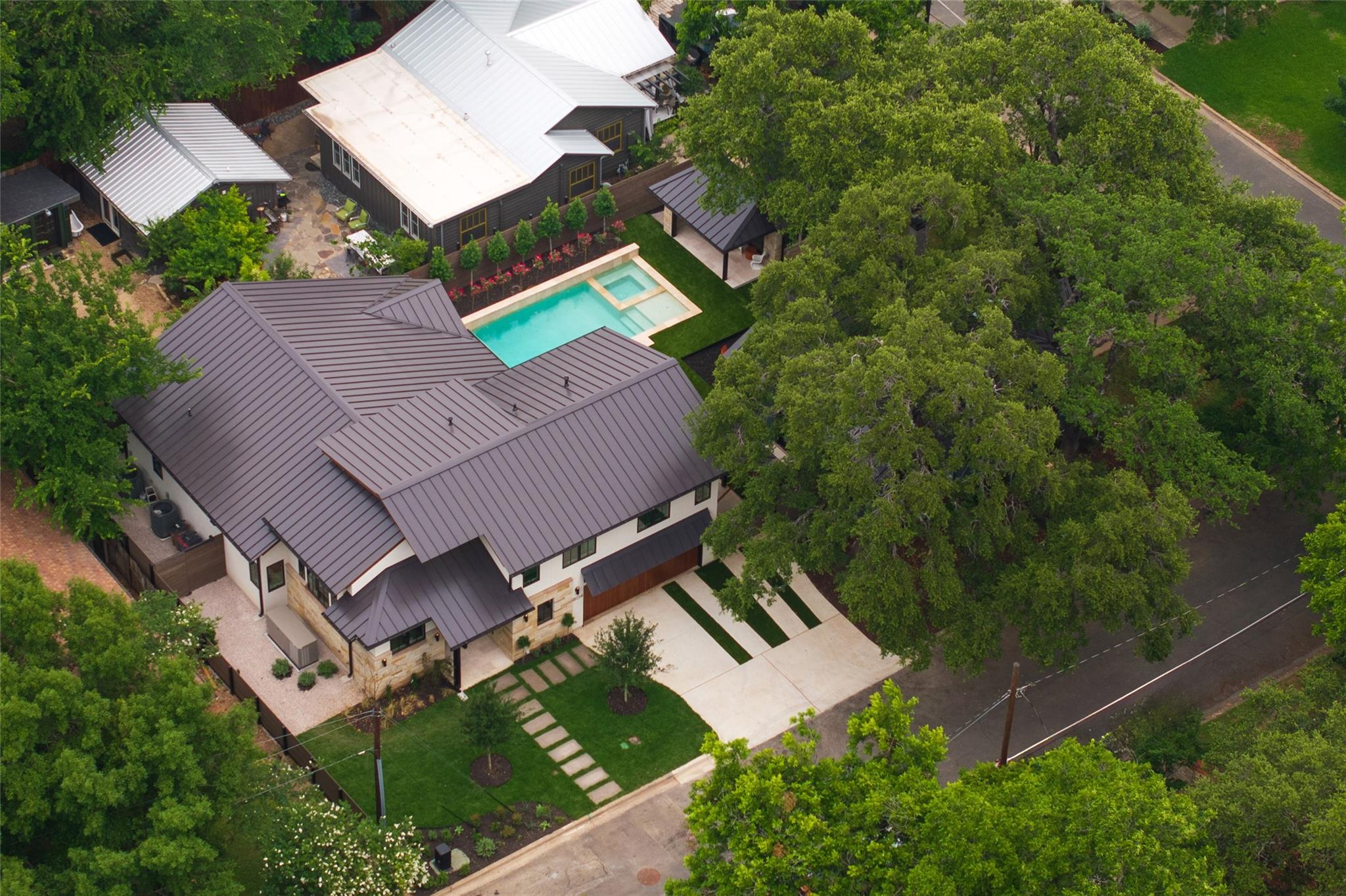 A stunning collaboration between Black & Vernooy Architecture and Craig Parker of Homes by Parker, this luxury Zilker Compound is comprised of the original early 1930s Cottage (2/2) meticulously restored & remodeled, a New-Build Main Home (3/3.5) with gorgeous Douglas Fir beams, a Pool House with a full bath and cathedral steel trusses, plus a heated pool & spa! The main home's kitchen is an entertainer’s dream, featuring an oversized walnut island, Miele appliances, satin brass plumbing fixtures, & quartzite countertops. Cathedral wooden ceilings adorn the living spaces, while a three-panel sliding door connects the interior to an expansive covered porch overlooking the pool & serene backyard. The primary suite is on the main floor, with a standalone tub in front of a leather-finished quartzite wall, an oversized walnut vanity and a marble floor. The upper floor includes two private bedrooms with ensuite baths, an additional living space, and a light-filled sun porch. Surrounded by heritage oaks, the restored cottage connects the property to its original roots. Updates include a new kitchen, refinished original pine shiplap, oak wood flooring, doors & fireplace, stackable washer/dryer closet & all-new HVAC, plumbing, electrical & insulation, plus an added secluded loft+full bathroom. A horizontal cedar fence with steel posts enclose the compound with an automatic sliding carport gate & 3 sliding pedestrian entrances. Additional compound amenities include high-efficiency HVAC zoned systems, Nest thermostats and Lutron smart lighting controls, Ring cameras, four circulating Navian tankless hot water heaters, new engineered reinforced suspension concrete foundations, and a 58 KW Kohler liquid-cooled quiet generator, large enough to power all three buildings. With fastidious attention to detail, this spectacular property offers a unique blend of modern luxury and historic charm with endless privacy, providing the ultimate Austin living experience.