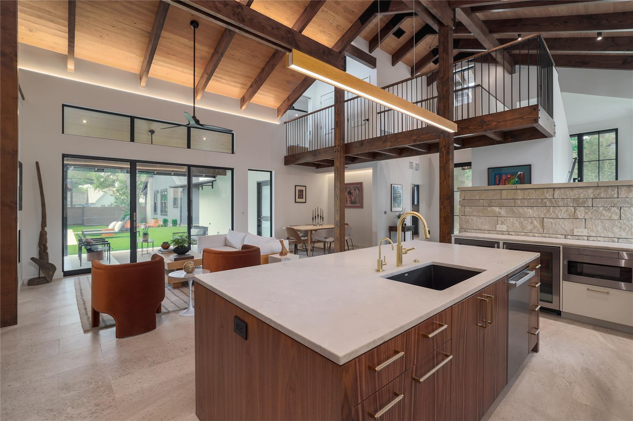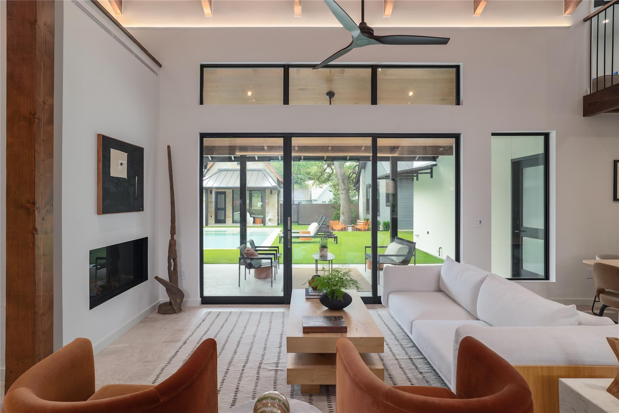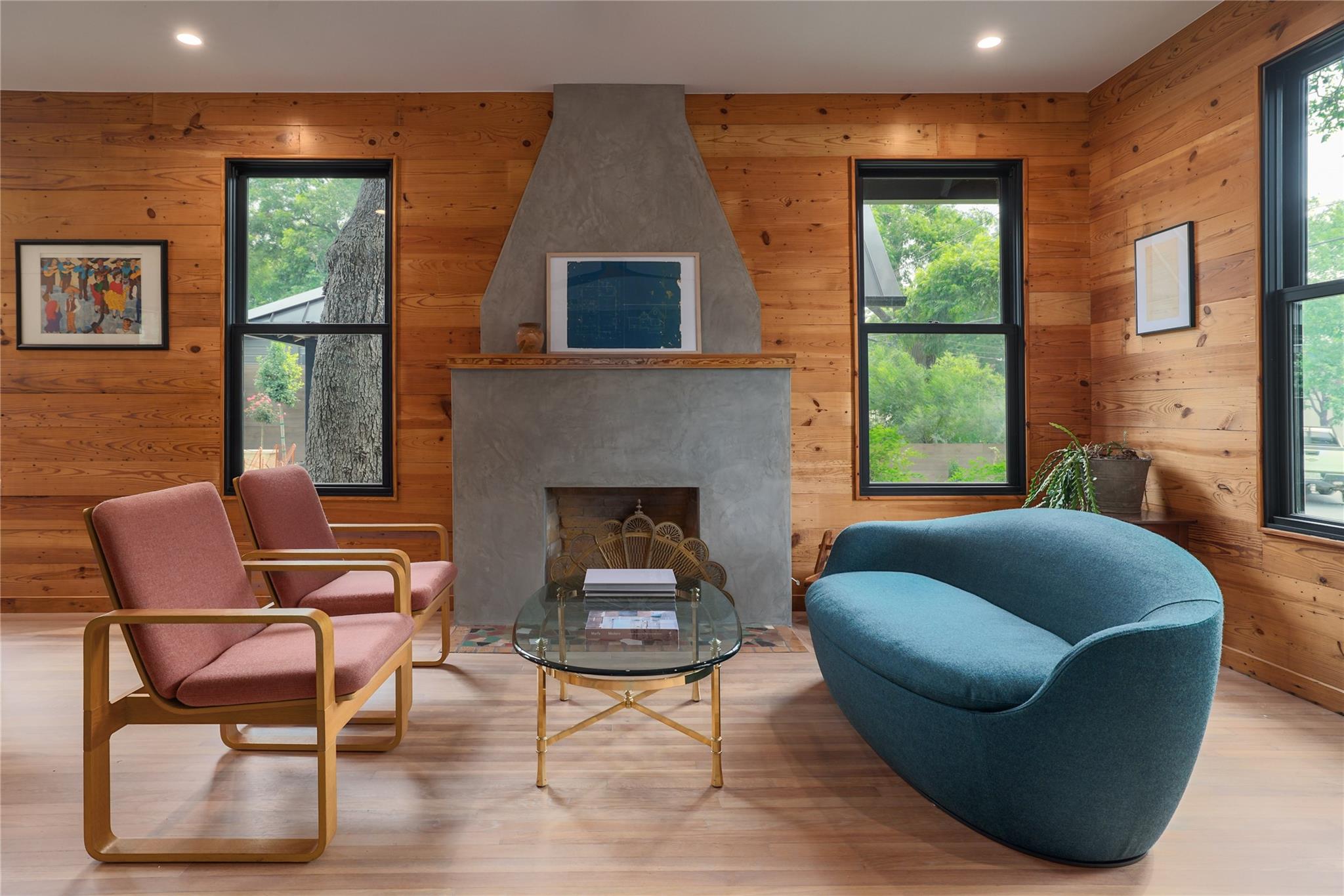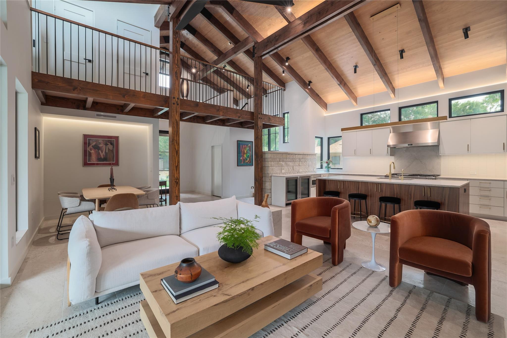 A stunning collaboration between Black & Vernooy Architecture and Craig Parker of Homes by Parker, this luxury Zilker Compound is comprised of the original early 1930s Cottage (2/2) meticulously restored & remodeled, a New-Build Main Home (3/3.5) with gorgeous Douglas Fir beams, a Pool House with a full bath and cathedral steel trusses, plus a heated pool & spa! The main home's kitchen is an entertainer’s dream, featuring an oversized walnut island, Miele appliances, satin brass plumbing fixtures, & quartzite countertops. Cathedral wooden ceilings adorn the living spaces, while a three-panel sliding door connects the interior to an expansive covered porch overlooking the pool & serene backyard. The primary suite is on the main floor, with a standalone tub in front of a leather-finished quartzite wall, an oversized walnut vanity and a marble floor. The upper floor includes two private bedrooms with ensuite baths, an additional living space, and a light-filled sun porch. Surrounded by heritage oaks, the restored cottage connects the property to its original roots. Updates include a new kitchen, refinished original pine shiplap, oak wood flooring, doors & fireplace, stackable washer/dryer closet & all-new HVAC, plumbing, electrical & insulation, plus an added secluded loft+full bathroom. A horizontal cedar fence with steel posts enclose the compound with an automatic sliding carport gate & 3 sliding pedestrian entrances. Additional compound amenities include high-efficiency HVAC zoned systems, Nest thermostats and Lutron smart lighting controls, Ring cameras, four circulating Navian tankless hot water heaters, new engineered reinforced suspension concrete foundations, and a 58 KW Kohler liquid-cooled quiet generator, large enough to power all three buildings. With fastidious attention to detail, this spectacular property offers a unique blend of modern luxury and historic charm with endless privacy, providing the ultimate Austin living experience.