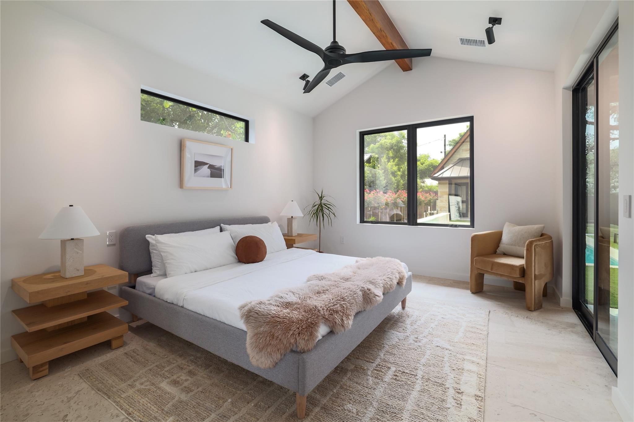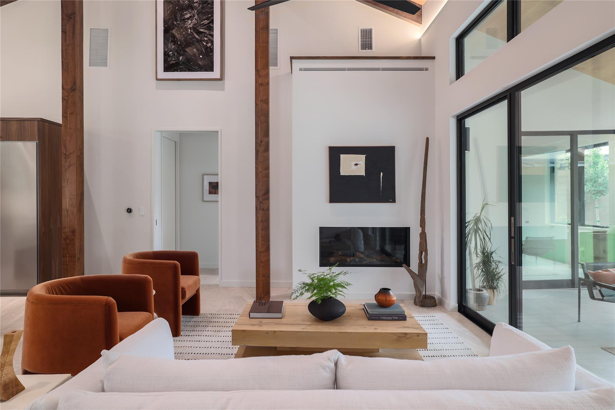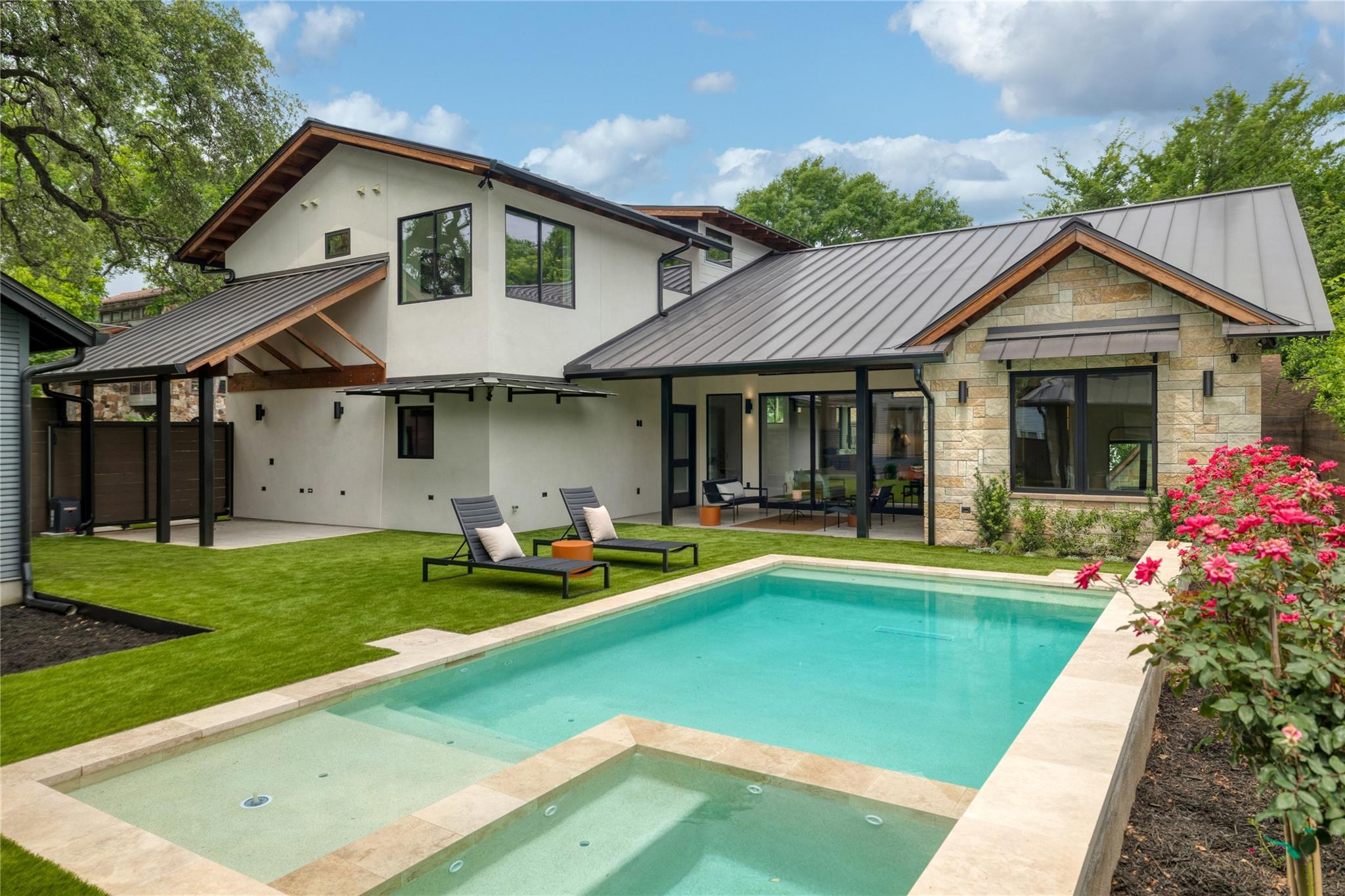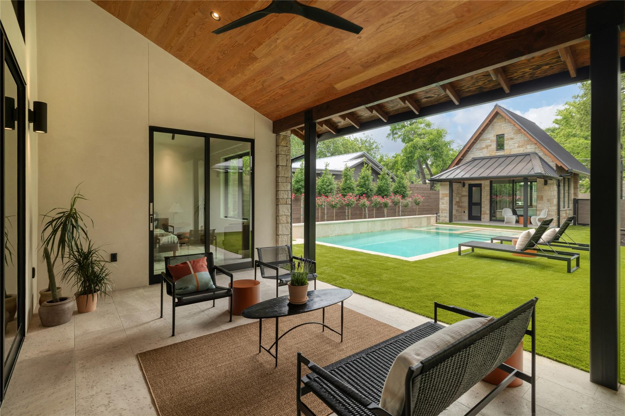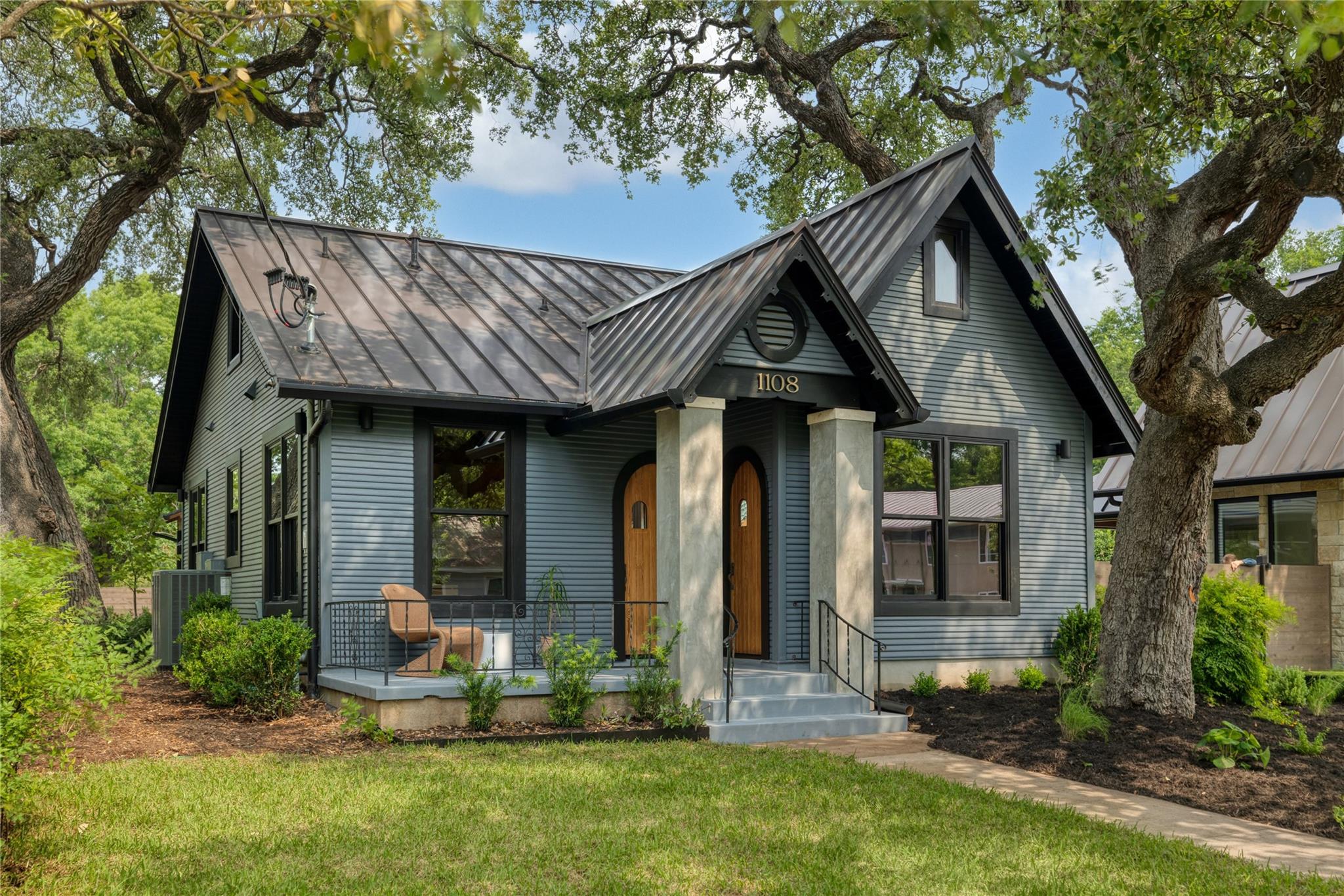 A stunning collaboration between Black & Vernooy Architecture and Craig Parker of Homes by Parker, this luxury Zilker Compound is comprised of the original early 1930s Cottage (2/2) meticulously restored & remodeled, a New-Build Main Home (3/3.5) with gorgeous Douglas Fir beams, a Pool House with a full bath and cathedral steel trusses, plus a heated pool & spa! The main home's kitchen is an entertainer’s dream, featuring an oversized walnut island, Miele appliances, satin brass plumbing fixtures, & quartzite countertops. Cathedral wooden ceilings adorn the living spaces, while a three-panel sliding door connects the interior to an expansive covered porch overlooking the pool & serene backyard. The primary suite is on the main floor, with a standalone tub in front of a leather-finished quartzite wall, an oversized walnut vanity and a marble floor. The upper floor includes two private bedrooms with ensuite baths, an additional living space, and a light-filled sun porch. Surrounded by heritage oaks, the restored cottage connects the property to its original roots. Updates include a new kitchen, refinished original pine shiplap, oak wood flooring, doors & fireplace, stackable washer/dryer closet & all-new HVAC, plumbing, electrical & insulation, plus an added secluded loft+full bathroom. A horizontal cedar fence with steel posts enclose the compound with an automatic sliding carport gate & 3 sliding pedestrian entrances. Additional compound amenities include high-efficiency HVAC zoned systems, Nest thermostats and Lutron smart lighting controls, Ring cameras, four circulating Navian tankless hot water heaters, new engineered reinforced suspension concrete foundations, and a 58 KW Kohler liquid-cooled quiet generator, large enough to power all three buildings. With fastidious attention to detail, this spectacular property offers a unique blend of modern luxury and historic charm with endless privacy, providing the ultimate Austin living experience.