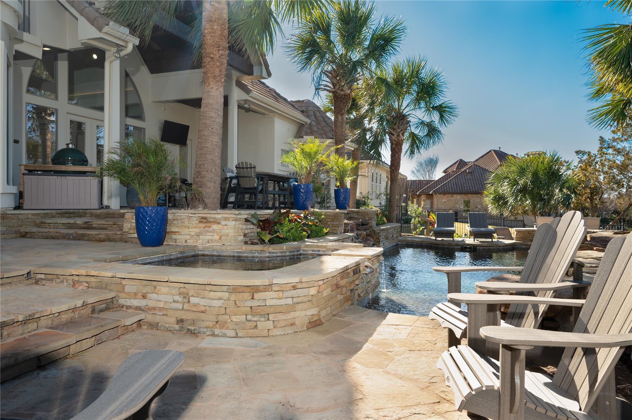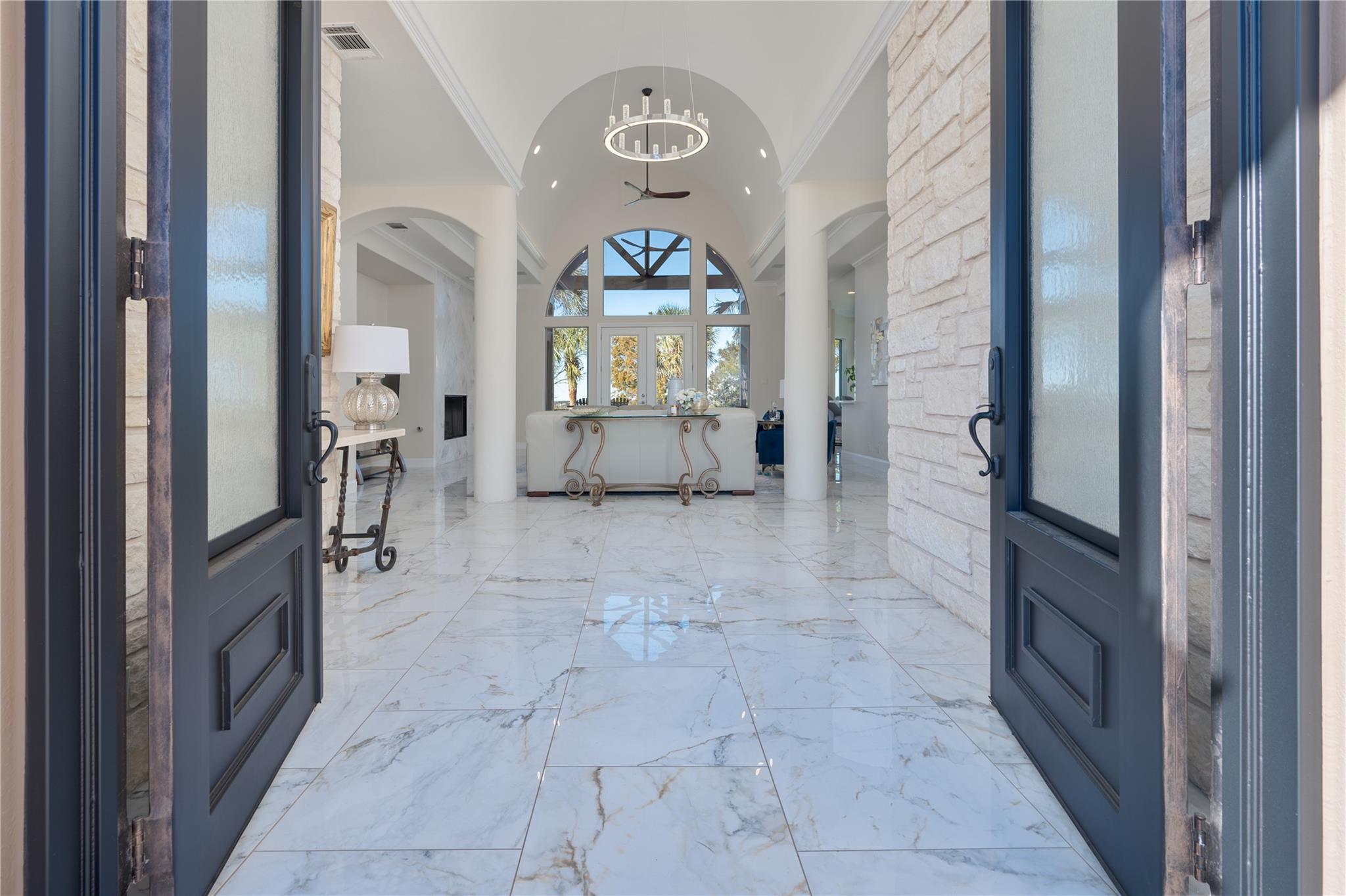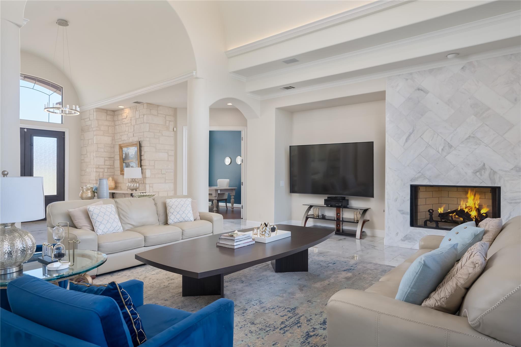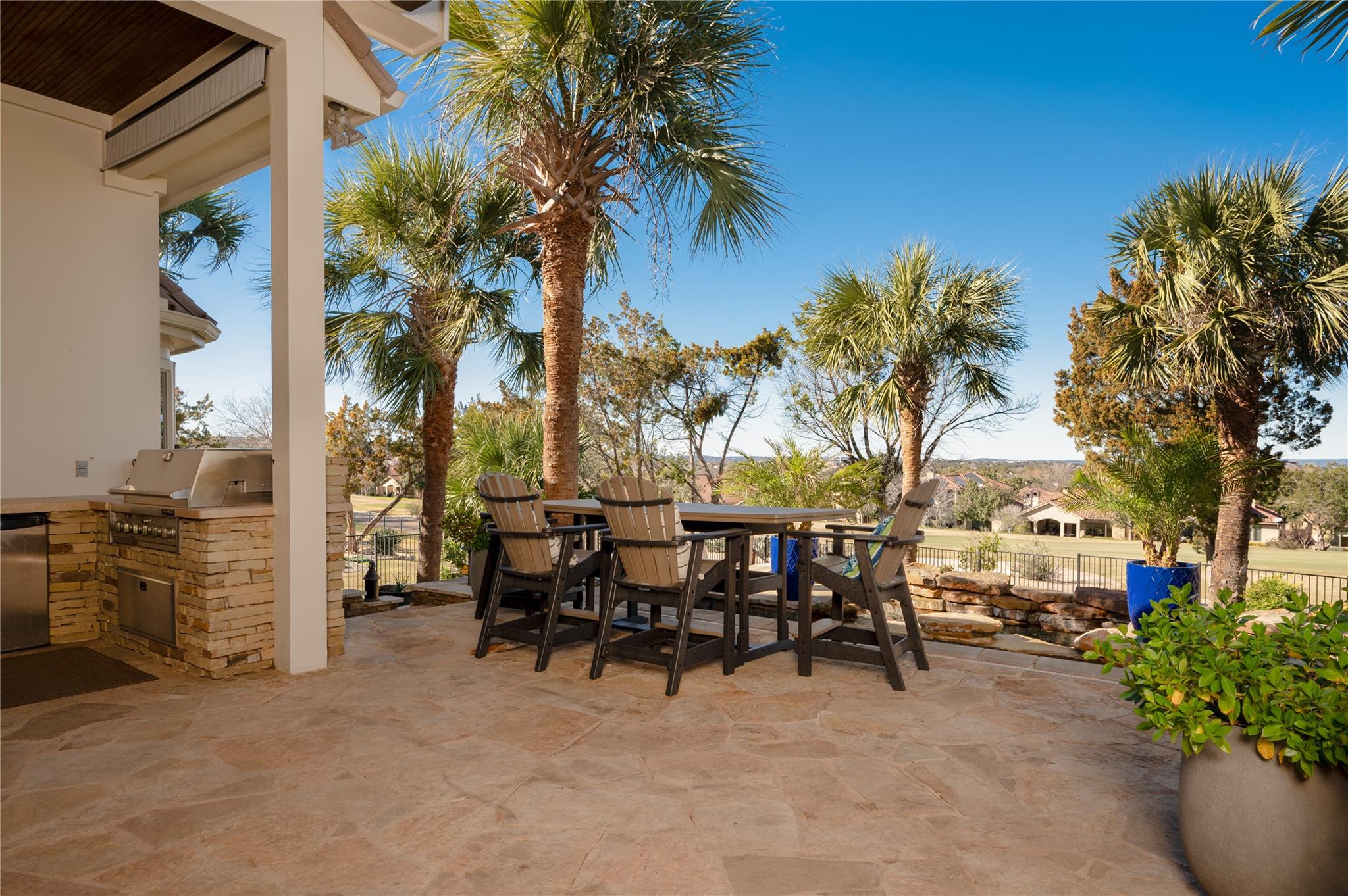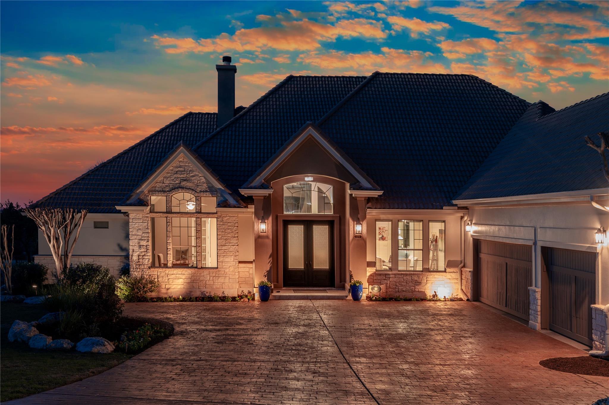 Stunning recently remodeled modern home nestled along the picturesque 4th hole on the prestigious gated Jack Nicklaus designed golf community of Flintrock Falls. Boasting unparalleled blend of contemporary design & timeless elegance, this home offers lifestyle of opulence & comfort. Step into grand foyer with limestone accent wall and soaring ceilings. Open-concept living areas are bathed in natural light, seamlessly connecting the indoors w/breathtaking outdoor scenery. Living room features expansive windows, cozy fireplace & panoramic views of lush greenery and manicured fairways. Gourmet kitchen's a culinary masterpiece, equipped w/Sub Zero built in refrigerator, propane cooktop, double ovens, built in wine refrigerator, crisp white cabinetry and spacious kitchen island. Adjacent to kitchen is dining area ideal for formal or casual dining with beautiful views. Retreat to a haven of tranquility in the primary suite located on the main level. Private access to back patio overlooking the pool and golf course. Spa-like primary bath for complete relaxation. Two additional bedroom suites on main level. This home also offers a large media room, spacious balcony with amazing views and 4th bedroom suite. Bonus room can be 5th bedroom, 2nd office or gym. Backyard is an entertainer's dream, featuring expansive patio, outdoor grill, sparkling pool, & meticulously landscaped yard. Enjoy alfresco dining with serene backdrop of the golf course or unwind under the stars. Indulge in the epitome of elegance & sophistication in this remarkable home, where every detail has been carefully curated to provide unparalleled living in one of Austin's most coveted locations. Mandatory $146.14 social membership to Flintrock Falls is required. Lake Travis ISD.