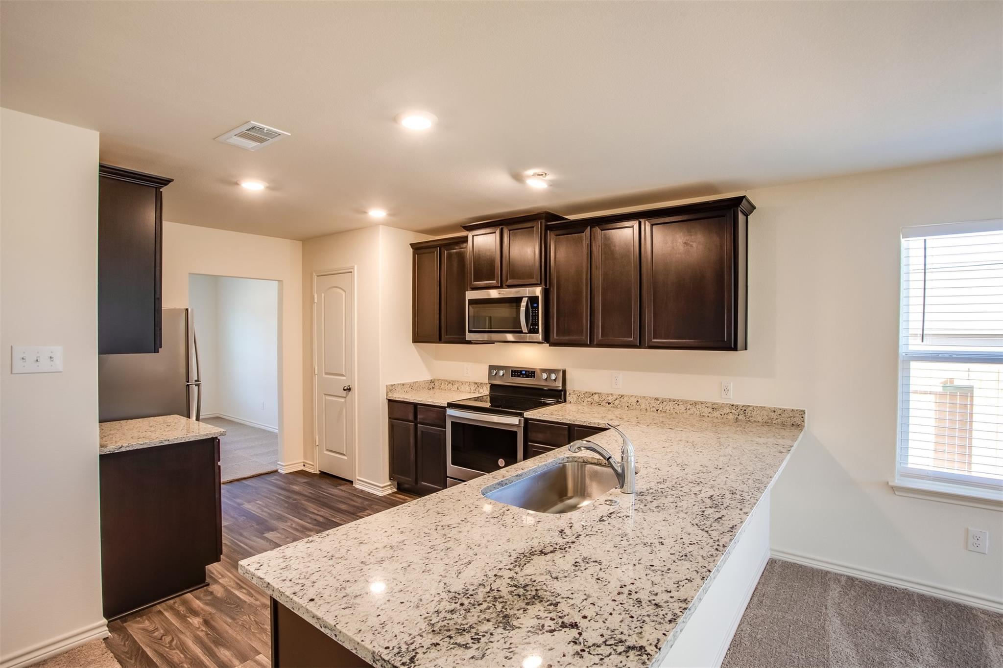 This enchanting residence offers not only a visually stunning single-story design with 3 bedrooms and 2 bathrooms but also a prime location within the Stonebridge Crossing community. The dining room captivates with its skylight, creating a warm and inviting atmosphere. The kitchen boasts brand-new, upgraded appliances and elegant granite countertops, enhancing both style and functionality. The meticulous craftsmanship extends to the cabinetry, which is thoughtfully designed with wood, complementing the luxury vinyl-plank flooring throughout. Beyond the interiors, a spacious backyard awaits, providing a perfect retreat for relaxation and outdoor activities
