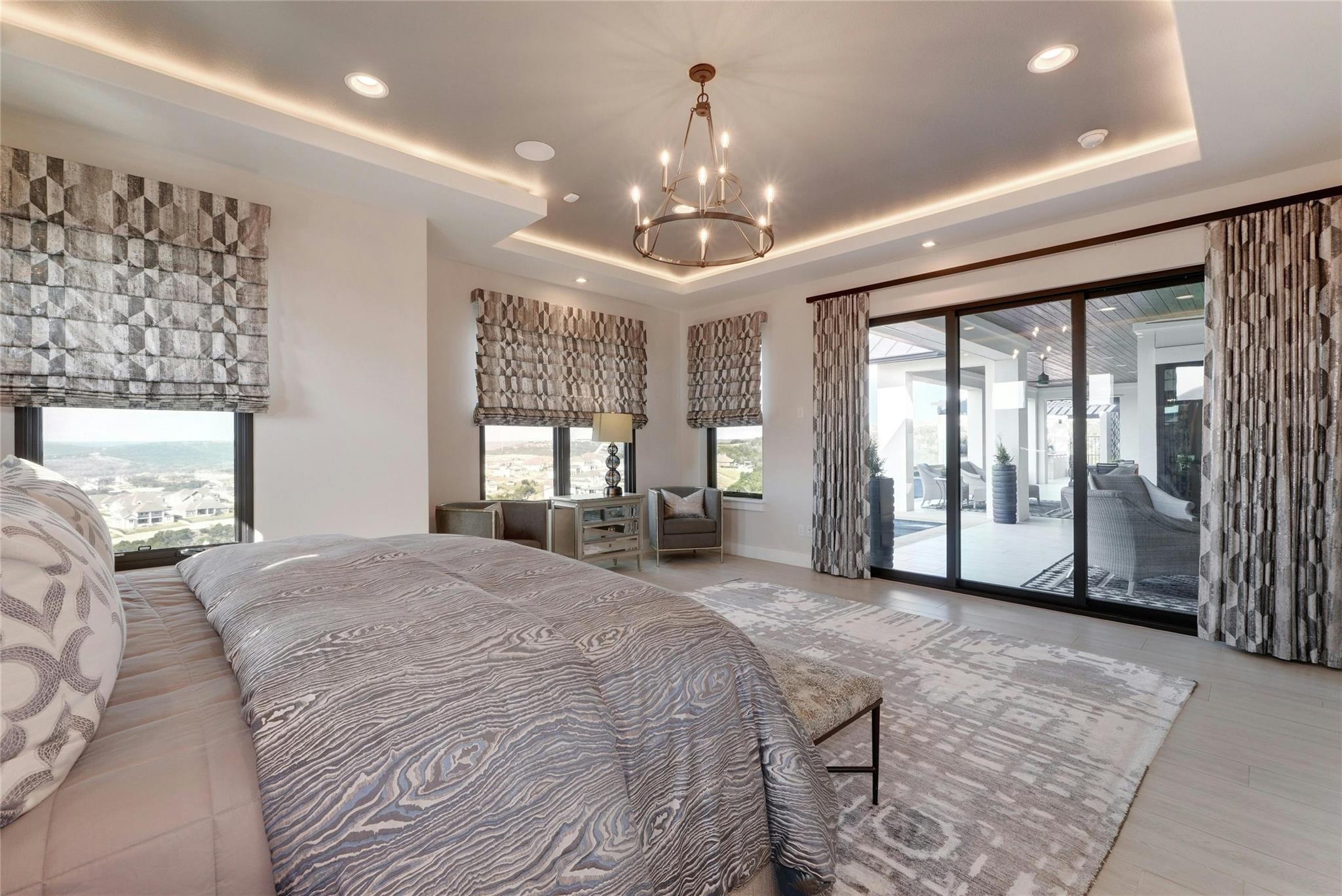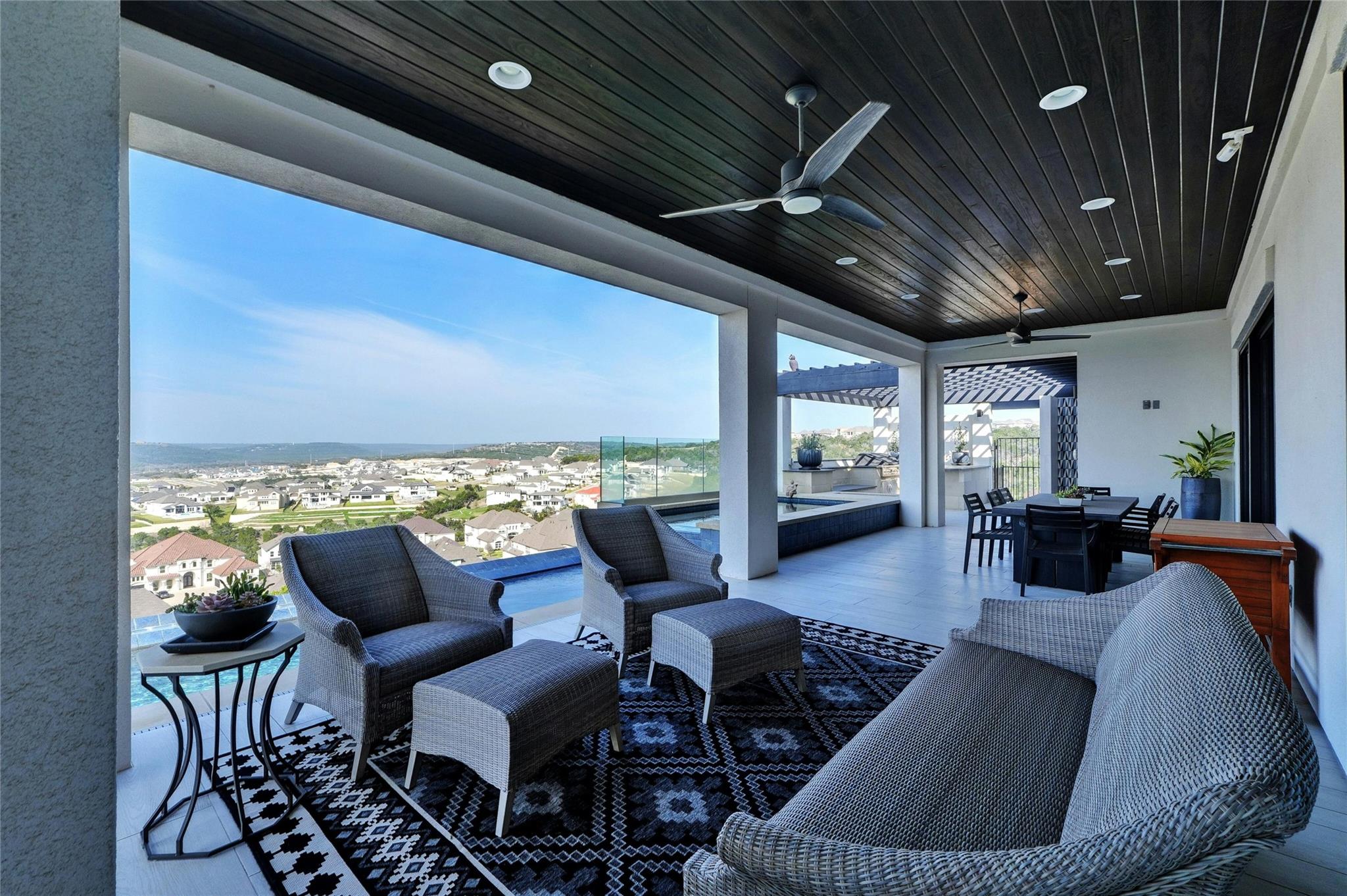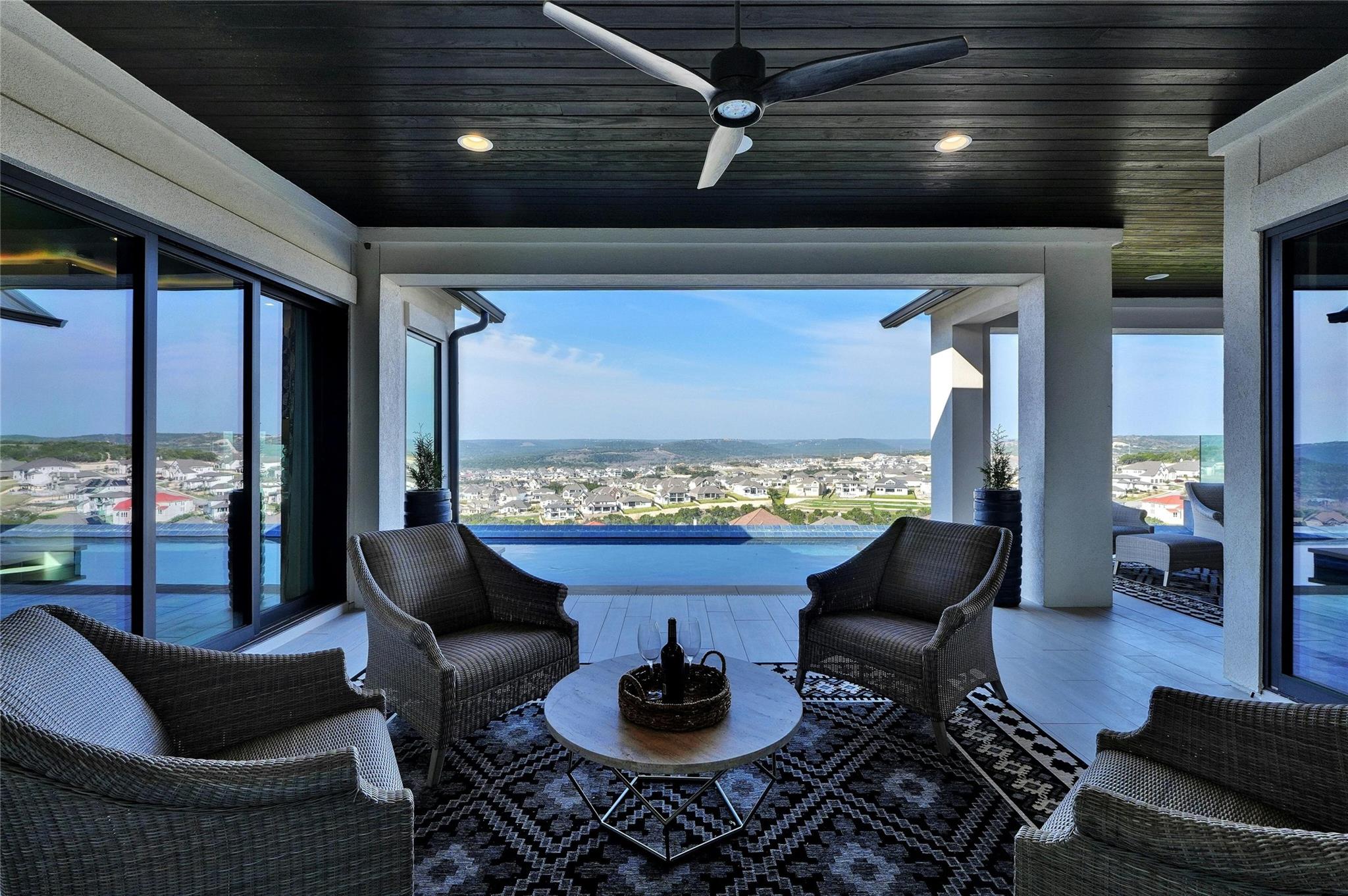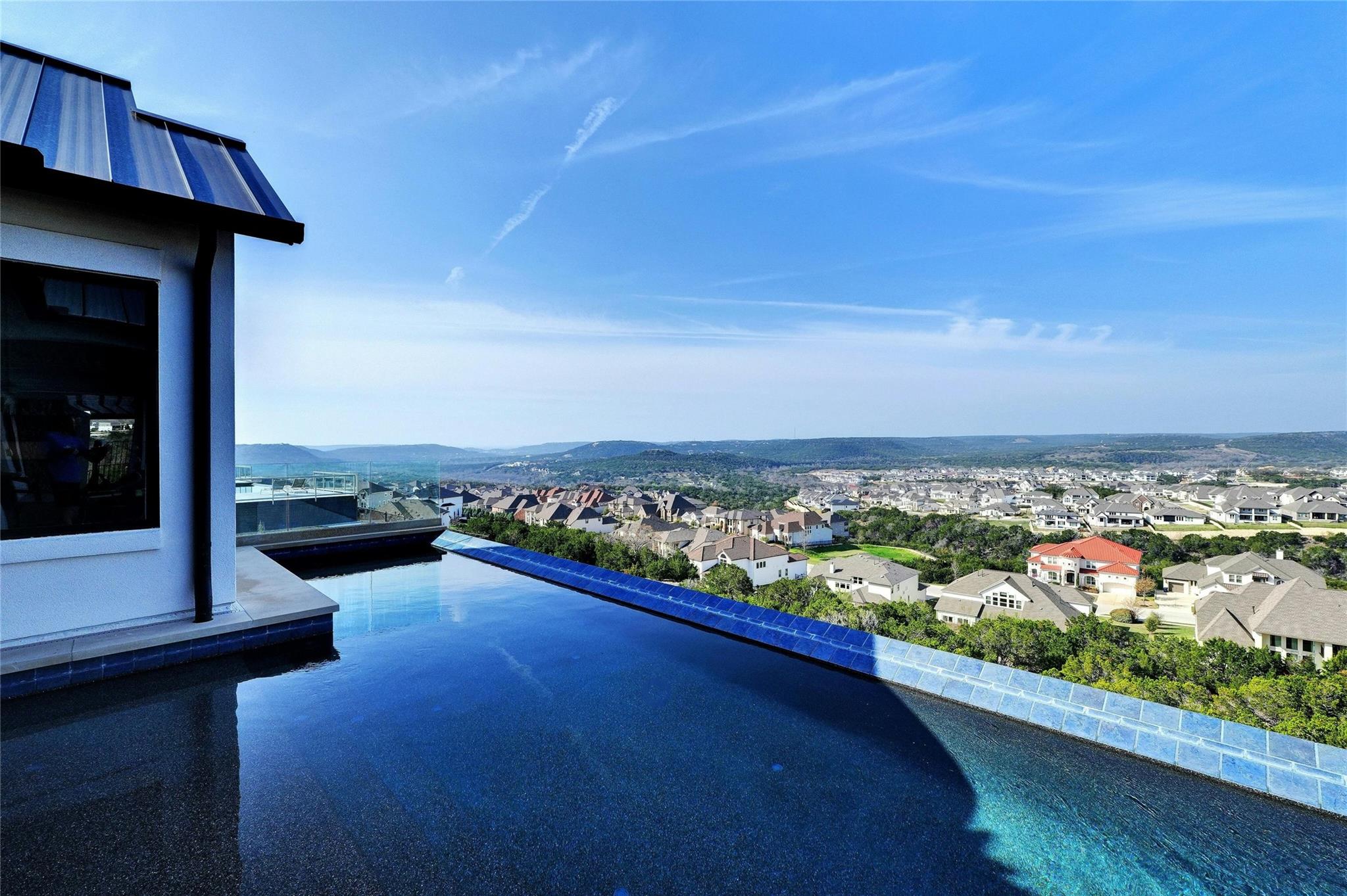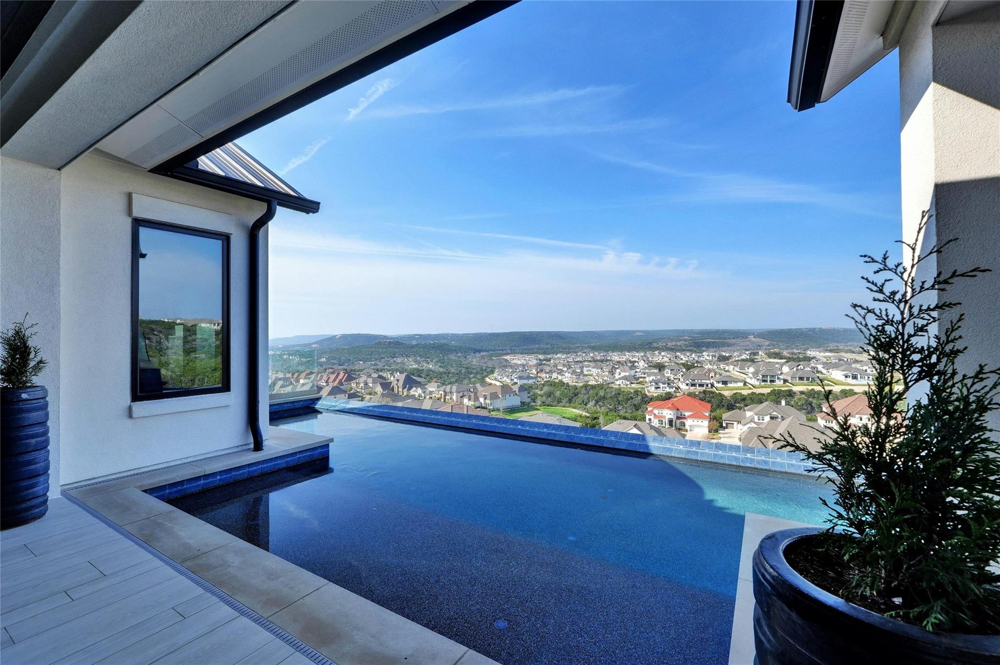 Stunning Best in Show in 2018 Parade of Homes, along with Best Outdoor Living, Best Master Bathroom, Best Formal Dining Room. This home has hardly been lived in and does not disappoint. Home showcases miles of spectacular hill country views and gorgeous Texas sunsets. Built atop one of Travisso’s rims, home is tucked away on a hidden private road. Over 1,366 sq ft of outdoor living perched high over 1.35 acres, includes lap pool (14.74’x49.90’) luxurious spa, fire pit, full outdoor kitchen, and outdoor bathroom plus shower. Open concept facilitates effortless indoor/outdoor entertaining through large multi-slide glass doors, yet family space with an 8’ gas fireplace feels intimate. Gourmet kitchen with Thermador appliances including a 48” commercial style range, built-in tower refrigerator and freezer, plus coffee machine. Adjoining prep kitchen has tall, glass front wine cooler, and large walk-in pantry with barn doors. Lower kitchen cabinets have pull outs for convenience and efficient storage. Massive double quartz kitchen islands separate breakfast bar from cooking area. Spacious guest suite has its own private entrance with huge bedroom and ensuite bath, charming living quarters and mini kitchen. Laundry room with center island, built-in desk, and gift wrap caddy serves as a craft center for family projects and a home command center. Many architectural features showcase unique tray ceilings, creative lighting, gorgeous light fixtures, niches and custom wine cellar. Exquisite fabrics used in custom window coverings are motorized with remotes. Surround sound throughout the home with master control closet. Three tankless water heaters. Two HVAC units and a standby generator that automatically starts if power is lost for 20 seconds. As lovely as it is, it is a warm, comfortable home to be enjoyed and lived in, and is a perfect setting for making beautiful memories.