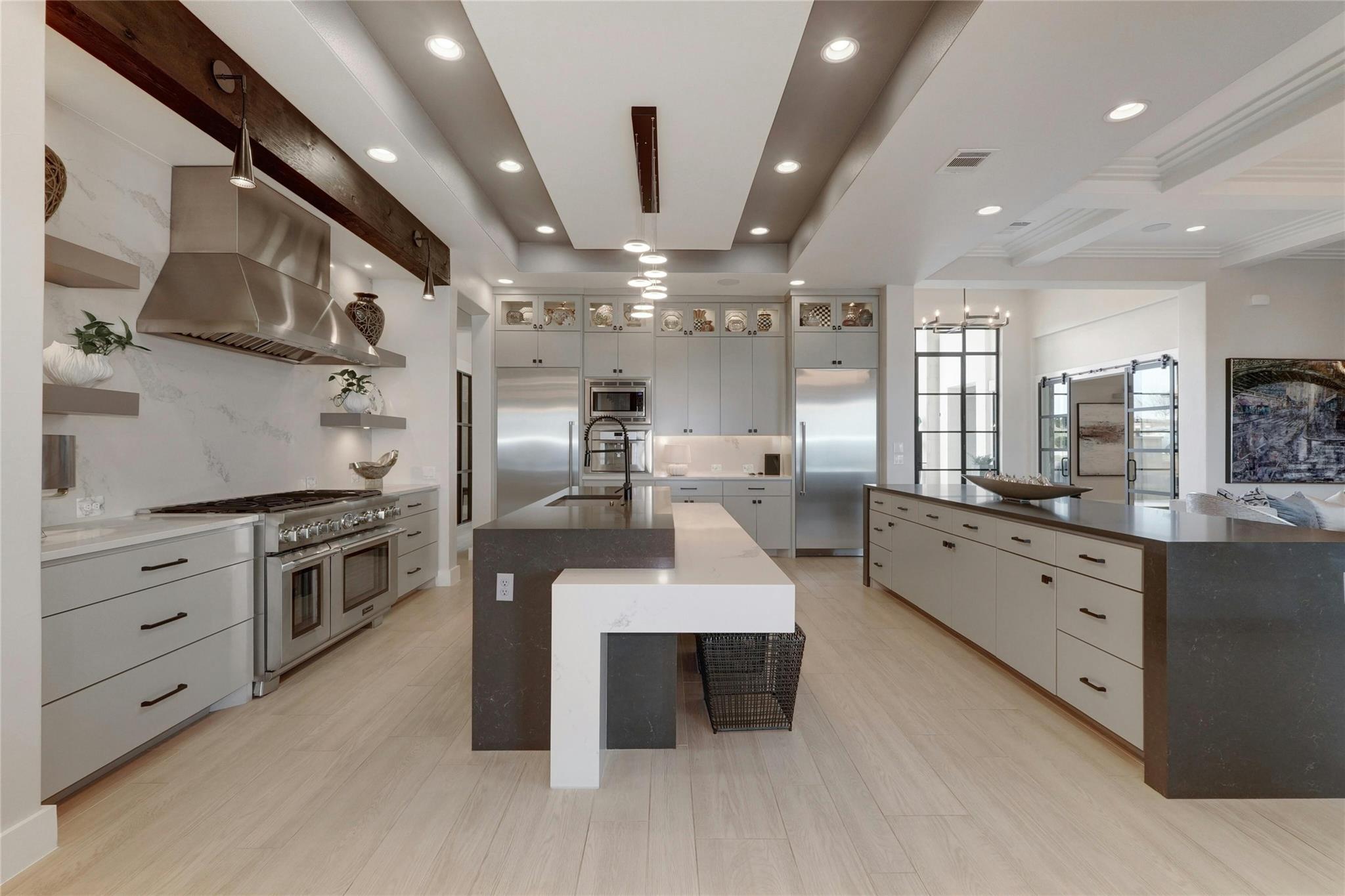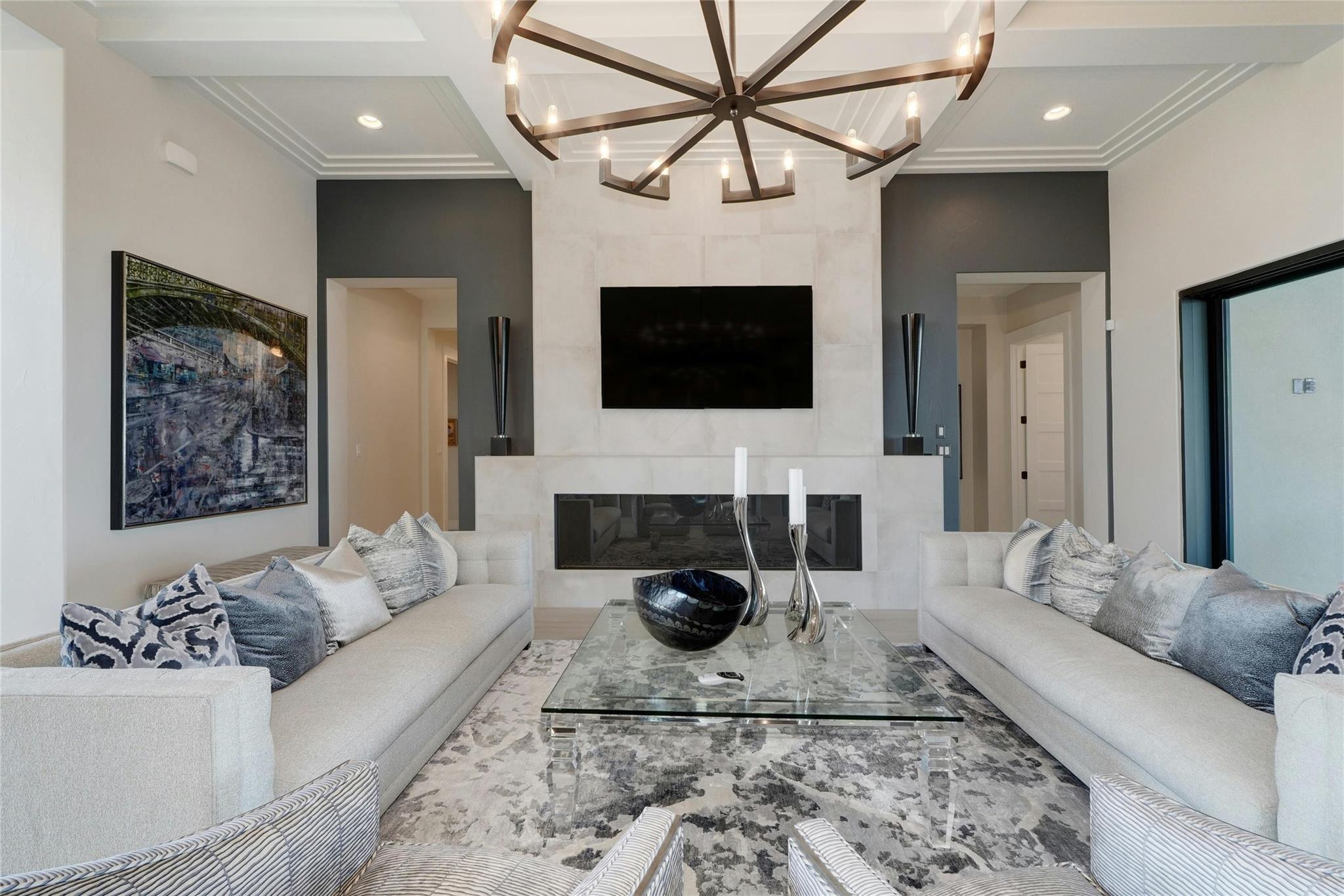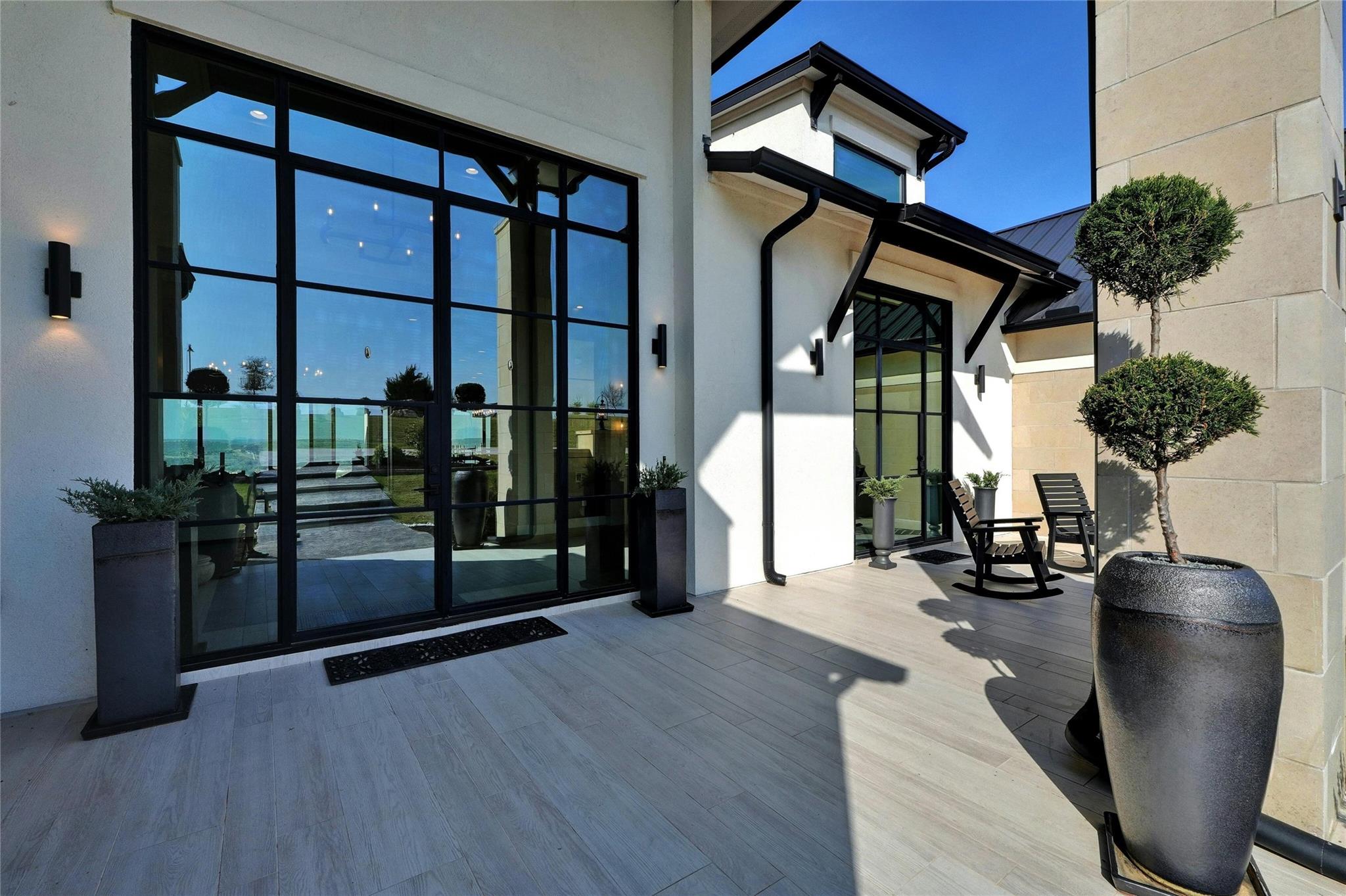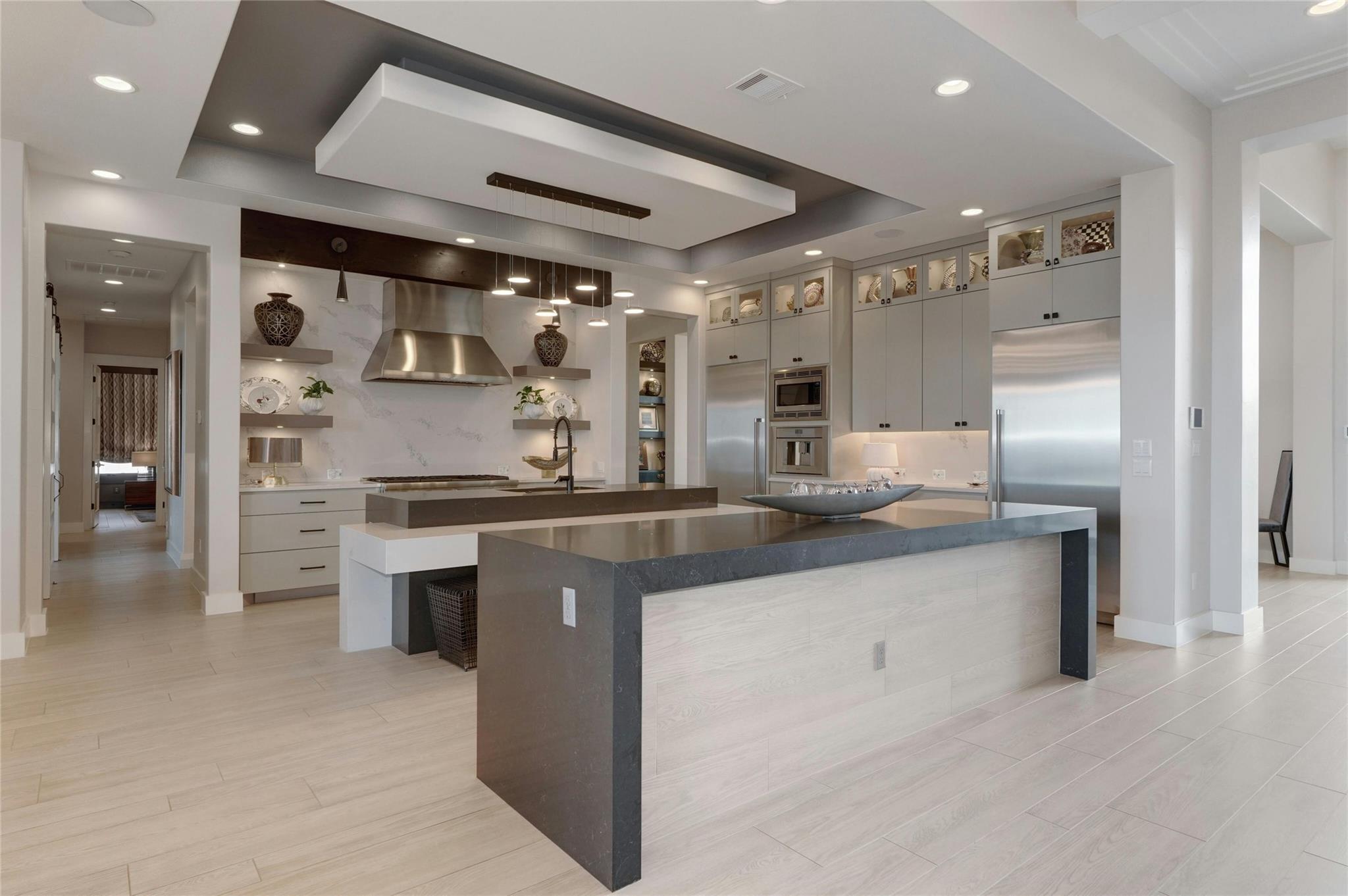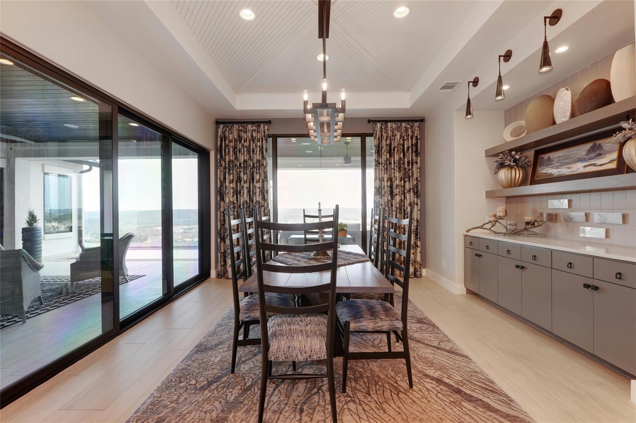 Stunning Best in Show in 2018 Parade of Homes, along with Best Outdoor Living, Best Master Bathroom, Best Formal Dining Room. This home has hardly been lived in and does not disappoint. Home showcases miles of spectacular hill country views and gorgeous Texas sunsets. Built atop one of Travisso’s rims, home is tucked away on a hidden private road. Over 1,366 sq ft of outdoor living perched high over 1.35 acres, includes lap pool (14.74’x49.90’) luxurious spa, fire pit, full outdoor kitchen, and outdoor bathroom plus shower. Open concept facilitates effortless indoor/outdoor entertaining through large multi-slide glass doors, yet family space with an 8’ gas fireplace feels intimate. Gourmet kitchen with Thermador appliances including a 48” commercial style range, built-in tower refrigerator and freezer, plus coffee machine. Adjoining prep kitchen has tall, glass front wine cooler, and large walk-in pantry with barn doors. Lower kitchen cabinets have pull outs for convenience and efficient storage. Massive double quartz kitchen islands separate breakfast bar from cooking area. Spacious guest suite has its own private entrance with huge bedroom and ensuite bath, charming living quarters and mini kitchen. Laundry room with center island, built-in desk, and gift wrap caddy serves as a craft center for family projects and a home command center. Many architectural features showcase unique tray ceilings, creative lighting, gorgeous light fixtures, niches and custom wine cellar. Exquisite fabrics used in custom window coverings are motorized with remotes. Surround sound throughout the home with master control closet. Three tankless water heaters. Two HVAC units and a standby generator that automatically starts if power is lost for 20 seconds. As lovely as it is, it is a warm, comfortable home to be enjoyed and lived in, and is a perfect setting for making beautiful memories.