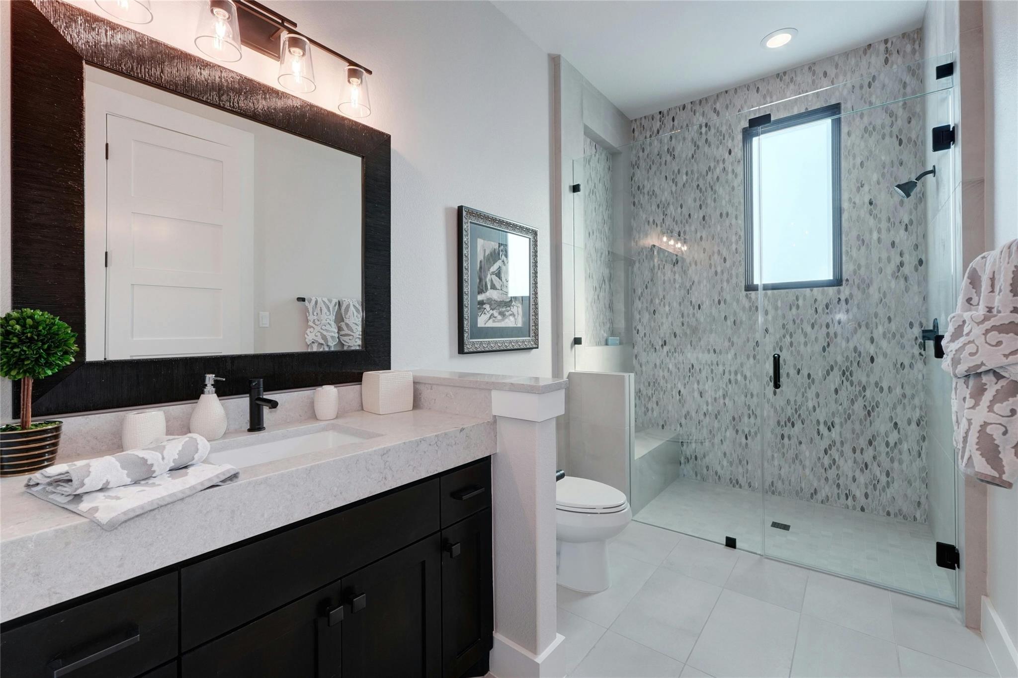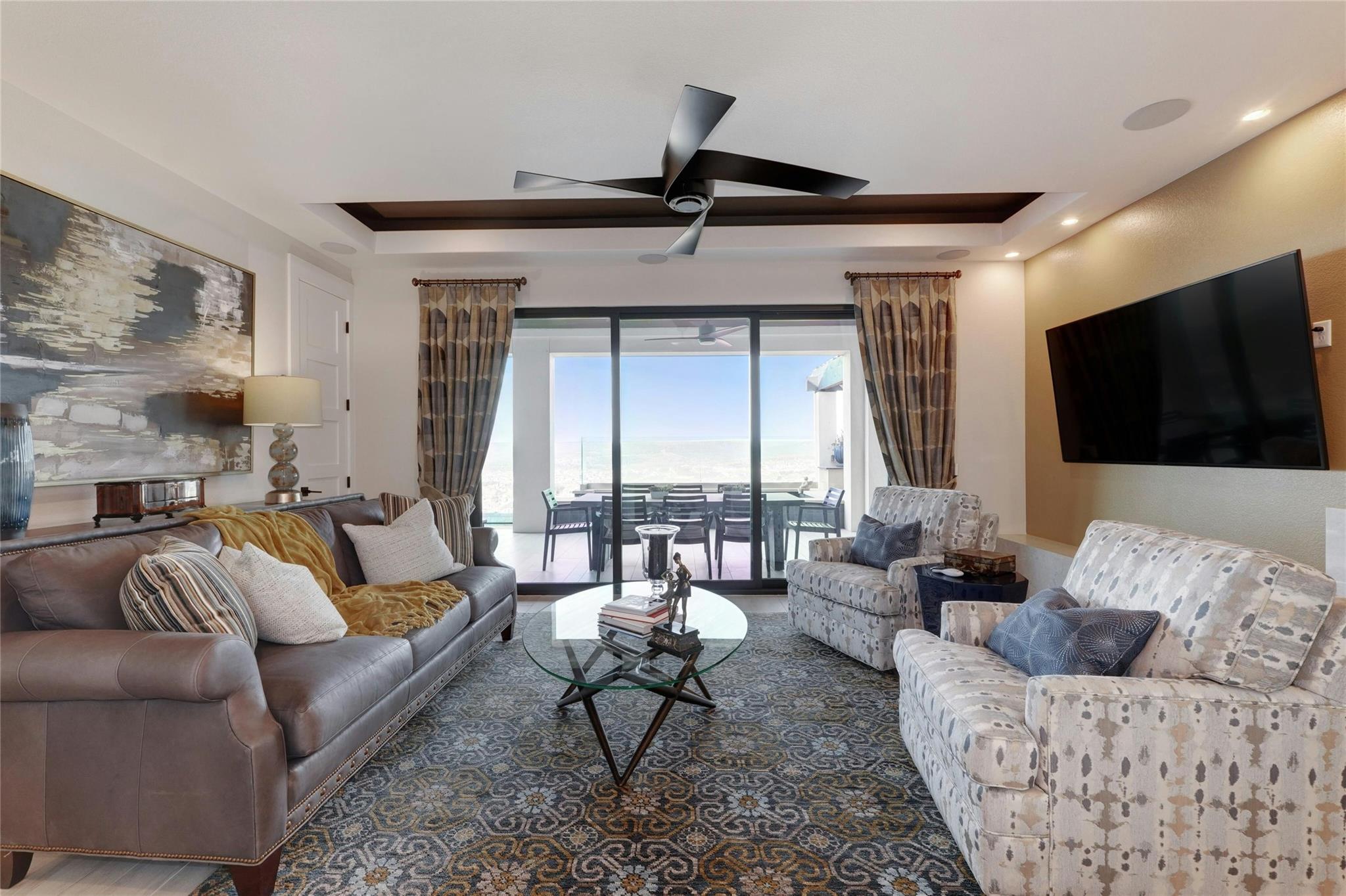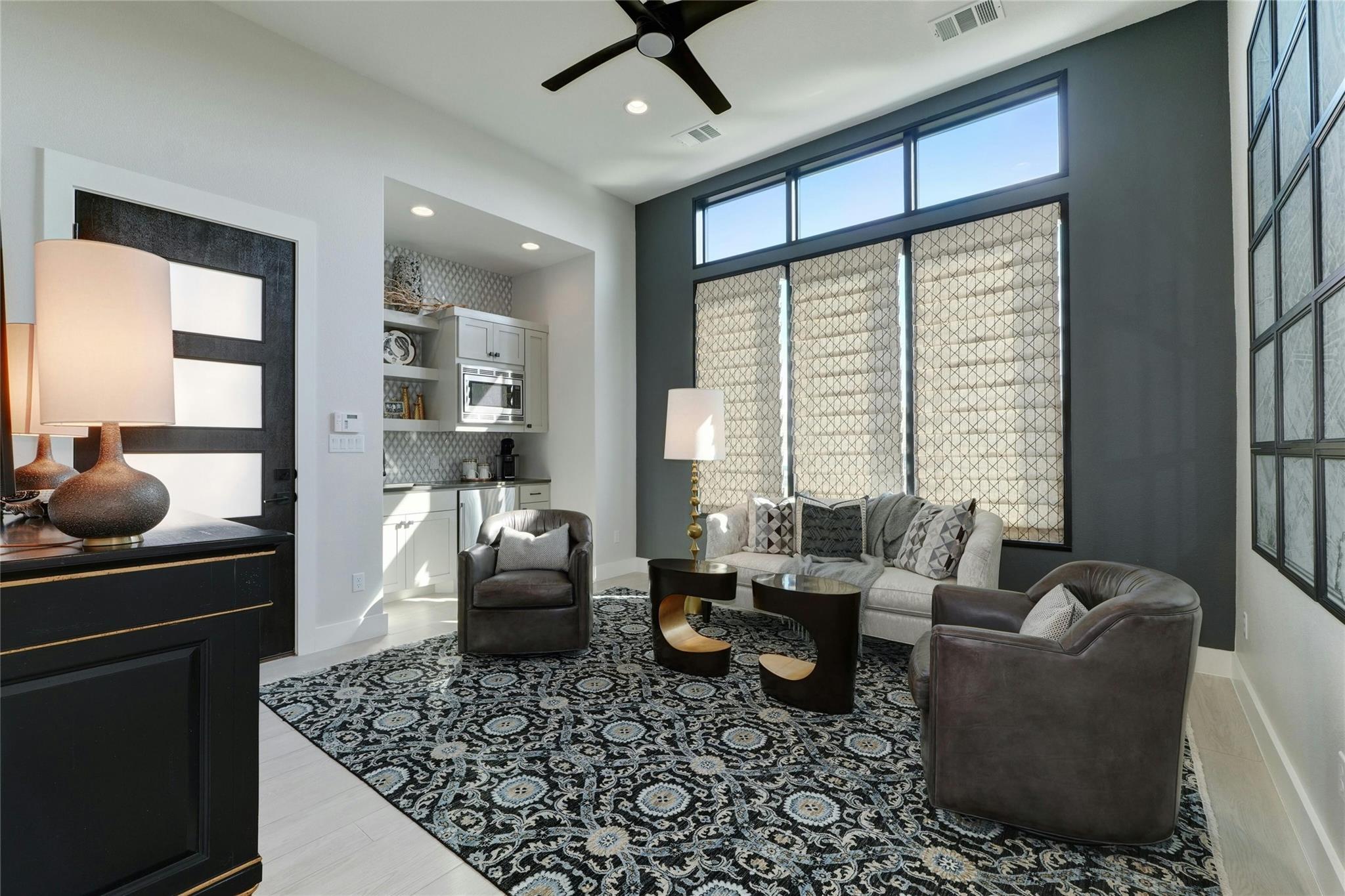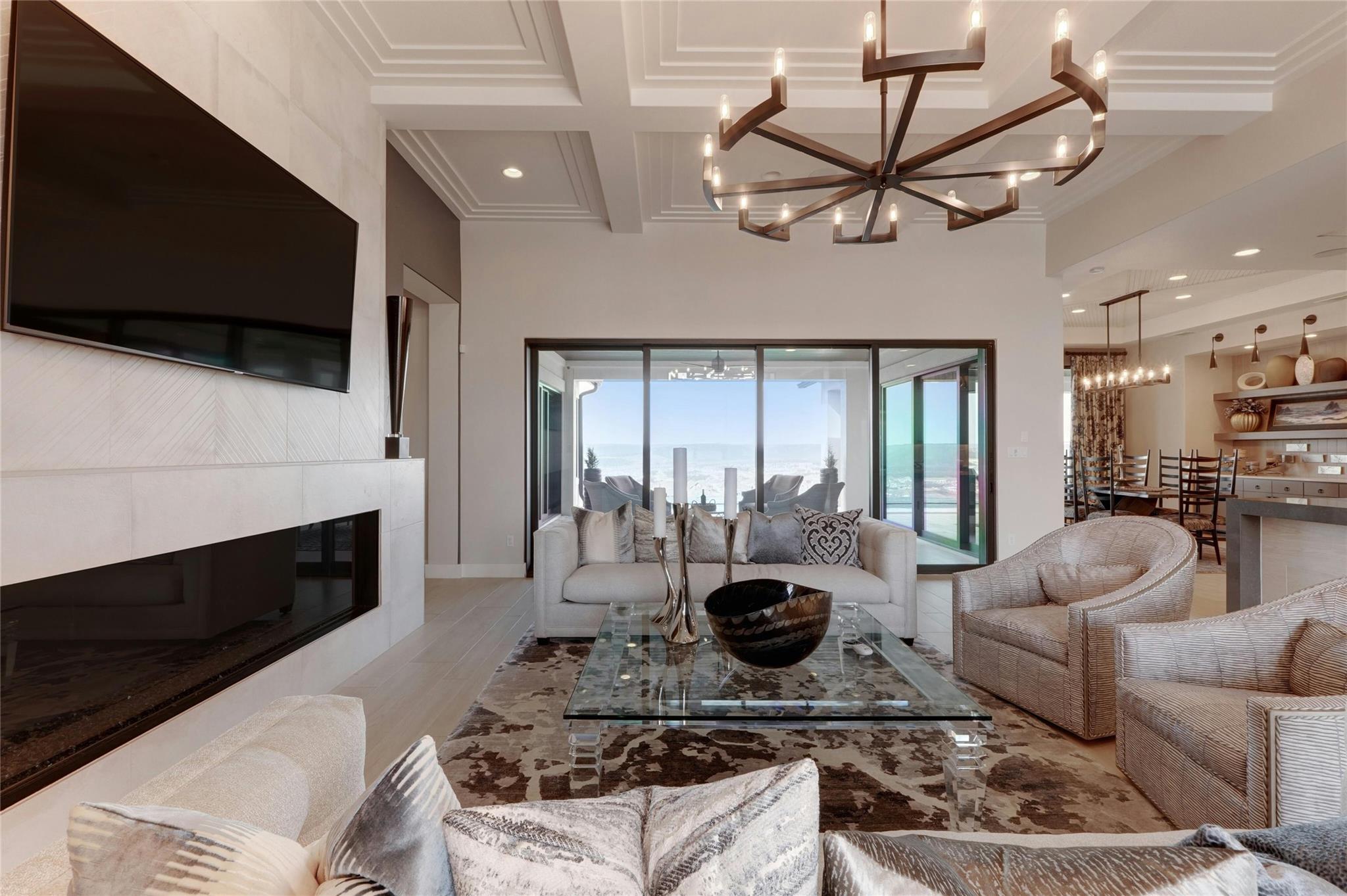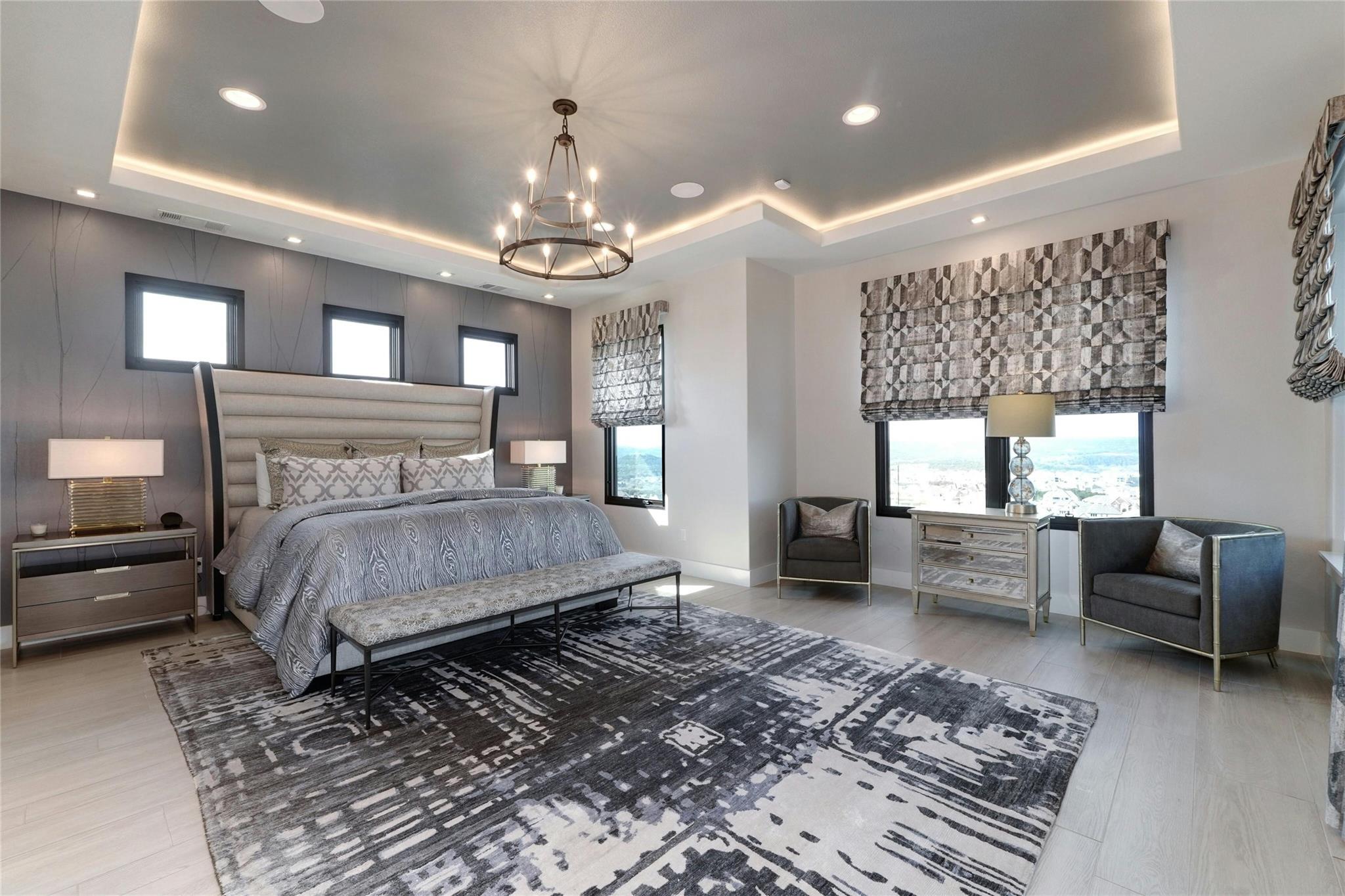 Stunning Best in Show in 2018 Parade of Homes, along with Best Outdoor Living, Best Master Bathroom, Best Formal Dining Room. This home has hardly been lived in and does not disappoint. Home showcases miles of spectacular hill country views and gorgeous Texas sunsets. Built atop one of Travisso’s rims, home is tucked away on a hidden private road. Over 1,366 sq ft of outdoor living perched high over 1.35 acres, includes lap pool (14.74’x49.90’) luxurious spa, fire pit, full outdoor kitchen, and outdoor bathroom plus shower. Open concept facilitates effortless indoor/outdoor entertaining through large multi-slide glass doors, yet family space with an 8’ gas fireplace feels intimate. Gourmet kitchen with Thermador appliances including a 48” commercial style range, built-in tower refrigerator and freezer, plus coffee machine. Adjoining prep kitchen has tall, glass front wine cooler, and large walk-in pantry with barn doors. Lower kitchen cabinets have pull outs for convenience and efficient storage. Massive double quartz kitchen islands separate breakfast bar from cooking area. Spacious guest suite has its own private entrance with huge bedroom and ensuite bath, charming living quarters and mini kitchen. Laundry room with center island, built-in desk, and gift wrap caddy serves as a craft center for family projects and a home command center. Many architectural features showcase unique tray ceilings, creative lighting, gorgeous light fixtures, niches and custom wine cellar. Exquisite fabrics used in custom window coverings are motorized with remotes. Surround sound throughout the home with master control closet. Three tankless water heaters. Two HVAC units and a standby generator that automatically starts if power is lost for 20 seconds. As lovely as it is, it is a warm, comfortable home to be enjoyed and lived in, and is a perfect setting for making beautiful memories.