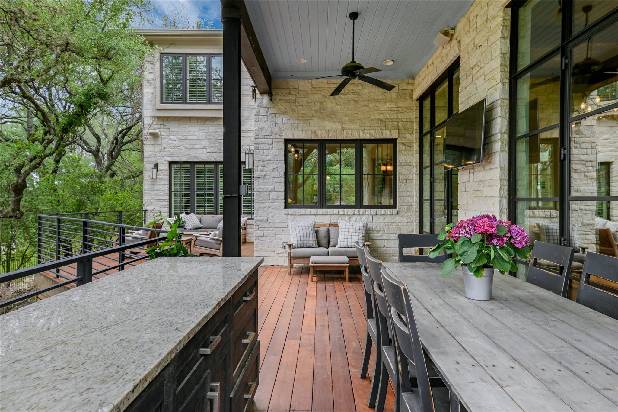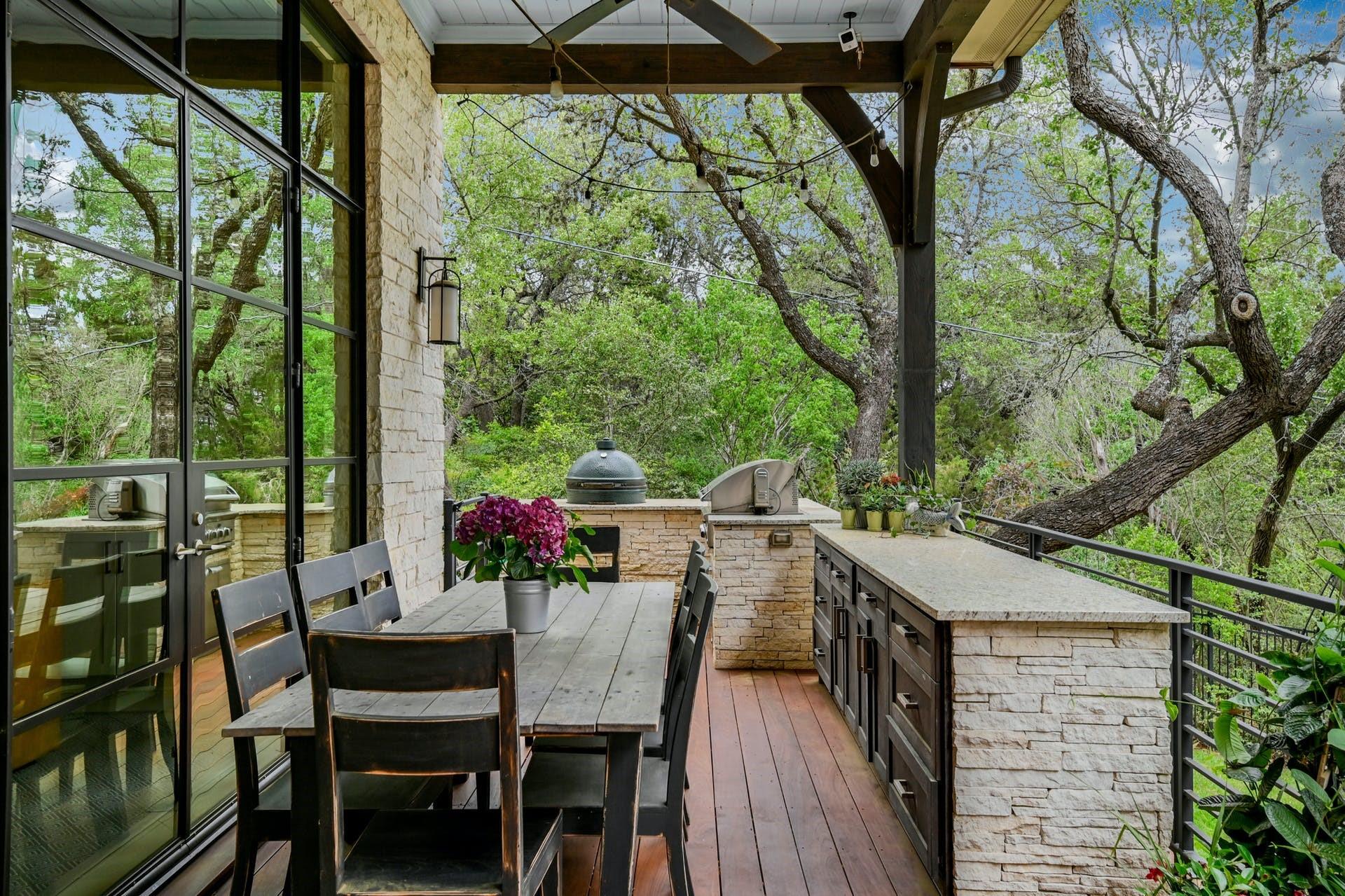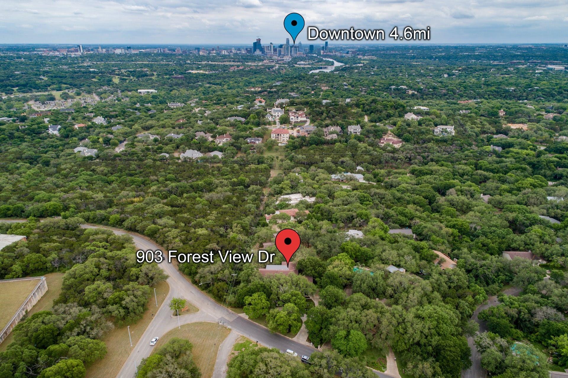 This remarkable property at 903 Forest View Drive underwent a complete transformation in 2013, resulting in an extraordinary and luxurious family home. Boasting an impressive 5,806 square feet, this home features six bedrooms and a grand total of 7.5 bathrooms. The circular driveway makes for a grand entrance, leading up to the stunning Texas limestone façade and elegant French-door entrance. The main living area is nothing short of spectacular, with a dramatic great room flowing seamlessly into the dining area and showcase kitchen. Natural light floods the room through a wall of steel and glass windows, with views of the Capitol and the City of Austin, creating a bright and inviting atmosphere. A stunning fireplace adds the perfect touch to the shiplap-paneled ceiling with ebony beams. Additionally, the main floor includes an office with its own private bathroom. The impressive kitchen is anchored by a monumental island and boasts top-of-the-line appliances, including dual ovens, a 48†stainless-steel built-in refrigerator, a wine fridge, built-in microwave, built-in buffet, dual sinks, a 6-burner commercial grade gas stove with griddle and pot filler, commercial grade ventilation, and excellent task lighting. The main level primary bedroom (or guest bedroom) is a serene retreat with an elegant tray ceiling, built-in reading lights, ebony hardwood floors, and a spacious walk-in closet. Five additional bedrooms – each with an ensuite bathroom – are located upstairs, (one guest bedroom is suited to be a primary bedroom if need be) along with a spacious playroom, bonus room, and a study room. The main level powder room features stunning duo-tone arabesque wall tiles. Ceiling mounted speakers and washer/dryer hookups are conveniently located throughout the home. Located in the desirable Eanes School District, Eanes Elementary School is only a 4-min drive away, while Hill Country Middle School and Westlake High School are both within a 6-minute drive.