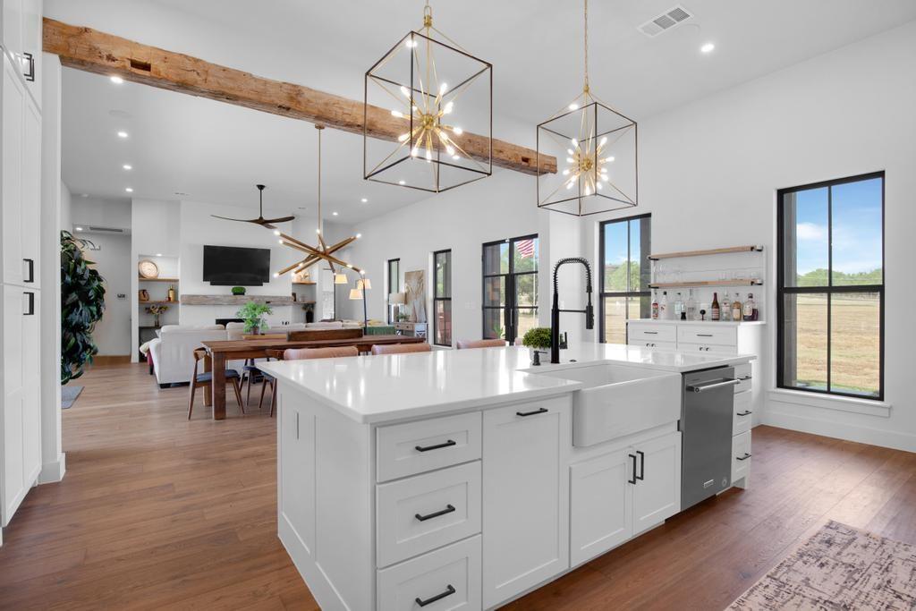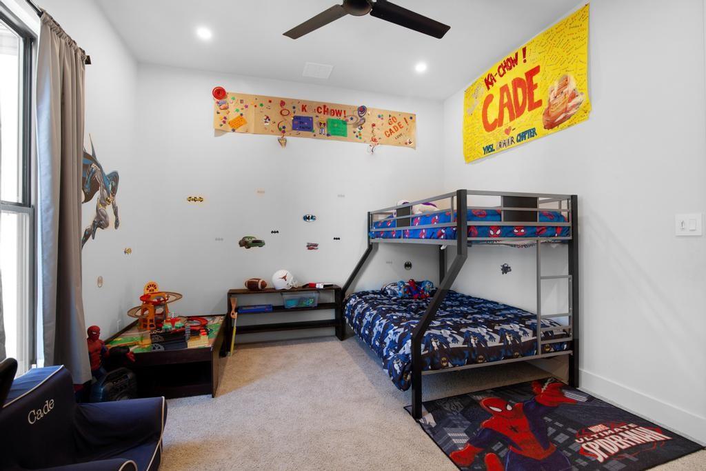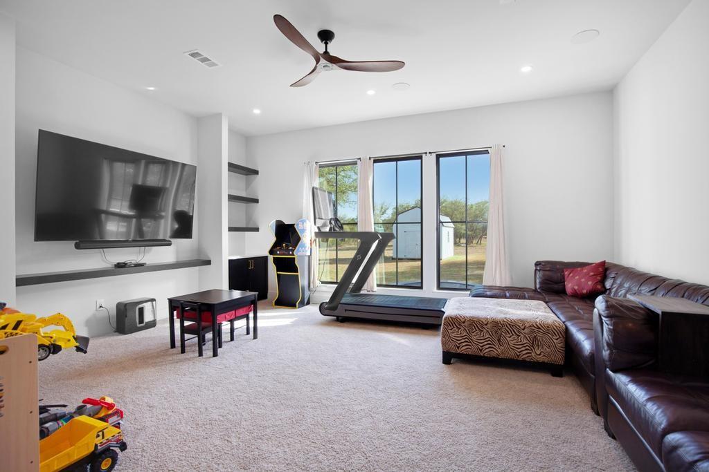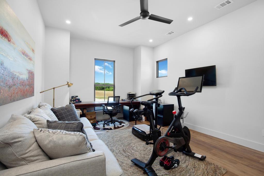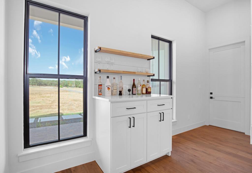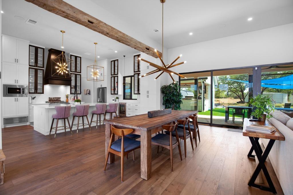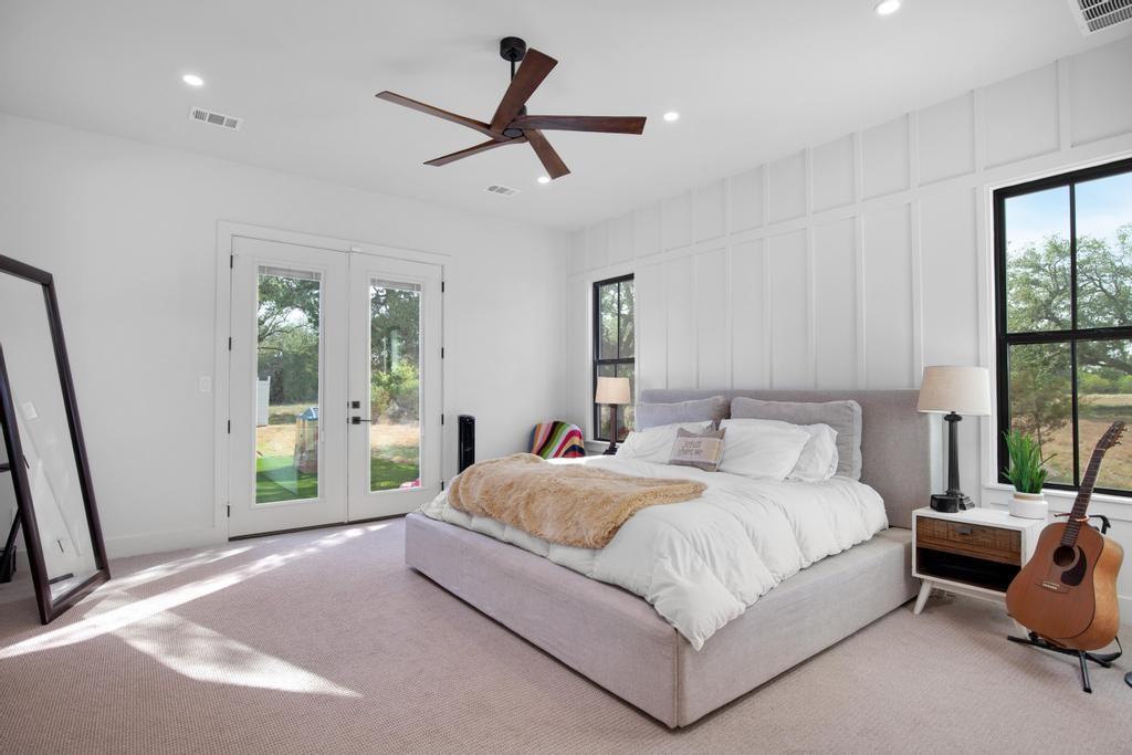 Experience the epitome of Texas Hill Country living in this magnificent, nearly-new modern farmhouse! Situated on over 5 acres within a fenced neighborhood in Lake Travis ISD, this single-story 5 bedroom, 3 full-bath, 2 half-bath home boasts a movie/play room and a guesthouse. Crafted in 2021 by the renowned Deville Custom Homes—this residence stands as the builder's personal masterpiece. Designed with accessibility in mind, this home offers almost complete wheelchair/ADA accessibility. The property flaunts a flat lot and an entertaining backyard hosting a pool ideal for youngsters (featuring shallow depths and side walls for safety), a 30k rainwater collection tank, an inground trampoline, and a partially turfed backyard adjoining a sodded acre—perfect for carefree barefoot adventures! An ingenious inside/outside bathroom allows pool-goers to access facilities swiftly without tracking water indoors. Meticulous attention to detail is evident throughout, from Christmas plugs in the soffit to RV outlets, pre-wiring for solar and electric vehicles, and complete Sonos speaker integration, extending even to the pool area. Security is a priority, with 8 cameras, an alarm system, and thoughtful features ensuring a sense of safety and privacy for the discerning buyer. Further highlights include a completely spray-foamed home, a matching 12x16 metal storage building, level 4 drywall, expansive 12-foot ceilings in the main rooms, a large Fleetwood back door, minimized cactus presence, and an outdoor kitchen equipped with a built-in grill and TV wiring. The guesthouse offers two spacious full-size bunk beds, an open living area, and a convenient half bathroom—ideal for welcoming friends without permanent residency. Don't forget to bring your horses and boat to fully enjoy this exceptional property!