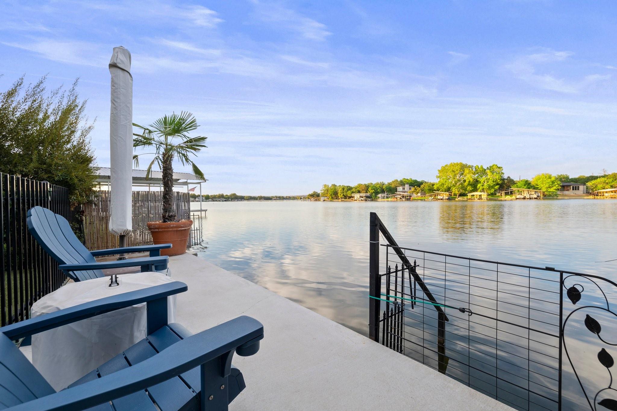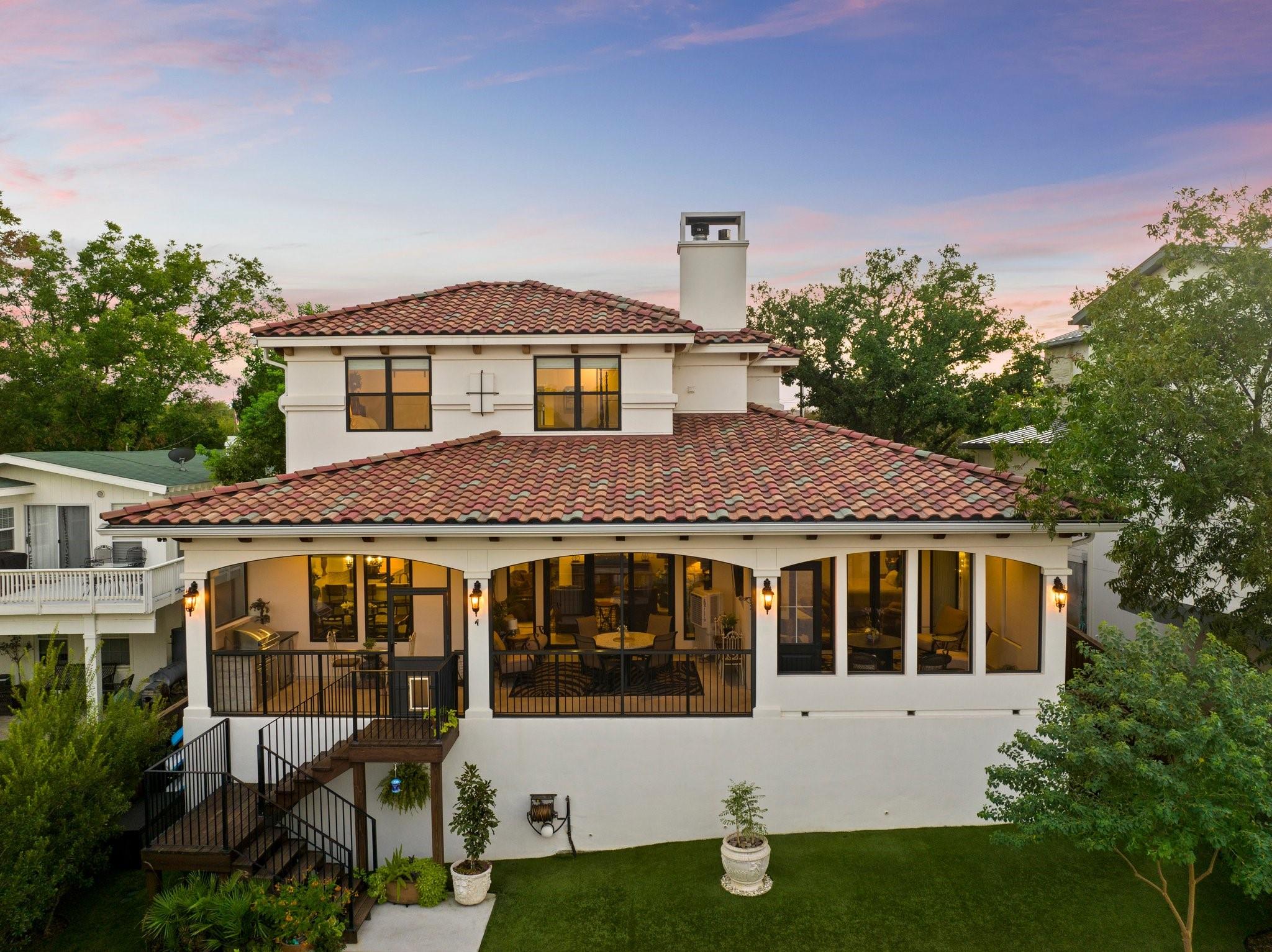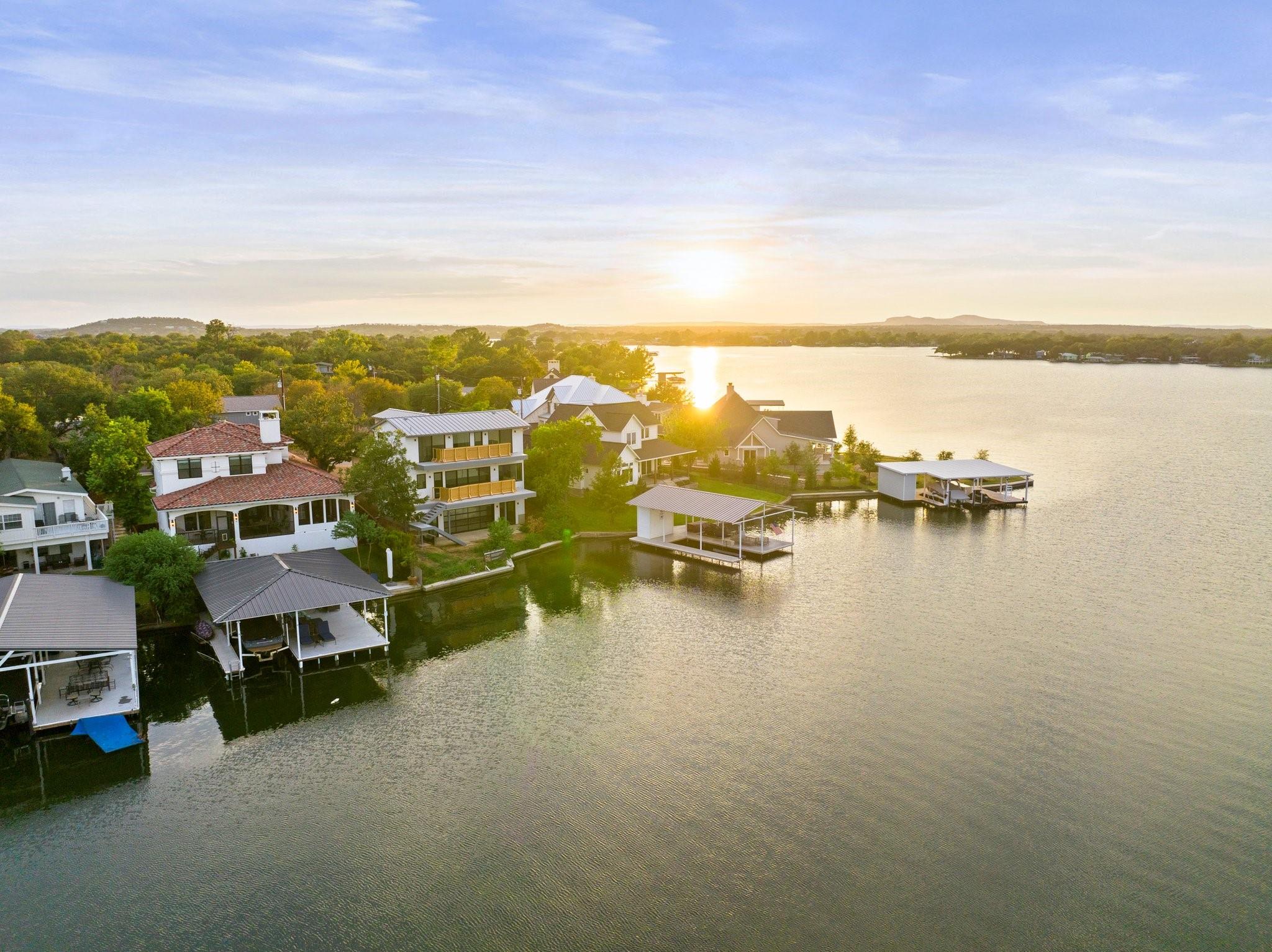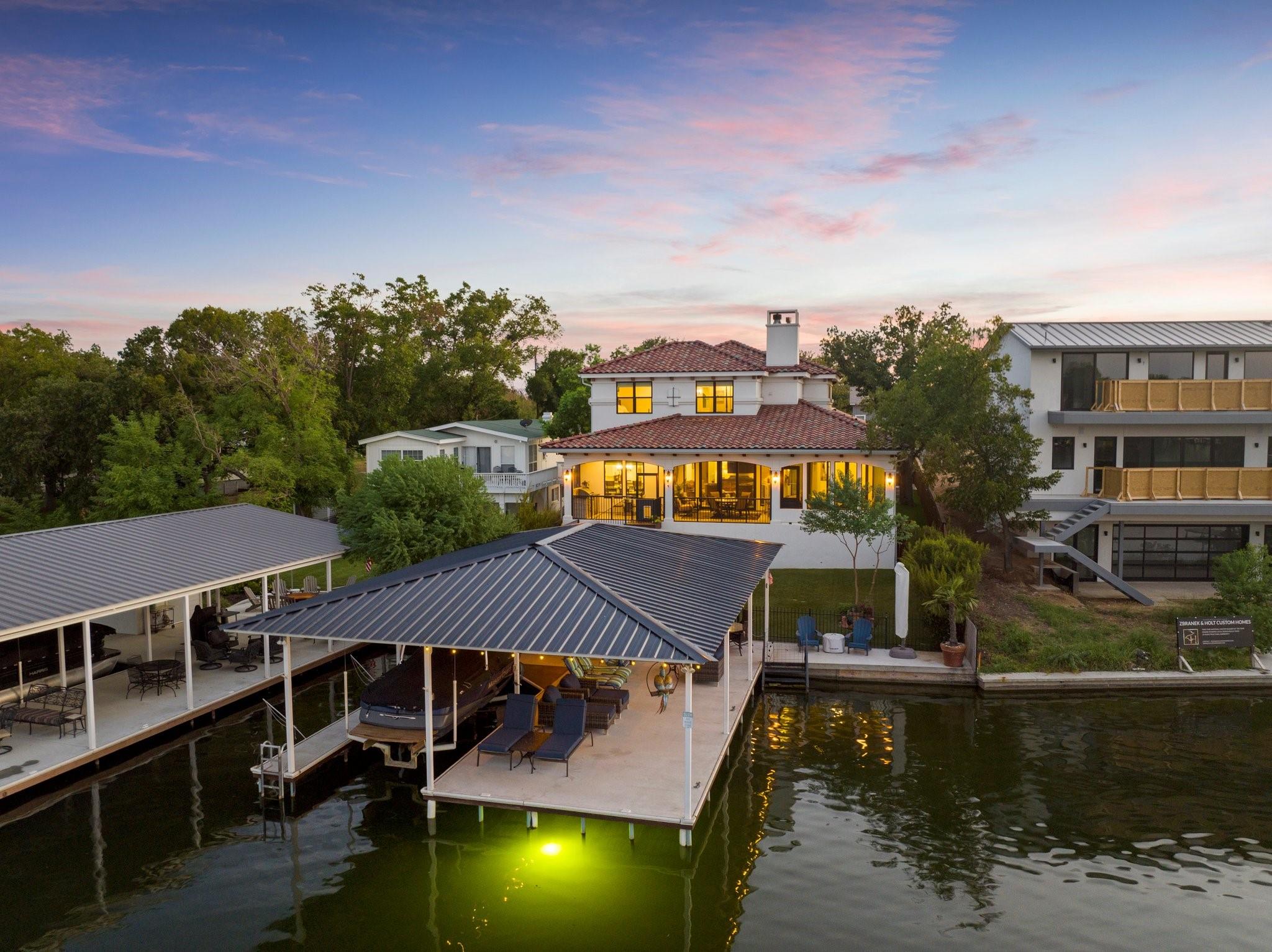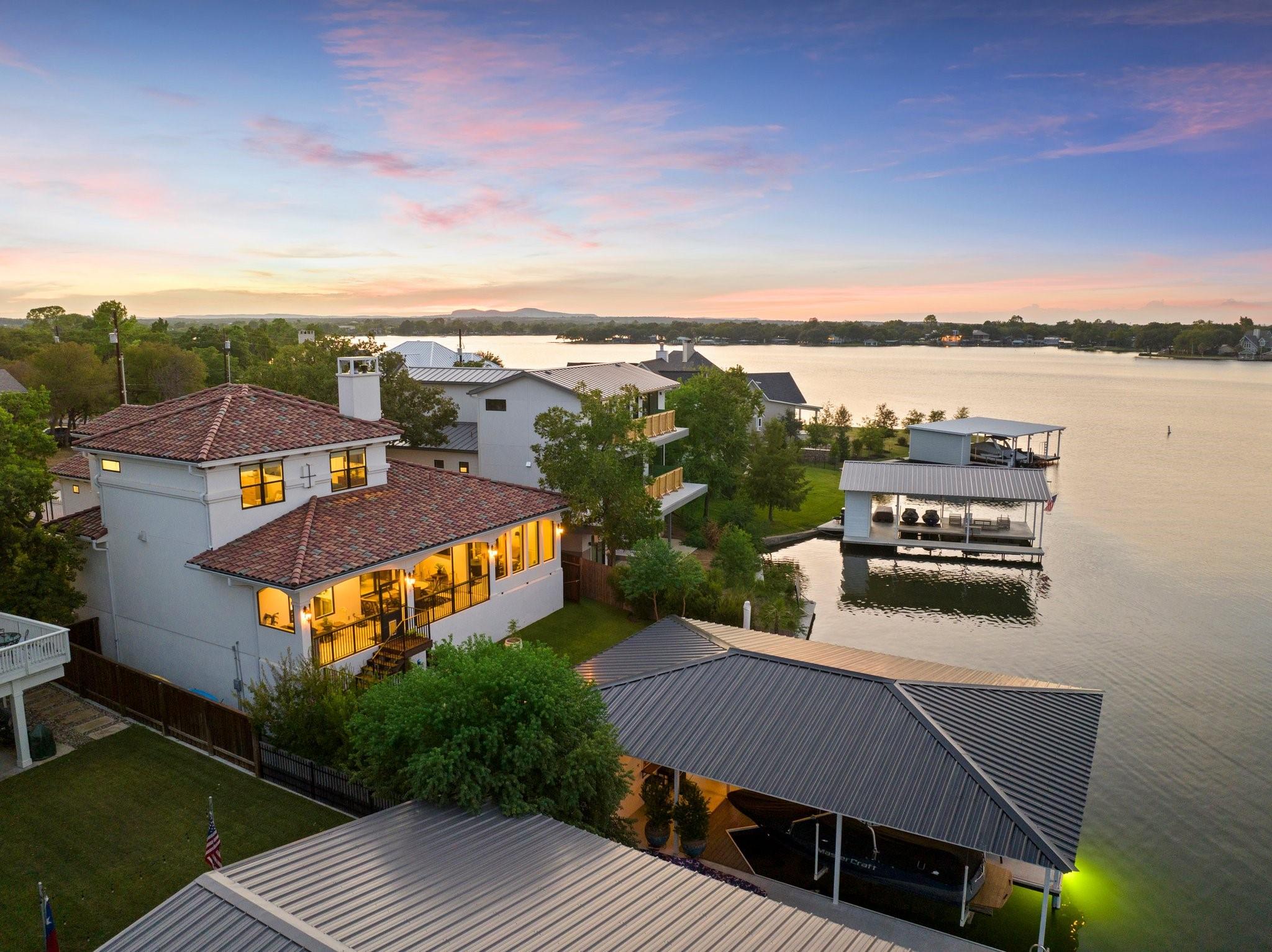 WOW! 2019 built, one-owner home on the shores of Lake LBJ in Granite Shoals, Texas! Welcome to this Santa Barbara inspired, mediterranean masterpiece with 4 bedrooms, 4.5 baths, white and bright ready for its new owner. Beautiful and luxurious kitchen with wolf gas range and built-in, Sub-Zero fridge, white cabinets, white countertops and walk-in pantry with lots of built in shelving and drawers. Dining area has a custom wet bar with mini-fridge and overlooks the gorgeous water. Custom beams offer the perfect amount of texture to this well built home and fireplaces in the living and master bedroom really set the mood. Large master suite opens up the back patio and has an en suite bathroom with tub and walk-in shower plus large walk-in closet. There is an additional guest bedroom on the main floor with en suite bathroom making the home accessible to most anyone. Upstairs you will arrive in the secondary living space, currently outfitted with built-in bunks for additional guests plus there are 2 spacious bedrooms and two freshly designed bathrooms to ensure your family and friends are more than comfortable at the lake. The entire back porch is screened and offers additional outdoor living space to enjoy the Lake Life with wall mounted TV and beautiful Lake views. Astroturf in the back yard limits maintenance and offers a beautiful green space to spread out and play that's easy on the feet. Steel-constructed boat dock was built to entertain with walk-up bar and the boat slip was sized for most any boat you will find on Lake LBJ. This waterfront home faces East which means the hot Texas sun sets at your back and the large cove-protected waterfront provides a safe place for swimming without having to worry about the heavy boat traffic found on the open water. This one-of-a-kind custom home has so much to offer and was built to enjoy Lake Life. Qualified buyers come see what the hype is about. This special property won't last long!
