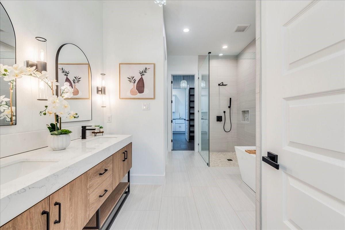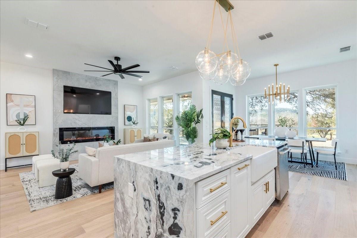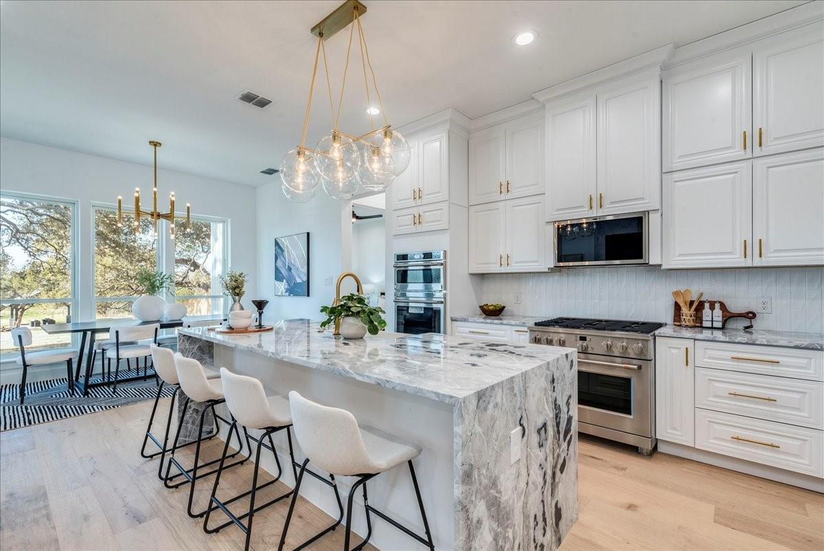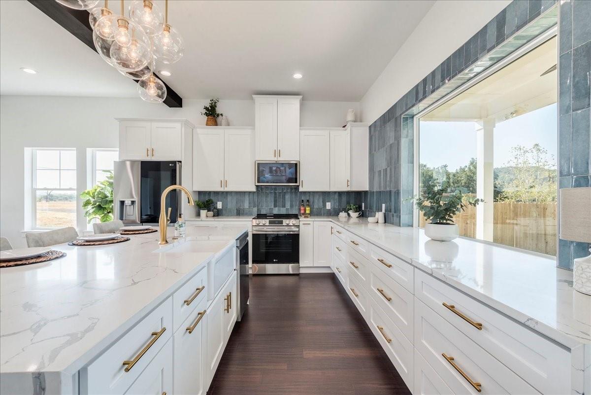 | Interior Features | Breakfast Bar, Ceiling Fan(s), High Ceilings, Chandelier, Quartz Counters, Crown Molding, Double Vanity, Gas Dryer Hookup, Eat-in Kitchen, In-Law Floorplan, Interior Steps, Kitchen Island, Multiple Dining Areas, Multiple Living Areas, Open Floorplan, Pantry, Primary Bedroom on Main, Recessed Lighting, Smart Thermostat, Soaking Tub, Storage, Two Primary Closets, Walk-In Closet(s), Washer Hookup | |
