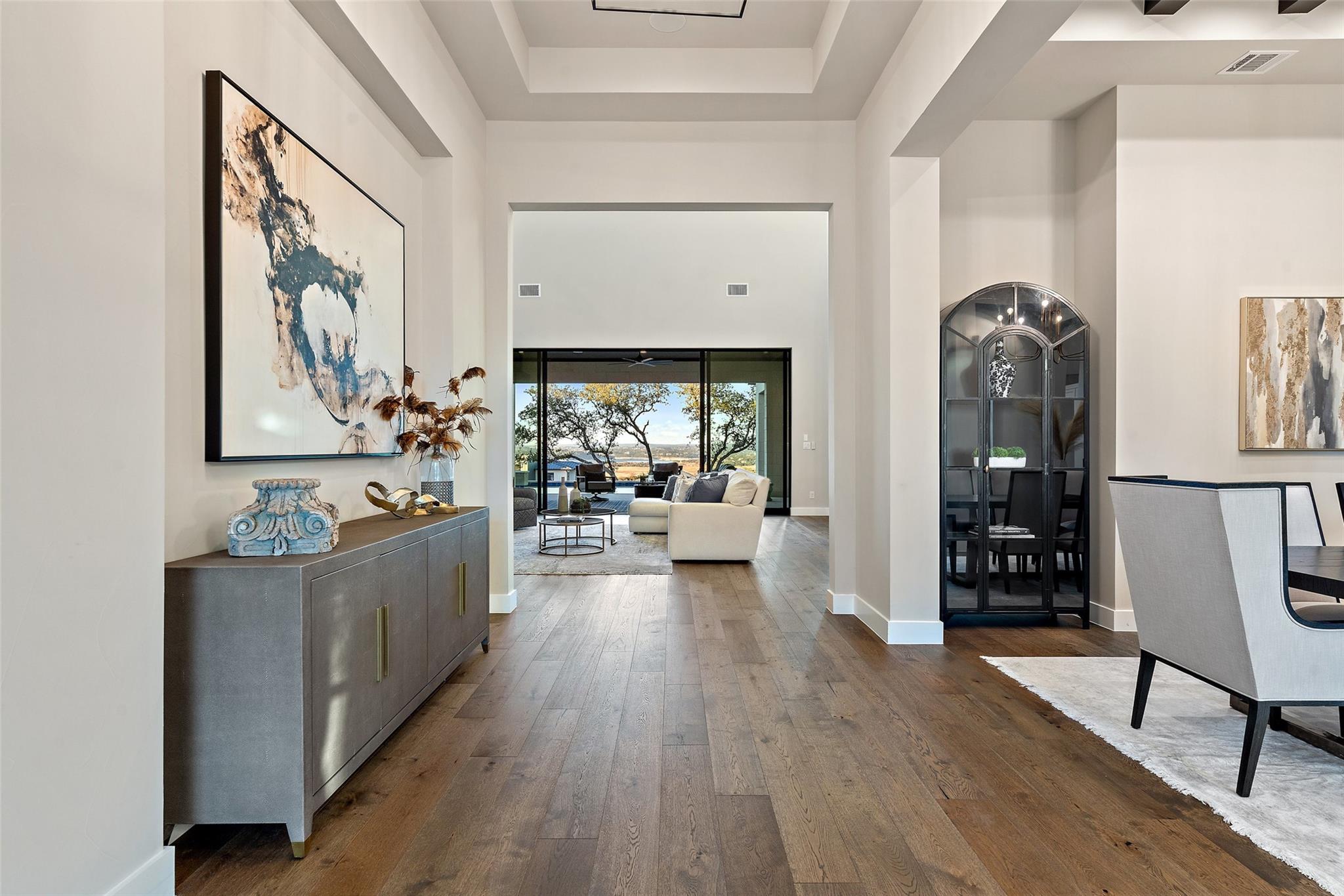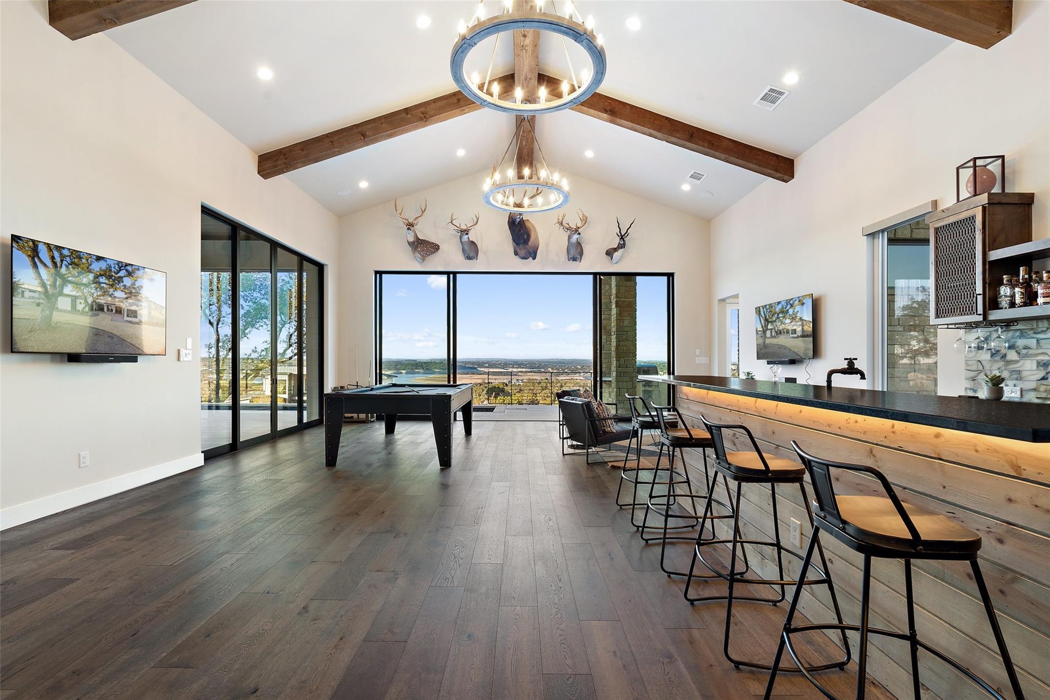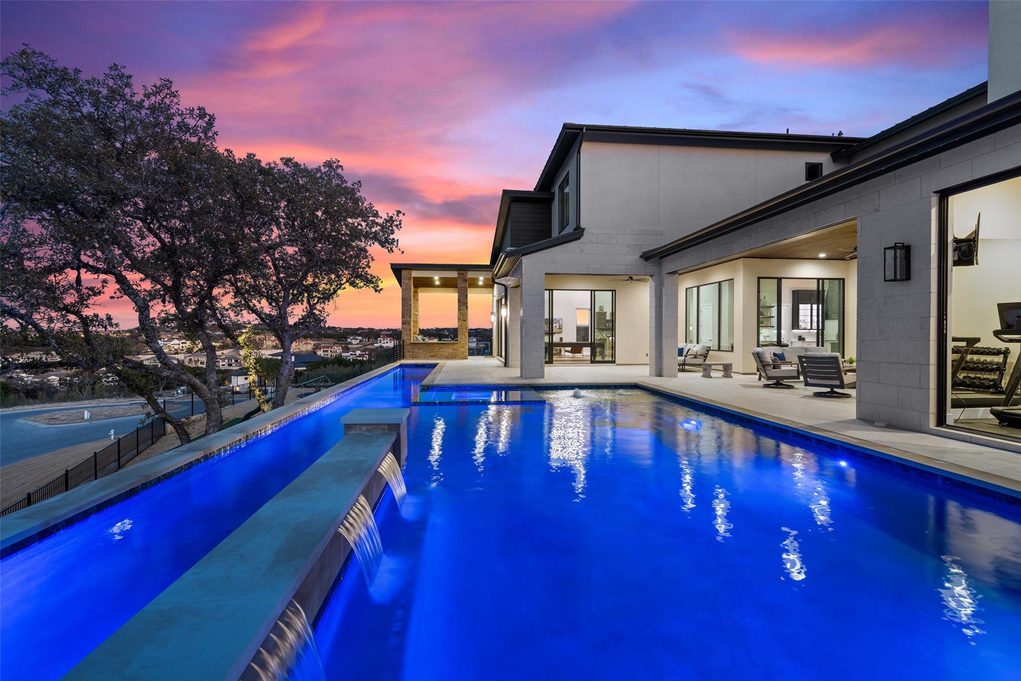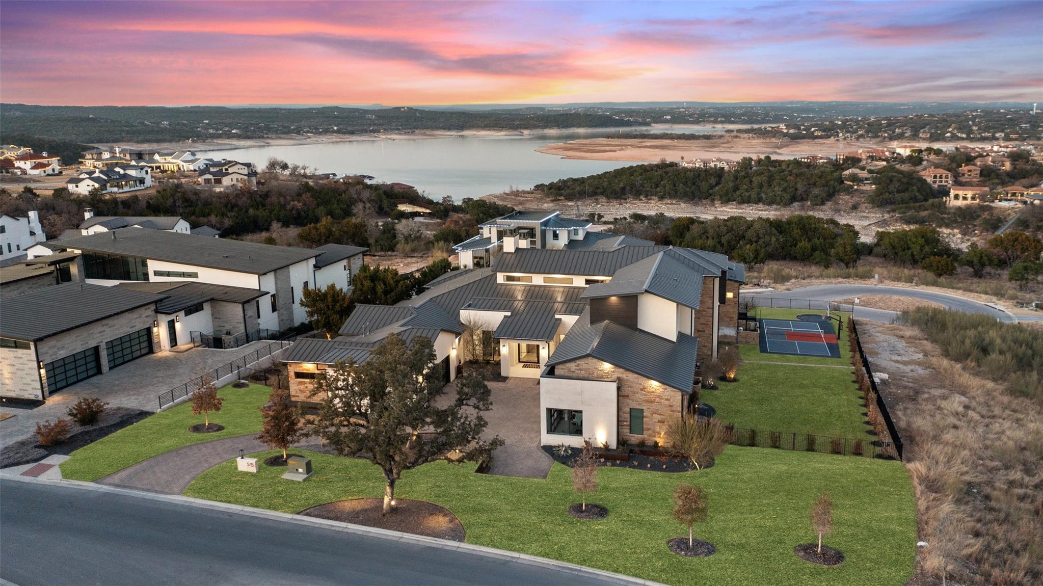 Modern luxury home built by Laurel Haven Homes in the prestigious gated Peninsula at Rough Hollow. Situated on an elevated estate sized lot with spectacular views of Lake Travis. Soaring ceilings and an open floor plan. Luxurious finishes, high quality materials and meticulous attention to detail. Indoor/outdoor flow with a wall of sliding glass and abundant windows that overlook the outdoor entertaining areas, sparkling pool and breathtaking lake views. Formal dining room with views of the custom glass wine room. Gourmet Chef’s Kitchen with custom cabinetry, large island with breakfast bar seating, walk thru pantry and a specialty Miele coffee station. Large living room with elegant fireplace and large sliding glass doors leading to the covered patio. The Owner’s suite boasts gorgeous views and spa like bathroom retreat with great closet space. Separate exercise room enjoys lake views. Executive office features a custom wall of built-ins. The large game-room features a bar and lots of space for movie watching and pool or ping pong. The main level guest apartment has it’s own separate entrance, a full kitchen with center island, living room with fireplace, bedroom and full bath plus a covered patio with yard space. Wonderful feature for long term guests or live in staff.   Upstairs features an additional living room with built in bunk beds and plenty of space for entertaining. Three spacious bedrooms each with en-suite full bathrooms and closets plus an upstairs laundry room and a large storage room. Outside you will find a backyard oasis with multiple entertaining patios and an outdoor kitchen, sparkling pool with swim lane and spa, a full sport court and trampoline plus plenty of grassy areas to play! Enjoy the lake lifestyle with resort style amenities of Rough Hollow - private marina, gourmet restaurant, fitness center, miles of hiking and biking trails, tennis, parks and more. Located in the highly ranked Lake Travis school district moments from Lakeway.