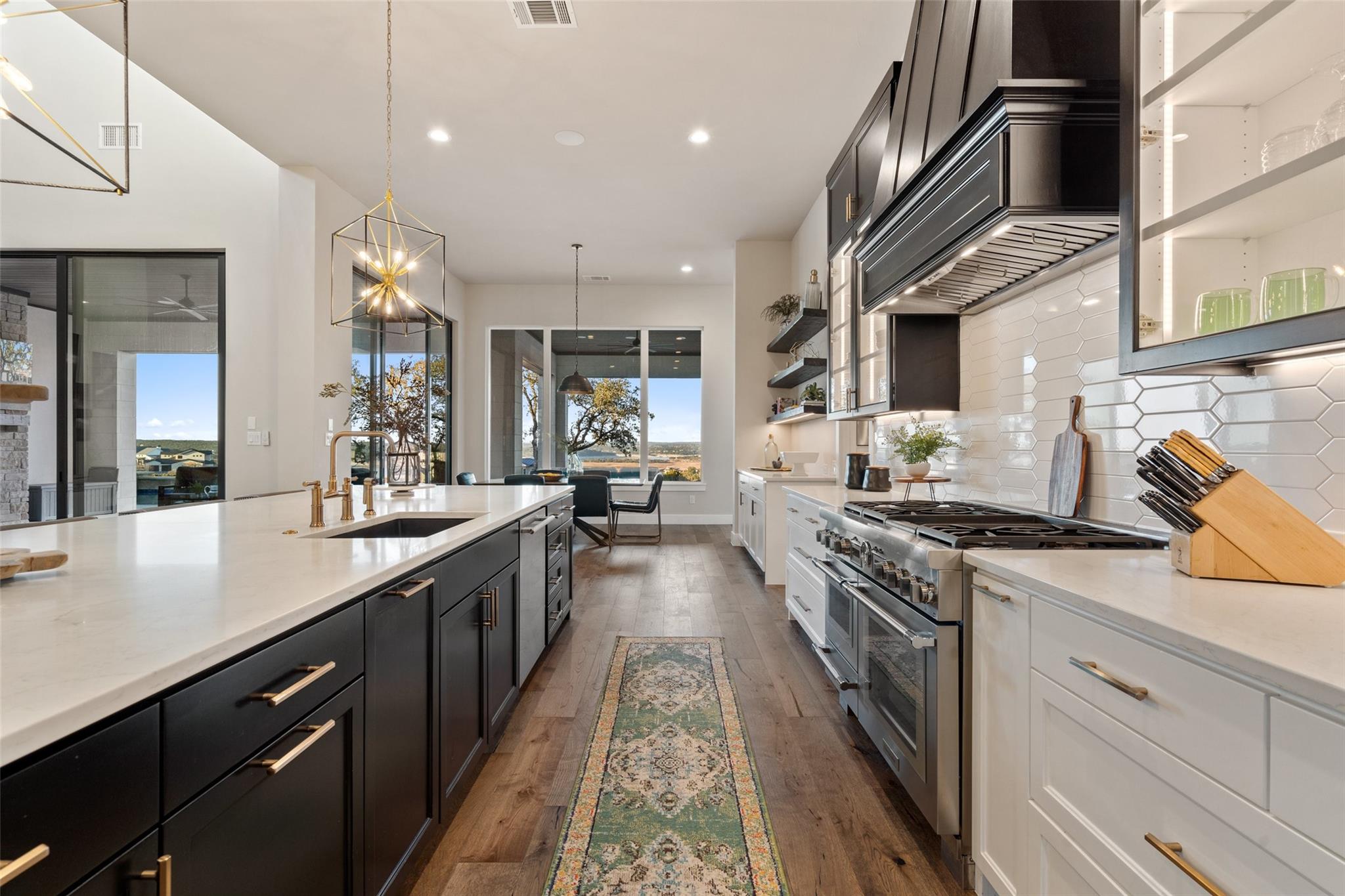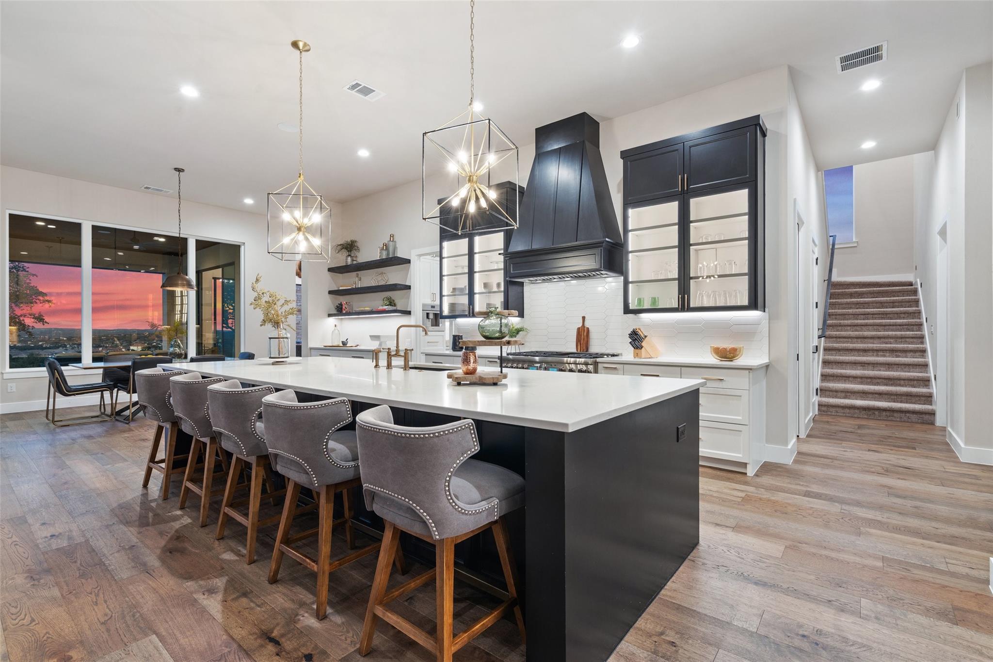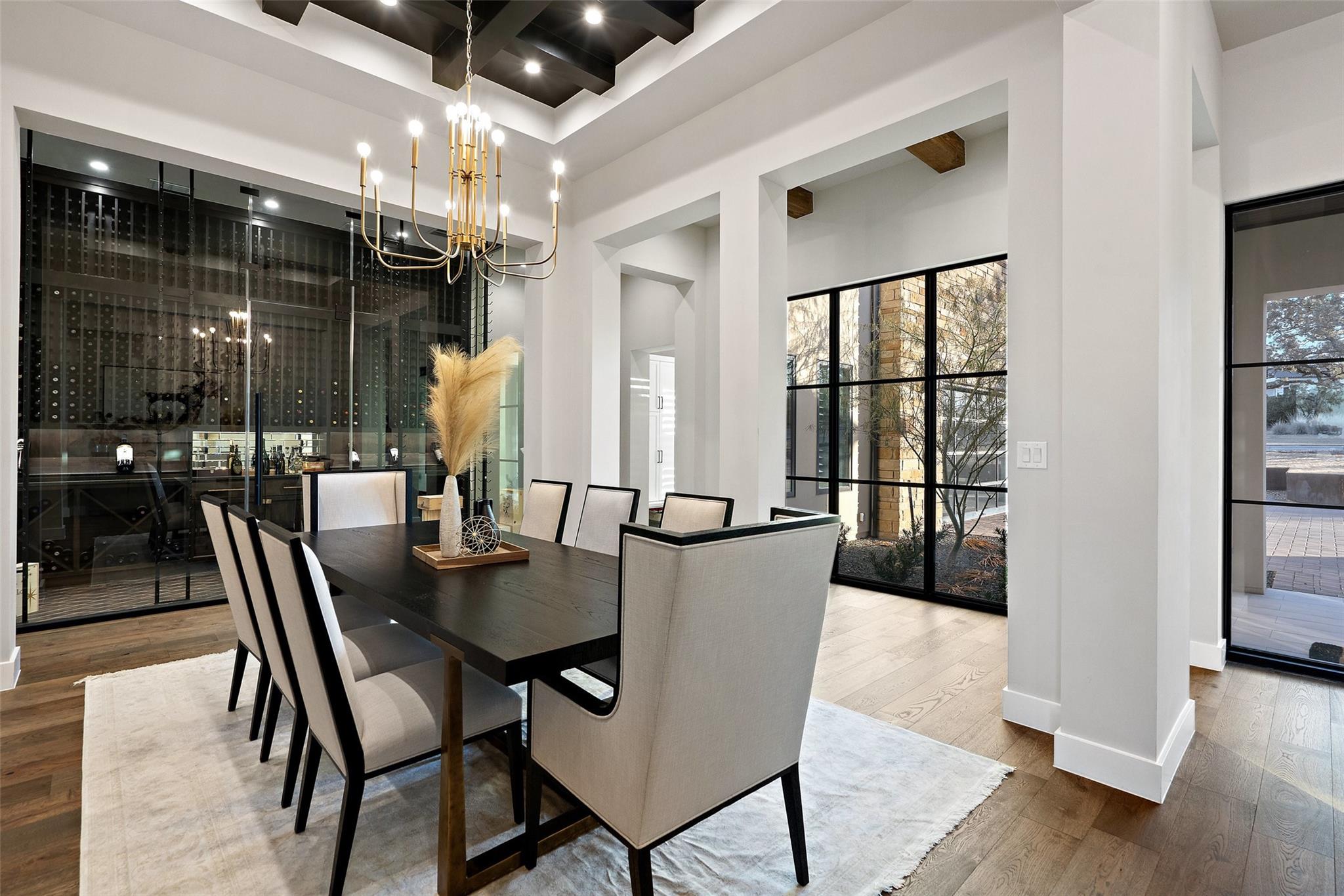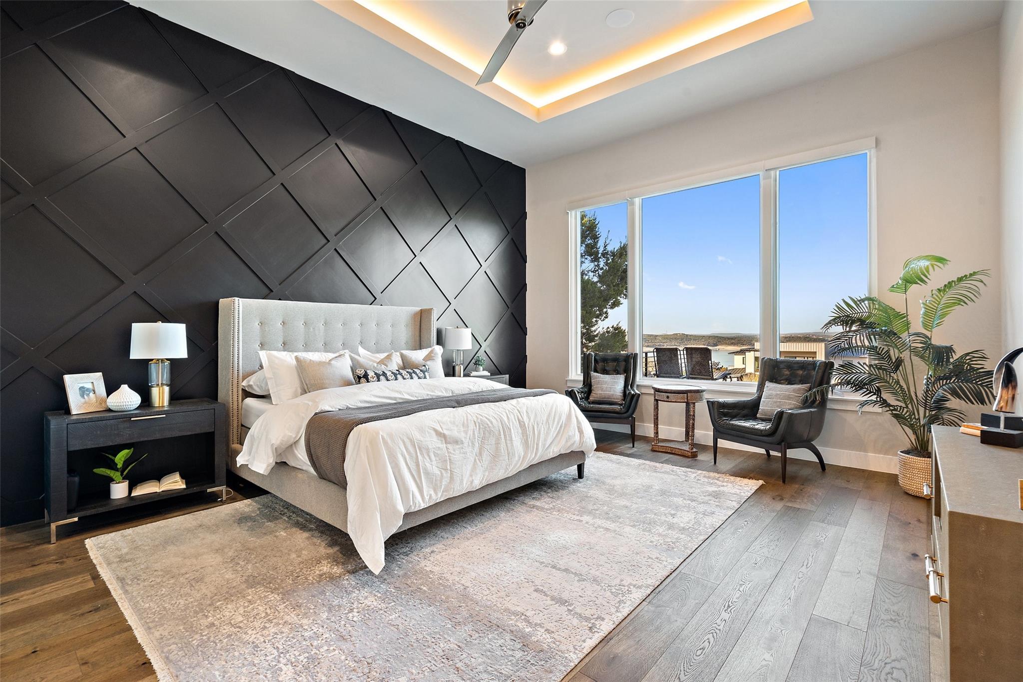 Modern luxury home built by Laurel Haven Homes in the prestigious gated Peninsula at Rough Hollow. Situated on an elevated estate sized lot with spectacular views of Lake Travis. Soaring ceilings and an open floor plan. Luxurious finishes, high quality materials and meticulous attention to detail. Indoor/outdoor flow with a wall of sliding glass and abundant windows that overlook the outdoor entertaining areas, sparkling pool and breathtaking lake views. Formal dining room with views of the custom glass wine room. Gourmet Chef’s Kitchen with custom cabinetry, large island with breakfast bar seating, walk thru pantry and a specialty Miele coffee station. Large living room with elegant fireplace and large sliding glass doors leading to the covered patio. The Owner’s suite boasts gorgeous views and spa like bathroom retreat with great closet space. Separate exercise room enjoys lake views. Executive office features a custom wall of built-ins. The large game-room features a bar and lots of space for movie watching and pool or ping pong. The main level guest apartment has it’s own separate entrance, a full kitchen with center island, living room with fireplace, bedroom and full bath plus a covered patio with yard space. Wonderful feature for long term guests or live in staff.   Upstairs features an additional living room with built in bunk beds and plenty of space for entertaining. Three spacious bedrooms each with en-suite full bathrooms and closets plus an upstairs laundry room and a large storage room. Outside you will find a backyard oasis with multiple entertaining patios and an outdoor kitchen, sparkling pool with swim lane and spa, a full sport court and trampoline plus plenty of grassy areas to play! Enjoy the lake lifestyle with resort style amenities of Rough Hollow - private marina, gourmet restaurant, fitness center, miles of hiking and biking trails, tennis, parks and more. Located in the highly ranked Lake Travis school district moments from Lakeway.