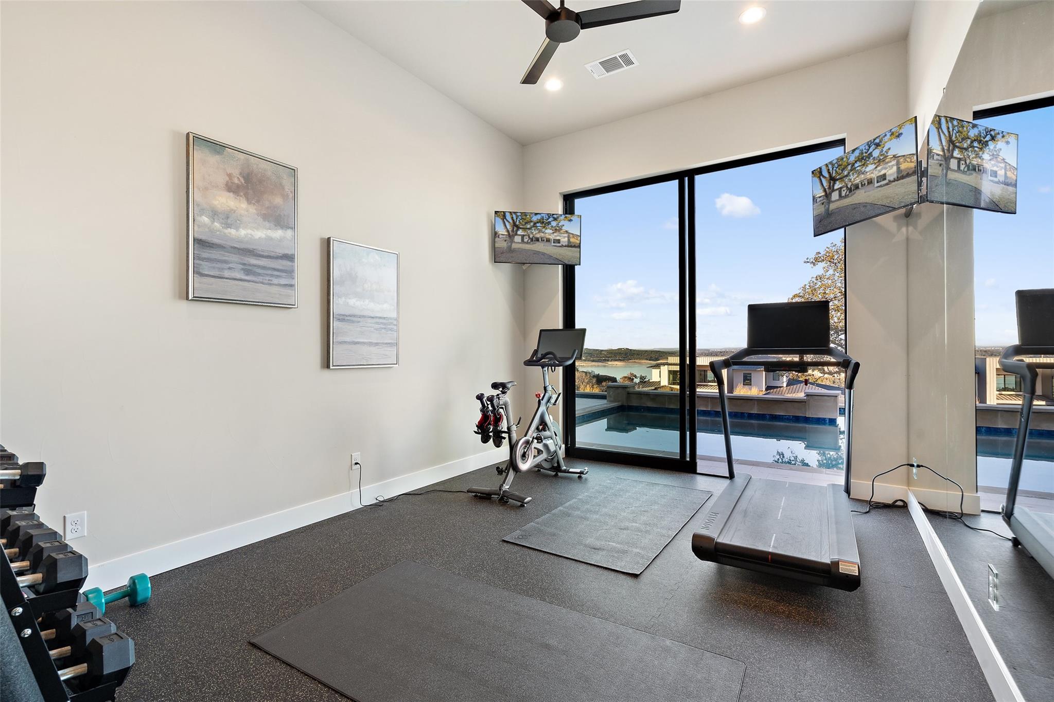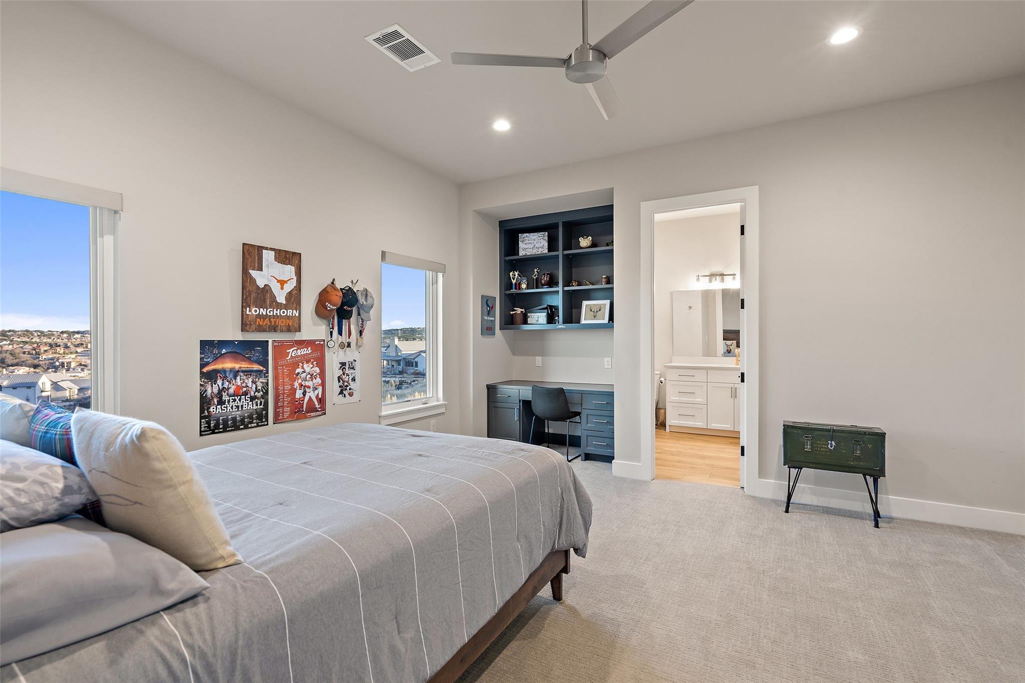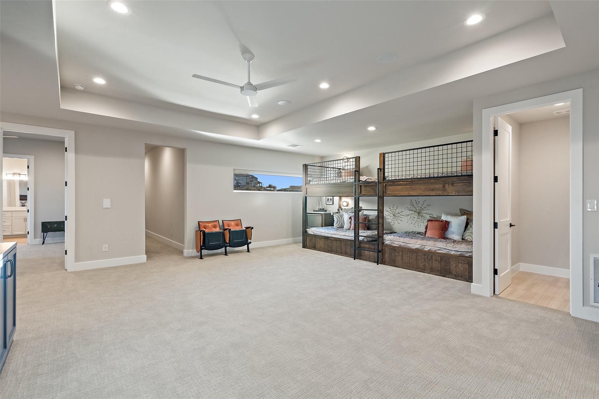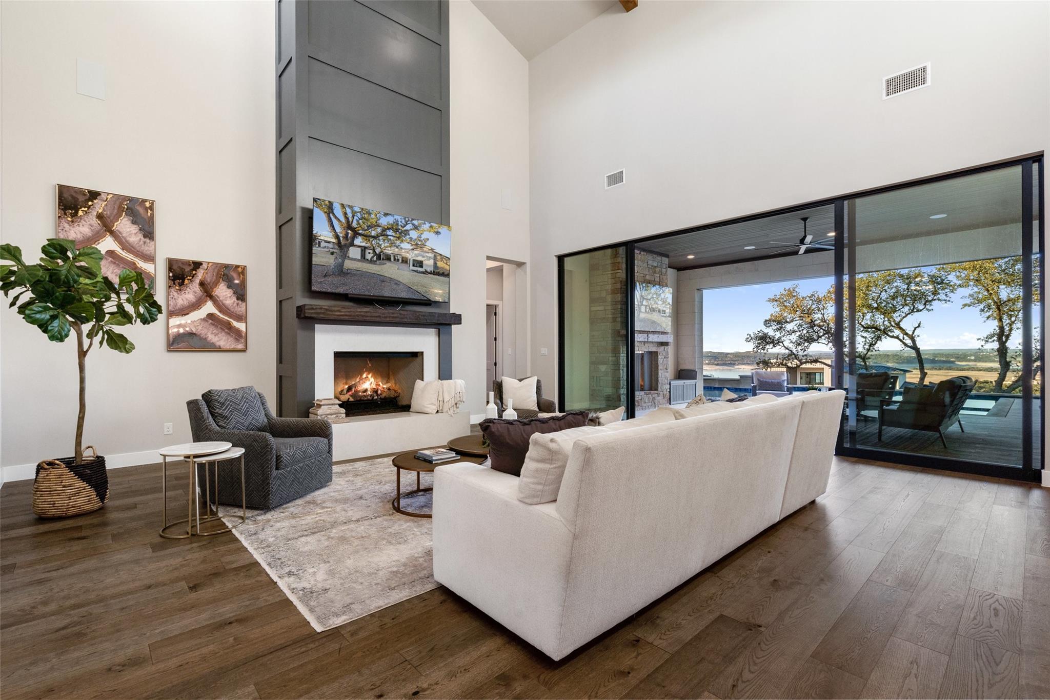 Modern luxury home built by Laurel Haven Homes in the prestigious gated Peninsula at Rough Hollow. Situated on an elevated estate sized lot with spectacular views of Lake Travis. Soaring ceilings and an open floor plan. Luxurious finishes, high quality materials and meticulous attention to detail. Indoor/outdoor flow with a wall of sliding glass and abundant windows that overlook the outdoor entertaining areas, sparkling pool and breathtaking lake views. Formal dining room with views of the custom glass wine room. Gourmet Chef’s Kitchen with custom cabinetry, large island with breakfast bar seating, walk thru pantry and a specialty Miele coffee station. Large living room with elegant fireplace and large sliding glass doors leading to the covered patio. The Owner’s suite boasts gorgeous views and spa like bathroom retreat with great closet space. Separate exercise room enjoys lake views. Executive office features a custom wall of built-ins. The large game-room features a bar and lots of space for movie watching and pool or ping pong. The main level guest apartment has it’s own separate entrance, a full kitchen with center island, living room with fireplace, bedroom and full bath plus a covered patio with yard space. Wonderful feature for long term guests or live in staff.   Upstairs features an additional living room with built in bunk beds and plenty of space for entertaining. Three spacious bedrooms each with en-suite full bathrooms and closets plus an upstairs laundry room and a large storage room. Outside you will find a backyard oasis with multiple entertaining patios and an outdoor kitchen, sparkling pool with swim lane and spa, a full sport court and trampoline plus plenty of grassy areas to play! Enjoy the lake lifestyle with resort style amenities of Rough Hollow - private marina, gourmet restaurant, fitness center, miles of hiking and biking trails, tennis, parks and more. Located in the highly ranked Lake Travis school district moments from Lakeway.