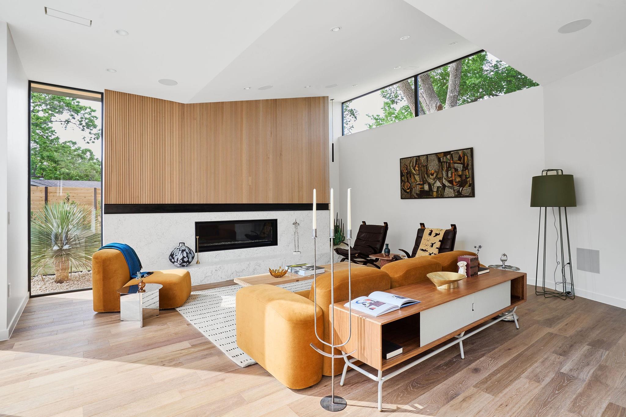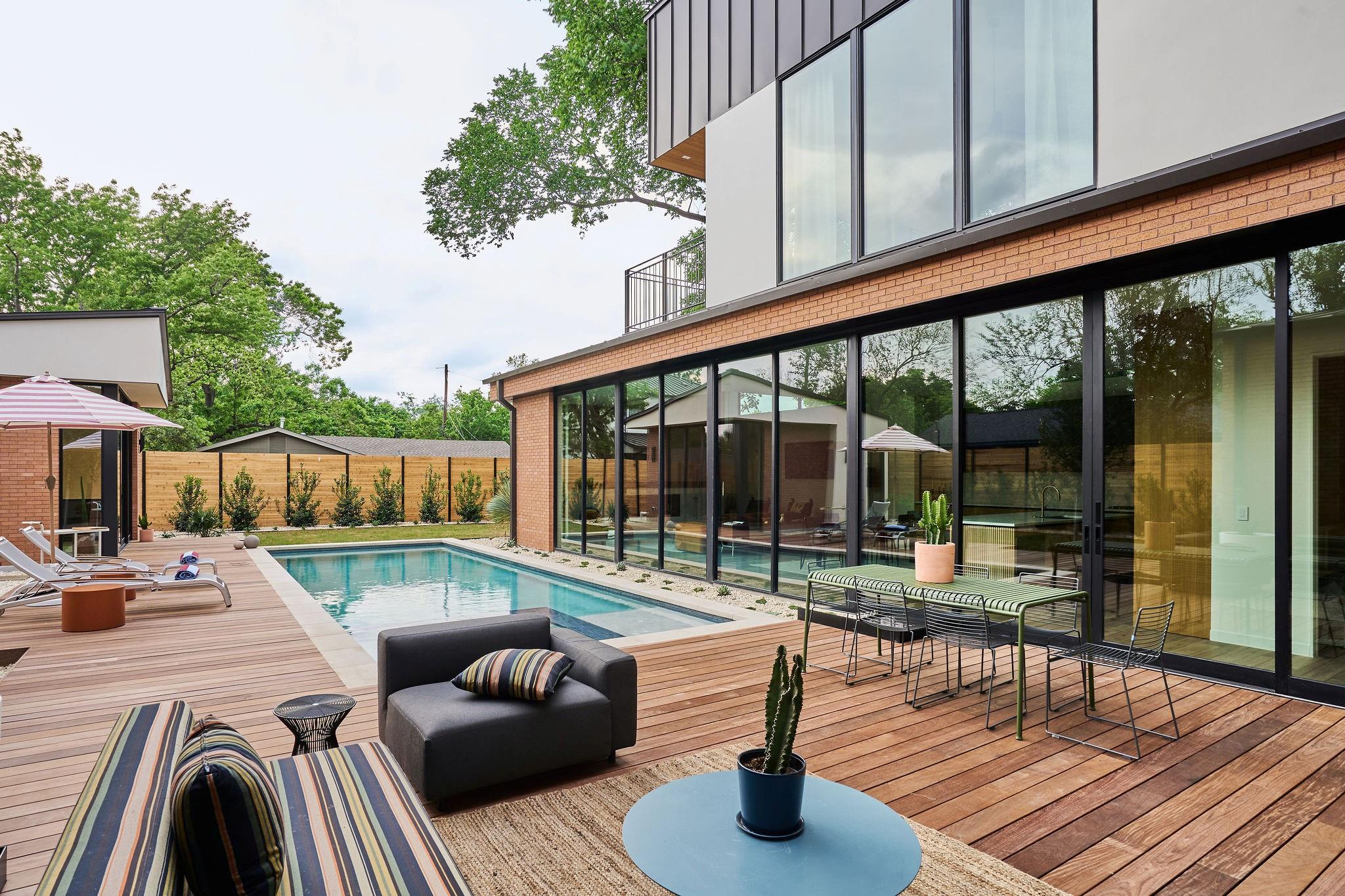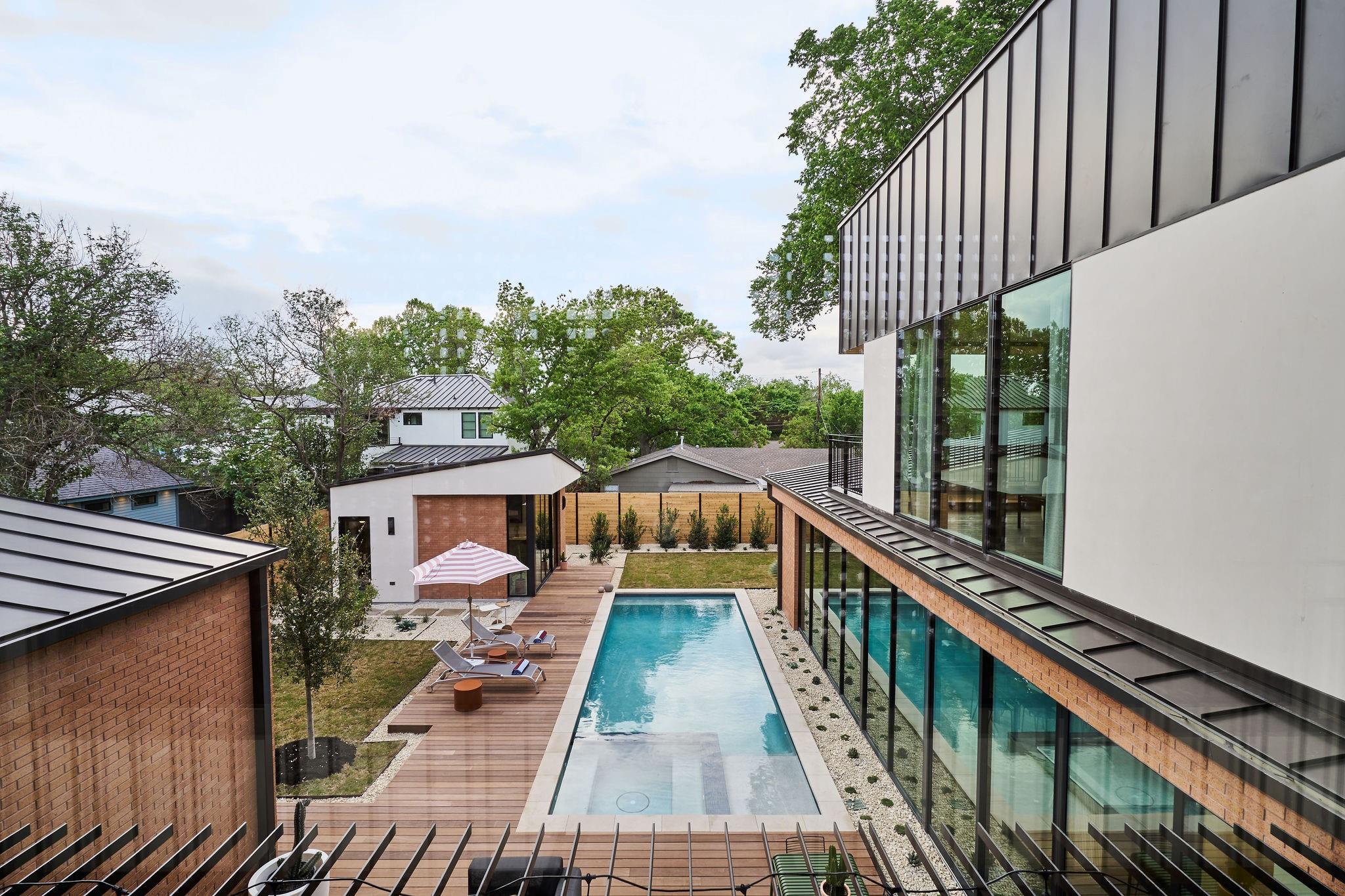 Welcome to an exceptional reimagining of Mid-Century Modern, meticulously crafted by FIA Homes and designed by CoXist Architecture. Nestled in Austin’s tranquil Zilker area, this impressive 4,361 sqft property boasts 5 bedrooms, 5.5 baths, and a thoughtfully designed 2-story floor plan. It is surrounded by custom landscaping and private courtyards, with a Casita perfectly situated at the back of the property. Enter through a crafted steel gate and pass a solid stucco wall that offers privacy. The home’s exterior blends clean brick lines with natural hemlock wood overhangs and striking black steel details, setting the stage for its sophisticated atmosphere. The elevated entry features suspended terracotta breeze blocks that filter sunlight while maintaining privacy. Inside, function and elegance seamlessly coalesce. Extensive windows, reaching towards the modern gable roof, flood the living spaces with sunlight, complementing the kitchen’s Italian Olmo Elm and Laccato Opaco cabinets set atop Caesarstone countertops. The living area is enriched by fireplaces encased in stone and textured wood. The design harmoniously integrates indoor and outdoor spaces through vast windows and glass doors, leading to an expansive serene pool that enhances the property’s thoughtful design. Discreetly positioned, the primary suite is a luxurious retreat with custom tile work and gold accents. Customizable integrated ambient lighting throughout allows for a personalized atmosphere in each space. The bathrooms feature unique lighting and tile work that exude sophistication. The adaptable casita can serve as a home office, guest quarters, or a lounge area by the pool. With meticulous attention to detail, this home is a celebration of refined design and quality craftsmanship. Your new home awaits in the heart of Austin’s Zilker neighborhood.