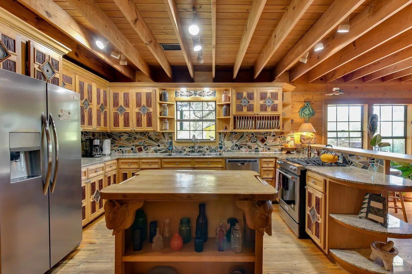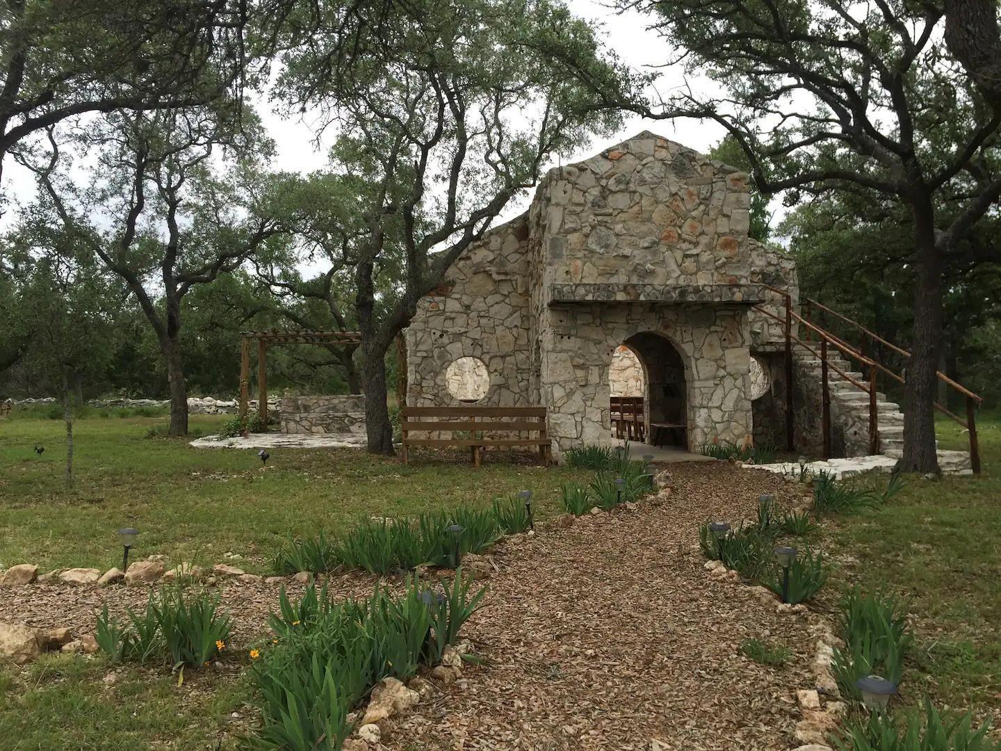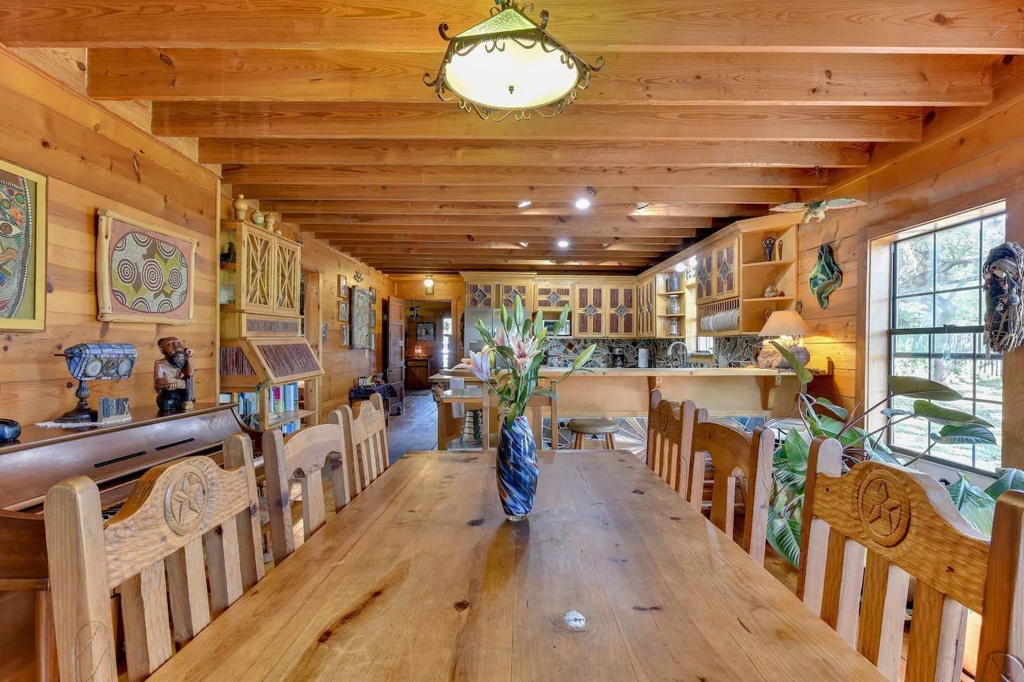 Introducing the spiritual Hill Country hideaway, "Sacred Passages". This ~35 acre Wimberly ranch estate boasts a magnificent log cabin, enchanting hand built stone chapel, tranquil lagoon style pool, & so much more. Inside the dwelling, discover vaulted ceilings with an interior embellished in a blend of rustic cowboy & Native American-inspired decor. The kitchen showcases unique mosaic tile backsplash, stunning light granite countertops, custom detailed cabinets, gas range & gourmet stainless steel sink. Two stone fireplaces are available in the dining room & living room. The primary bathroom highlights a sculptural walk-in shower, inducing abstract art. In the other bathroom is a soaking tub adorned in mesmerizing mosaic tiles. The front of the lodge features an expansive front veranda, leading to a stone path guiding to the flourishing koi pond, stone patio, & elysian cabana. A clear blue pool w/ built-in fountain, lovely outdoor kitchen w/ stone grill, massive stone fire pit, & raised outdoor stage formulate the perfect space for both entertainment & relaxation. The stone chapel stands as the most breathtaking feature, seating up ~100 guests in a surreal open-air sanctuary, ideal for weddings, concerts, & other events. Other structures on the property: detached garage, horse amenities such as a barn w/ stables, a corral, & a grandiose stone rabbit house. This property has been a labor of love w/ several art installations, often featuring precious honey calcite crystals that are found in abundance on the land. This property has served as both an income-producing short term rental & a homestead for the owner, who has cultivated a meticulous reputation. With easy access to RR12, close proximity to Downtown Wimberley, upcoming Hill Country Studios, Jacobs Well & several other tourist destinations, this location is prime yet still maintains privacy. Don’t miss your opportunity to own this magnificent Hill Country gem!