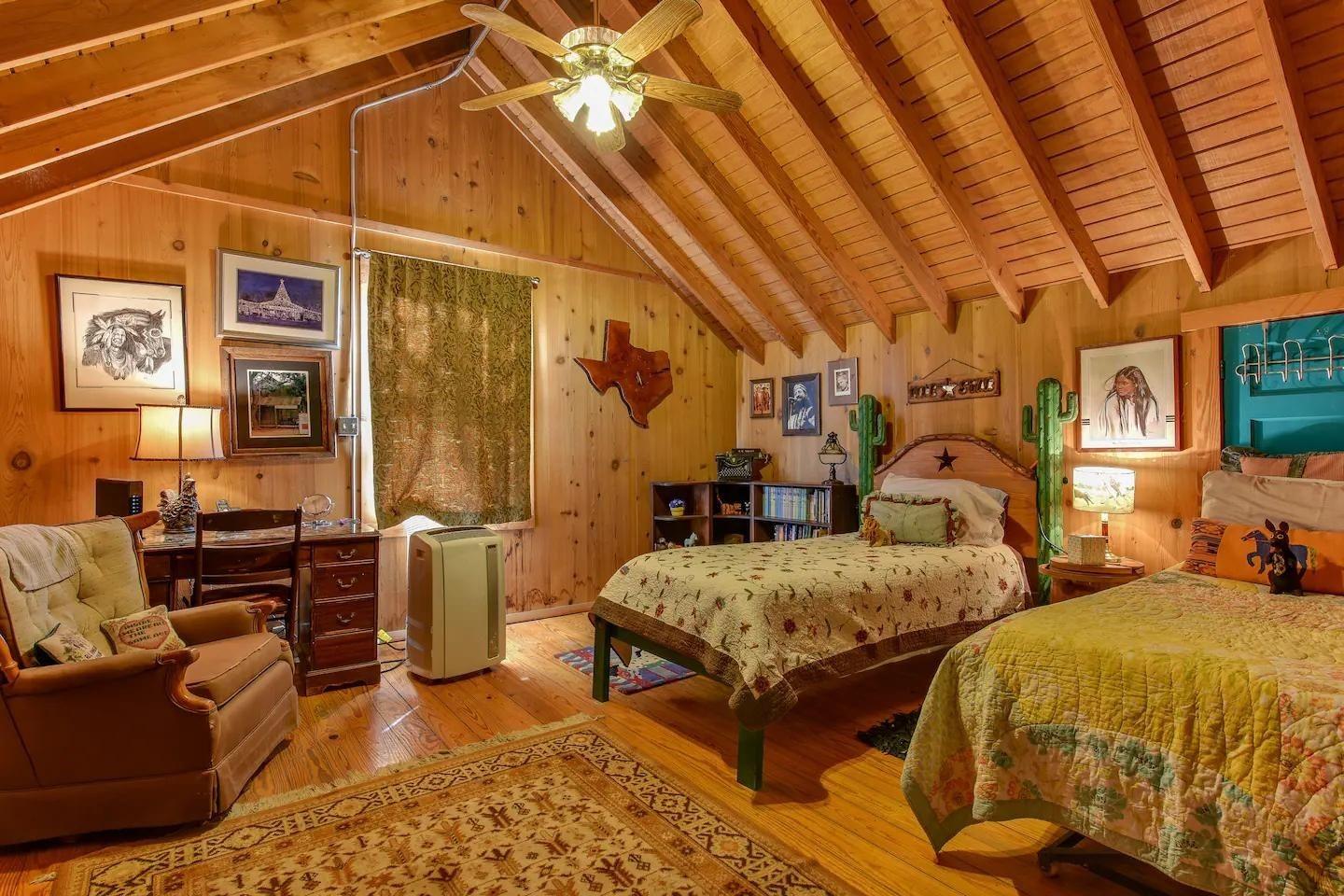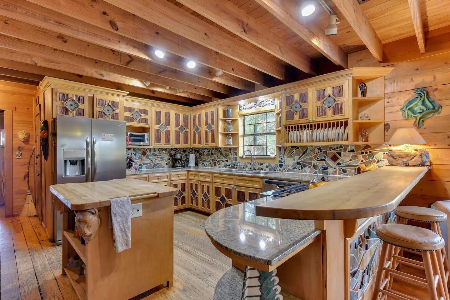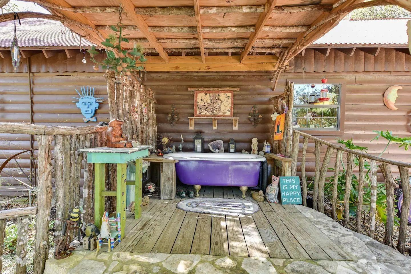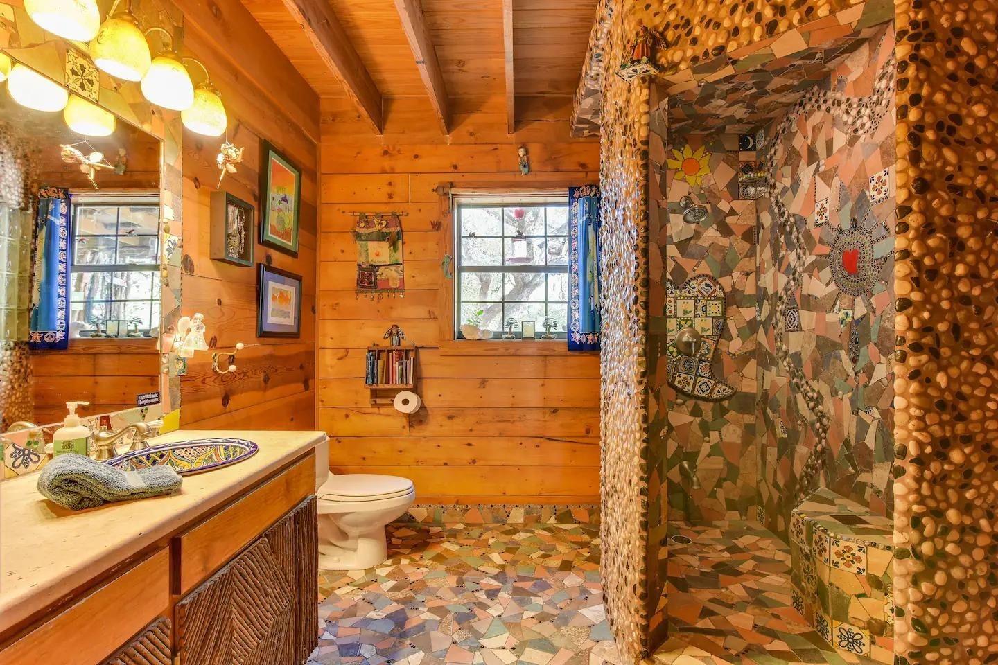 Introducing the spiritual Hill Country hideaway, "Sacred Passages". This ~35 acre Wimberly ranch estate boasts a magnificent log cabin, enchanting hand built stone chapel, tranquil lagoon style pool, & so much more. Inside the dwelling, discover vaulted ceilings with an interior embellished in a blend of rustic cowboy & Native American-inspired decor. The kitchen showcases unique mosaic tile backsplash, stunning light granite countertops, custom detailed cabinets, gas range & gourmet stainless steel sink. Two stone fireplaces are available in the dining room & living room. The primary bathroom highlights a sculptural walk-in shower, inducing abstract art. In the other bathroom is a soaking tub adorned in mesmerizing mosaic tiles. The front of the lodge features an expansive front veranda, leading to a stone path guiding to the flourishing koi pond, stone patio, & elysian cabana. A clear blue pool w/ built-in fountain, lovely outdoor kitchen w/ stone grill, massive stone fire pit, & raised outdoor stage formulate the perfect space for both entertainment & relaxation. The stone chapel stands as the most breathtaking feature, seating up ~100 guests in a surreal open-air sanctuary, ideal for weddings, concerts, & other events. Other structures on the property: detached garage, horse amenities such as a barn w/ stables, a corral, & a grandiose stone rabbit house. This property has been a labor of love w/ several art installations, often featuring precious honey calcite crystals that are found in abundance on the land. This property has served as both an income-producing short term rental & a homestead for the owner, who has cultivated a meticulous reputation. With easy access to RR12, close proximity to Downtown Wimberley, upcoming Hill Country Studios, Jacobs Well & several other tourist destinations, this location is prime yet still maintains privacy. Don’t miss your opportunity to own this magnificent Hill Country gem!