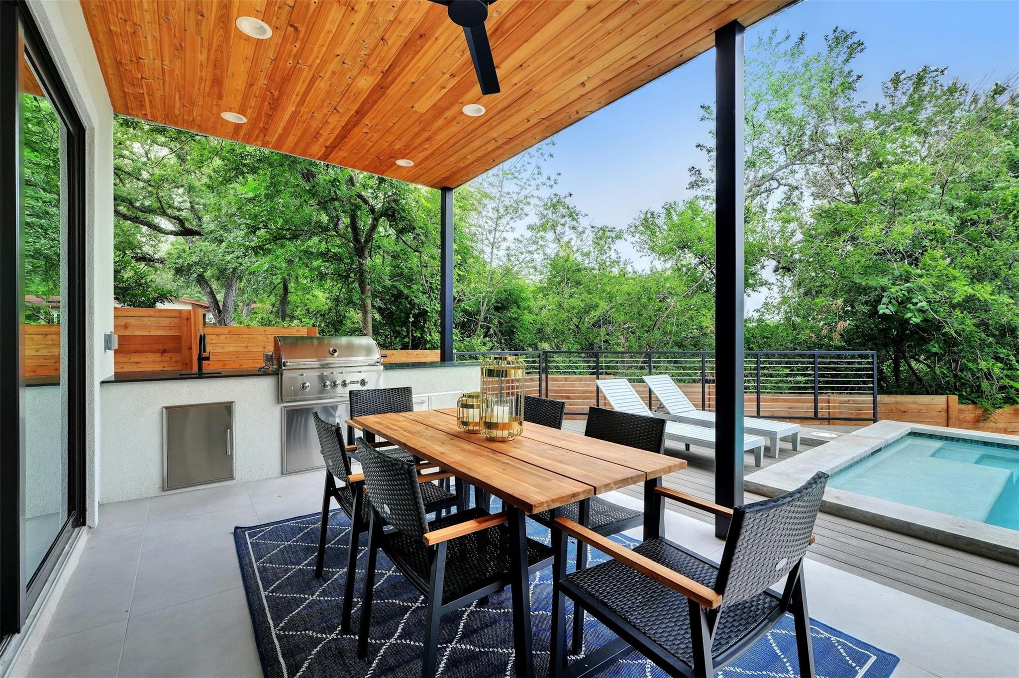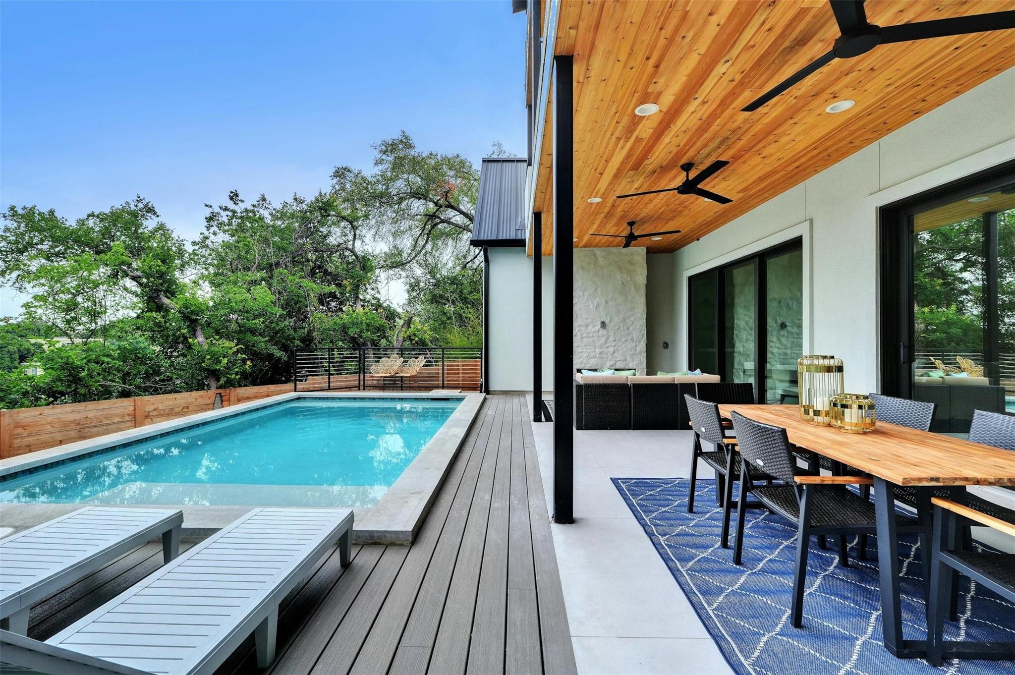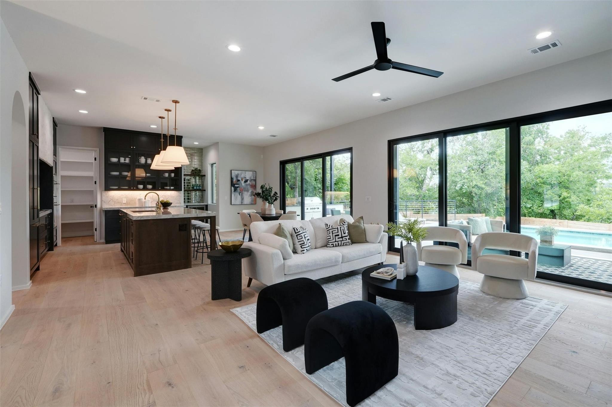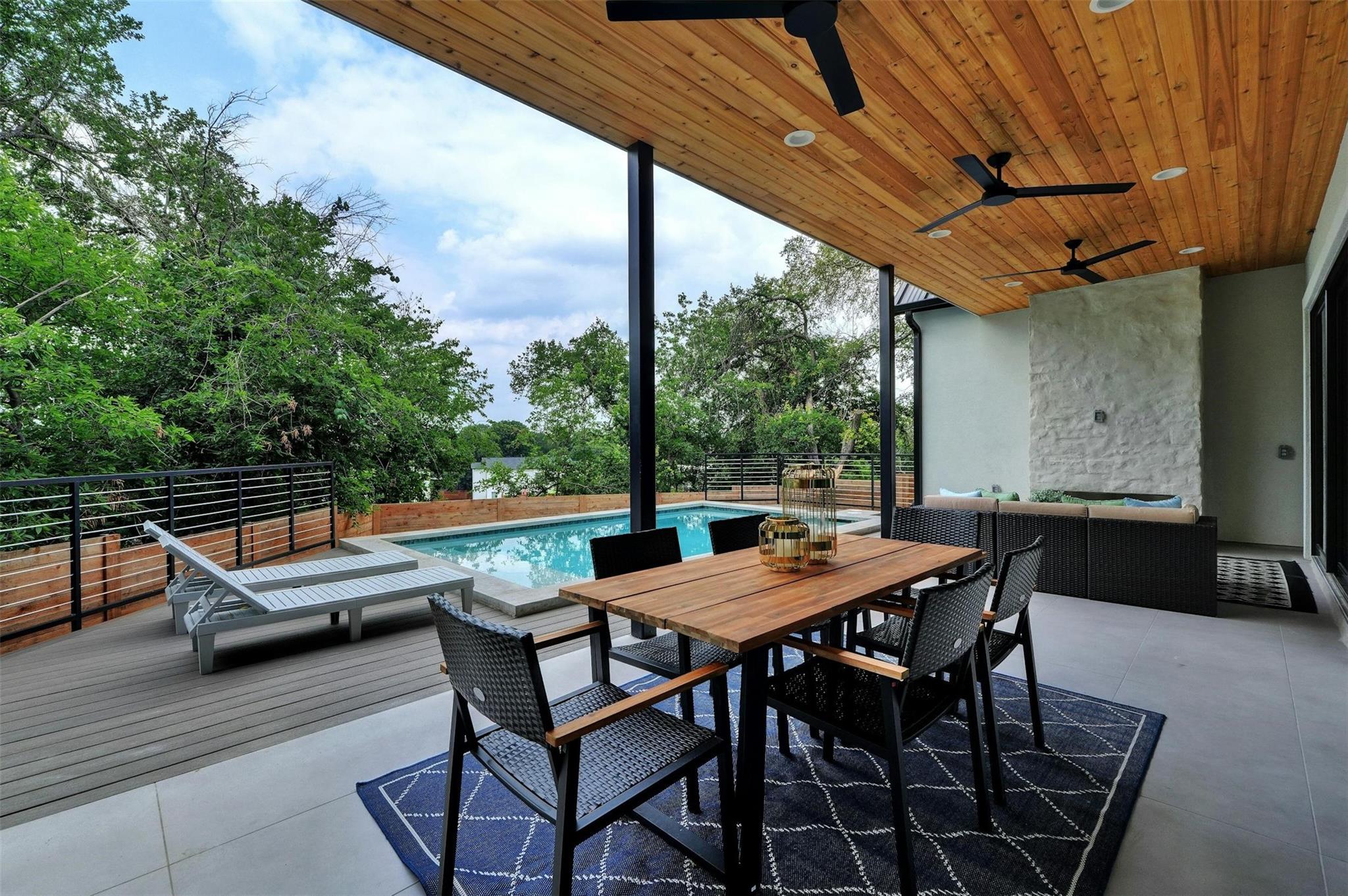 New construction masterpiece offers breathtaking hill country and downtown panoramic views from its expansive roof decks, creating an unparalleled luxury living experience. The main level features an open floor plan with living, dining, and a gourmet kitchen equipped with professional Thermador appliances. The home includes four bedrooms, a media room, a TV room, four full bathrooms, and two half baths. Outdoor entertainment spaces abound with three decks: the first, next to the pool is ideal for outdoor dining and entertainment, the second offers an outdoor space for the bedrooms on the second with a full bar and fridge, the third also boasts a full bar, fridge and offers stunning city views. Located in Barton Hollow, this property provides easy access to Austin's best restaurants, shops, tech employers, and green spaces like Zilker Park and Lady Bird Lake, most of which are within walking distance. The carefully curated high-end finishes, fixtures, and furnishings enhance the modern design, making this home a rare gem in a vibrant, livable community. Additionally, this property offers an additional 204 sq ft not included in the MLS, providing even more functional space for luxury living.