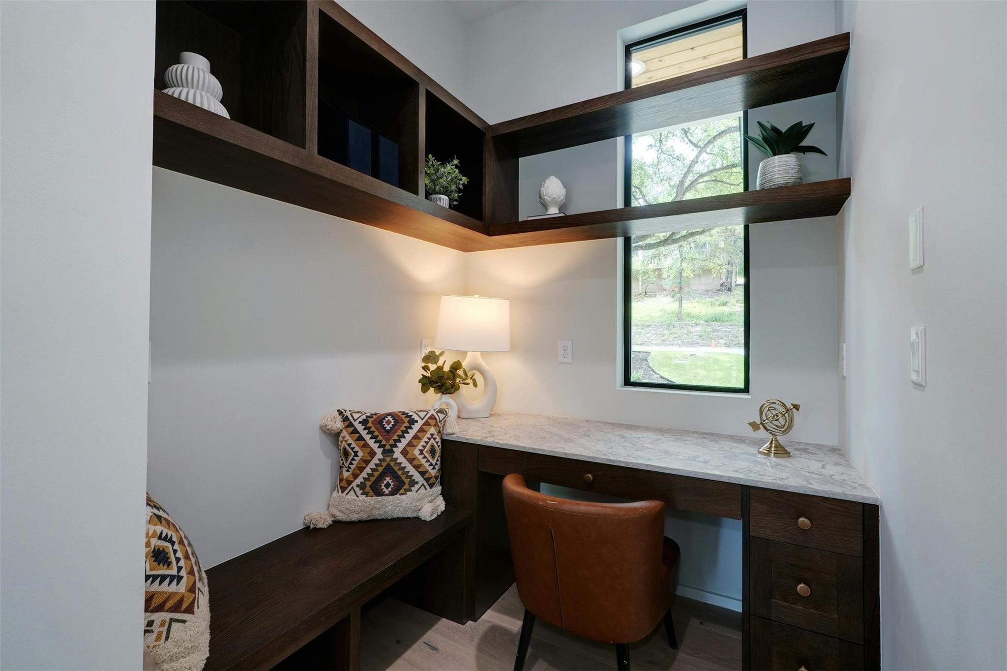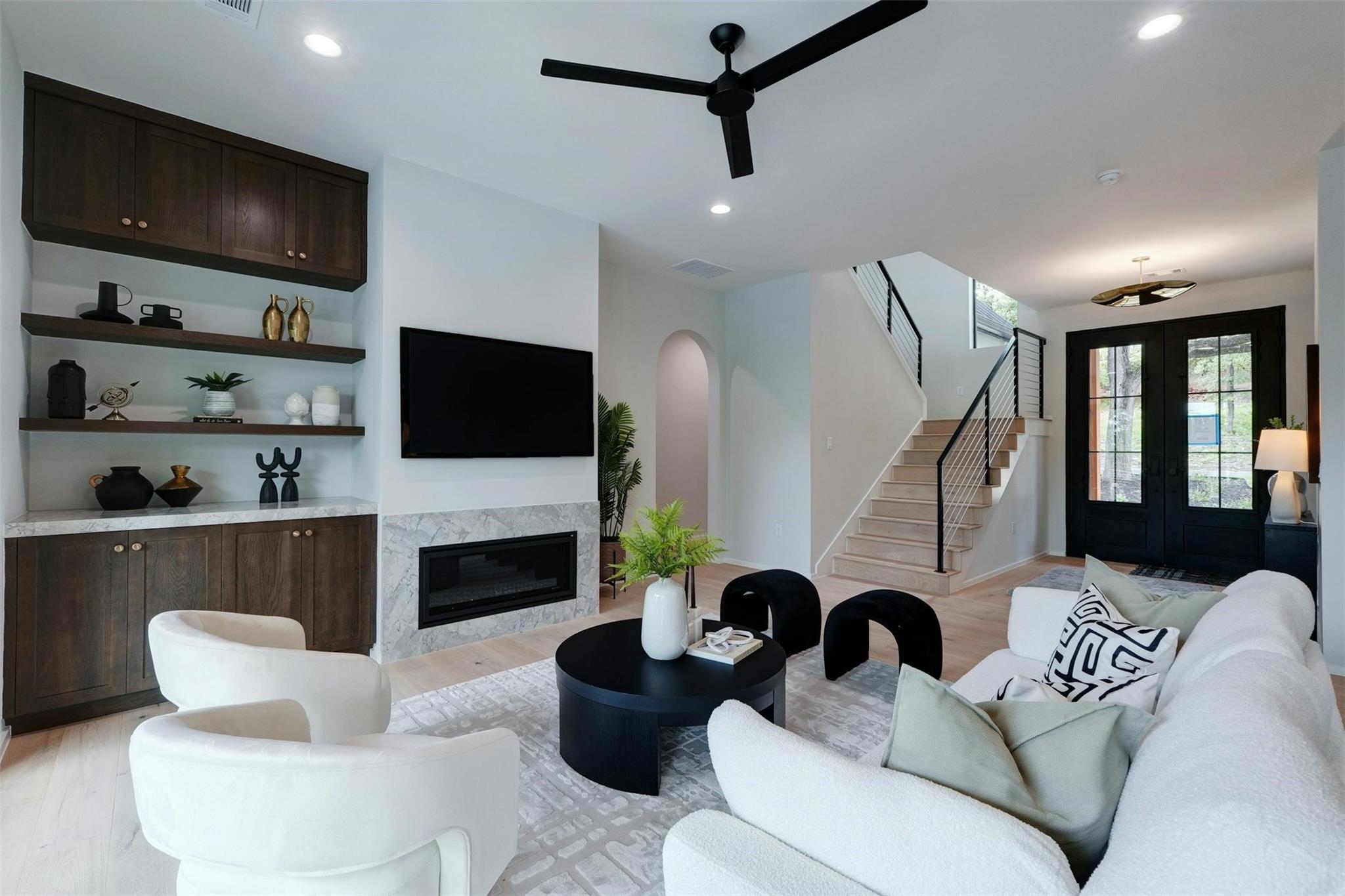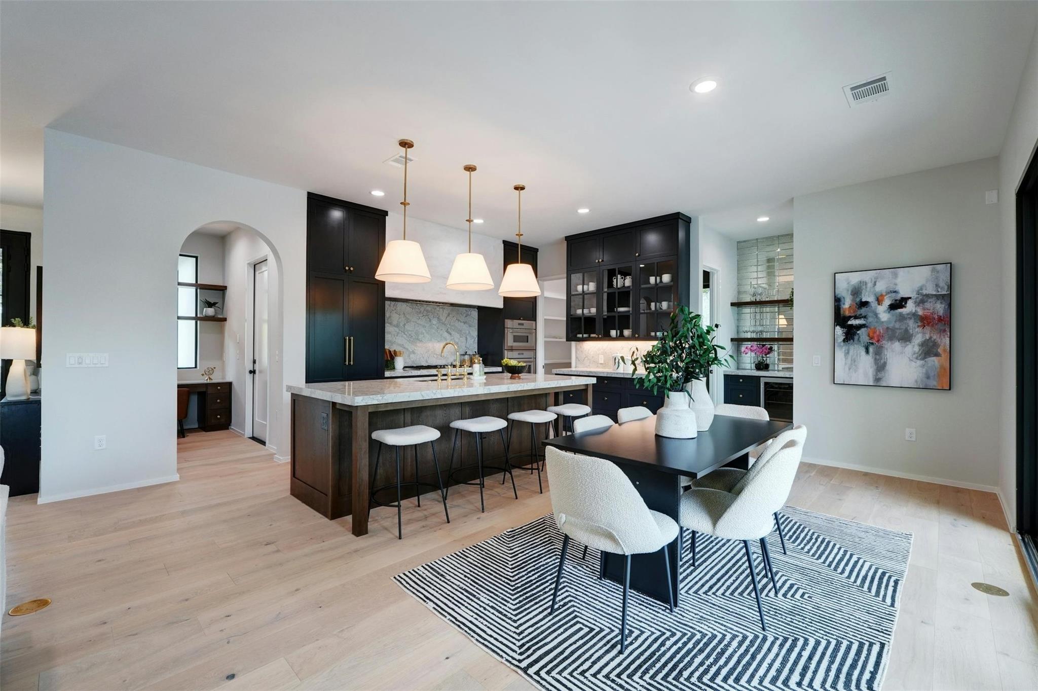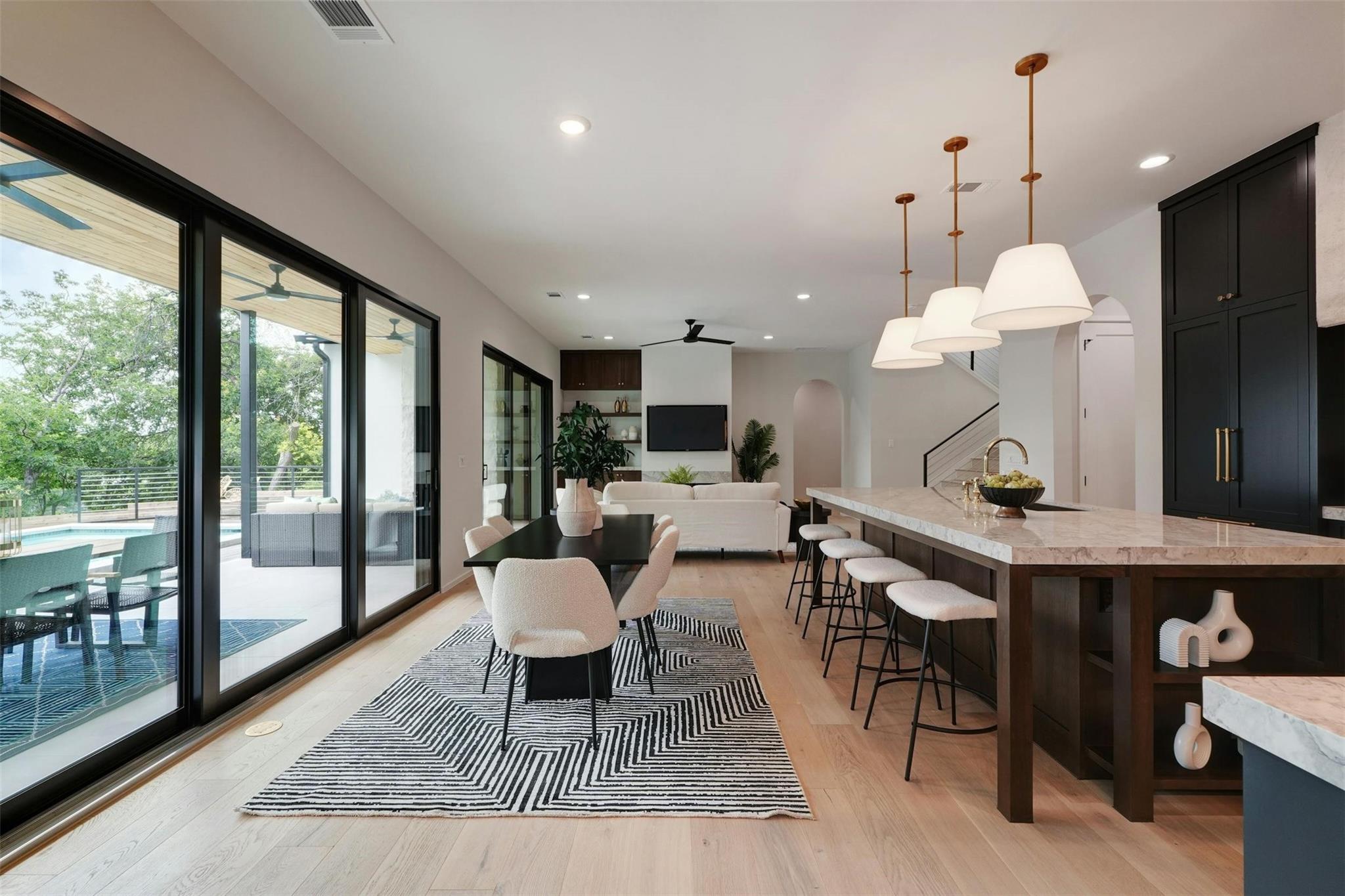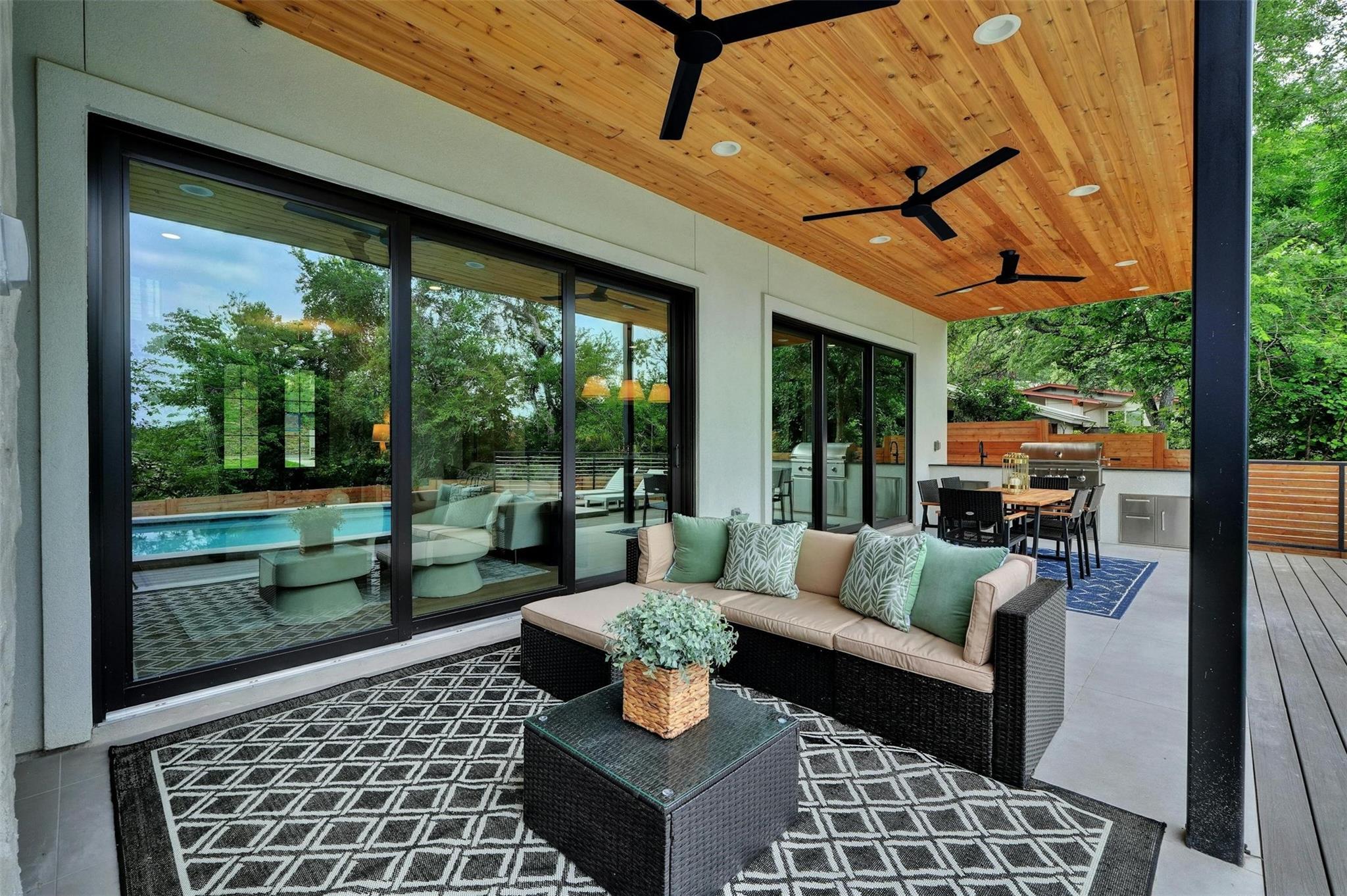 New construction masterpiece offers breathtaking hill country and downtown panoramic views from its expansive roof decks, creating an unparalleled luxury living experience. The main level features an open floor plan with living, dining, and a gourmet kitchen equipped with professional Thermador appliances. The home includes four bedrooms, a media room, a TV room, four full bathrooms, and two half baths. Outdoor entertainment spaces abound with three decks: the first, next to the pool is ideal for outdoor dining and entertainment, the second offers an outdoor space for the bedrooms on the second with a full bar and fridge, the third also boasts a full bar, fridge and offers stunning city views. Located in Barton Hollow, this property provides easy access to Austin's best restaurants, shops, tech employers, and green spaces like Zilker Park and Lady Bird Lake, most of which are within walking distance. The carefully curated high-end finishes, fixtures, and furnishings enhance the modern design, making this home a rare gem in a vibrant, livable community. Additionally, this property offers an additional 204 sq ft not included in the MLS, providing even more functional space for luxury living.