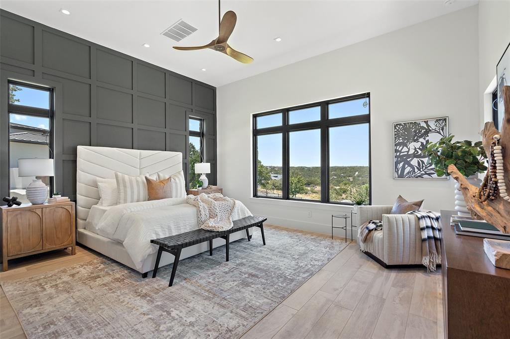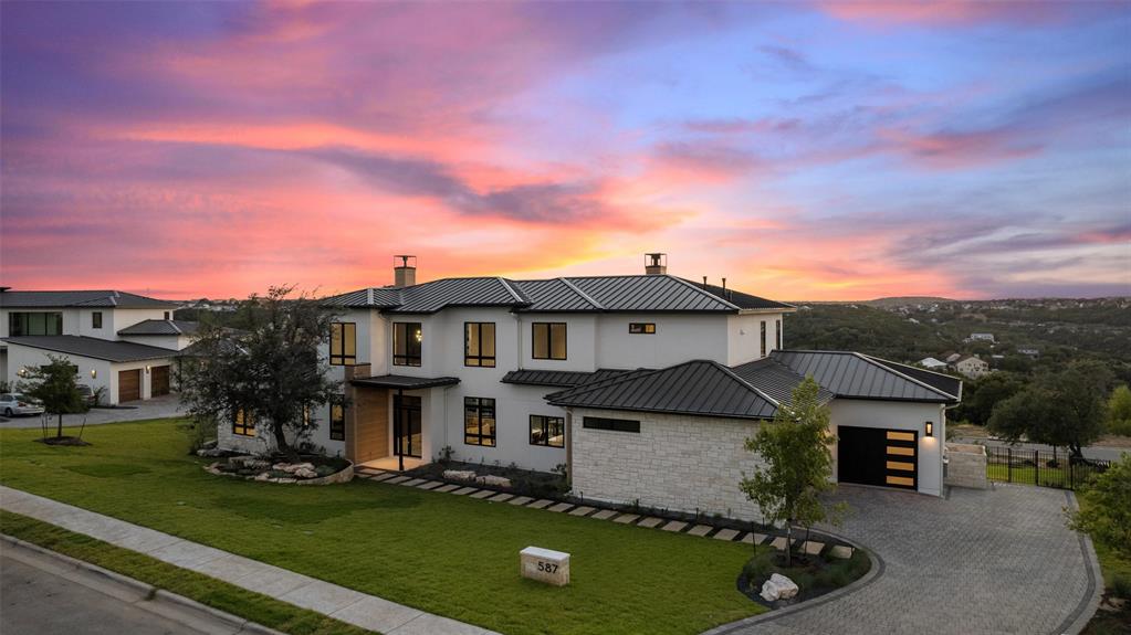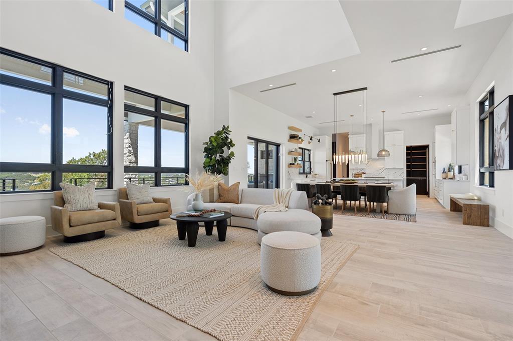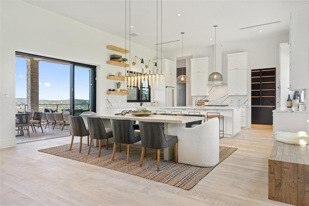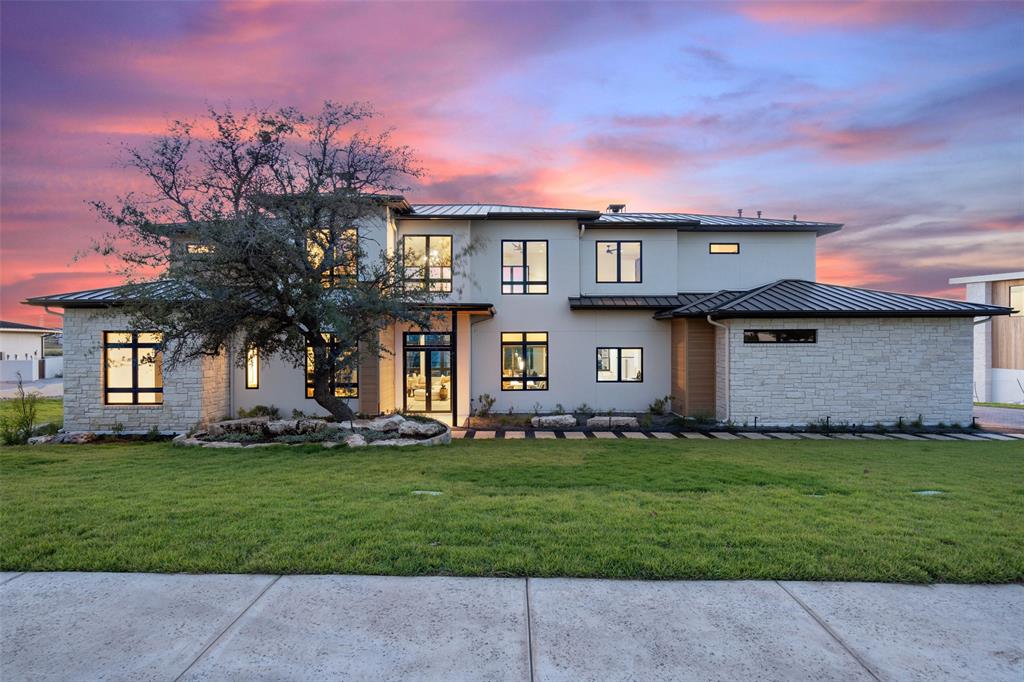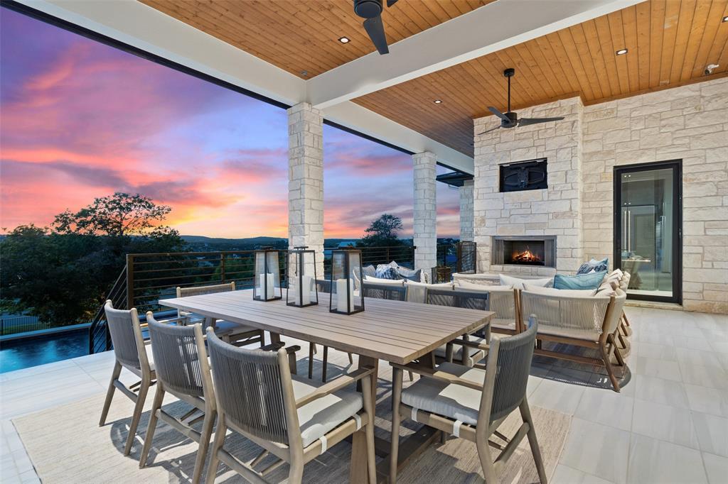 Introducing the epitome of luxury living located at the Peninsula, a prestigious gated community of Rough Hollow. This stunning residence offers a lifestyle of pure sophistication and elegance, with every detail meticulously crafted to provide an unparalleled level of comfort and style. The striking front entrance features modern glass front doors that allow natural light to pour into the home, while also creating a striking visual statement. As you enter the home, you are greeted by a living area with soaring high ceilings that create a sense of opulence and grandeur. The beautiful floating staircase with a metal monorail and wood steps add to the luxurious ambiance of the space, while the breathtaking 360 panoramic views of the hill country. The huge backyard includes a covered outdoor living area complete with a cozy fireplace. The pool and spa is an ideal place to cool off, while the grill area provides a space to cook up your favorite meals and enjoy them al fresco. Whether you're hosting a large gathering or simply enjoying a quiet evening at home, this backyard is the ultimate retreat. The kitchen is a chef’s dream boasting of quartz countertops and Amish built custom cabinetry with integrated refrigerator and upscale appliances. Adjacent modern scullery opens to outdoor living and includes refrigerator, dishwasher and sink. Luxurious master suite with beautiful hill country views and master bath spa-like oasis features, 2 vanities, free standing jetted tub, steam room shower and enormous closet. Main floor includes 3 bedrooms, 2.5 baths, one of the bedrooms can be a study. Second story boasts of a huge game room perfect for entertaining w/3 bedrooms and an amazing covered balcony with breathtaking 360 panoramic hill country views w/metal spiral staircase leading to the pool area. This home's exterior and interior features create an inviting and stylish atmosphere, ideal for enjoying the surrounding natural beauty.