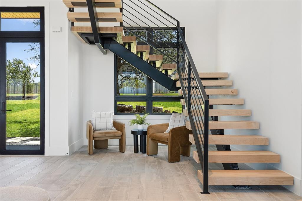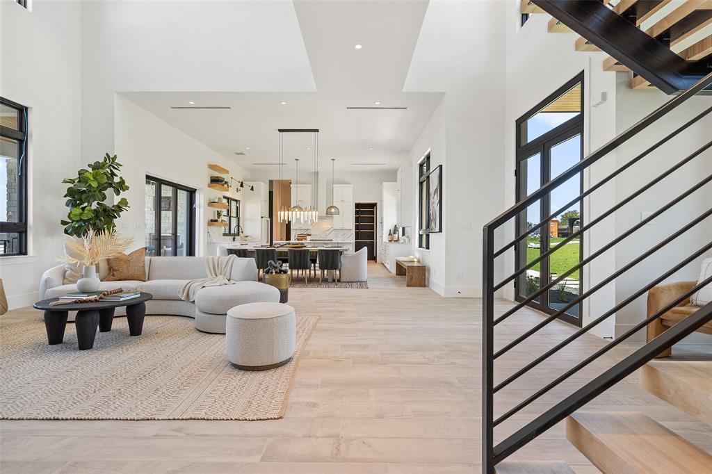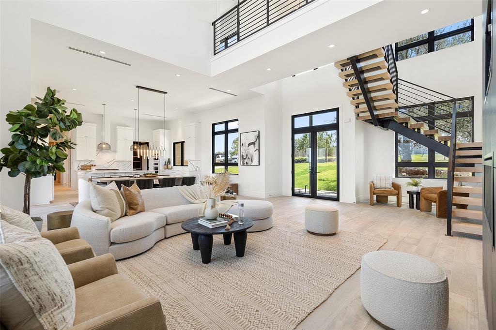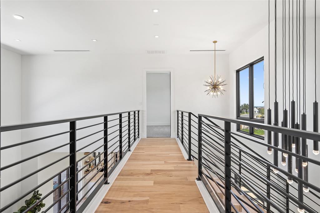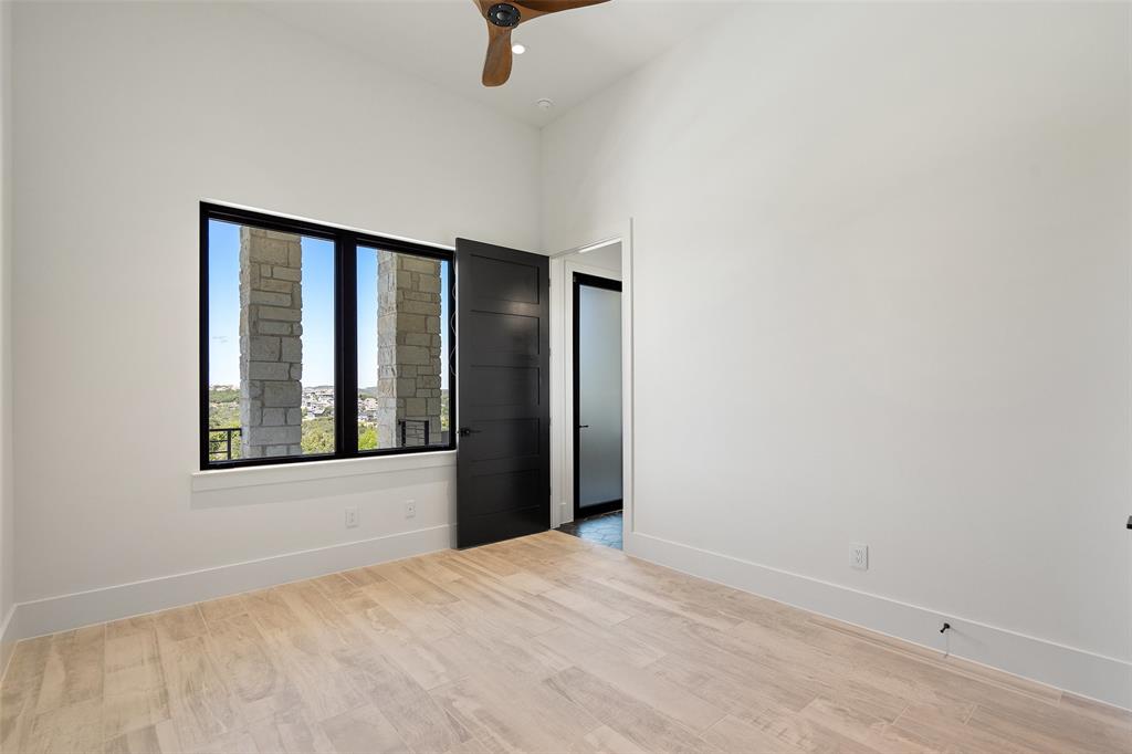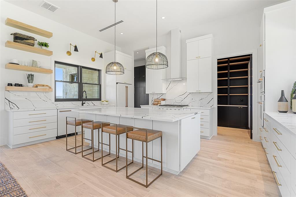 Introducing the epitome of luxury living located at the Peninsula, a prestigious gated community of Rough Hollow. This stunning residence offers a lifestyle of pure sophistication and elegance, with every detail meticulously crafted to provide an unparalleled level of comfort and style. The striking front entrance features modern glass front doors that allow natural light to pour into the home, while also creating a striking visual statement. As you enter the home, you are greeted by a living area with soaring high ceilings that create a sense of opulence and grandeur. The beautiful floating staircase with a metal monorail and wood steps add to the luxurious ambiance of the space, while the breathtaking 360 panoramic views of the hill country. The huge backyard includes a covered outdoor living area complete with a cozy fireplace. The pool and spa is an ideal place to cool off, while the grill area provides a space to cook up your favorite meals and enjoy them al fresco. Whether you're hosting a large gathering or simply enjoying a quiet evening at home, this backyard is the ultimate retreat. The kitchen is a chef’s dream boasting of quartz countertops and Amish built custom cabinetry with integrated refrigerator and upscale appliances. Adjacent modern scullery opens to outdoor living and includes refrigerator, dishwasher and sink. Luxurious master suite with beautiful hill country views and master bath spa-like oasis features, 2 vanities, free standing jetted tub, steam room shower and enormous closet. Main floor includes 3 bedrooms, 2.5 baths, one of the bedrooms can be a study. Second story boasts of a huge game room perfect for entertaining w/3 bedrooms and an amazing covered balcony with breathtaking 360 panoramic hill country views w/metal spiral staircase leading to the pool area. This home's exterior and interior features create an inviting and stylish atmosphere, ideal for enjoying the surrounding natural beauty.