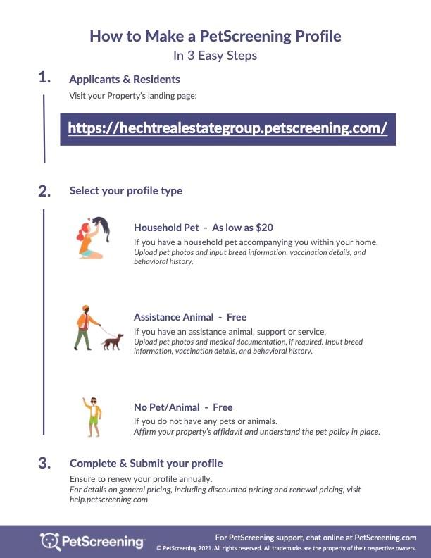 **PETSCREENING IS A REQUIRED PART OF THE APPLICATION PROCESS FOR ALL APPLICANTS: A welcoming environment is paramount to all of our residents with or without pets as well as animals. To help ensure ALL of our residents understand our pet and animal-related policies, we use a third-party screening service and require EVERYONE to complete a profile. This process ensures we have formalized pet and animal-related policy acknowledgments and more accurate records to create greater mutual accountability. If you need accommodation in another way, please contact your housing provider. Please get started by selecting a profile category on our landing page: https://hechtrealestategroup.petscreening.com/