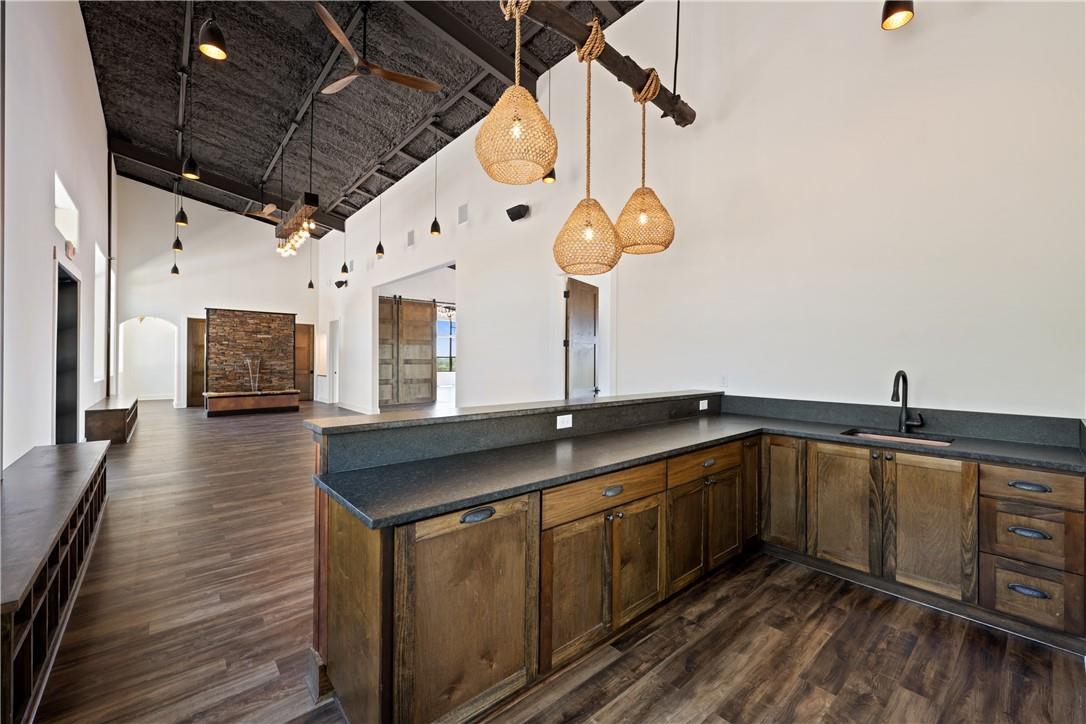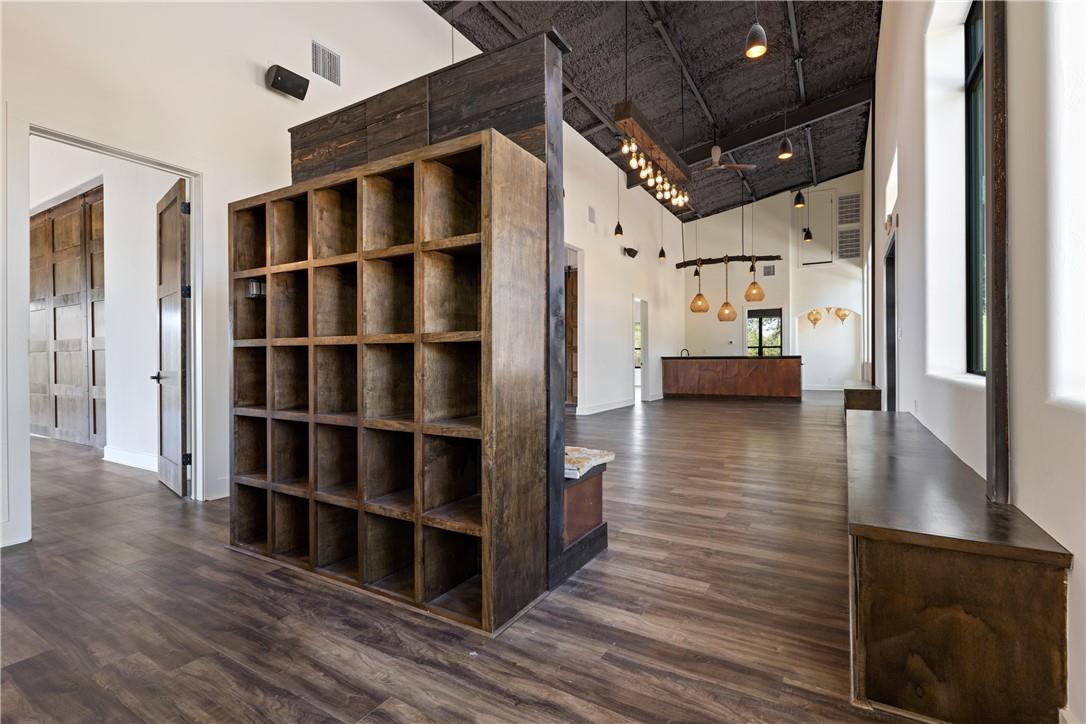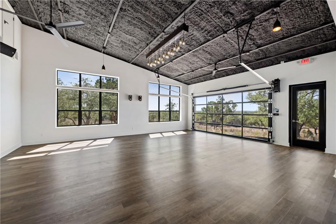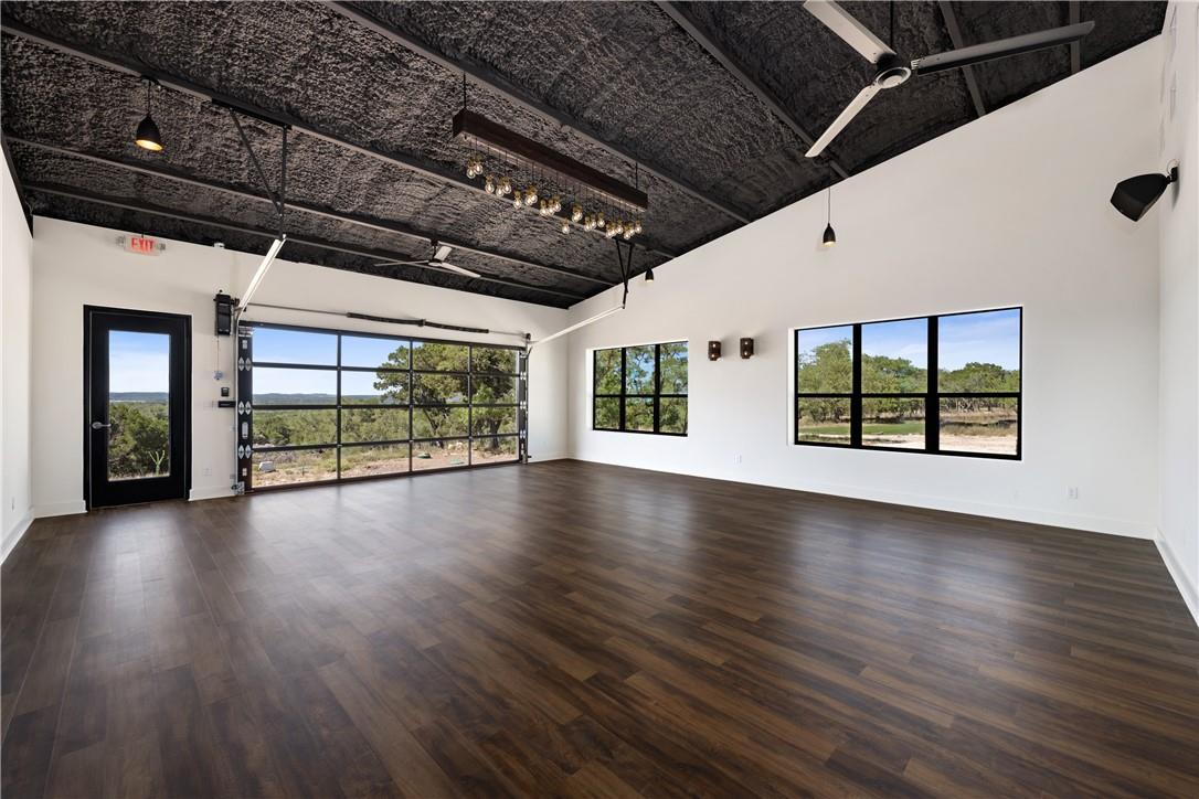 This desirable location with heavy traffic and panoramic long-distant sunset views is perfect for your business. An unrestricted 10 acres with over 400 ft of frontage on Fitzhugh across from Jester King Brewery, near Distillers and outdoor eateries. Currently used for events and yoga studio, this property offers numerous opportunities such as a wedding venue, tasting room, spa retreat center- the possibilities are endless. Two steel buildings, with stucco facades nestled between trees feature amazing views out the back seen through ample windows and glass motorized doors that brings the Hill Country inside. The larger building is 4,000 sq ft and features 3 separate rooms, with a lobby, 3 full restrooms, 2 showers, a prep kitchen with gas range, washer/dryer combo, sink and refrigerator. All countertops are black leathered granite and showers have black basalt tiles 8’ up the walls. There is a 4-zone audio system with Bluetooth and mic panels in each of the three rooms and all rooms are separated by large double barn doors including from the central room to the lobby allowing for the whole place to be opened or separated into any combination. The second building is 2,000 sq ft and has just one large open space with a front counter, 2 bathrooms and a storage room. There is a large artificial turf installation of 2,400 sq ft directly behind the smaller building. A 30,000-gallon rainwater tank connects both buildings with a possible 140,000 gallons that can be caught per year from the average rainfall in the area.