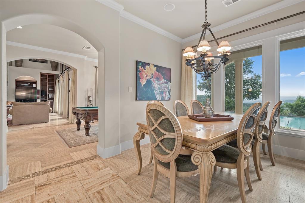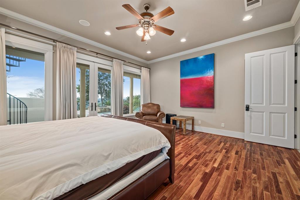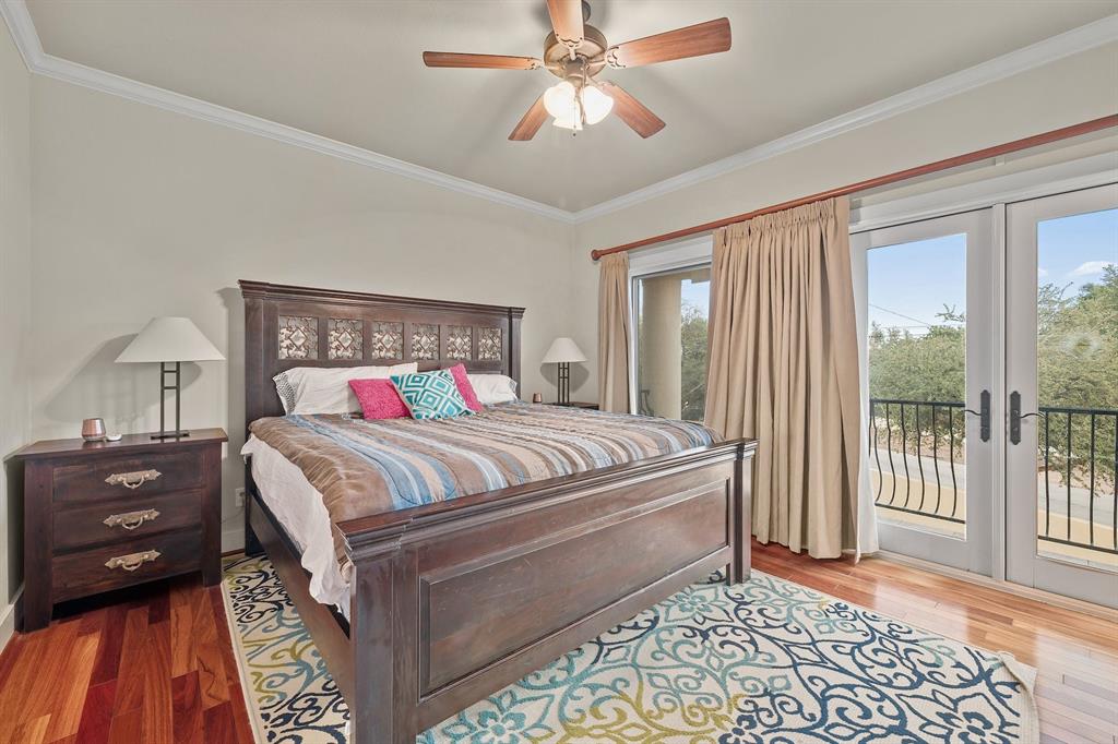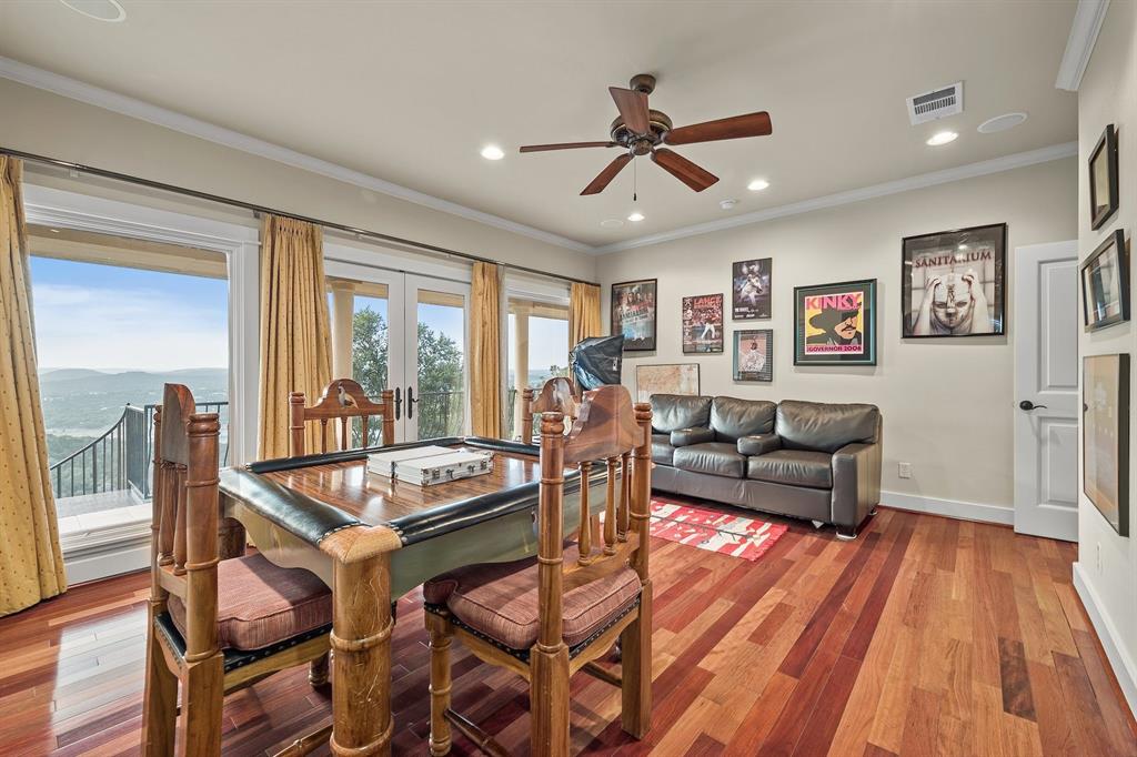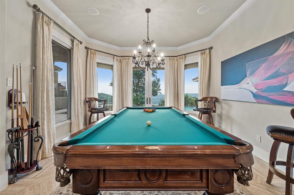 If you’ve ever dreamed of having your own private oasis, don’t let this opportunity pass you by! Enjoy your own private view of Lake Travis as you sit poolside or with friends and family waiting to enjoy dinner in the cabana. The oversized lot boasts .64 acres with a private orchard. Inside, fully embrace your smart home while savoring the Brazilian Cherrywood, Red Oak, Brazilian Purpleheart wood flooring throughout the house. As you walk past your formal dining room, enjoying the spacious kitchen with Buff Peach granite countertops, veggie prep sink, wine glass cabinet, ample cabinet space in addition to a walk in pantry. Walk through your living room, briefly passing the pool table and Butler’s Nook while thinking of the next bottle of wine you’ll open from the personal wine closet. Spy on the next book you’ll read from your built in bookshelves as you make your way past your custom home office and a full bathroom on your way to your master suite with a gorgeous view of your pool and backyard. Enjoy the oversized jacuzzi bathtub or walk in shower. Make your way into your walk-in closet with built in dresser and cedar chest. Find your way upstairs on to 3 full bedrooms, 2 full bathrooms (Jack and Jill bath between two of the bedrooms), game room and media room. Recessed lights and Dolby surround sound will provide plenty of entertainment for friends with the built in cabinets, wine bar and sink. Step outside through the French doors and take in the fresh air overlooking your retreat. TOP OF THE WORLD VIEW! Majestic and private custom home on a corner lot with panoramic views of Lake Travis, 2500 sq. ft. of outdoor patio with inground negative edge pool/hot tub with a covered cabana with a woodburning fireplace. This home has beautiful travertine and cherry, mahogany and maple hardwood floors throughout to keep allergy sufferers to a minimum. private office downstairs, wine storage downstairs Home was built by Canyon Creek Homes!