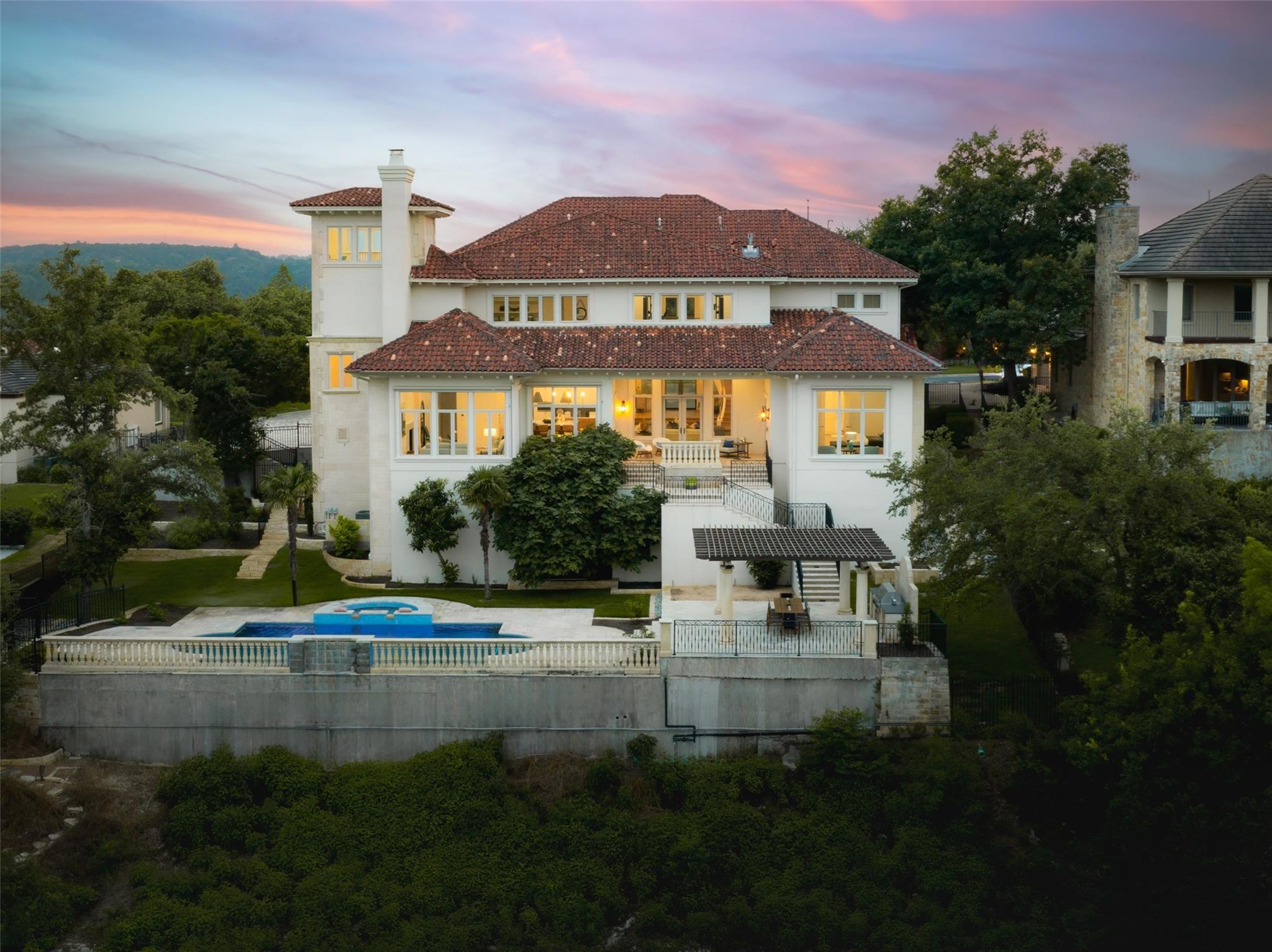 Welcome to The Diamond of Davenport, an exquisite blend of luxury and natural beauty in the Davenport Rim neighborhood of Westlake. This completely renovated estate features 5 spacious bedrooms, 4 full bathrooms, and 2 half bathrooms. The grand two-floor entry with a breathtaking curved stairway leads to a formal living area with a floor-to-ceiling Venetian plastered fireplace-- opening directly to the outdoor entertainment area. The private primary bedroom is a serene retreat with a cozy seating area and private patio entrance. Its luxurious bathroom boasts a grand garden tub, separate shower, dual vanities with exquisite finishes, and a spacious walk-in closet. The beautifully updated kitchen is a chef’s dream with stunning gold accents, built-in features, and professional Wolf appliances. It flows into a casual living space with a fireplace and panoramic views, perfect for everyday living and entertaining. Adjacent to the kitchen and living area is a dedicated wine room for showcasing your collection. A dedicated office area next to the primary suite provides a quiet workspace, while a large flex-space currently used as a gym offers versatility for a game room or additional office. An upper-level game room with a wet bar and stairs to a bonus room on the third floor adds to the home's entertainment options. The outdoor space is designed for relaxation and entertainment, featuring a heated pool, spa, multiple levels of patios, and hill country views. Beautiful natural light floods the home through every window, highlighting high ceilings and expansive vistas. The third level offers a study nook, also perfect for yoga/meditation, with unobstructed views of the hill country-- providing tranquility and inspiration. The Diamond of Davenport offers a lifestyle of unparalleled luxury, breathtaking views, and sophisticated living.