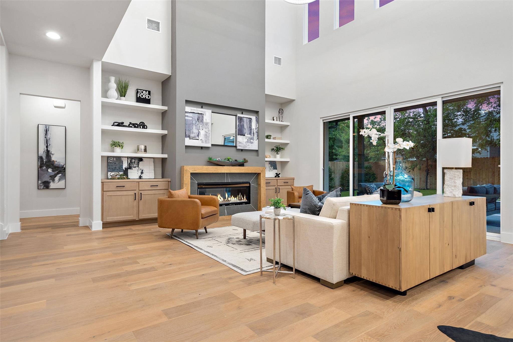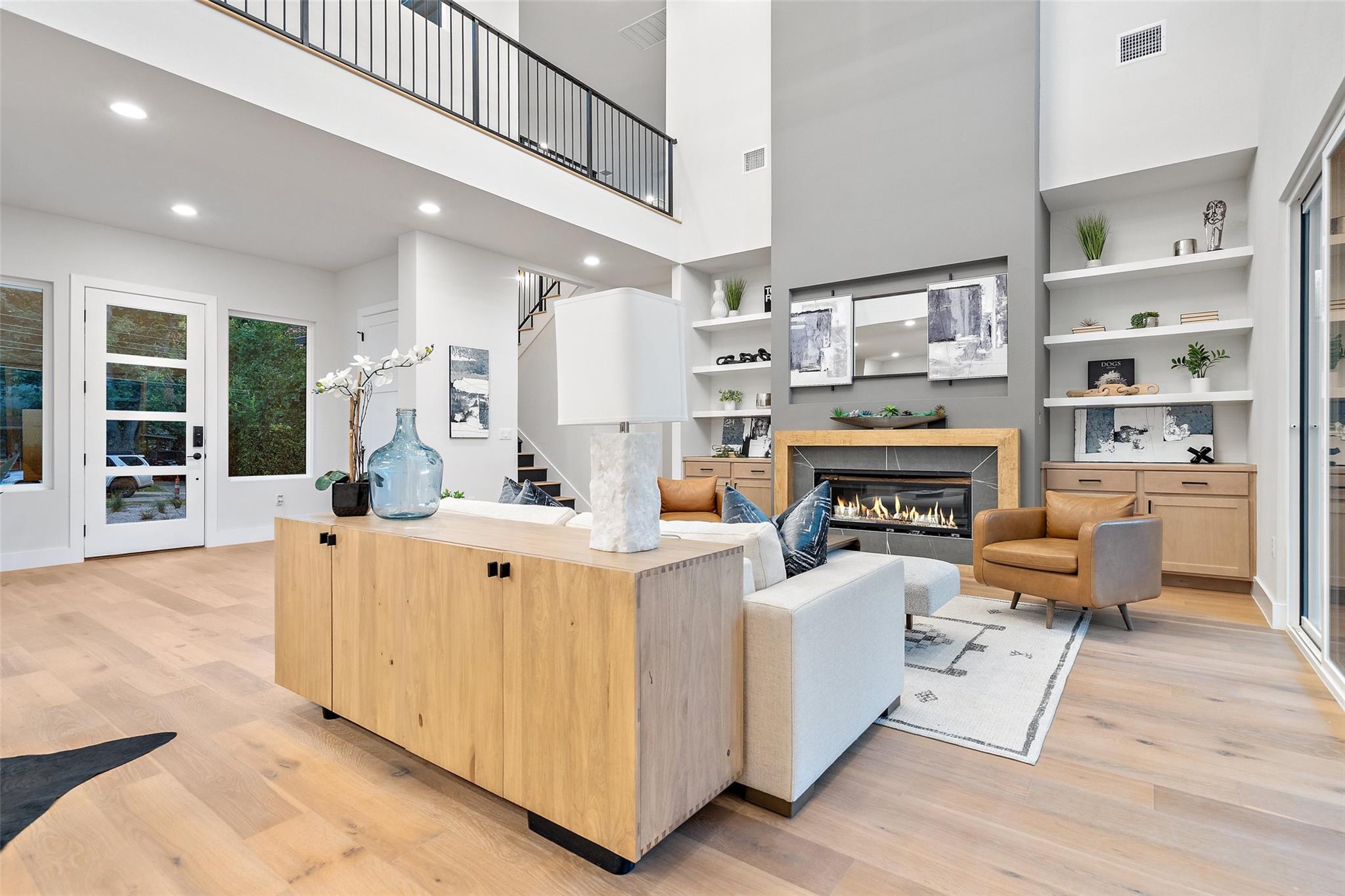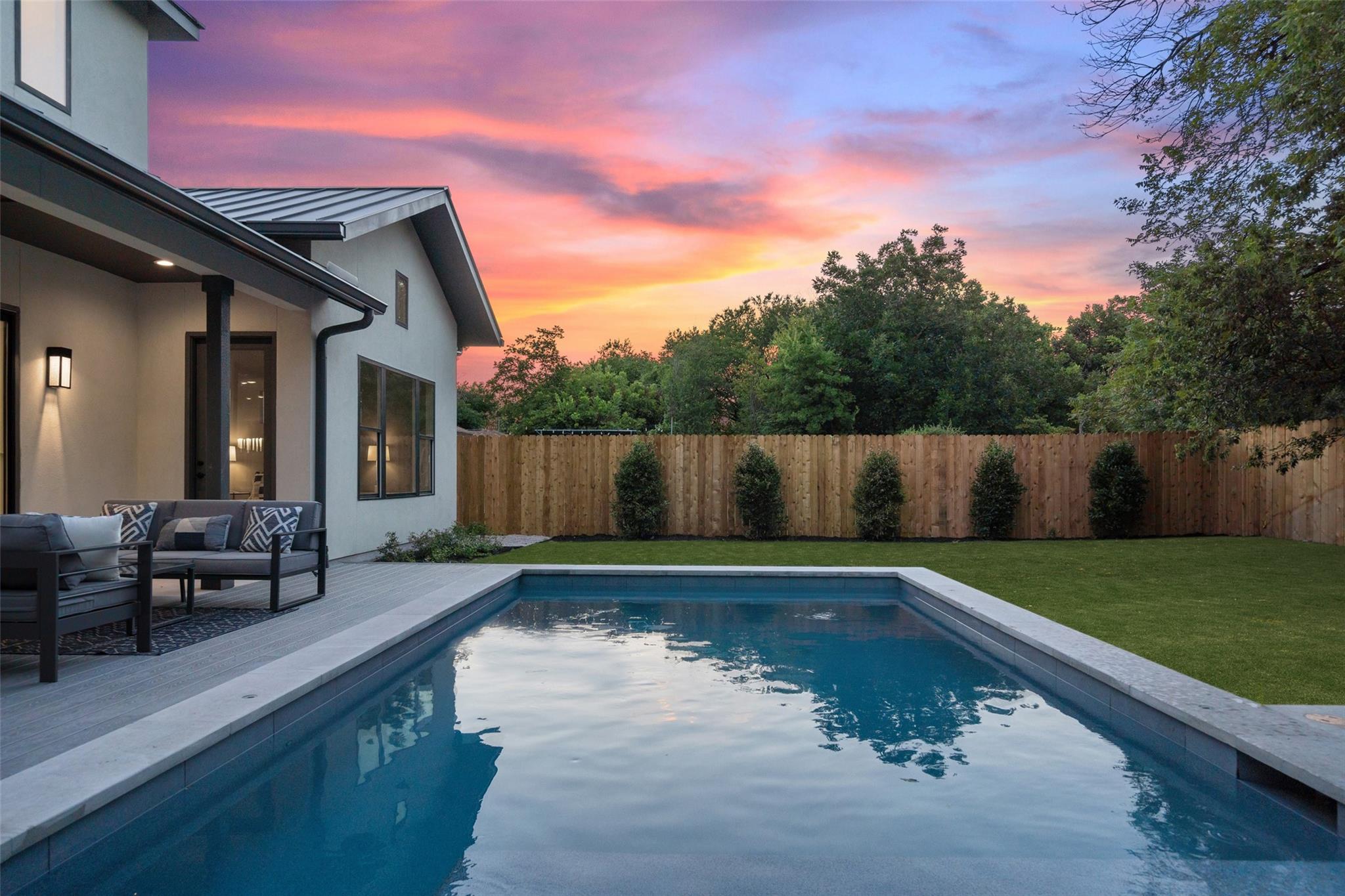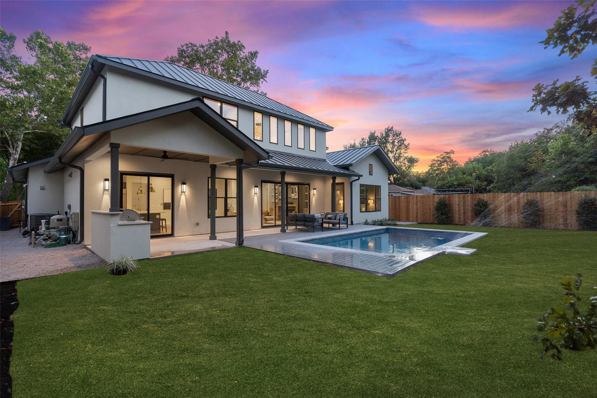 Welcome to 1304 Alguno in the 78757 Neighborhood. Gorgeous Custom Build featuring Primary on MAIN in one of Austin's hottest neighborhoods. This Modern pool Home By Rivendale Homes is 3,246 SqFt - The home features the primary and a secondary bedrooms down, with 2 bedrooms and a flex space up. This 2-story home features an open floor plan with tall ceilings, loads of windows allowing for abundant natural light, and thoughtful finishes throughout. The Primary Owner's suite redefines the spa experience with upgraded tile, soaking tub and oversized walk-in shower, situated on the main floor that leads out to the covered backyard patio, Pool + BBQ Station. The kitchen, dining, and open living room w/ fireplace overlook the pool & the rear yard space through the dramatic sliding glass doors. The kitchen space includes a generous island with plenty of bar seating with an island sink, across is the gas cooktop. The spacious upstairs includes two bedrooms,Plus a large open flex area, game room/playroom or media room awaits . This large additional living area is hard to find in this well-established neighborhood.