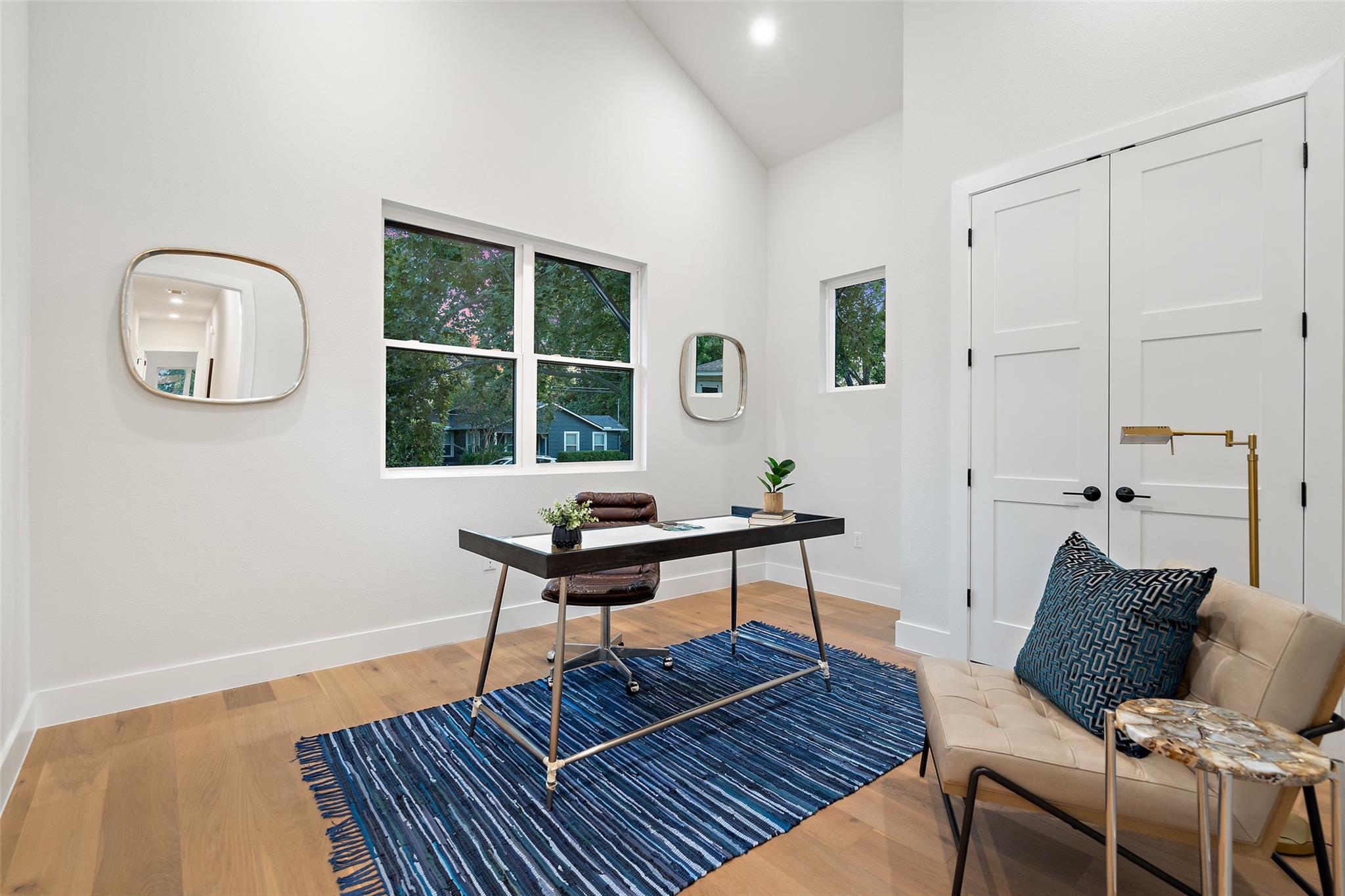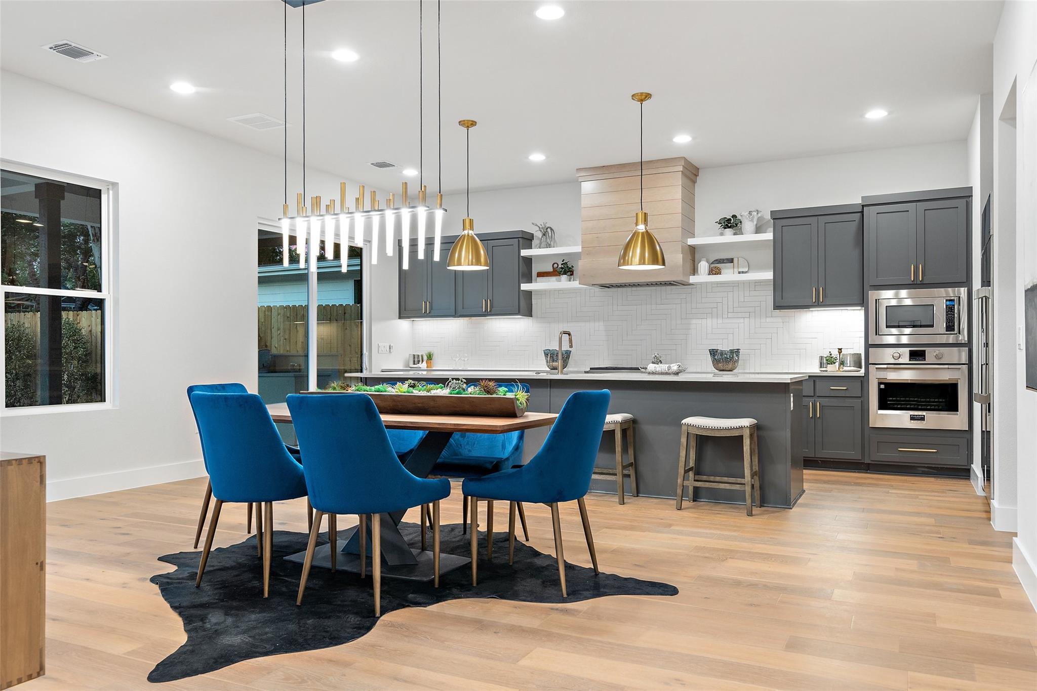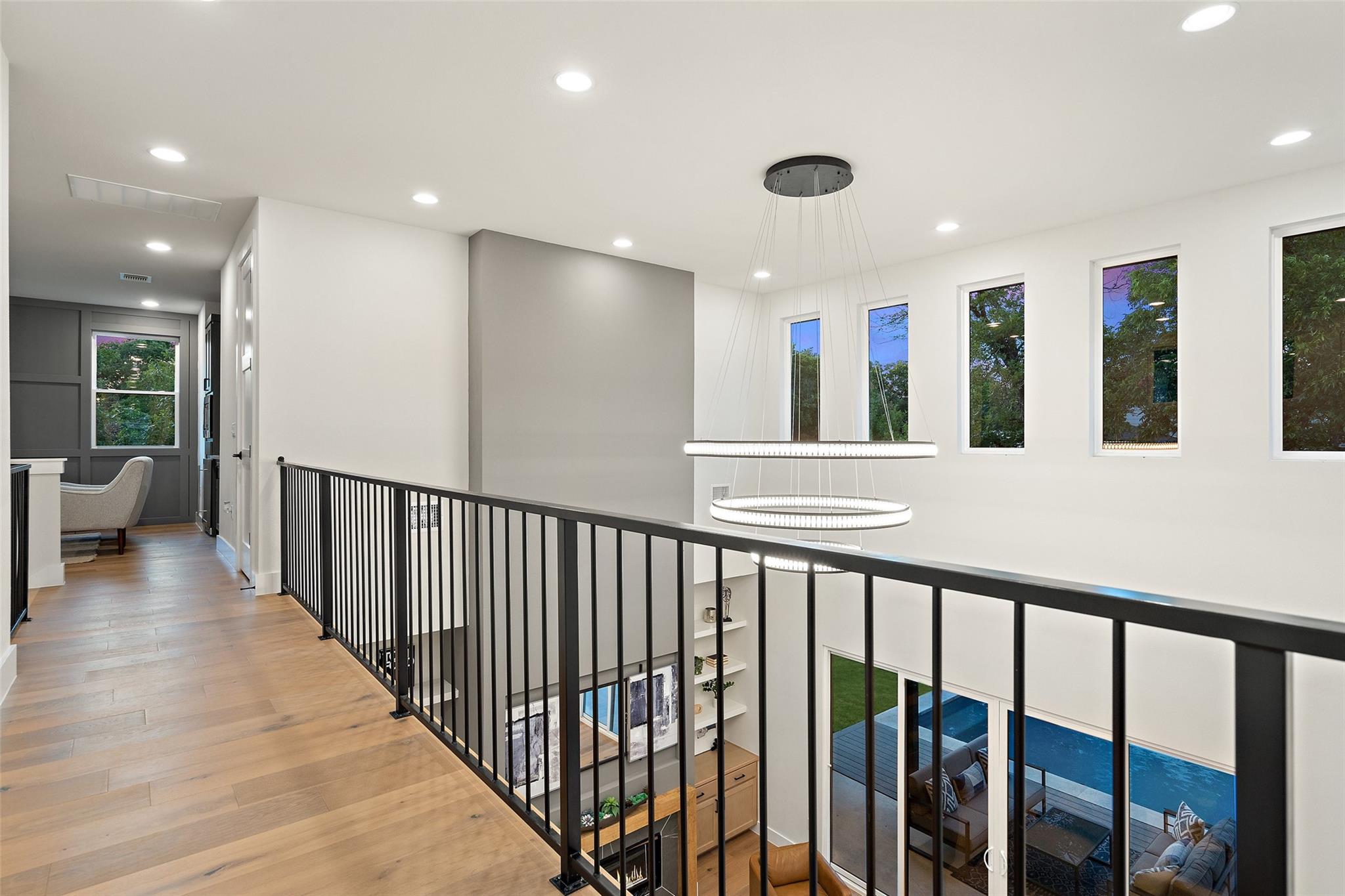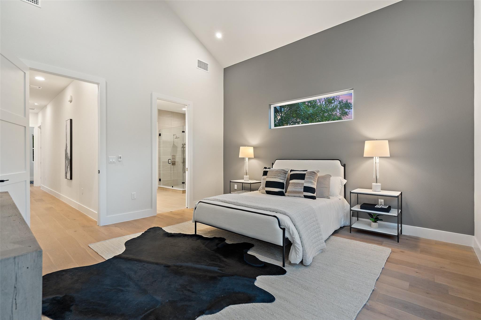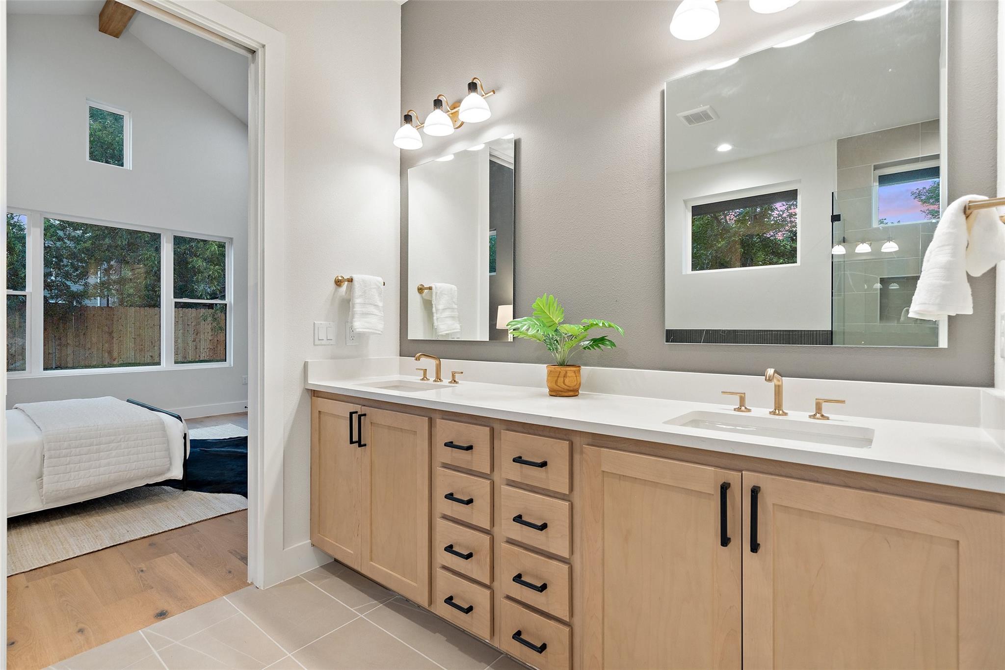 Welcome to 1304 Alguno in the 78757 Neighborhood. Gorgeous Custom Build featuring Primary on MAIN in one of Austin's hottest neighborhoods. This Modern pool Home By Rivendale Homes is 3,246 SqFt - The home features the primary and a secondary bedrooms down, with 2 bedrooms and a flex space up. This 2-story home features an open floor plan with tall ceilings, loads of windows allowing for abundant natural light, and thoughtful finishes throughout. The Primary Owner's suite redefines the spa experience with upgraded tile, soaking tub and oversized walk-in shower, situated on the main floor that leads out to the covered backyard patio, Pool + BBQ Station. The kitchen, dining, and open living room w/ fireplace overlook the pool & the rear yard space through the dramatic sliding glass doors. The kitchen space includes a generous island with plenty of bar seating with an island sink, across is the gas cooktop. The spacious upstairs includes two bedrooms,Plus a large open flex area, game room/playroom or media room awaits . This large additional living area is hard to find in this well-established neighborhood.