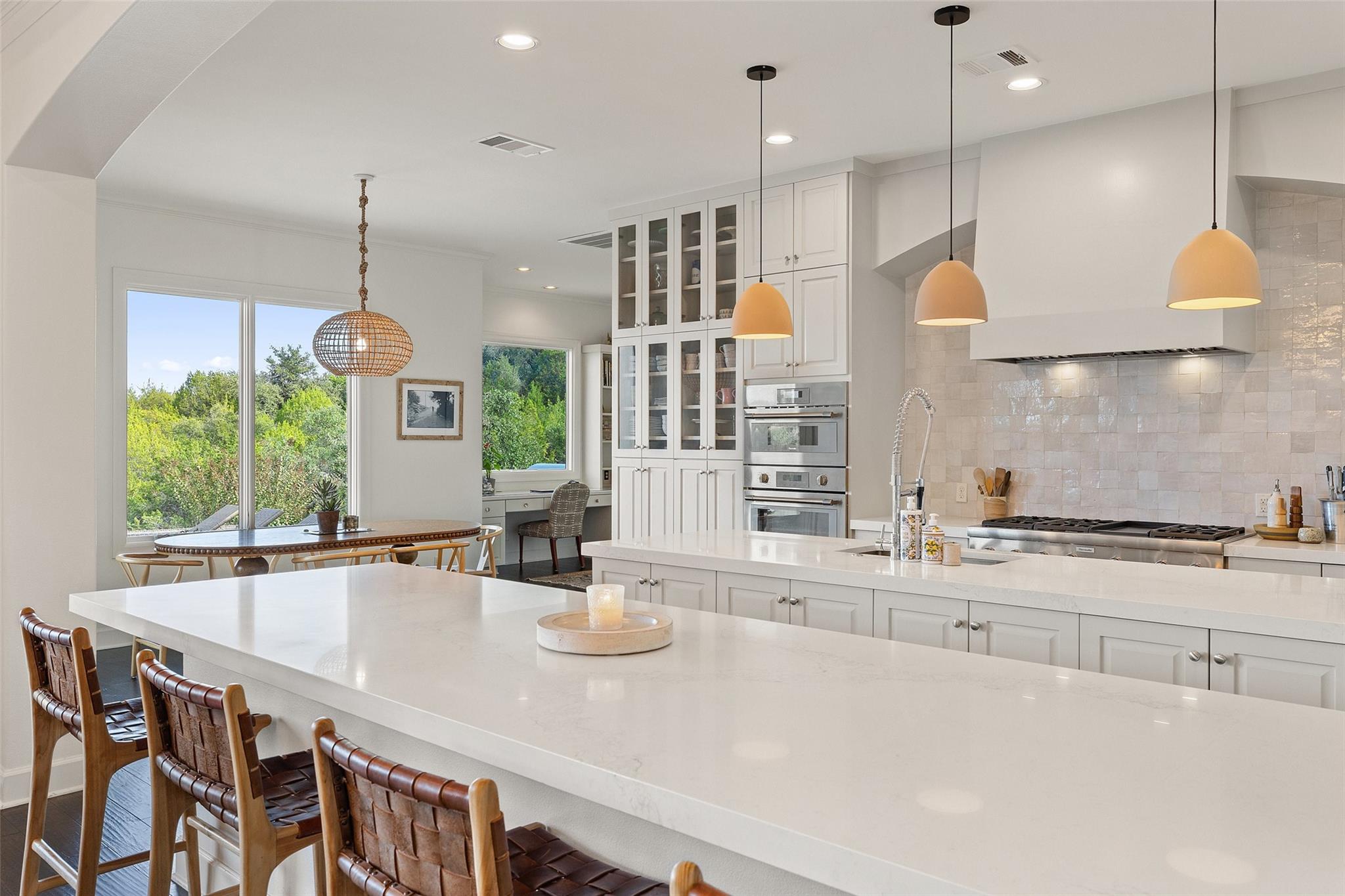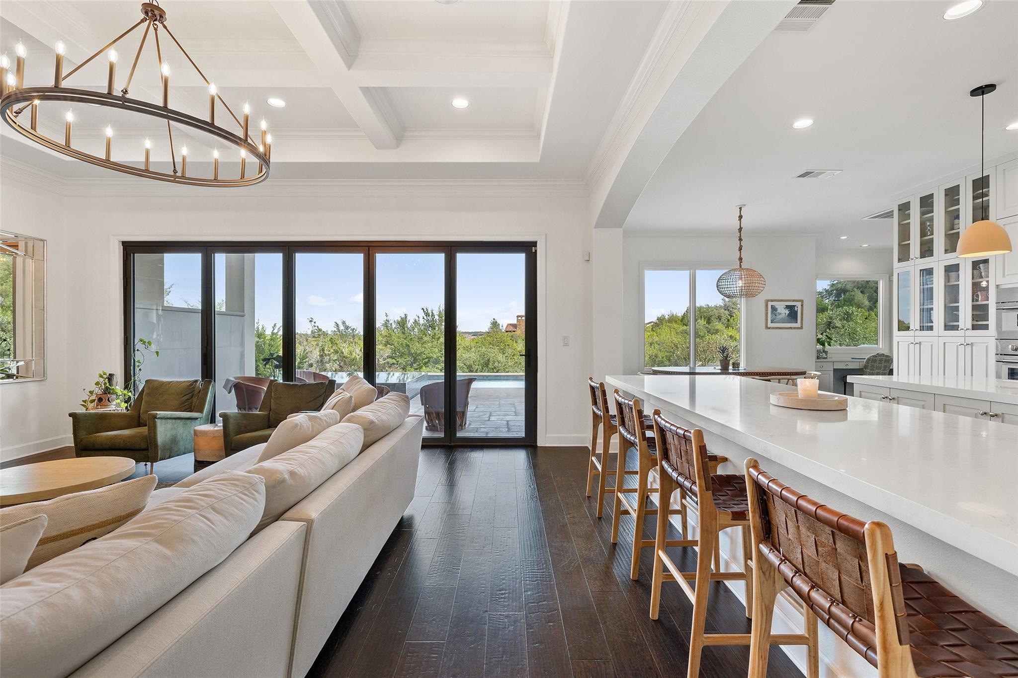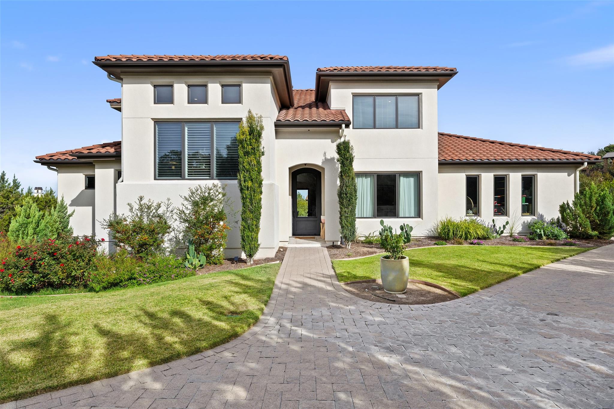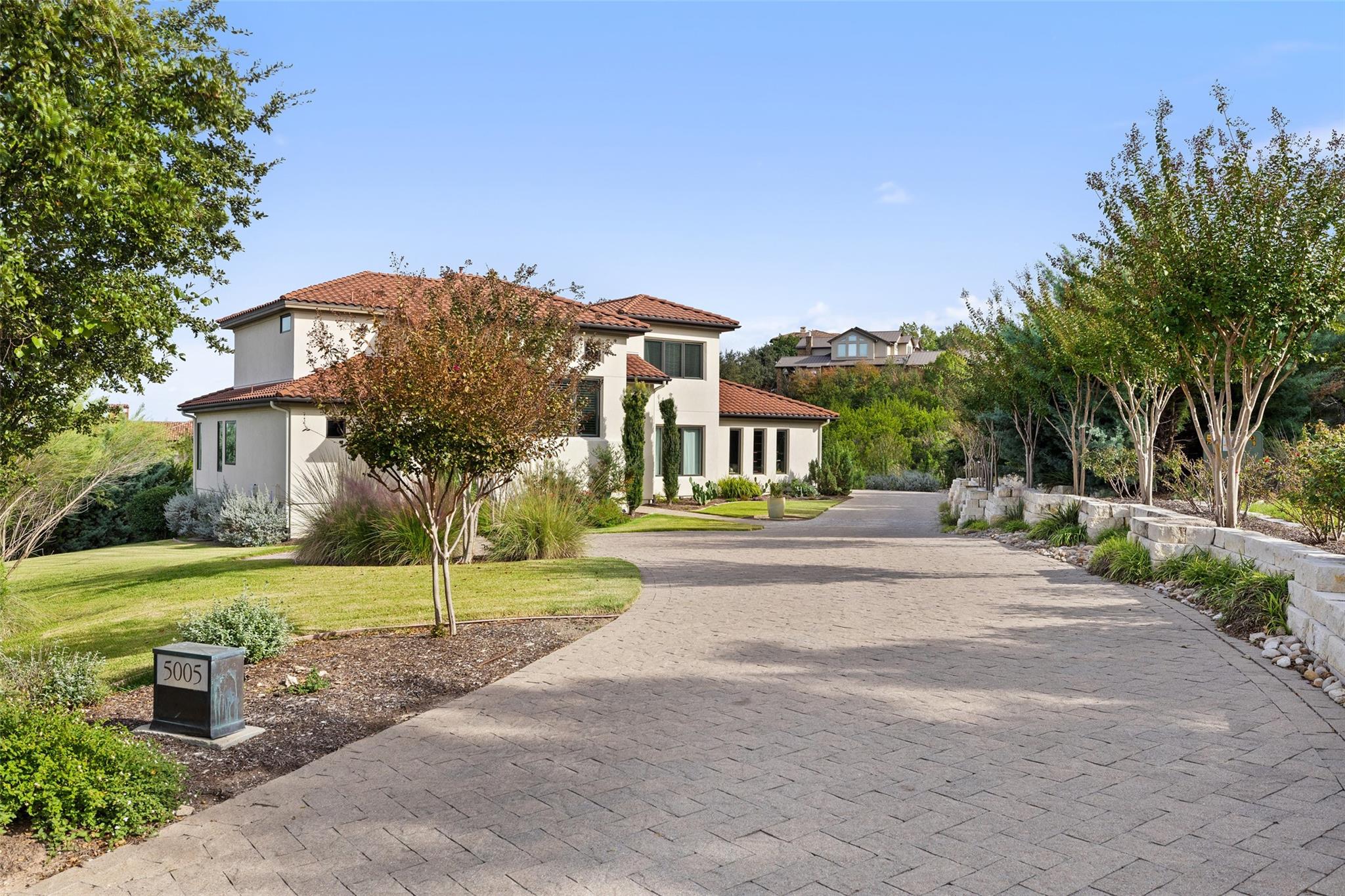 Enjoy Hill Country views and a secluded 1-acre property in coveted Spanish Oaks. Tucked away from the road down a private drive, this 4,200+sf, 4-bed/3.5-bath Santa Barbara-style home embodies an indoor-outdoor lifestyle. The sunlit, open-plan interior's transitional aesthetic offers a soft color palette and functional style such as custom built-ins, arched doorways, coffered ceilings, and crown molding. Bi-fold glass doors connect the interior to the gorgeous terrace featuring a swimming pool, spa, summer kitchen, and unobstructed greenbelt views. A chef's kitchen equips your everyday living and entertaining needs with two islands, a butler's pantry, and designer appliances. Two living rooms, a covered second-floor balcony, a formal home office, and two additional built-in study/homework nooks add to 5005 Spanish Oaks Blvd.'s efficient yet luxurious layout. Living in the heart of Spanish Oaks, you'll enjoy amenities galore, including Spanish Oaks Golf Club and the resort-style community pool. Close to 71 and Bee Caves, this convenient location is convenient for commuting to Downtown Austin or to Lake Travis.