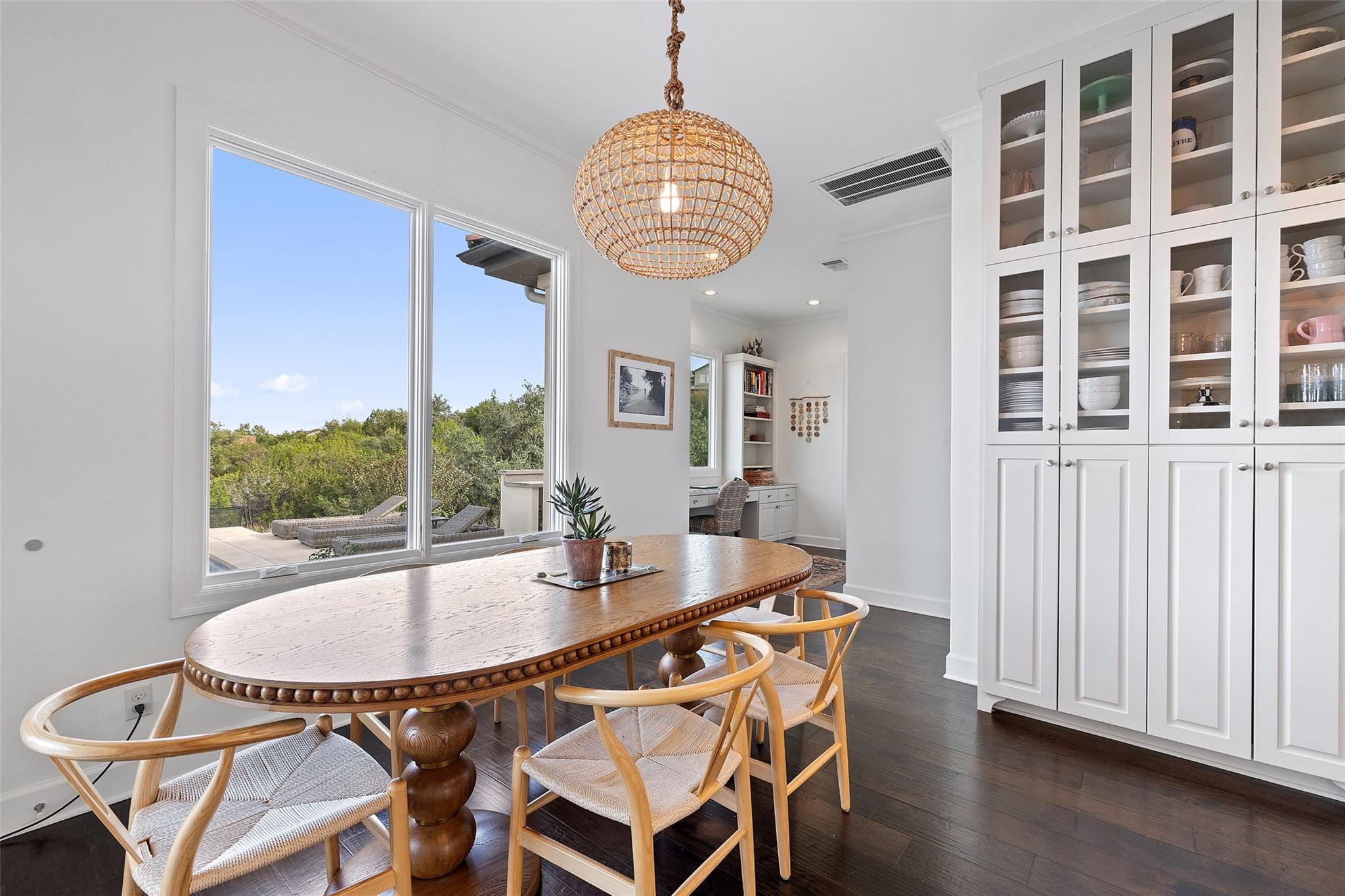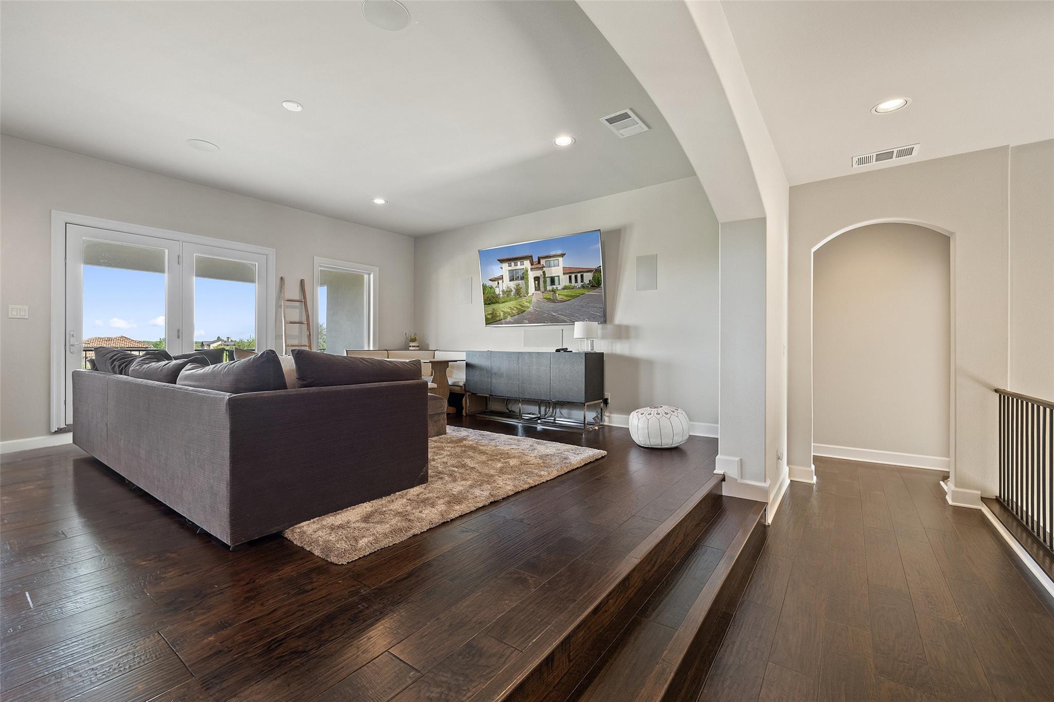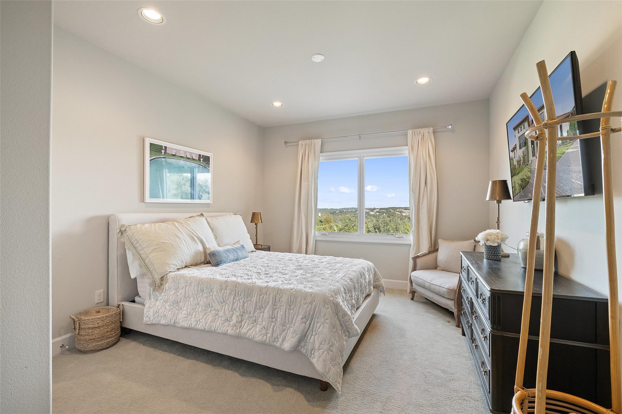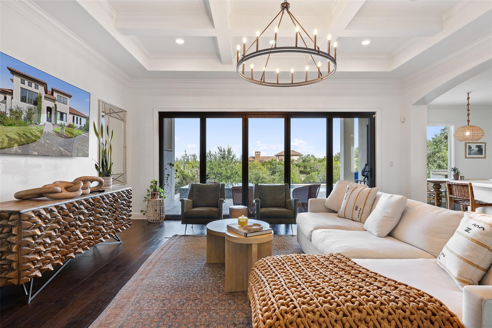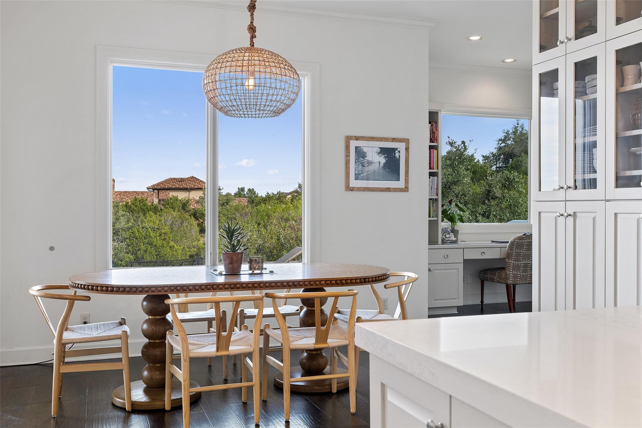 Enjoy Hill Country views and a secluded 1-acre property in coveted Spanish Oaks. Tucked away from the road down a private drive, this 4,200+sf, 4-bed/3.5-bath Santa Barbara-style home embodies an indoor-outdoor lifestyle. The sunlit, open-plan interior's transitional aesthetic offers a soft color palette and functional style such as custom built-ins, arched doorways, coffered ceilings, and crown molding. Bi-fold glass doors connect the interior to the gorgeous terrace featuring a swimming pool, spa, summer kitchen, and unobstructed greenbelt views. A chef's kitchen equips your everyday living and entertaining needs with two islands, a butler's pantry, and designer appliances. Two living rooms, a covered second-floor balcony, a formal home office, and two additional built-in study/homework nooks add to 5005 Spanish Oaks Blvd.'s efficient yet luxurious layout. Living in the heart of Spanish Oaks, you'll enjoy amenities galore, including Spanish Oaks Golf Club and the resort-style community pool. Close to 71 and Bee Caves, this convenient location is convenient for commuting to Downtown Austin or to Lake Travis.