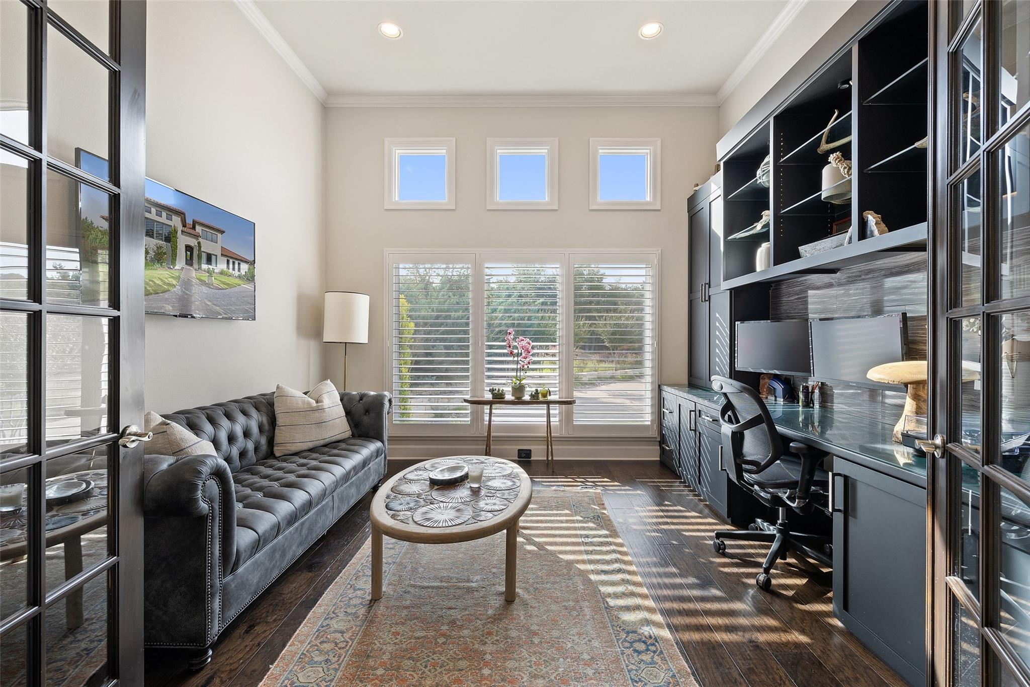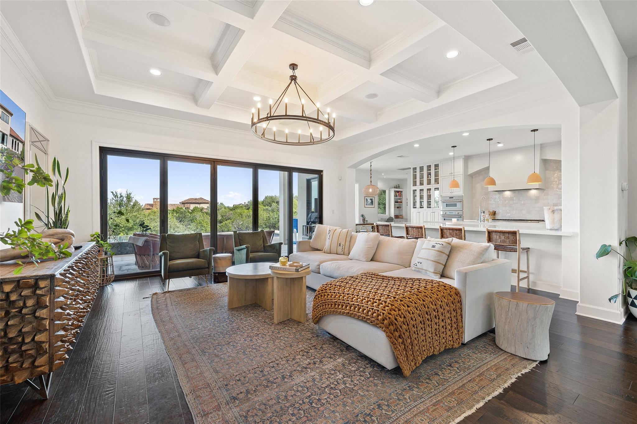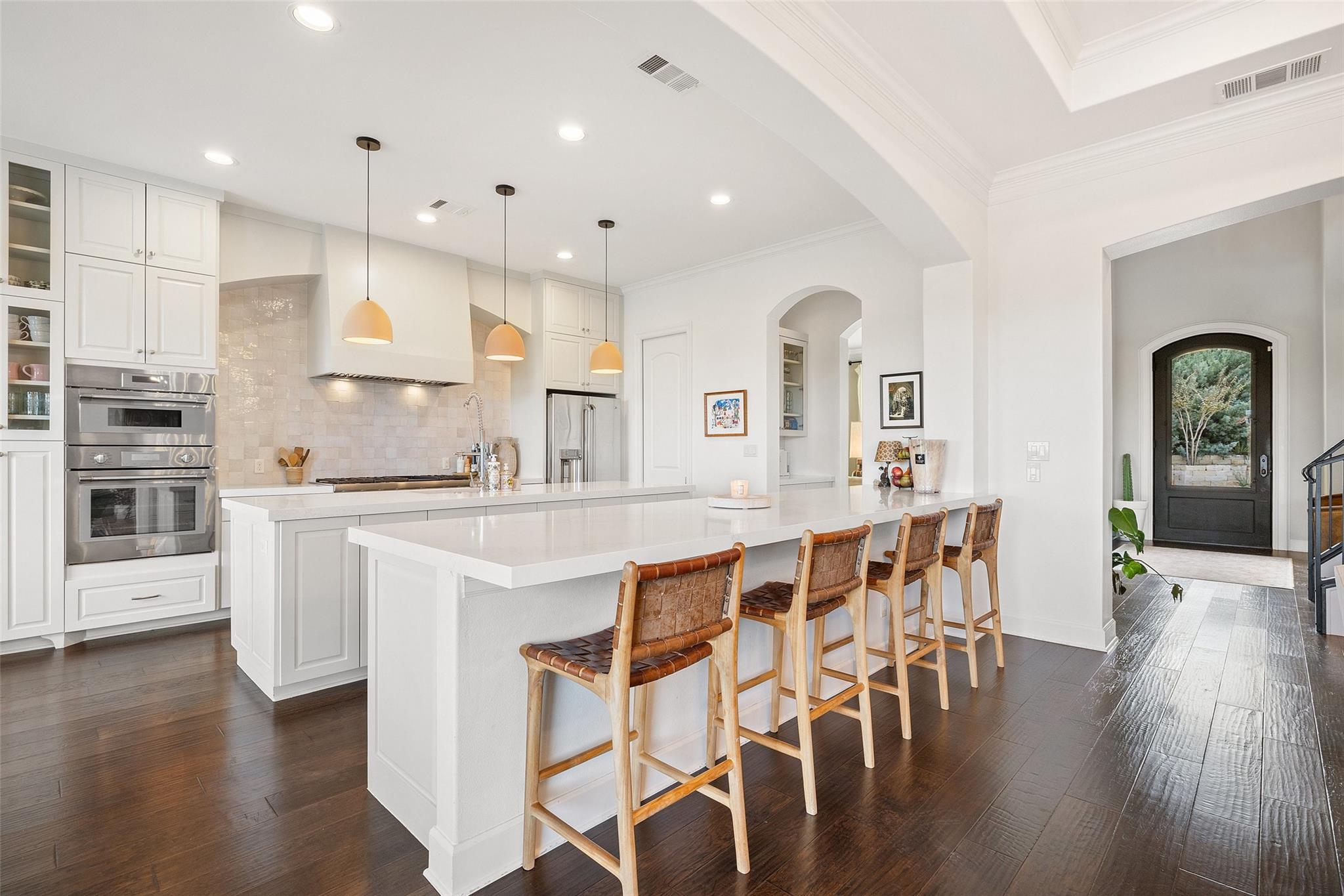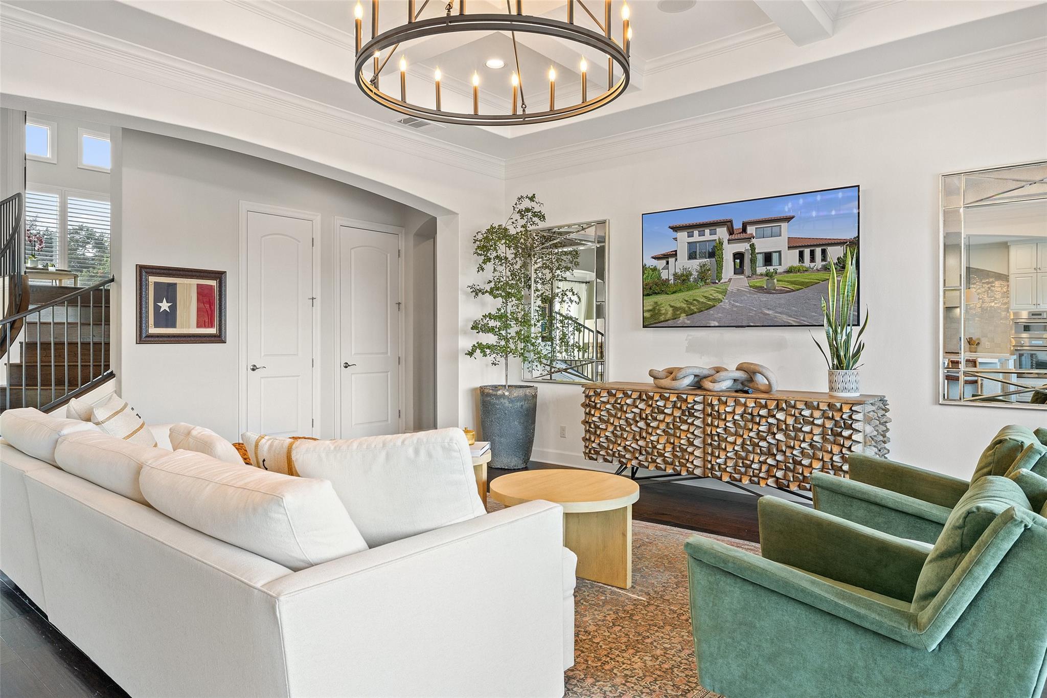 Enjoy Hill Country views and a secluded 1-acre property in coveted Spanish Oaks. Tucked away from the road down a private drive, this 4,200+sf, 4-bed/3.5-bath Santa Barbara-style home embodies an indoor-outdoor lifestyle. The sunlit, open-plan interior's transitional aesthetic offers a soft color palette and functional style such as custom built-ins, arched doorways, coffered ceilings, and crown molding. Bi-fold glass doors connect the interior to the gorgeous terrace featuring a swimming pool, spa, summer kitchen, and unobstructed greenbelt views. A chef's kitchen equips your everyday living and entertaining needs with two islands, a butler's pantry, and designer appliances. Two living rooms, a covered second-floor balcony, a formal home office, and two additional built-in study/homework nooks add to 5005 Spanish Oaks Blvd.'s efficient yet luxurious layout. Living in the heart of Spanish Oaks, you'll enjoy amenities galore, including Spanish Oaks Golf Club and the resort-style community pool. Close to 71 and Bee Caves, this convenient location is convenient for commuting to Downtown Austin or to Lake Travis.