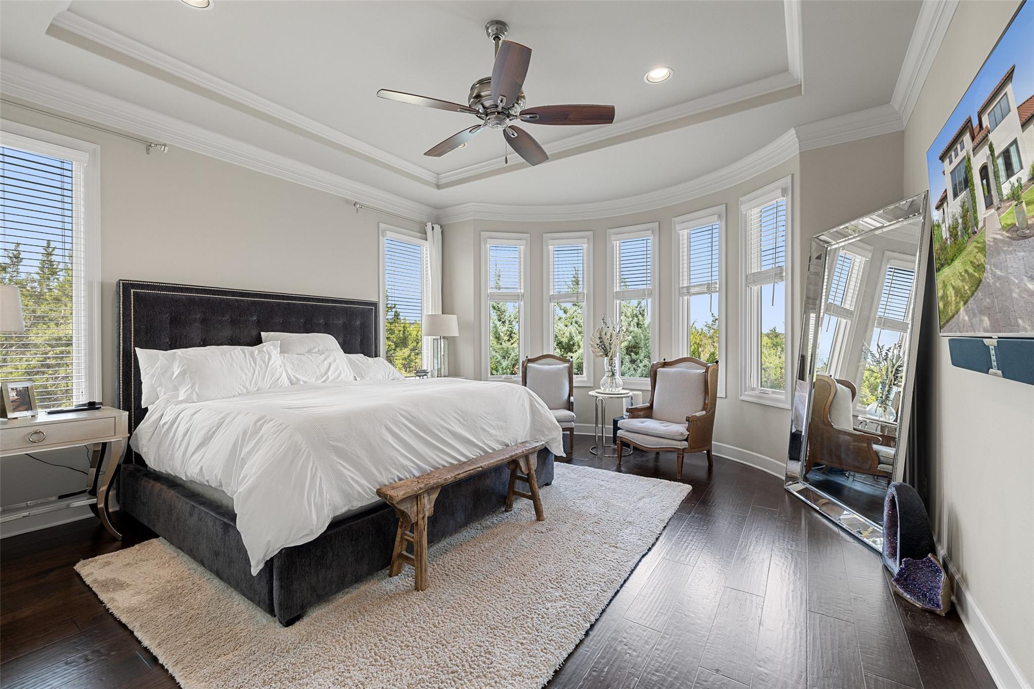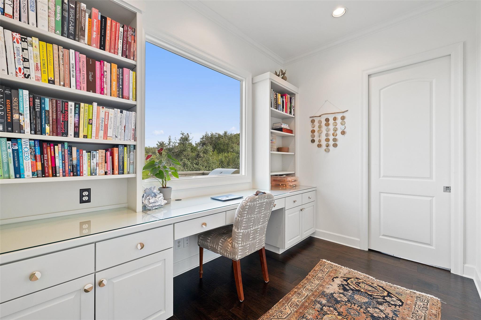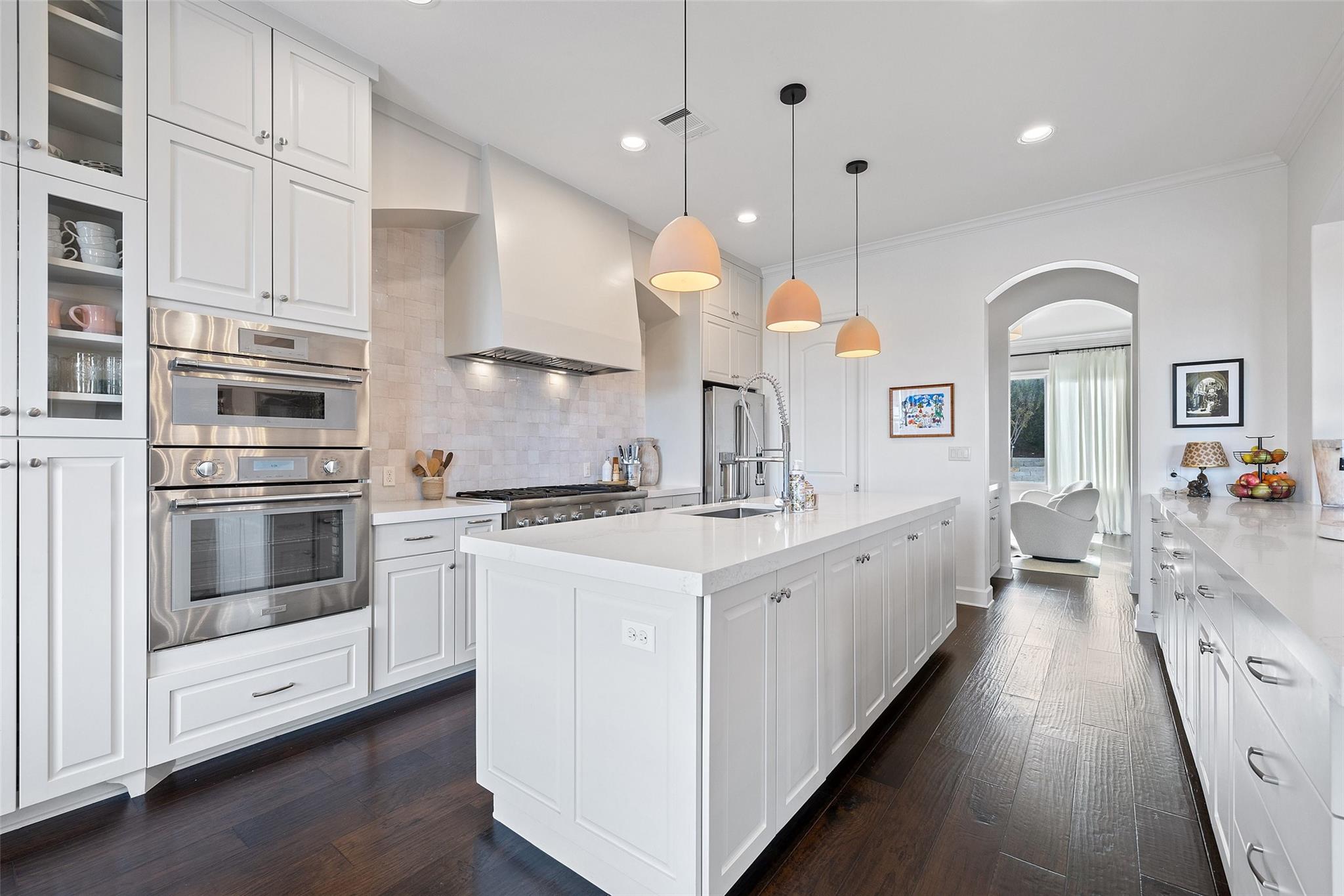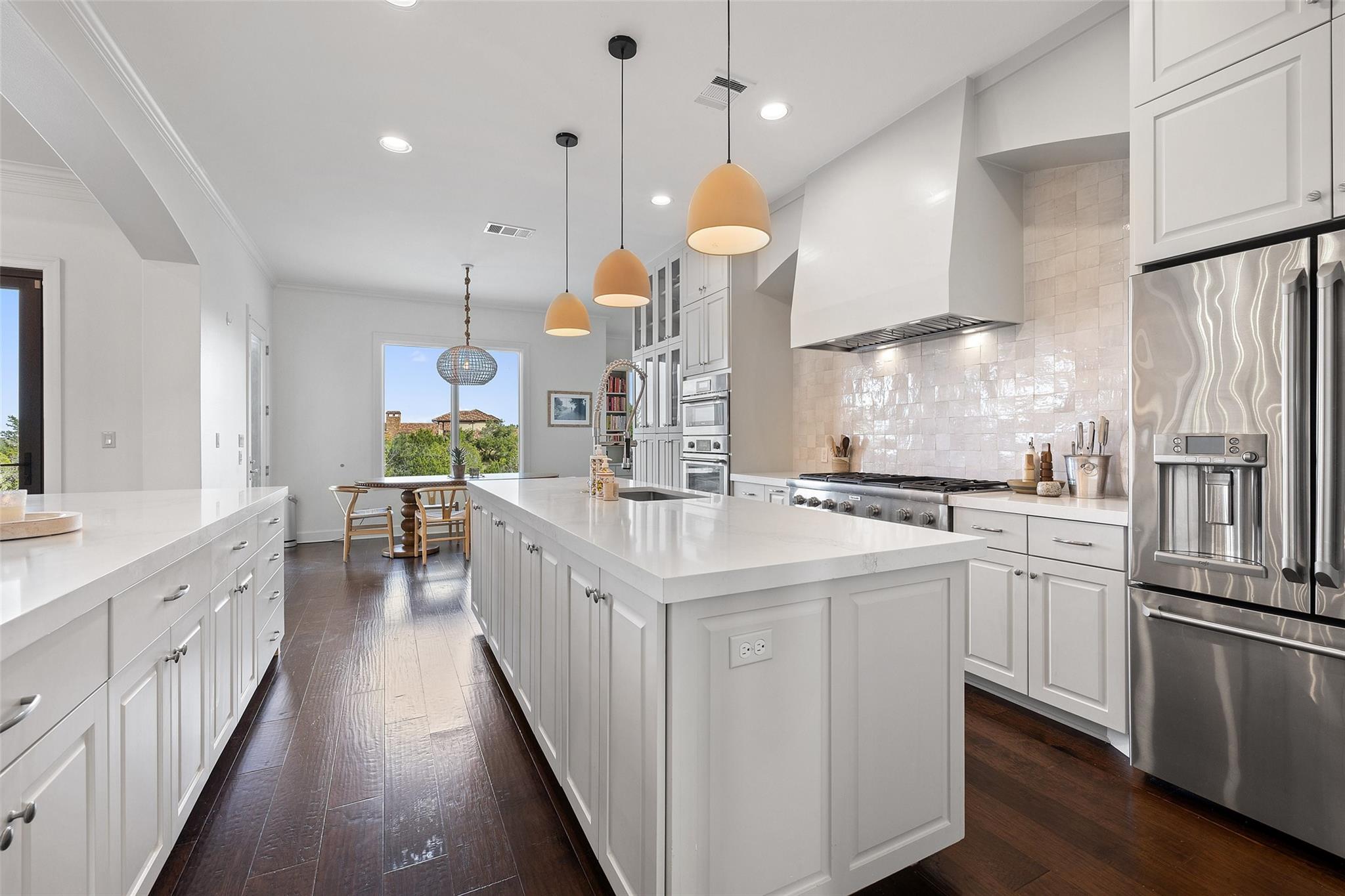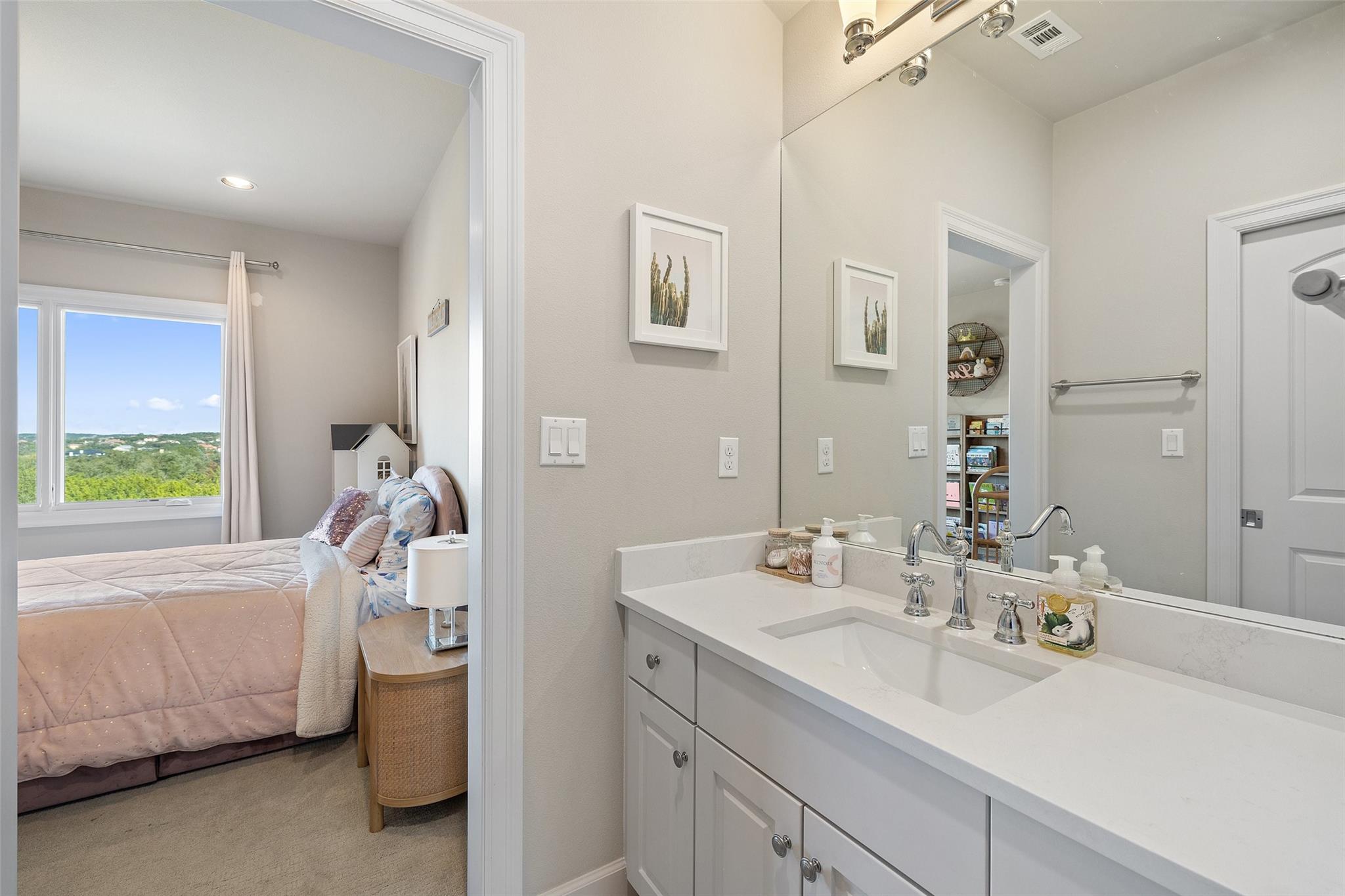 Enjoy Hill Country views and a secluded 1-acre property in coveted Spanish Oaks. Tucked away from the road down a private drive, this 4,200+sf, 4-bed/3.5-bath Santa Barbara-style home embodies an indoor-outdoor lifestyle. The sunlit, open-plan interior's transitional aesthetic offers a soft color palette and functional style such as custom built-ins, arched doorways, coffered ceilings, and crown molding. Bi-fold glass doors connect the interior to the gorgeous terrace featuring a swimming pool, spa, summer kitchen, and unobstructed greenbelt views. A chef's kitchen equips your everyday living and entertaining needs with two islands, a butler's pantry, and designer appliances. Two living rooms, a covered second-floor balcony, a formal home office, and two additional built-in study/homework nooks add to 5005 Spanish Oaks Blvd.'s efficient yet luxurious layout. Living in the heart of Spanish Oaks, you'll enjoy amenities galore, including Spanish Oaks Golf Club and the resort-style community pool. Close to 71 and Bee Caves, this convenient location is convenient for commuting to Downtown Austin or to Lake Travis.