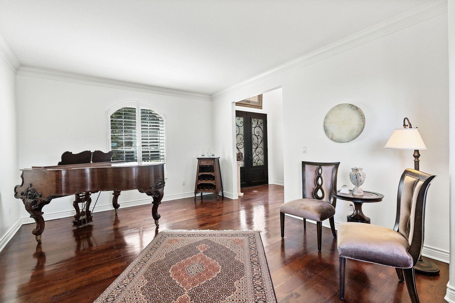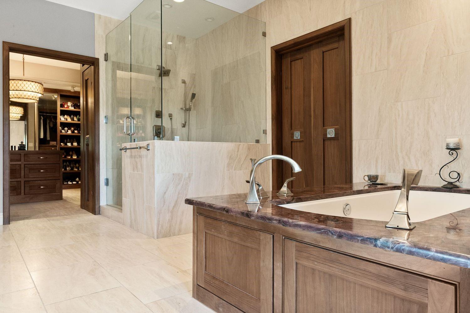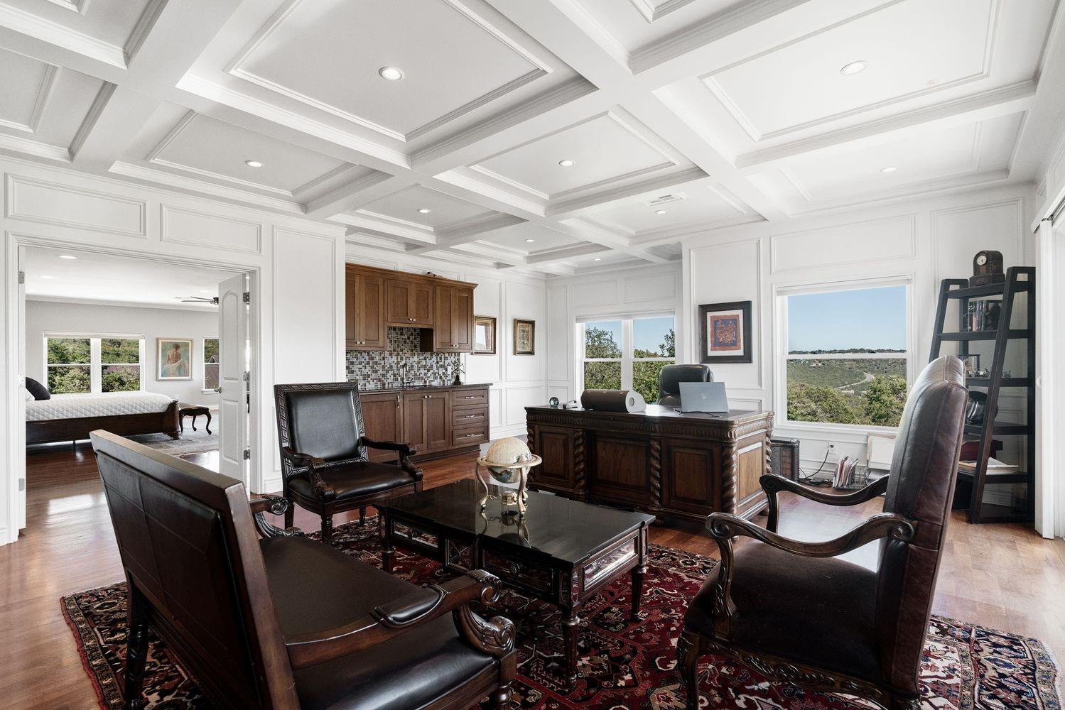 The primary suite is a sanctuary of tranquility with sweeping vistas, walnut closets, & a spa-like Zen bathroom. Adjacent is a stately executive-style office with wet bar offering many work or leisure options. Four additional bedrooms, each with private en-suite bathrooms, ensure comfort and privacy for all occupants. Completing the estate is a spacious 3-car garage and an open and flat courtyard space, perfect for sporty endeavors or even al fresco gatherings.