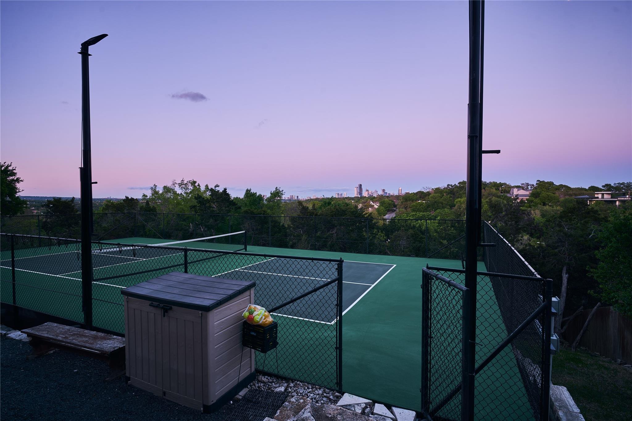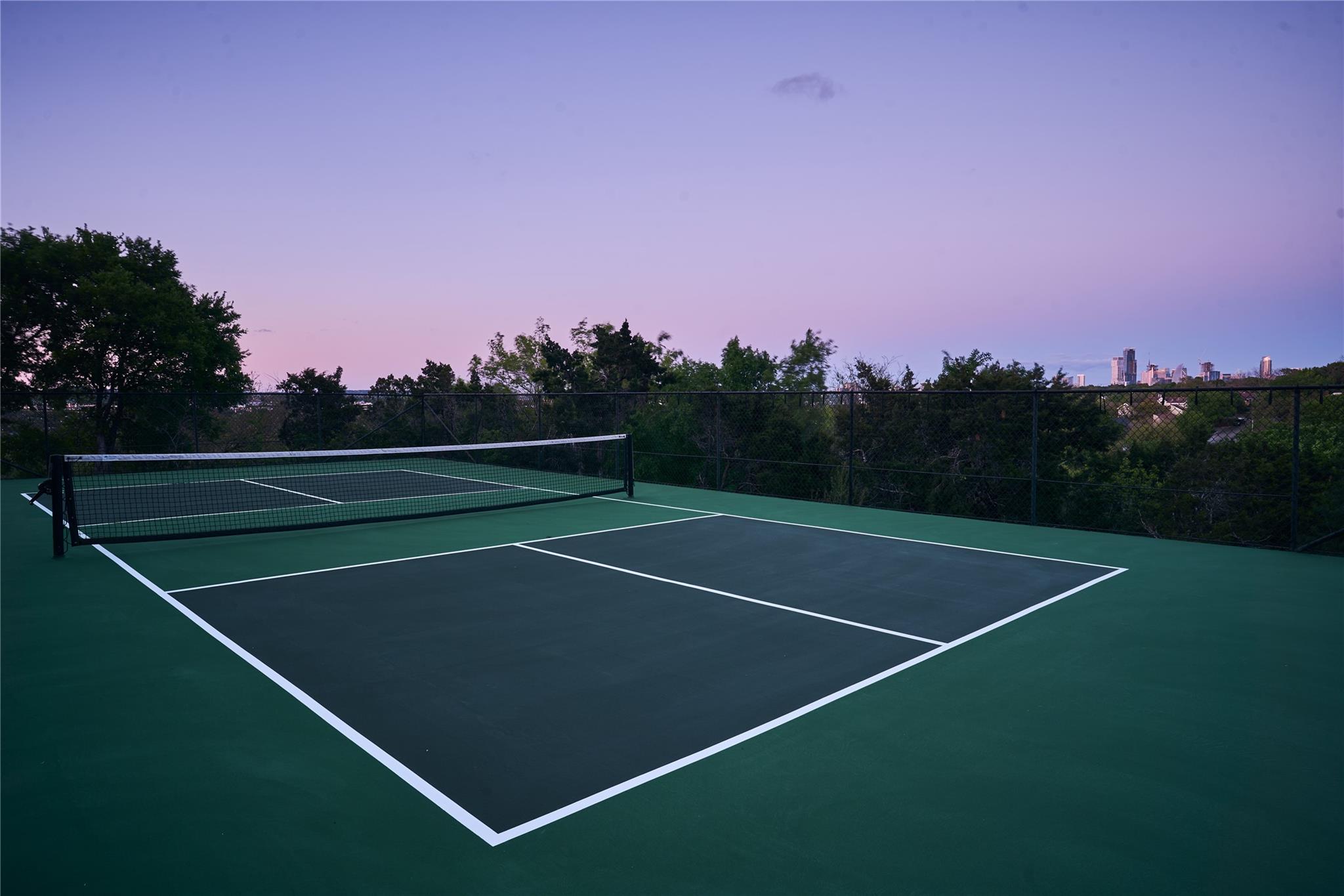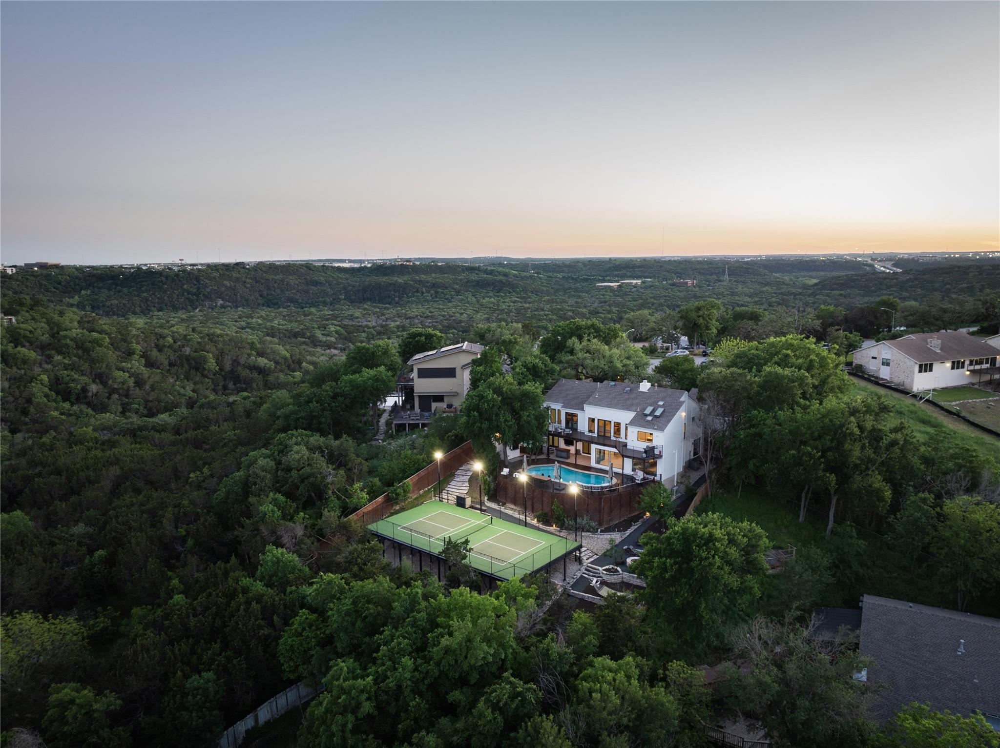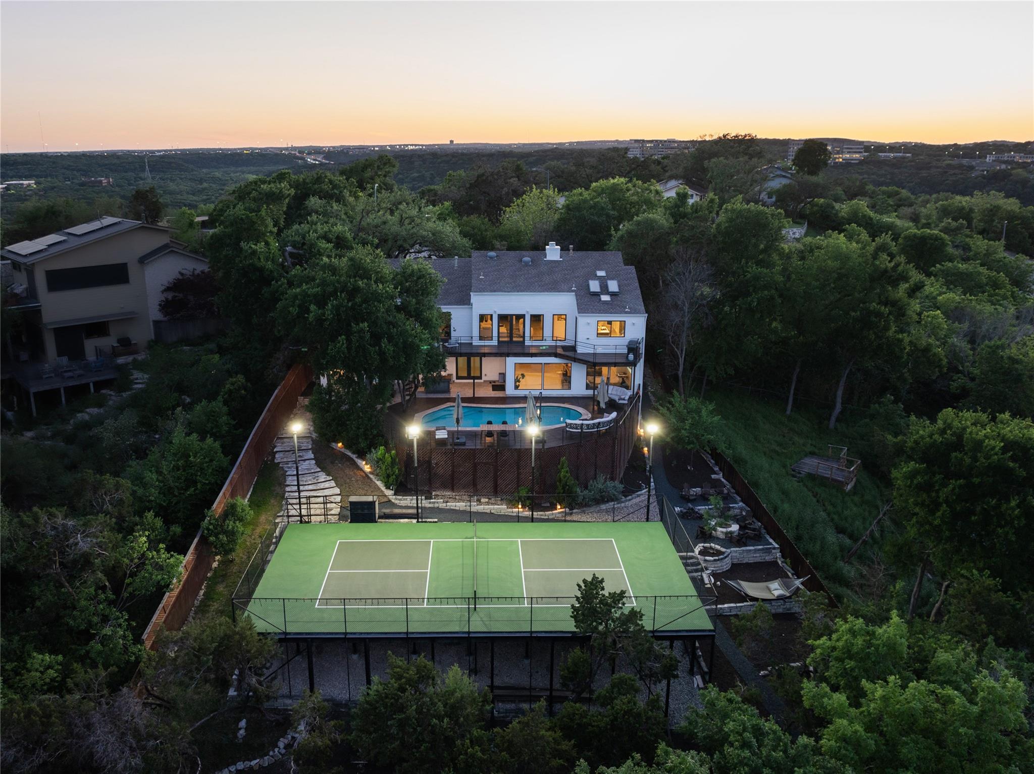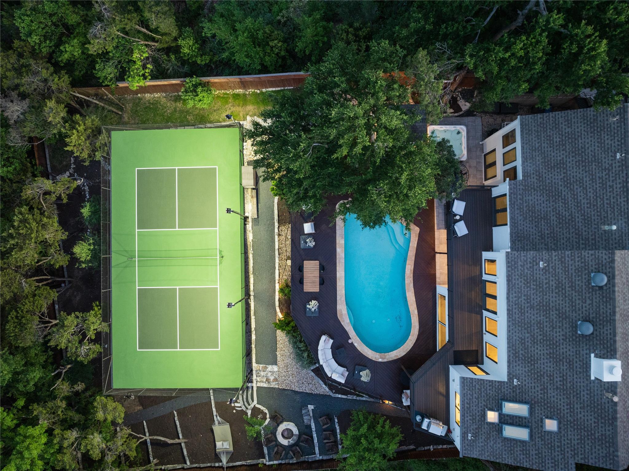 Welcome to the pinnacle of South Austin living - a contemporary masterpiece nestled at the highest point of Barton Hills, offering breathtaking panoramic views of Downtown Austin and the majestic Hill Country. This is truly one of one, with the cherry on top being an elevated full-size pickleball court - something you just can't find anywhere else. Situated at the end of a tranquil cul-de-sac, this exceptional estate spans approximately 3,688 square feet, boasting 4 bedrooms, 5 baths, and unrivaled amenities that redefine luxury living. Step inside to discover a thoughtfully remodeled interior designed to maximize the sweeping views, with each room offering an abundance of natural light and access to exterior decks and patios. The main floor showcases a spacious kitchen adorned with quartz countertops, stainless steel appliances, and an inviting eat-in dining area. A formal dining space, a comfortable living area, a generously sized primary bedroom with an en-suite bath, a convenient laundry room, and a guest half-bath complete the main level. Descend to the lower level, where entertainment awaits in the form of a sprawling media and game room that seamlessly transitions to the outdoor oasis featuring a refreshing pool - an ideal setting for hosting gatherings or simply unwinding in style. Three additional guest bedrooms and two full baths ensure ample accommodation for family and visitors alike. A pool house equipped with a bar adds a touch of sophistication, while an outdoor shower and a hot tub provide ultimate relaxation against the backdrop of stunning scenery overlooking the Pickleball court. Complete with a 2-car garage and situated on an expansive lot of nearly half an acre, with proximity to greenbelt hikes, Zilker Park, Barton Springs Pool, eclectic shopping, dining destinations along SoLa, and the vibrant energy of downtown Austin. With its unparalleled views and unparalleled amenities, this legacy estate awaits its discerning new owner.