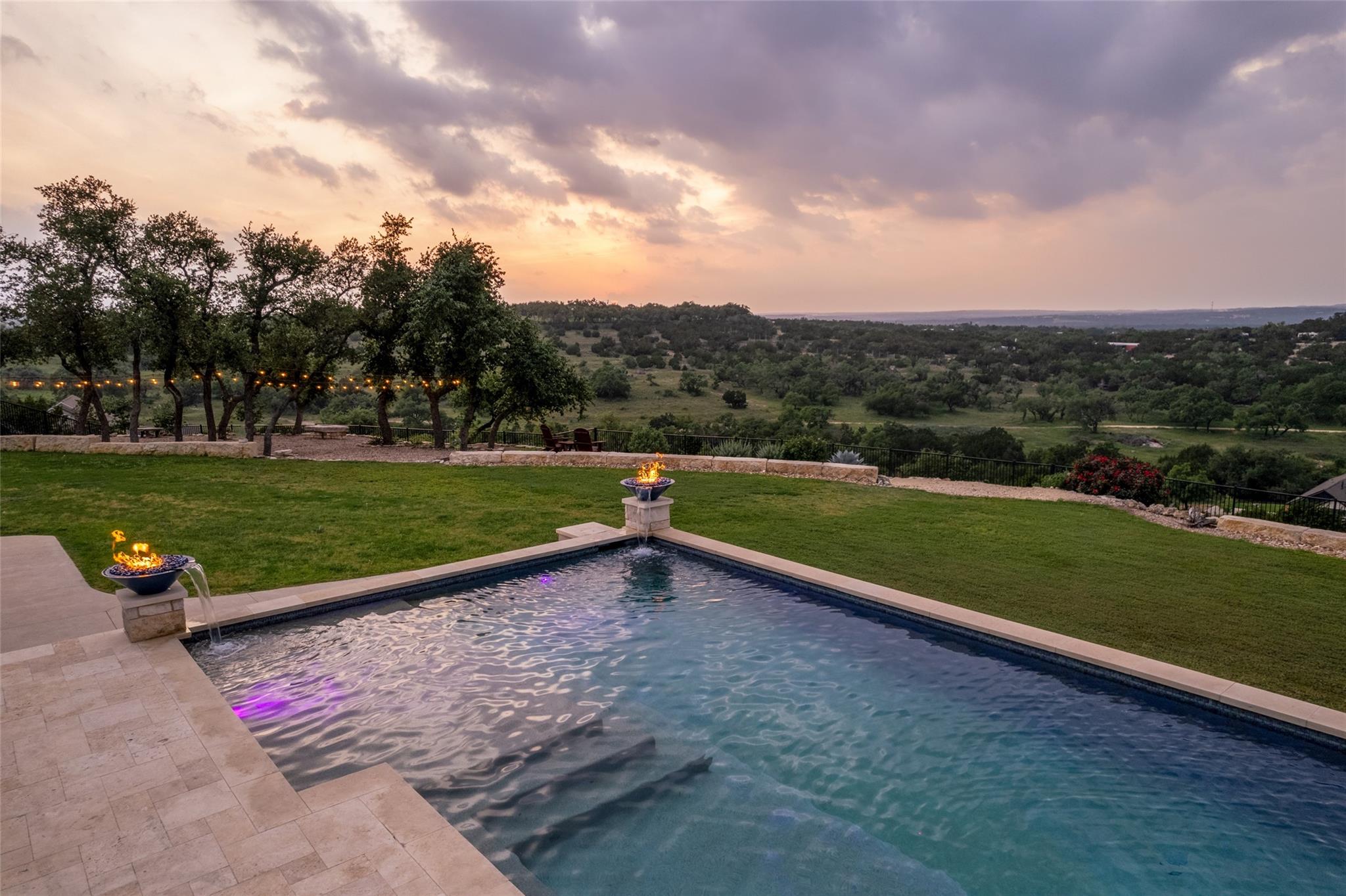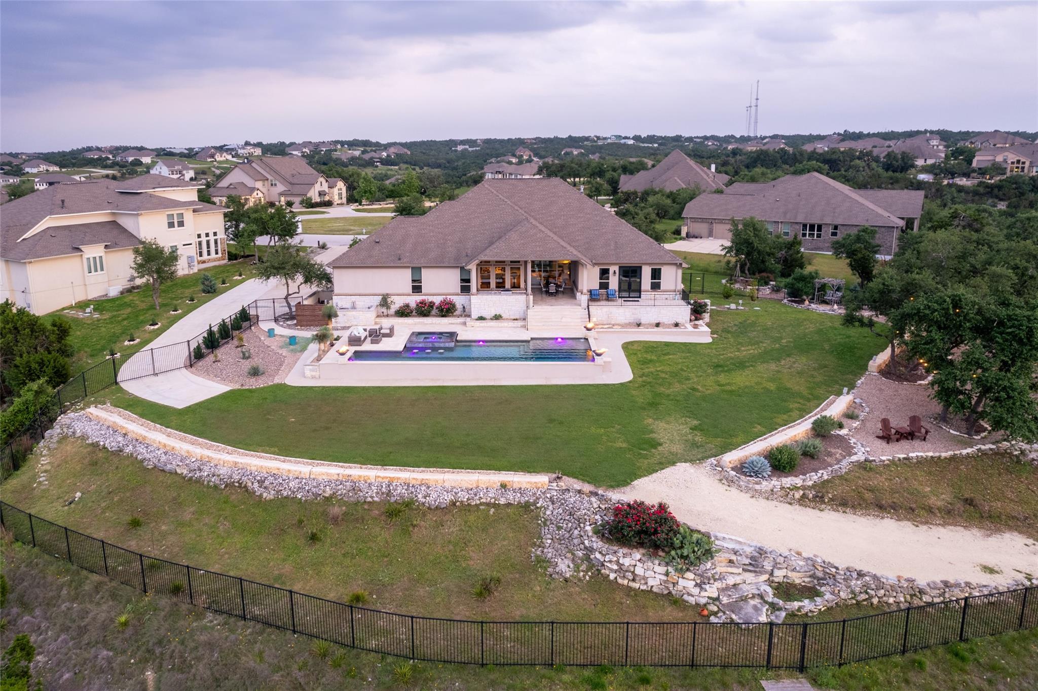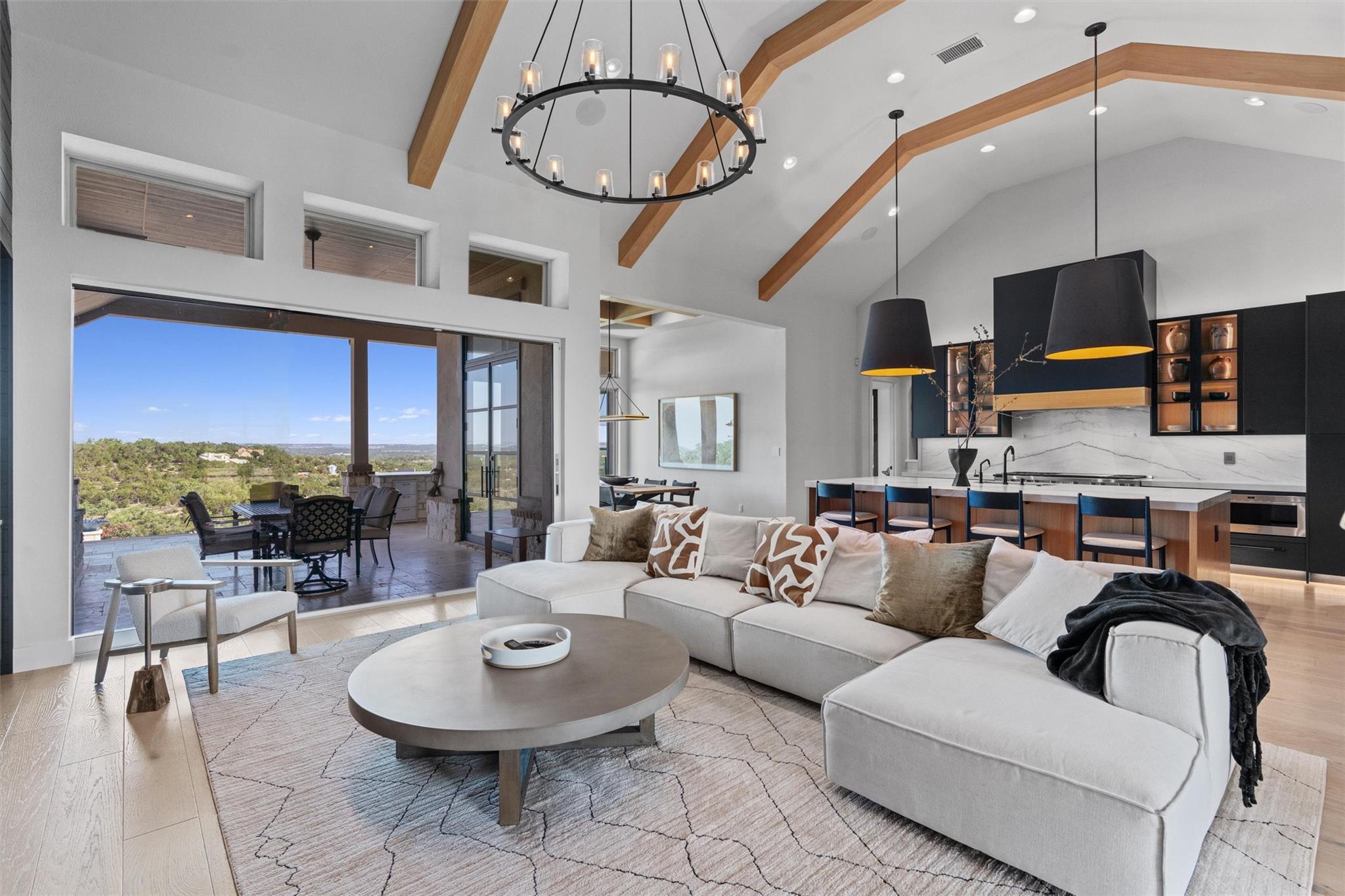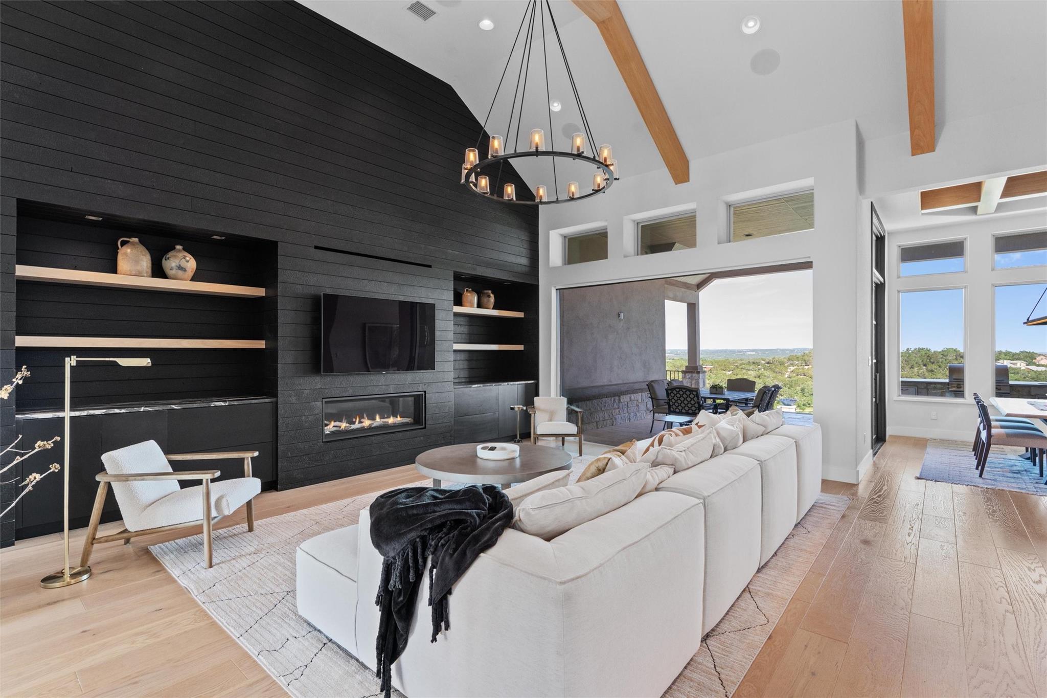 Forever views & $700K+ updates! Situated atop a panoramic 1.6 ac lot in the esteemed Saratoga Hills neighborhood of Austin – this preinspected, spacious 1-story layout has $400k+ in interior updates. Designed by Judi Fuller & optimized for natural light, high-end features that’ll first greet you are massive Cantera steel doors, vaulted 16ft ceilings adorned w/ elegant white oak beams, & 12’ x 8’ pocket door opening up to arguably the best Hill Country view in Hays Co! Stunning, chef-inspired kitchen includes custom cabinets w/ Blum & Ashley Norton hardware, built-in SubZero designer series fridge/freezer 36" columns w/ white oak panels, Wolf 60" gas range - 6 burners, infrared dual griddle & double oven and microwave & warming drawer. You’ll appreciate the attention to detail w/ Aria Leathered Quartzite bookmatched backsplash, countertops, & huge 128” x 65” island while overlooking the living room, featuring a traditional Japanese Shou Sugi Ban accent wall, Napoleon 60" ng fireplace, & TruAudio home theater system easily managed w/ Control4, perfect for relaxation or entertaining. Two primary suites bookend the 4,078 sq ft home, w/ 5/8" x 8” Anderson Tuftex engineered hardwood, custom carpentry, DMF lighting design, & RH fixtures. Work from home in a functional, modern style w/ built-in office next to the dry bar w/ Wolf coffee maker & bev ctr. Addl't two guest bedrooms & flex room offer versatility. Love to entertain? $300k+ in exterior improvements including outdoor kitchen & 50-ft lap pool w/ infinity spa surrounded by large backyard w/ native TX flora & gravel entertaining area under mature live Oaks for daytime leisure or sunset viewing. Thinking of a casita/ADU? Use your imagination w/ the prepped build site & access road beyond the double-gated wrought iron fence on lower level. With a world-class view & luxury amenities found in more expensive listings, this meticulously designed dream home & Hill Country lifestyle can be yours! Agent/owner - 307Seahero.com