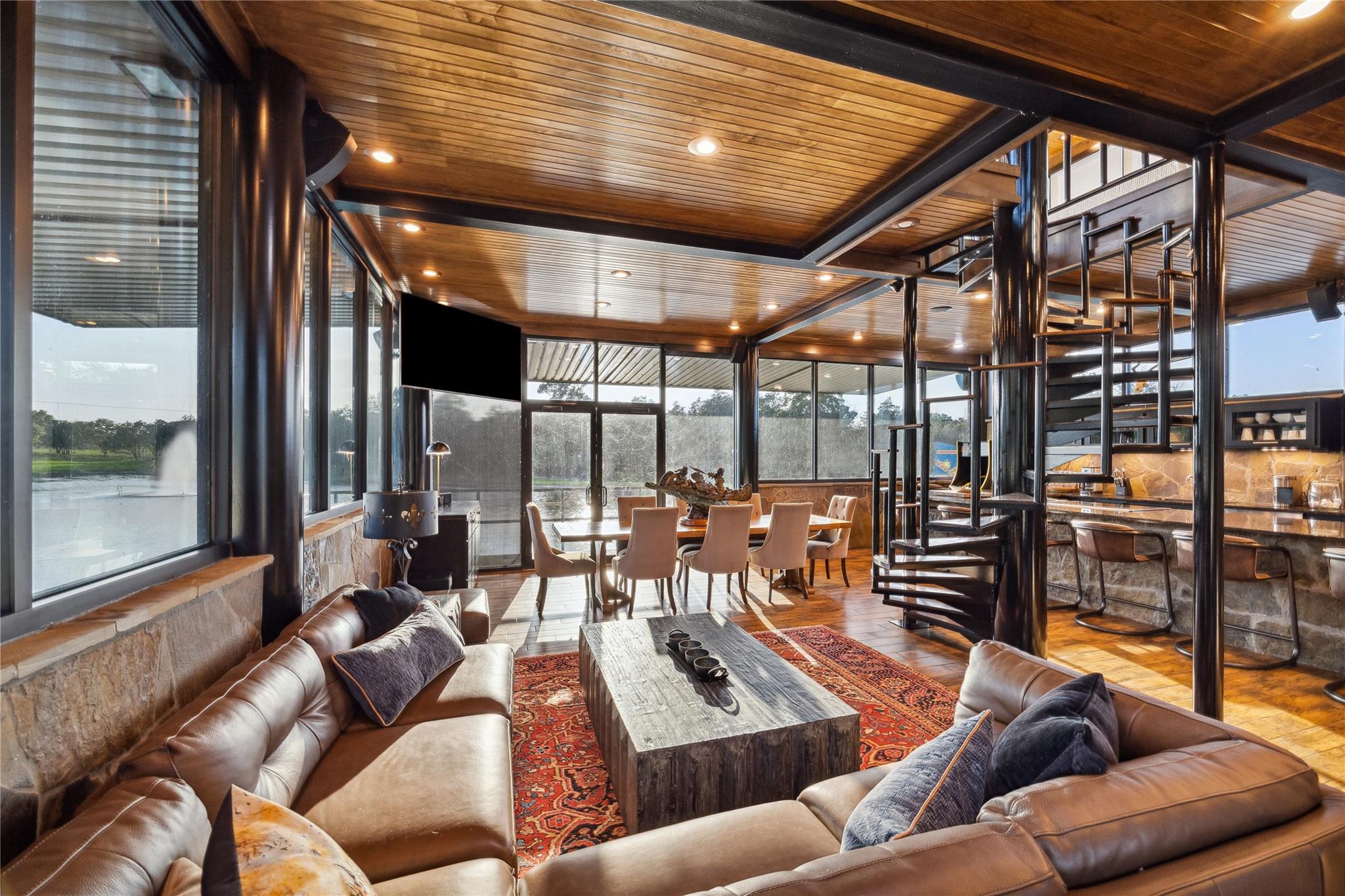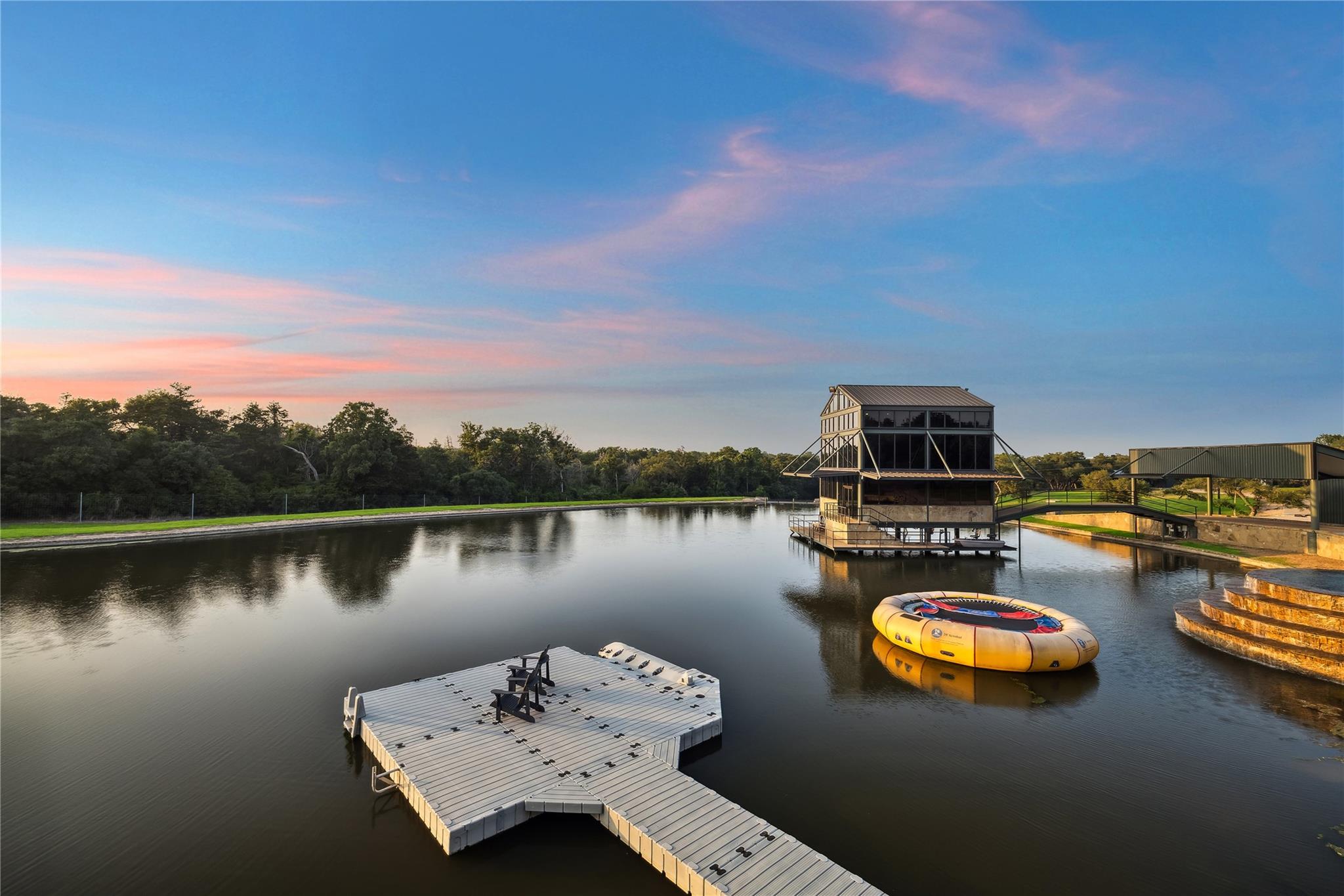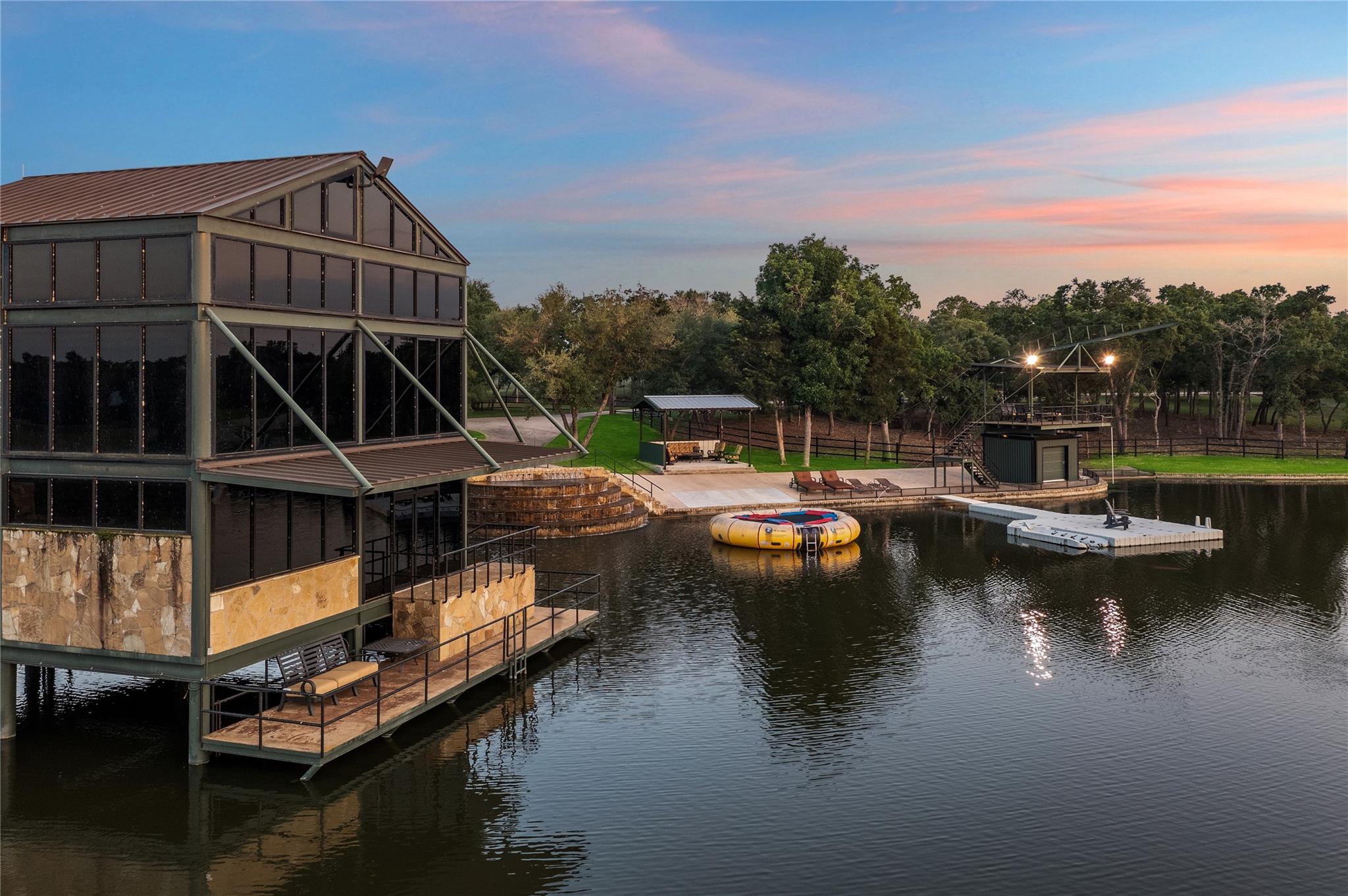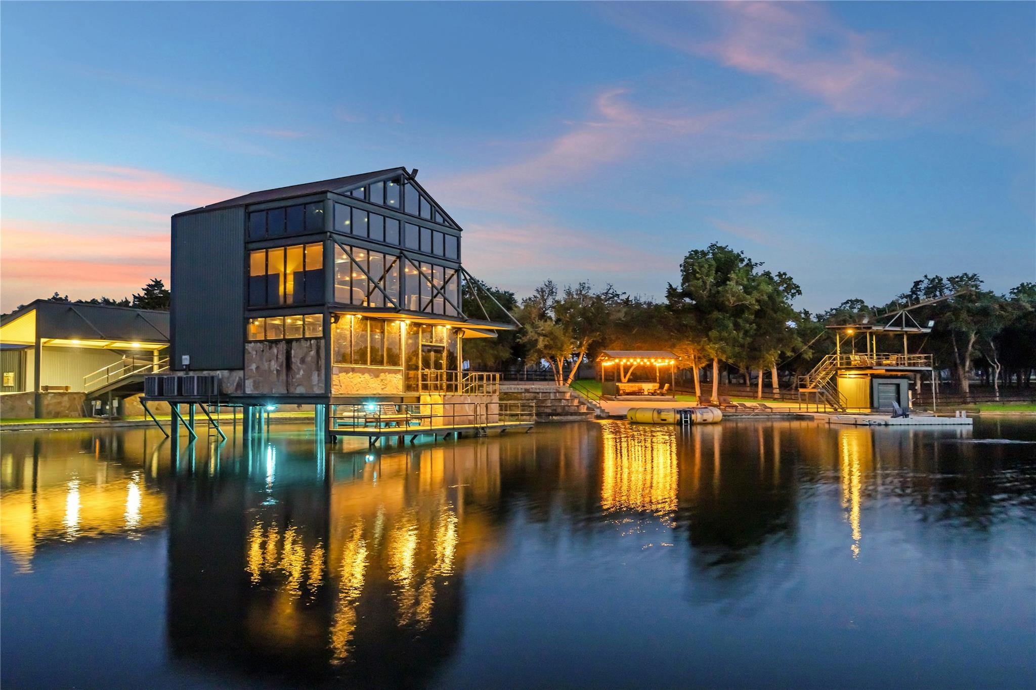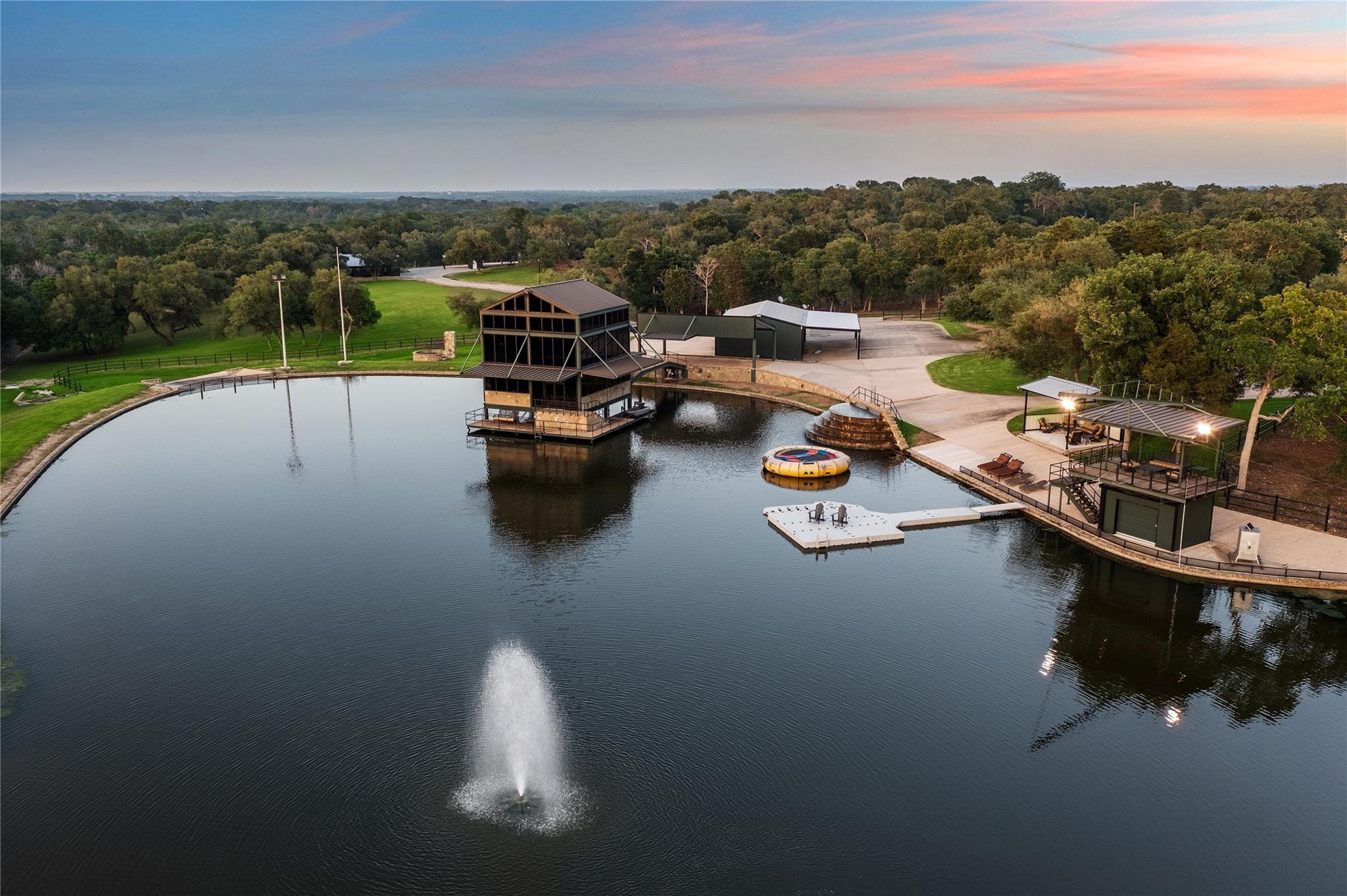 Nestled in the picturesque countryside outside of Round Top, Estancia de Dias Alegres offers a lifestyle like no other. The contemporary 3-story glass house commands attention, perched elegantly over a serene 2-acre pond. With panoramic views of 23+ acres, this property is a true retreat for family, friends, or clients. Imagine lazy afternoons by the fully stocked pond, its concrete perimeter inviting you to fish, boat, swim, or paddleboard. A cascading waterfall spills into a small pool on top, creating a soothing oasis. For the sports minded, a 2-story skeet shooting house and rope swing. Main house has 2 bedrooms/2.5 bath with living/dining/kitchen on the 1st floor. More living space on 2nd floor with guest bedroom. Tucked beneath the trees, the guest house has 2 bedrooms, 2 baths, kitchen/living/dining. Party barn with full bath, kitchenette, and rollup doors. 3 RV hookups, high game fencing, 6 bay barn and 2 additional equipment barns. Completely furnished with some exceptions.