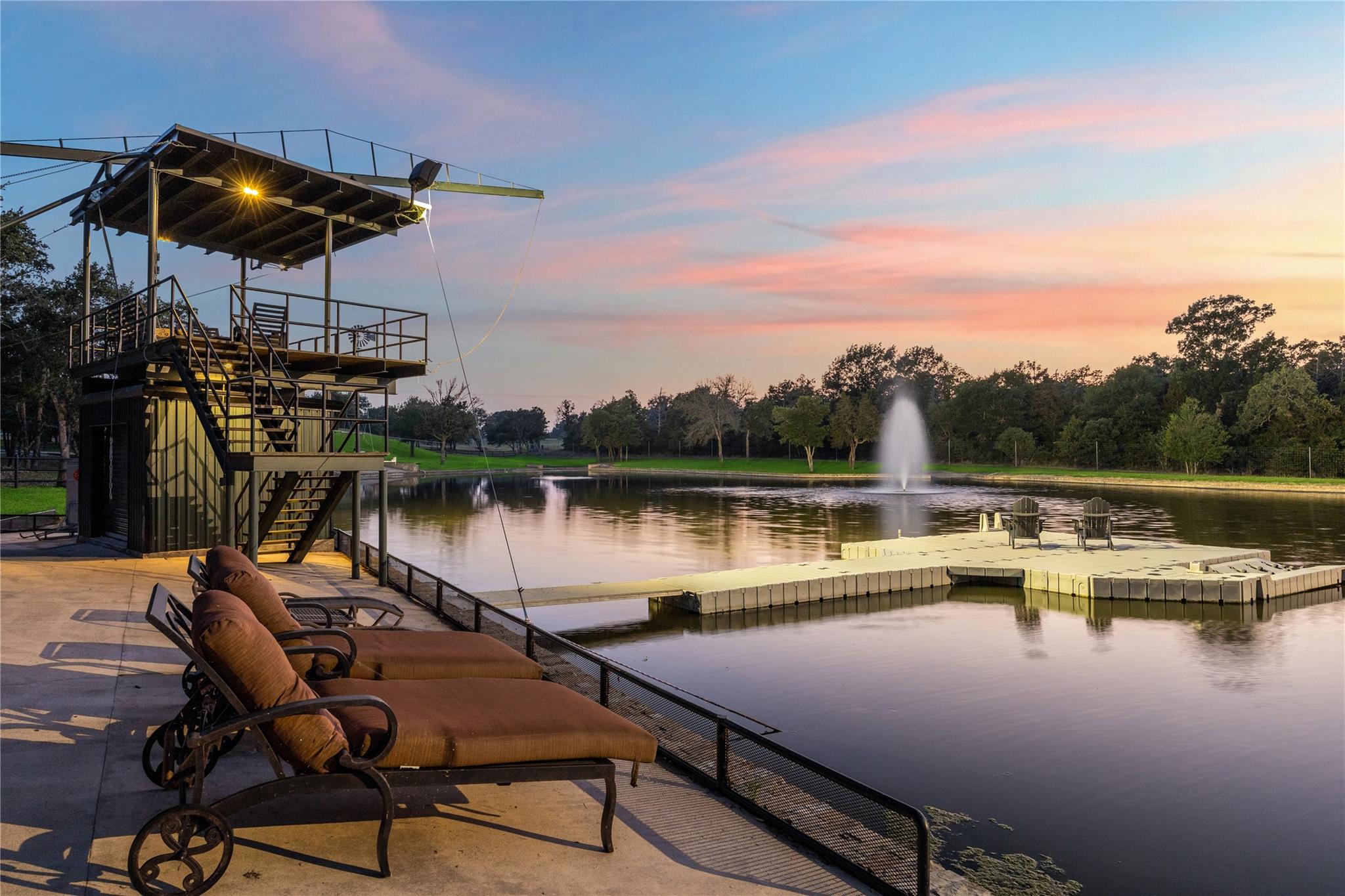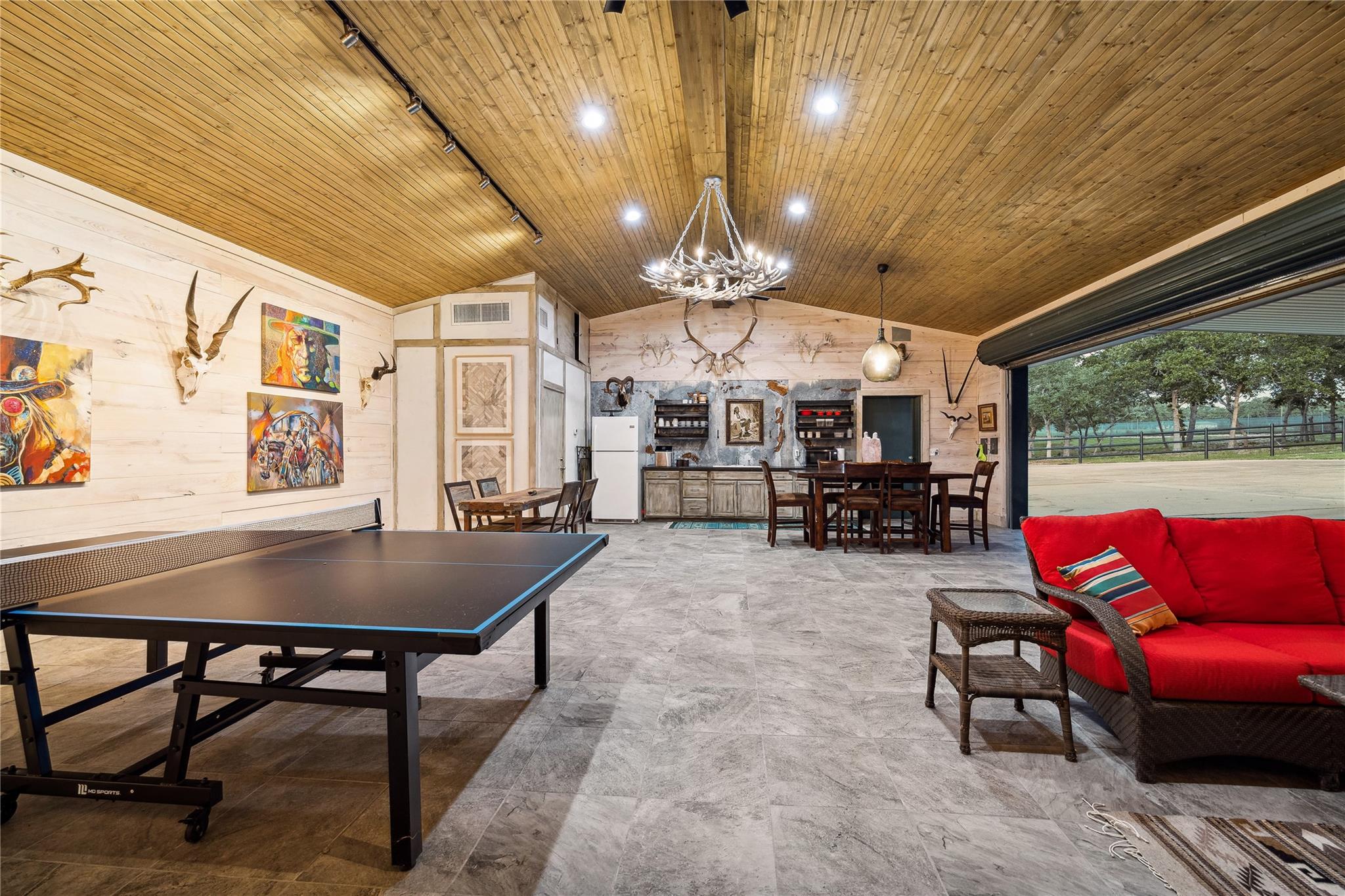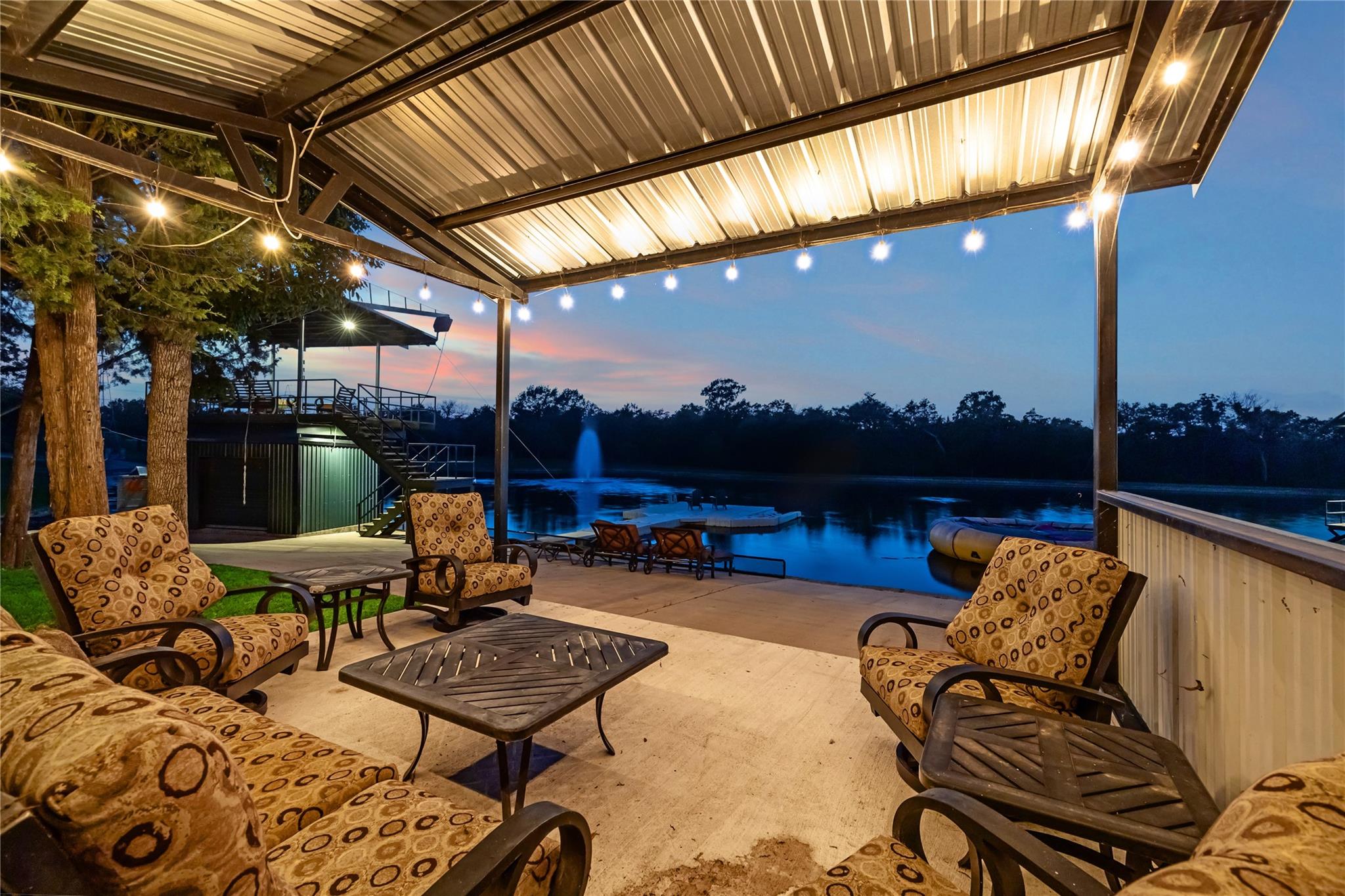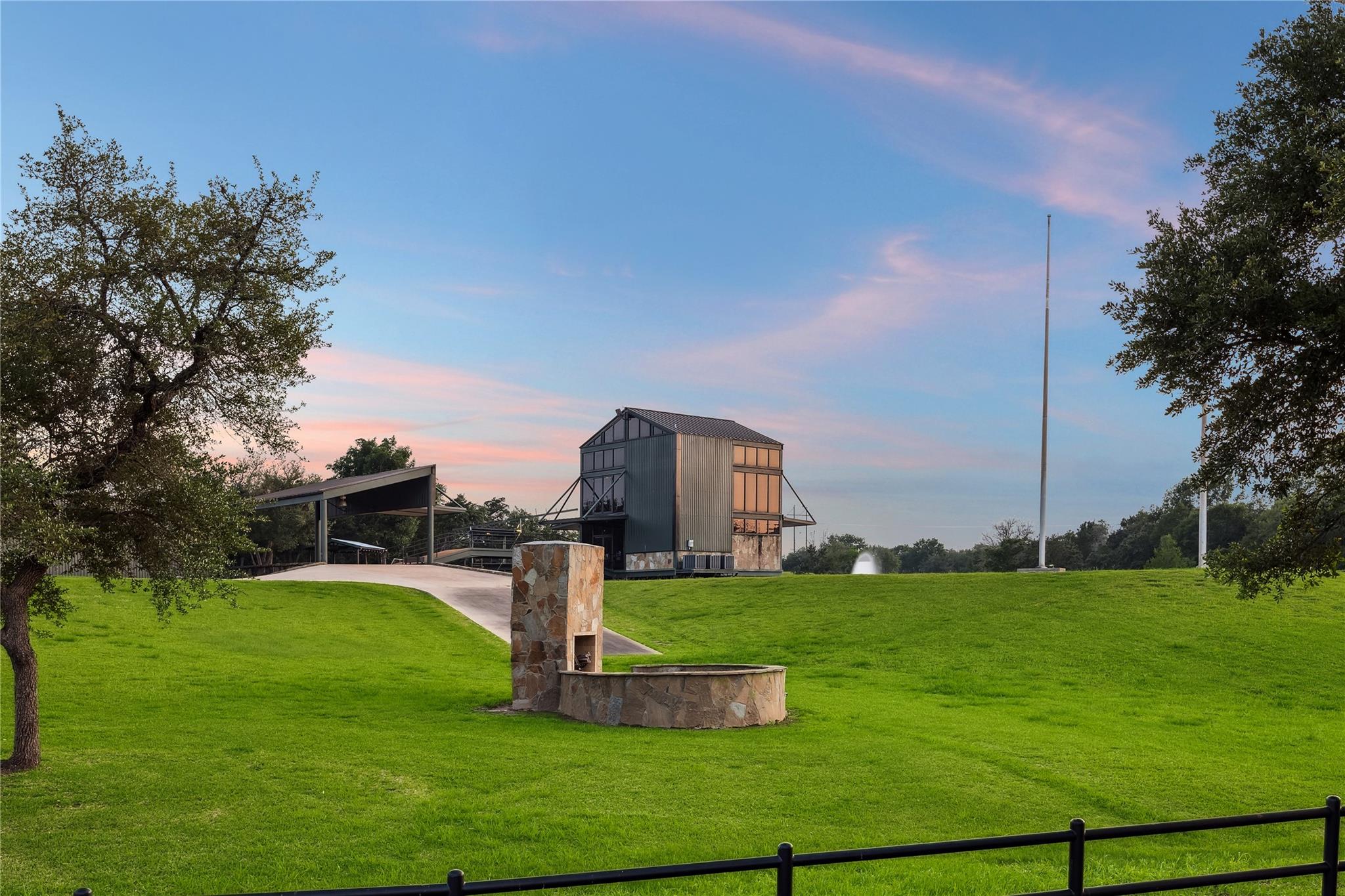 Nestled in the picturesque countryside outside of Round Top, Estancia de Dias Alegres offers a lifestyle like no other. The contemporary 3-story glass house commands attention, perched elegantly over a serene 2-acre pond. With panoramic views of 23+ acres, this property is a true retreat for family, friends, or clients. Imagine lazy afternoons by the fully stocked pond, its concrete perimeter inviting you to fish, boat, swim, or paddleboard. A cascading waterfall spills into a small pool on top, creating a soothing oasis. For the sports minded, a 2-story skeet shooting house and rope swing. Main house has 2 bedrooms/2.5 bath with living/dining/kitchen on the 1st floor. More living space on 2nd floor with guest bedroom. Tucked beneath the trees, the guest house has 2 bedrooms, 2 baths, kitchen/living/dining. Party barn with full bath, kitchenette, and rollup doors. 3 RV hookups, high game fencing, 6 bay barn and 2 additional equipment barns. Completely furnished with some exceptions.