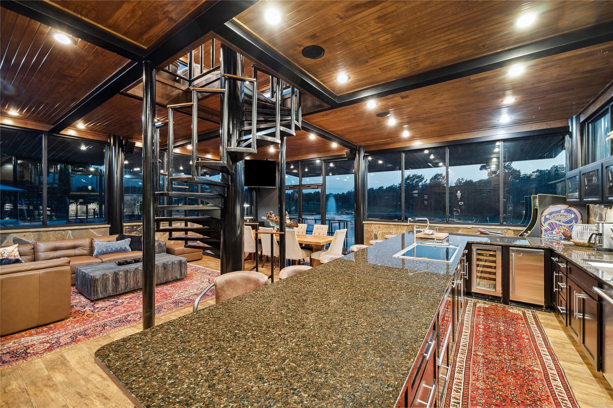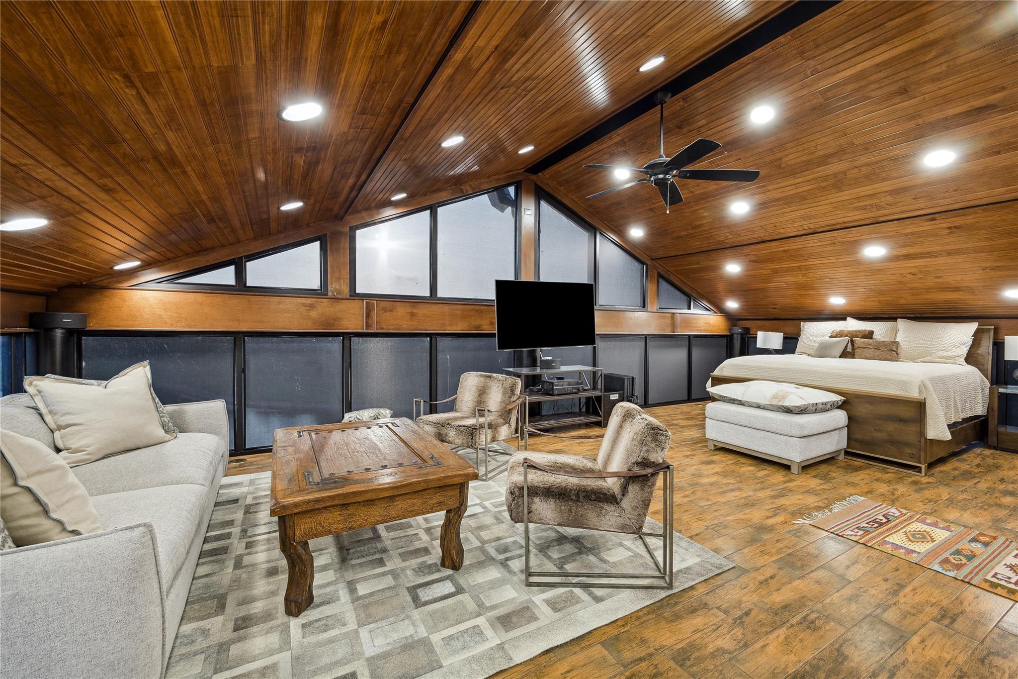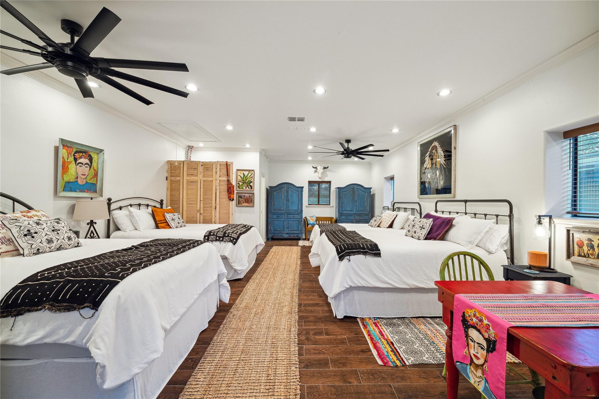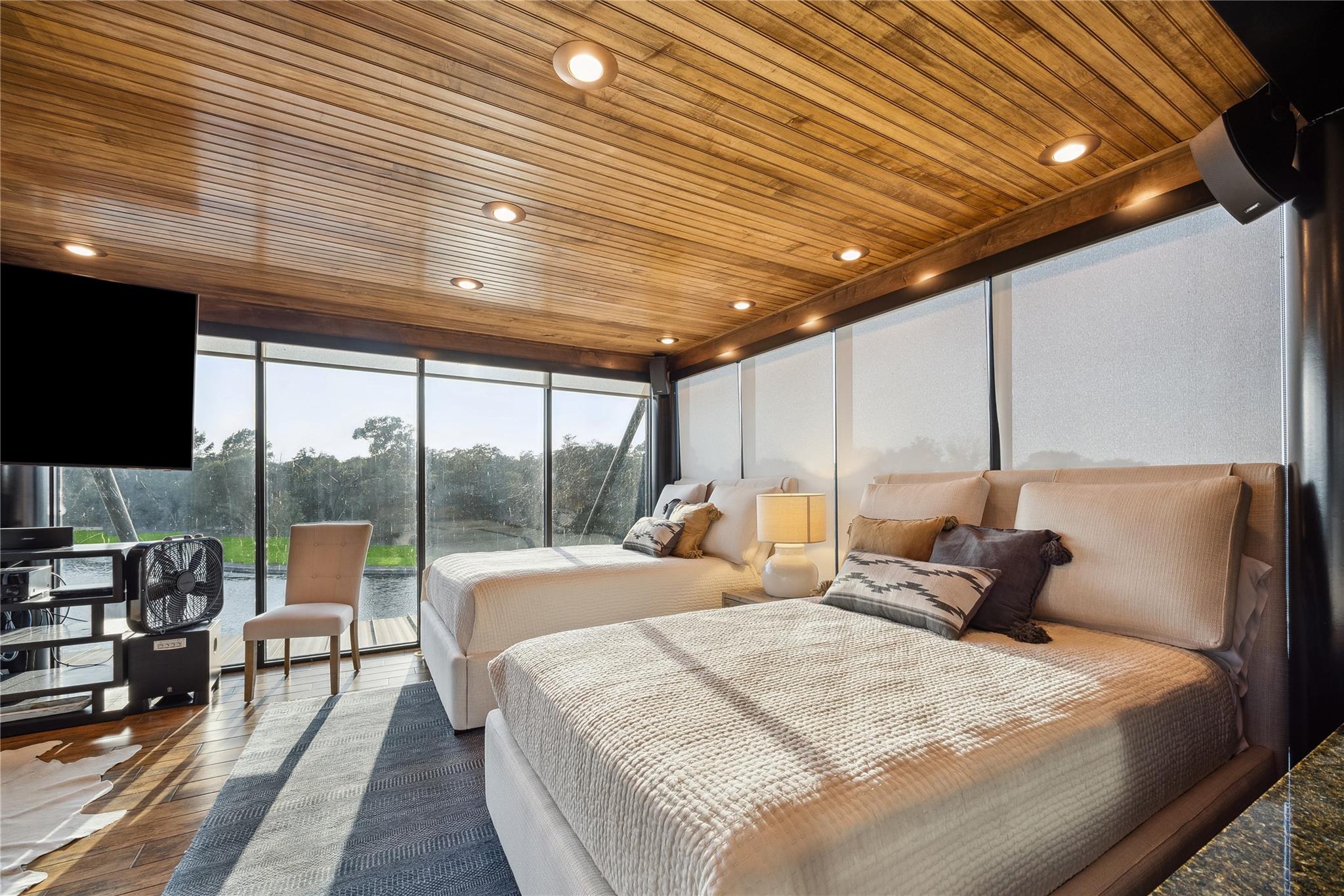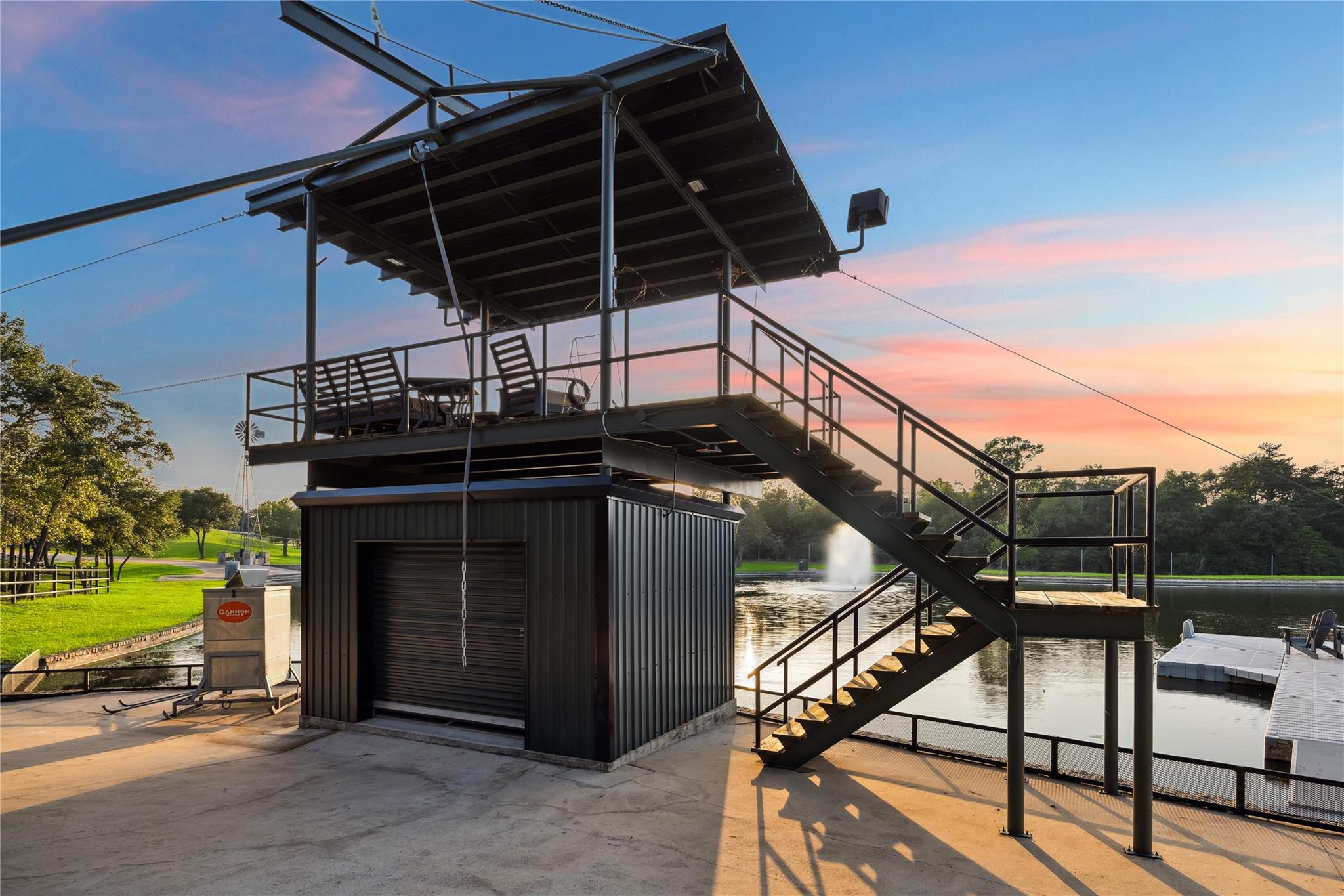 Nestled in the picturesque countryside outside of Round Top, Estancia de Dias Alegres offers a lifestyle like no other. The contemporary 3-story glass house commands attention, perched elegantly over a serene 2-acre pond. With panoramic views of 23+ acres, this property is a true retreat for family, friends, or clients. Imagine lazy afternoons by the fully stocked pond, its concrete perimeter inviting you to fish, boat, swim, or paddleboard. A cascading waterfall spills into a small pool on top, creating a soothing oasis. For the sports minded, a 2-story skeet shooting house and rope swing. Main house has 2 bedrooms/2.5 bath with living/dining/kitchen on the 1st floor. More living space on 2nd floor with guest bedroom. Tucked beneath the trees, the guest house has 2 bedrooms, 2 baths, kitchen/living/dining. Party barn with full bath, kitchenette, and rollup doors. 3 RV hookups, high game fencing, 6 bay barn and 2 additional equipment barns. Completely furnished with some exceptions.