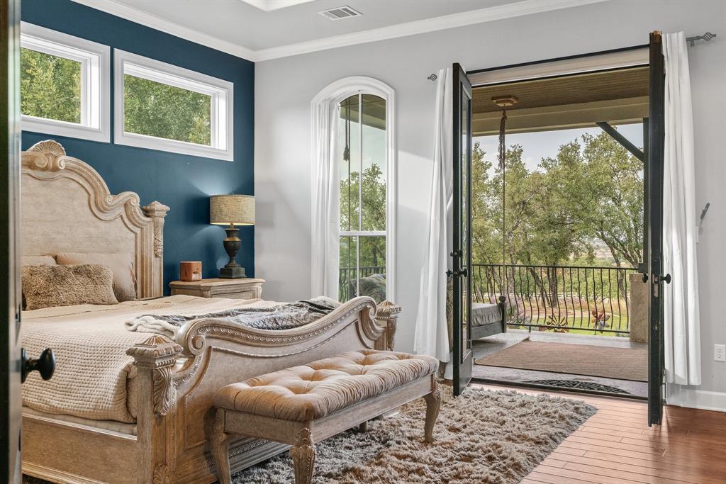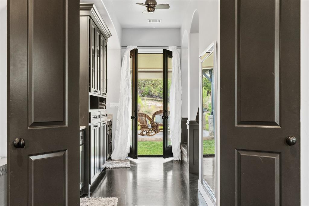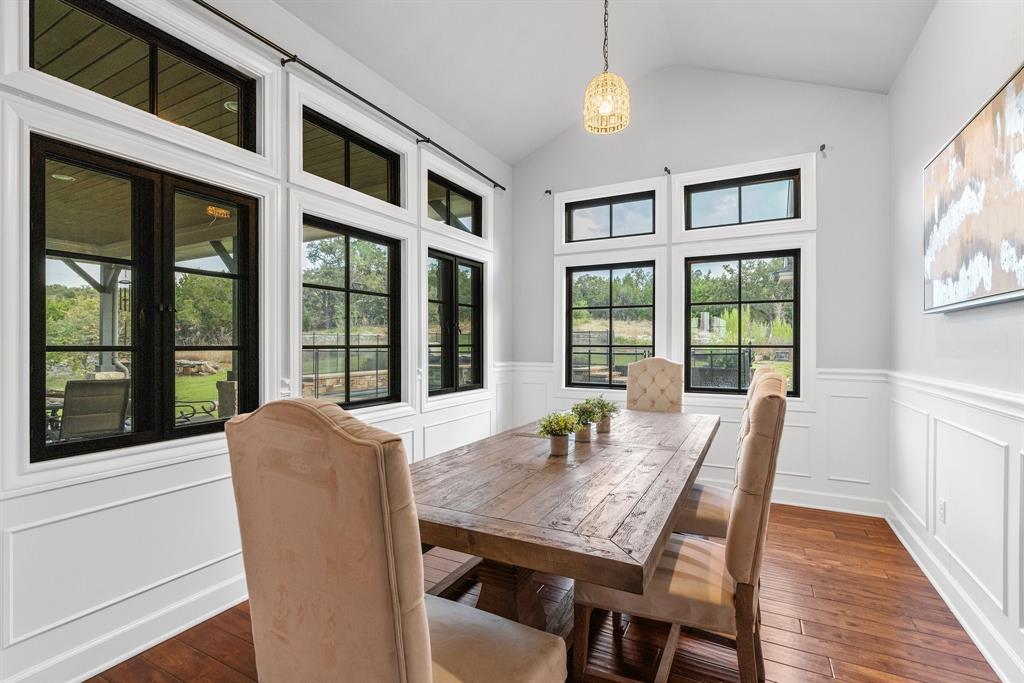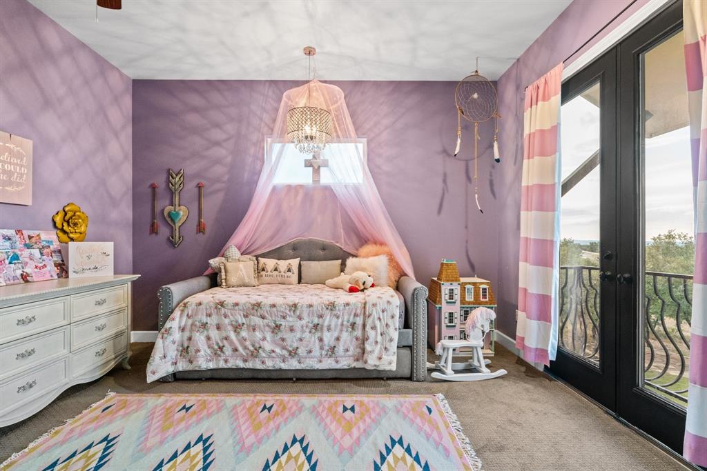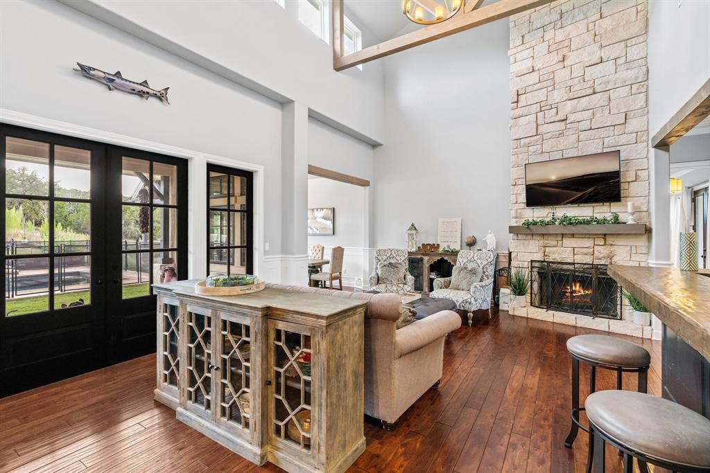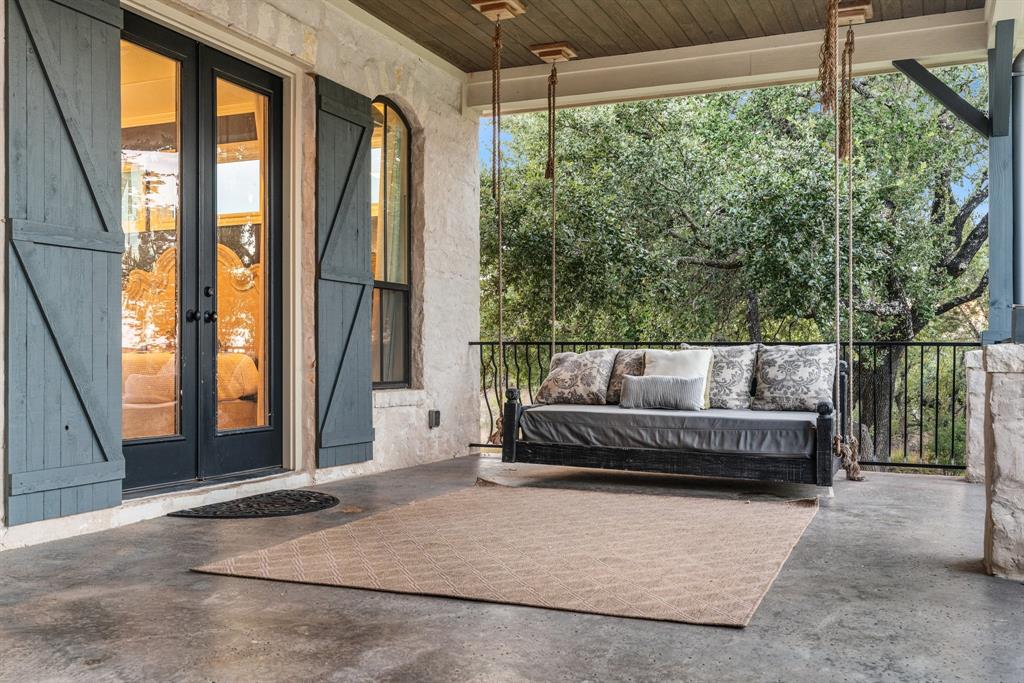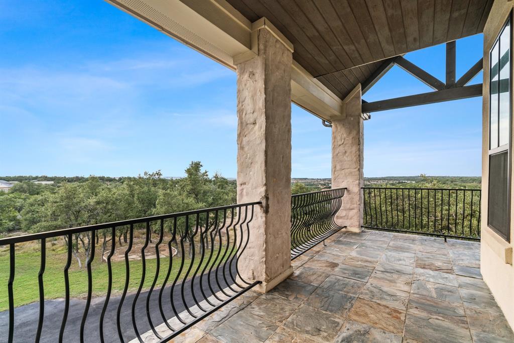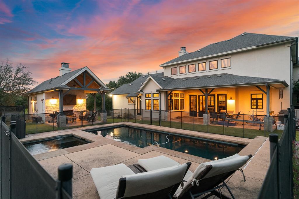 Tucked away in the serene Ranches at Hamilton Pool, this exceptional property invites you to experience the best of Texas Hill Country living. Set on a generous 15 acres, this spacious 4,423 square-foot home offers 5 bedrooms, 4.5 bathrooms, and a dedicated office. Step inside and be greeted by the warmth of a formal living room featuring impressive 20-foot beamed ceilings, a floor-to-ceiling stone fireplace, and a cozy wet bar with a beverage fridge and a custom brick wine cave. The open floor plan effortlessly connects the living areas, including an elegant formal dining room and a chef's dream kitchen. The kitchen is equipped with a 6-burner gas range, double oven, dual dishwashers, and a substantial kitchen island with a breakfast bar. On the main level, you'll discover the primary suite, a sanctuary of comfort with a covered patio and a spa-like bathroom featuring a roomy walk-in shower and a jetted soaking tub. Additionally, one secondary bedroom on the main level offers convenience and flexibility. Upstairs, a versatile living area doubles as a media room and opens onto a spacious balcony offering breathtaking hill country views. The remaining spacious bedrooms provide ample space for family and guests. Additional highlights of this property include a flexible casita with patio and fireplace, shower and attic space, perfect for use as a guest house or extra garage. Outdoor entertainment abounds with a sparkling saltwater pool and spa, a two-story playhouse, an inground trampoline, and a sports court. Environmentally conscious features include a rainwater tank and well, ensuring sustainability. Recent updates include a new hot water heater in '21 and a commercial-grade water softener in '20. This private haven is securely set amidst the gated community, offering 360-degree views of the surrounding hill country.